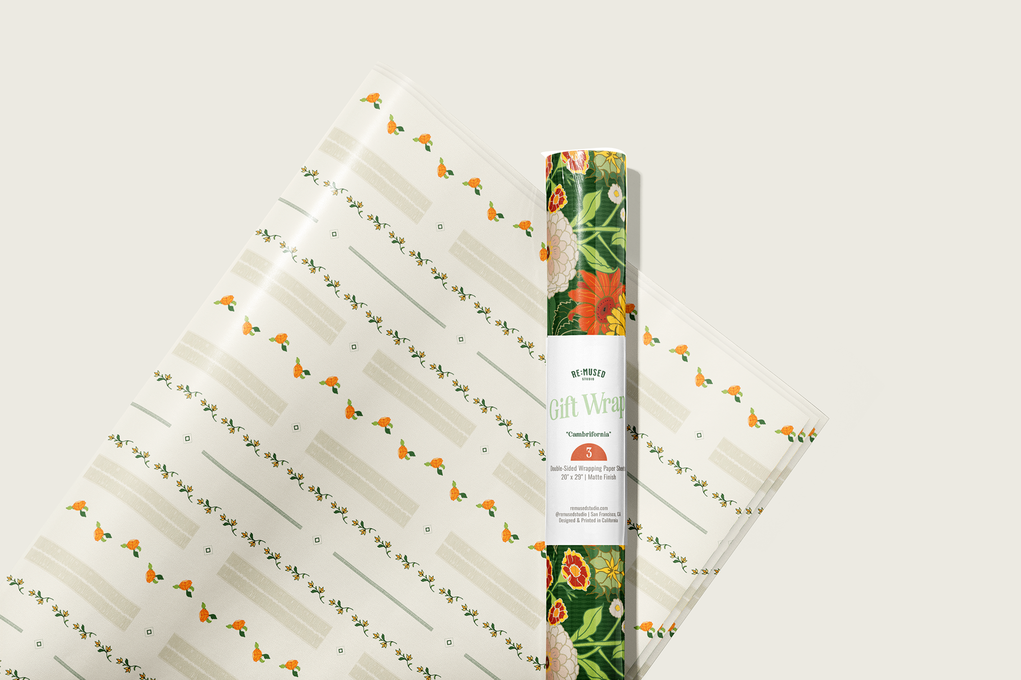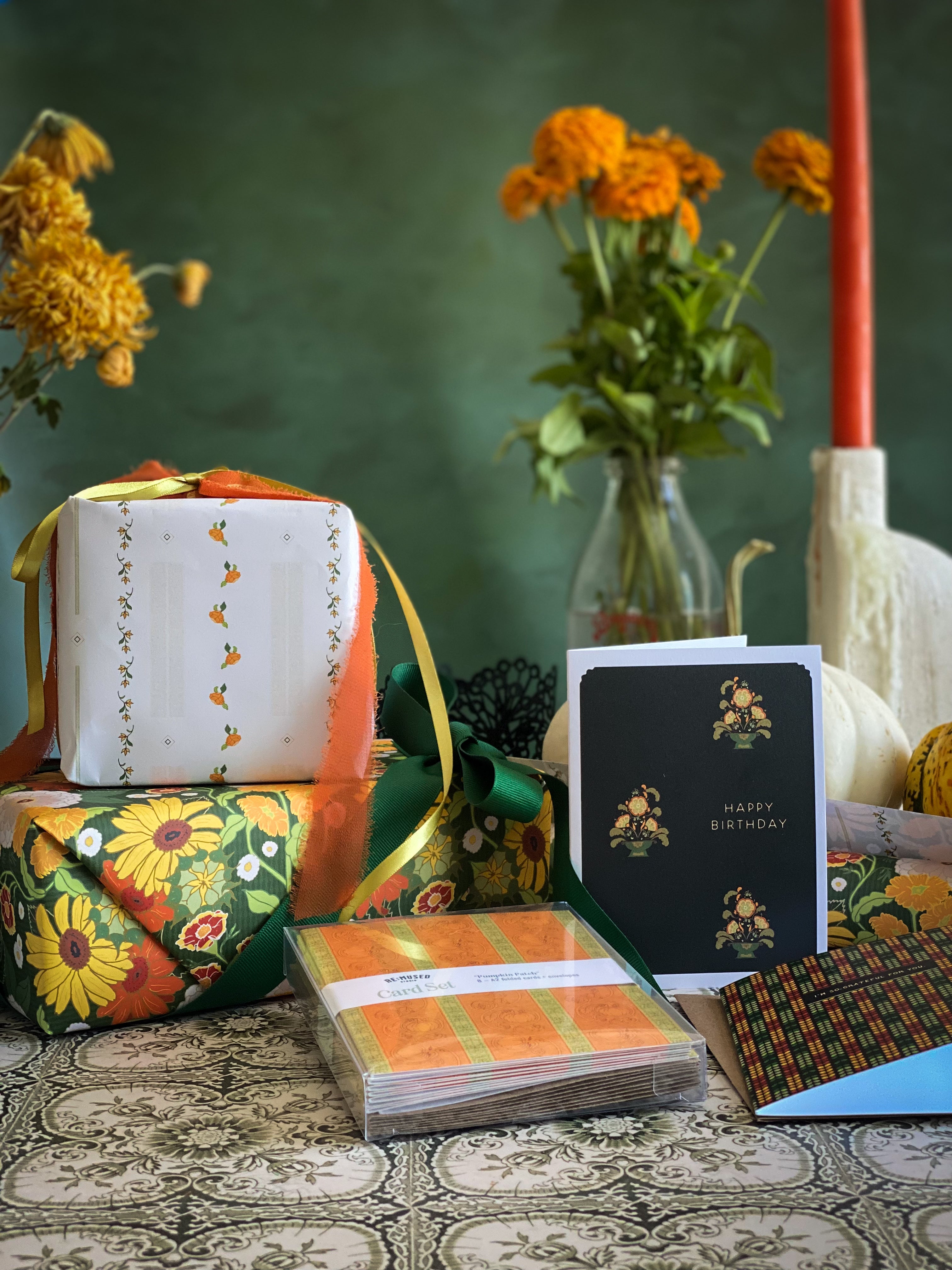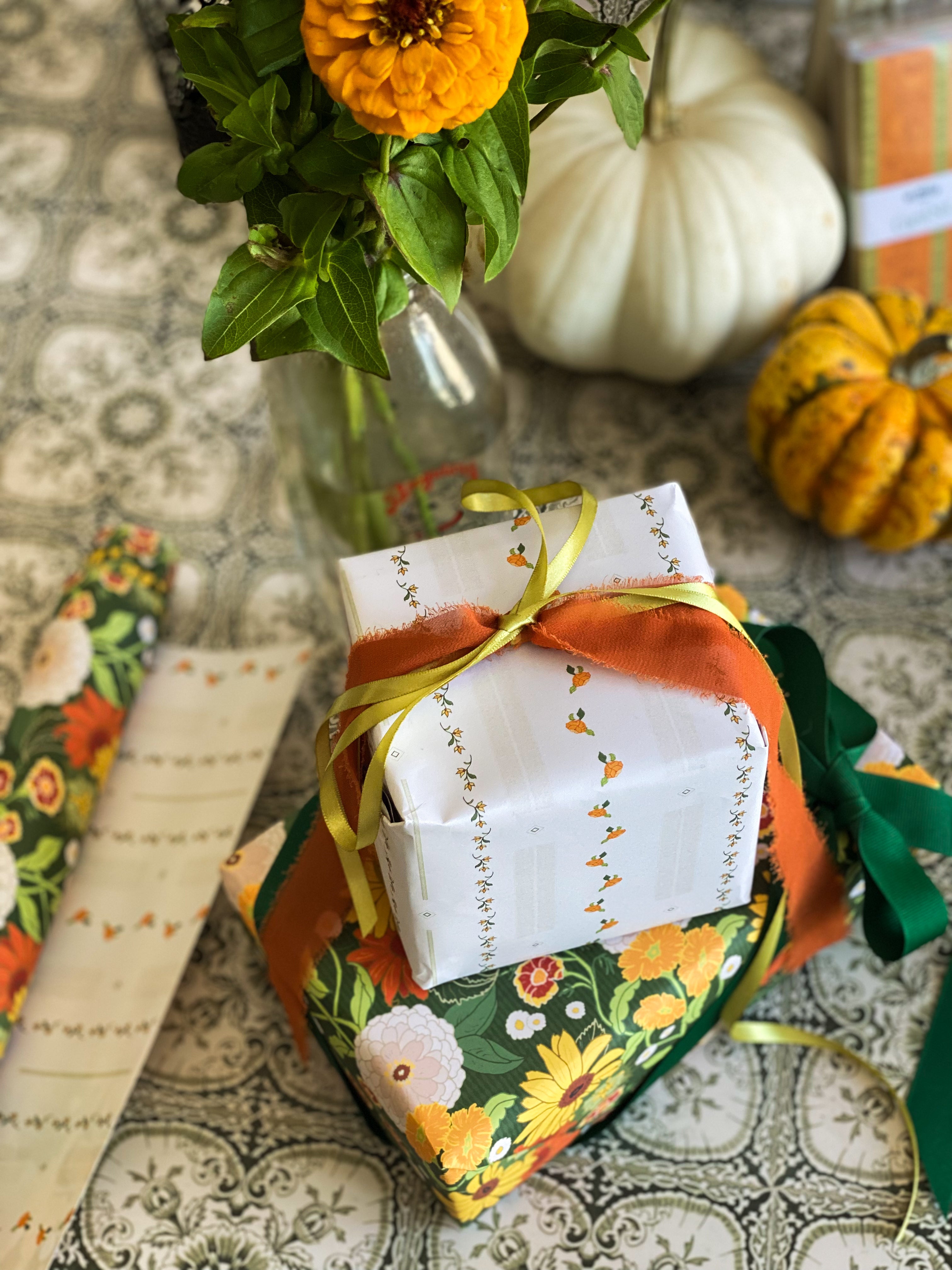 Double your options with double-sided wrapping paper featuring a meadow of fall vibrant yellow, orange and pink florals with a rich textured green background on one side and rows of sweet and delicate autumn orange roses and green sprigs on cream on the other. With two choices of bold and bright to sweet and delicate, this gift wrap is versatile for birthdays, weddings and other celebrations.