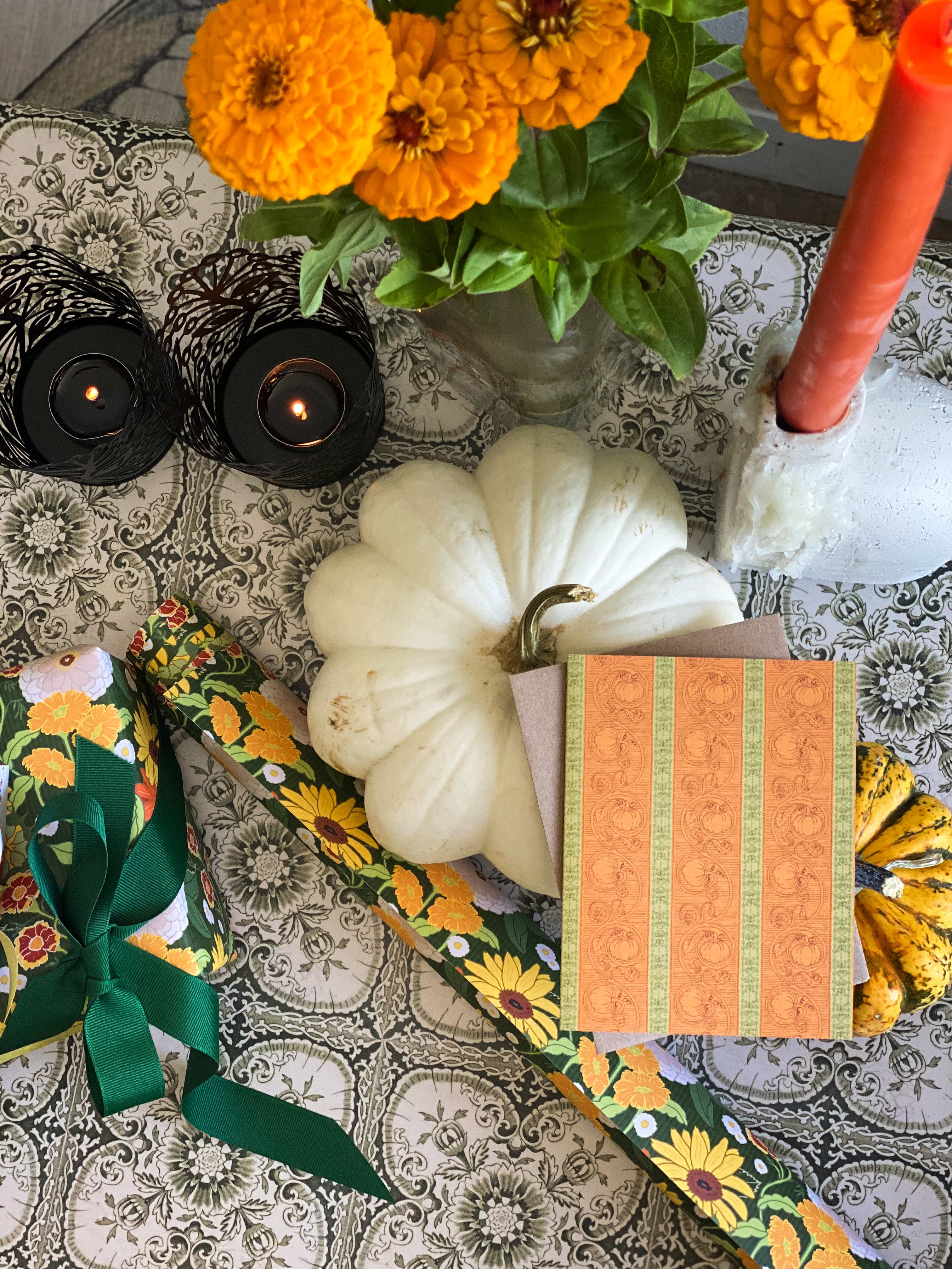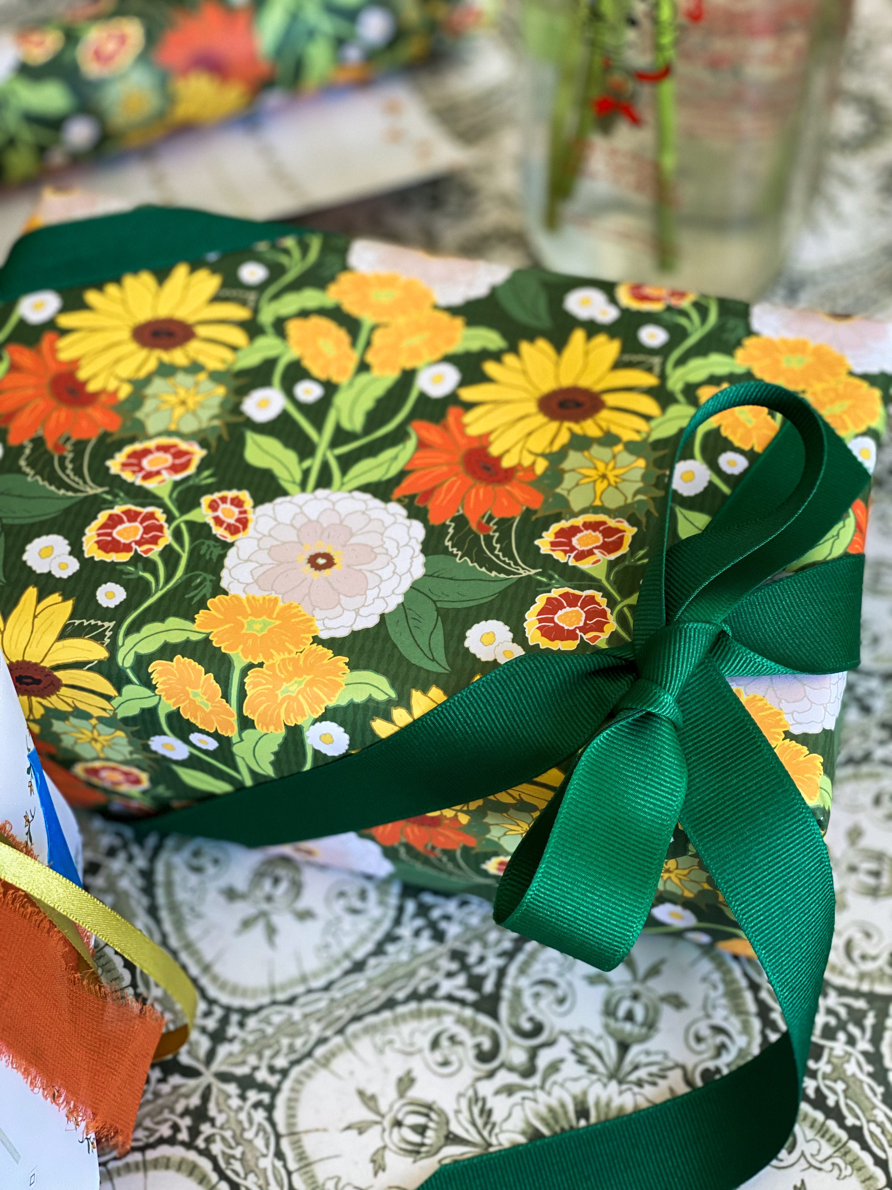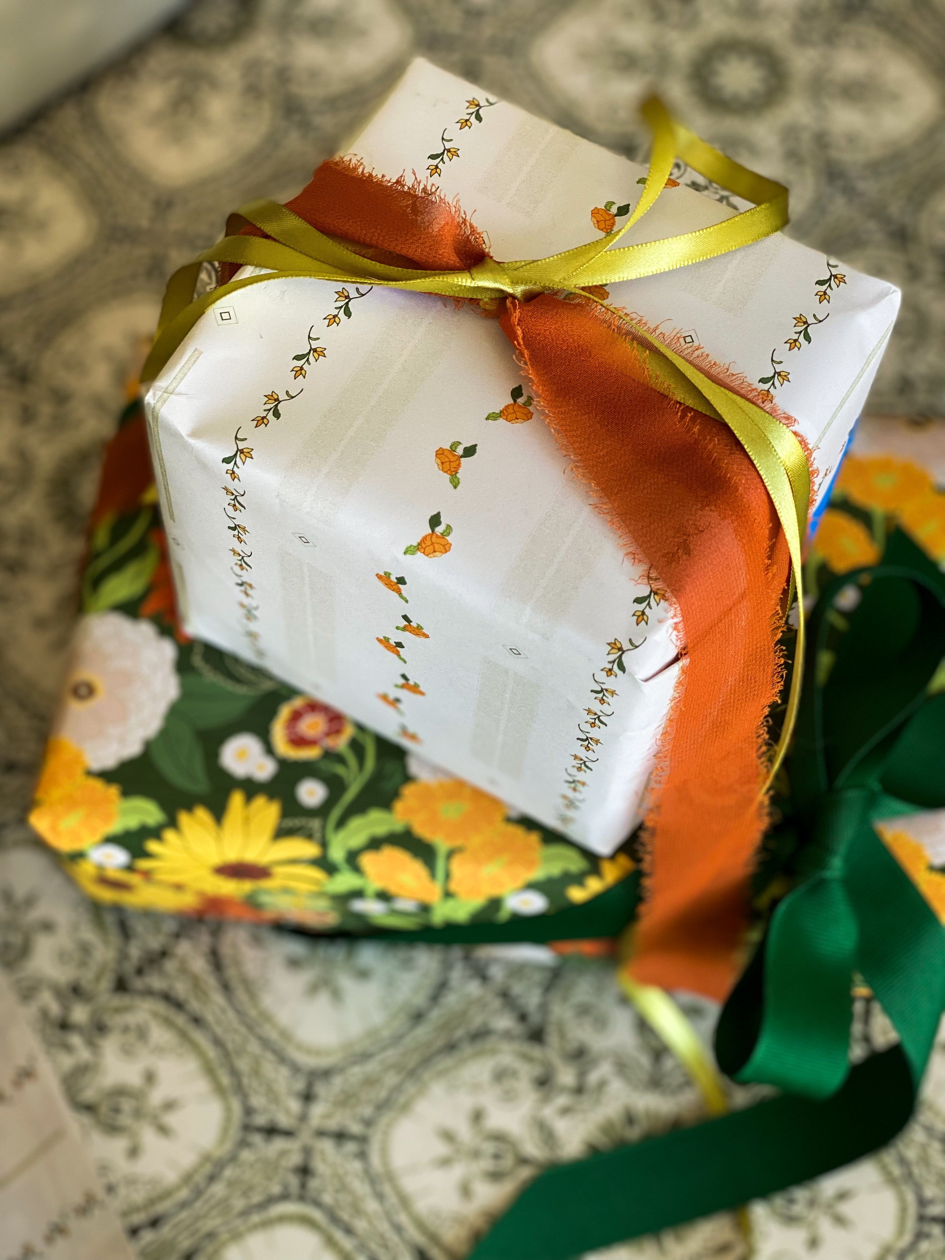 Double your options with double-sided wrapping paper featuring a meadow of fall vibrant yellow, orange and pink florals with a rich textured green background on one side and rows of sweet and delicate autumn orange roses and green sprigs on cream on the other. With two choices of bold and bright to sweet and delicate, this gift wrap is versatile for birthdays, weddings and other celebrations.