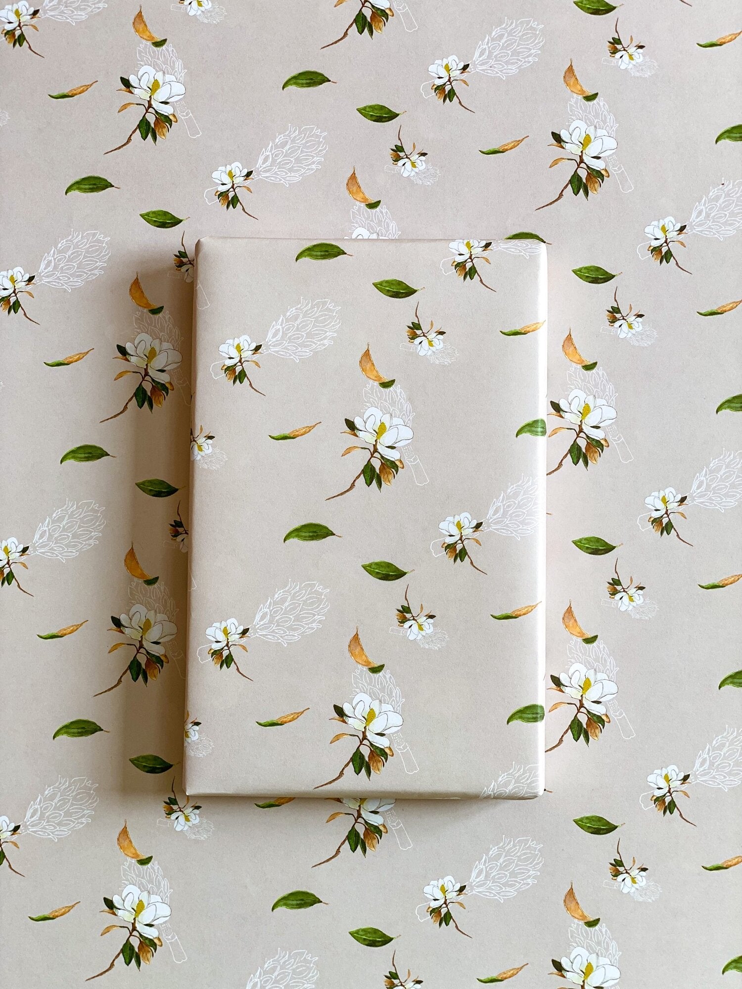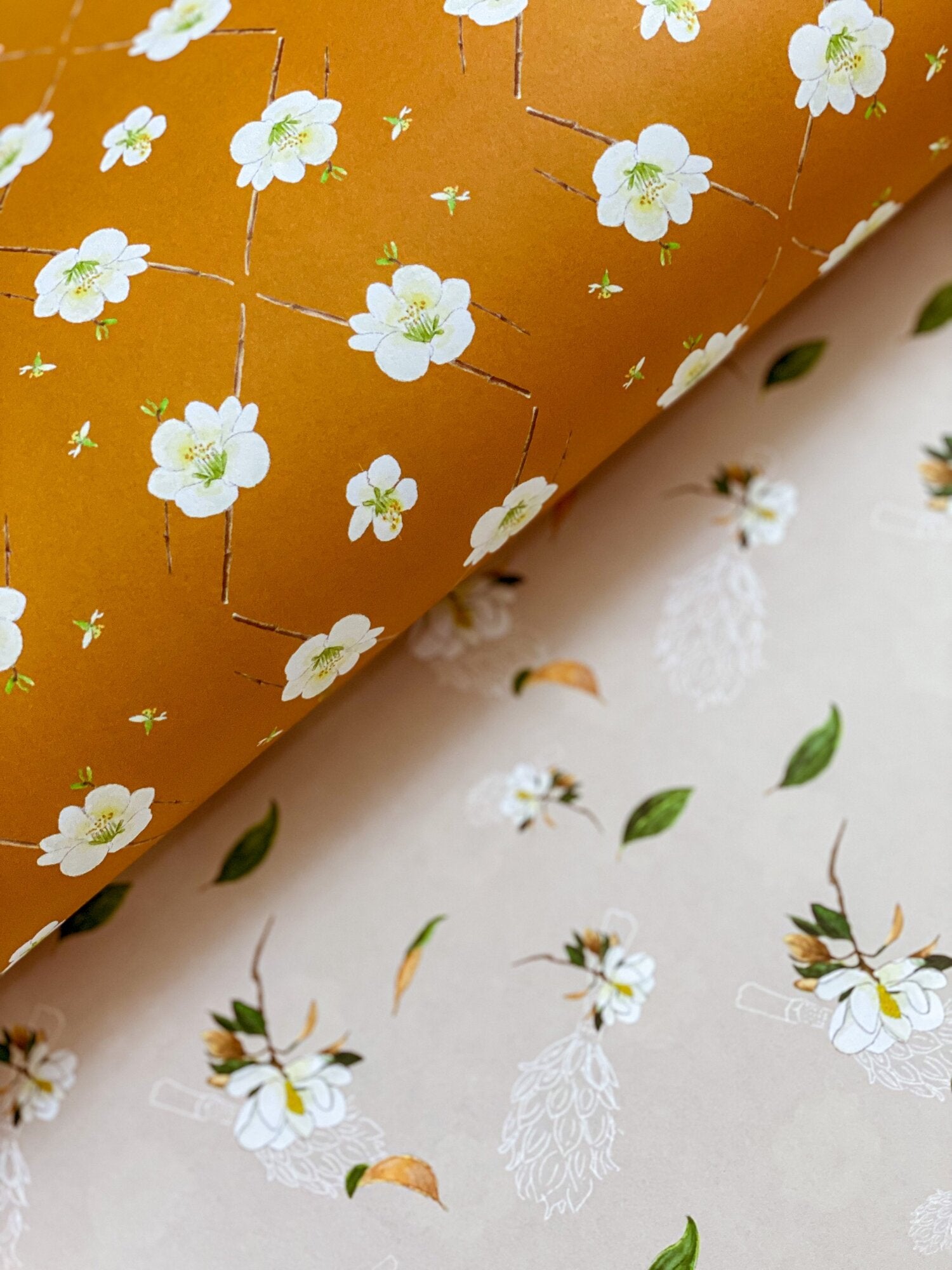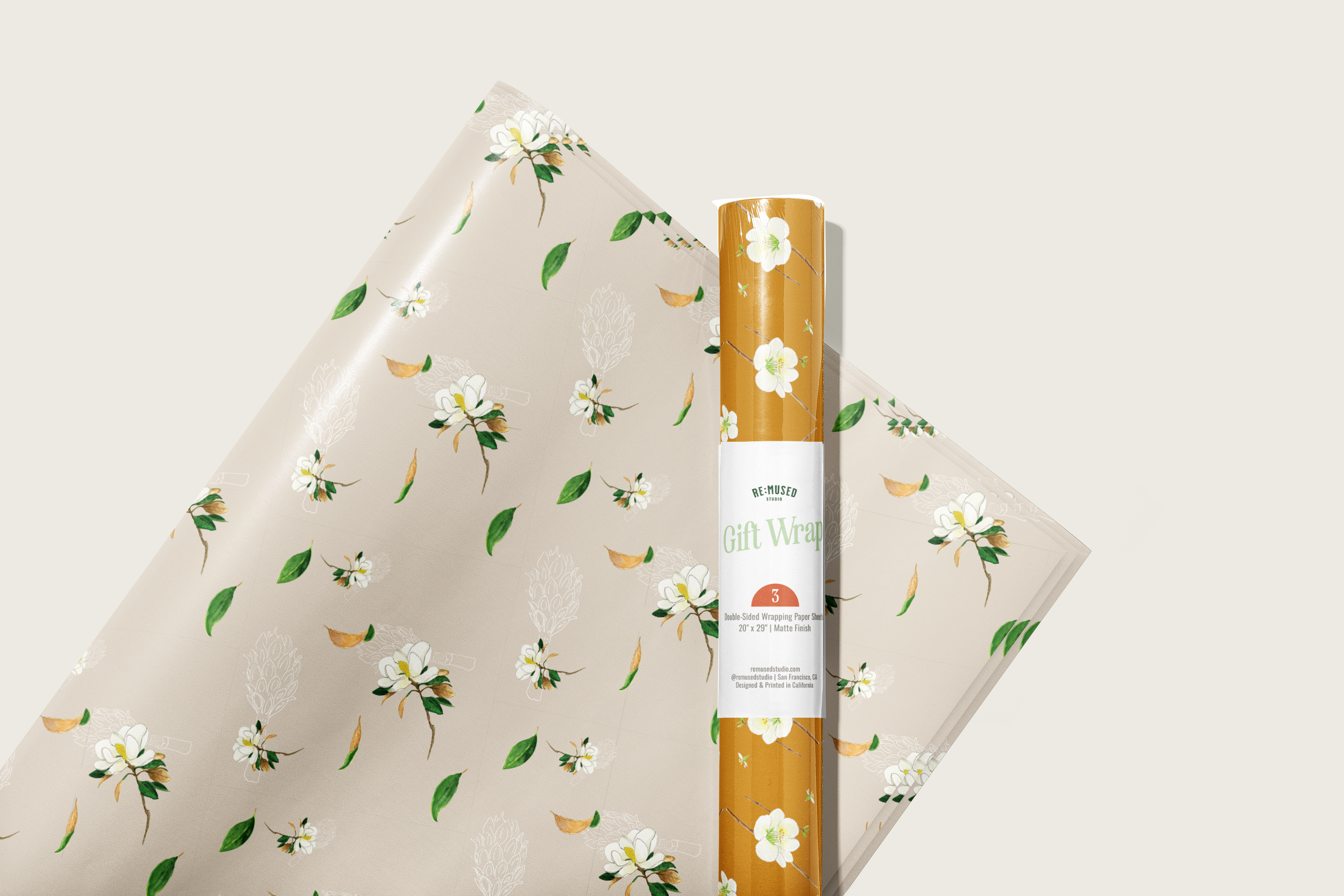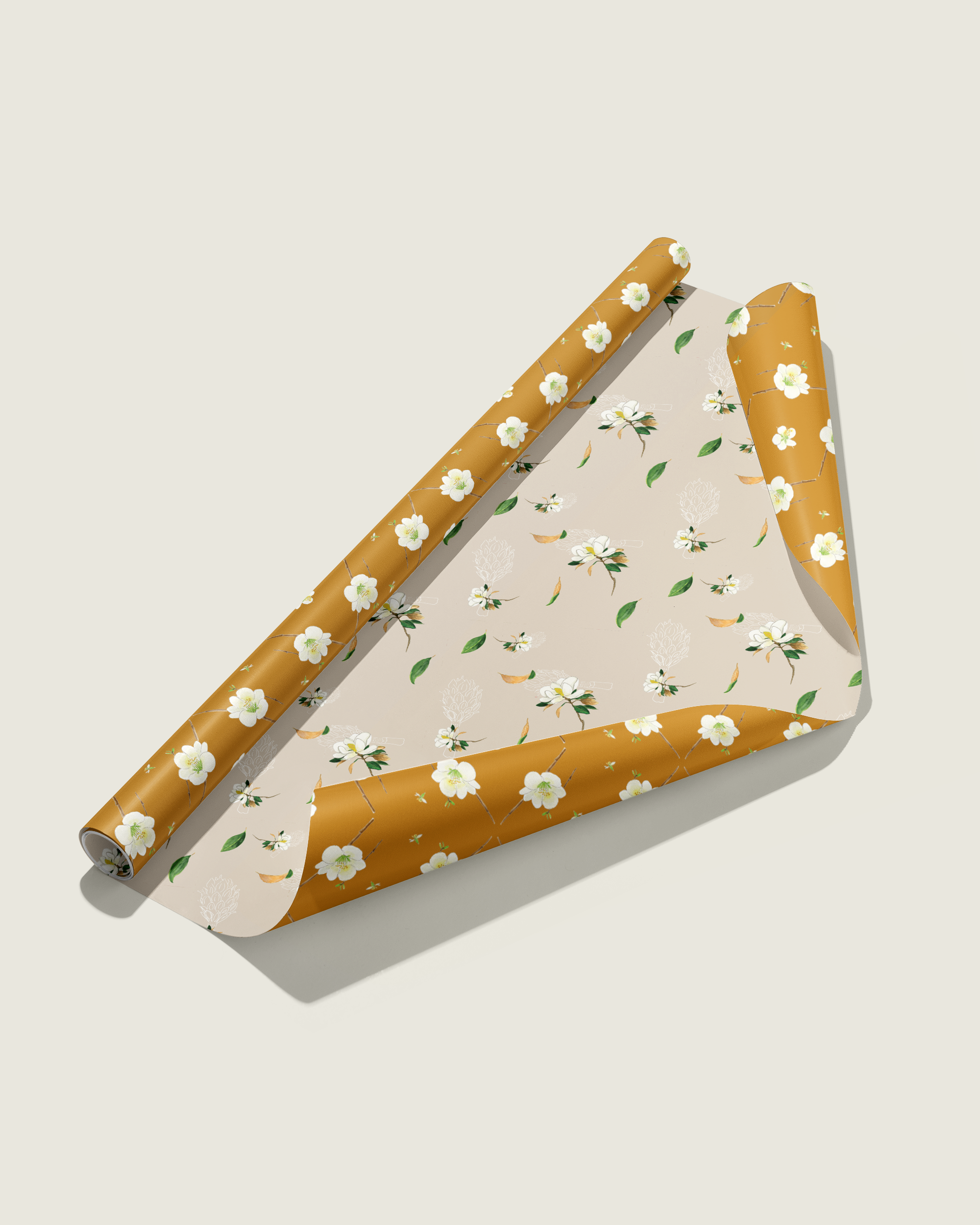 Double the fun with our double-sided wrapping paper featuring a cream and green scattered magnolia botanical pattern print on one side, gold and cream quince blossom tile print on the other. This sophisticated neutral gift wrap is a customer favorite throughout the year, perfect for weddings, birthdays, baby showers, Mother's Day and more with it's delicate watercolor and ink illustrations.