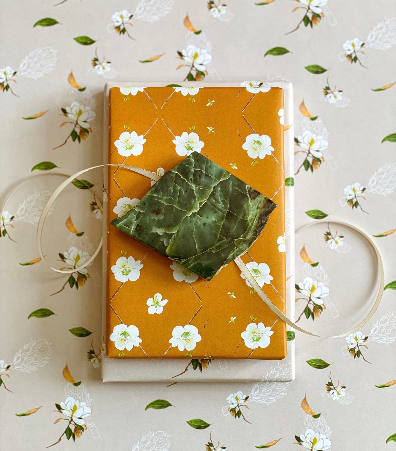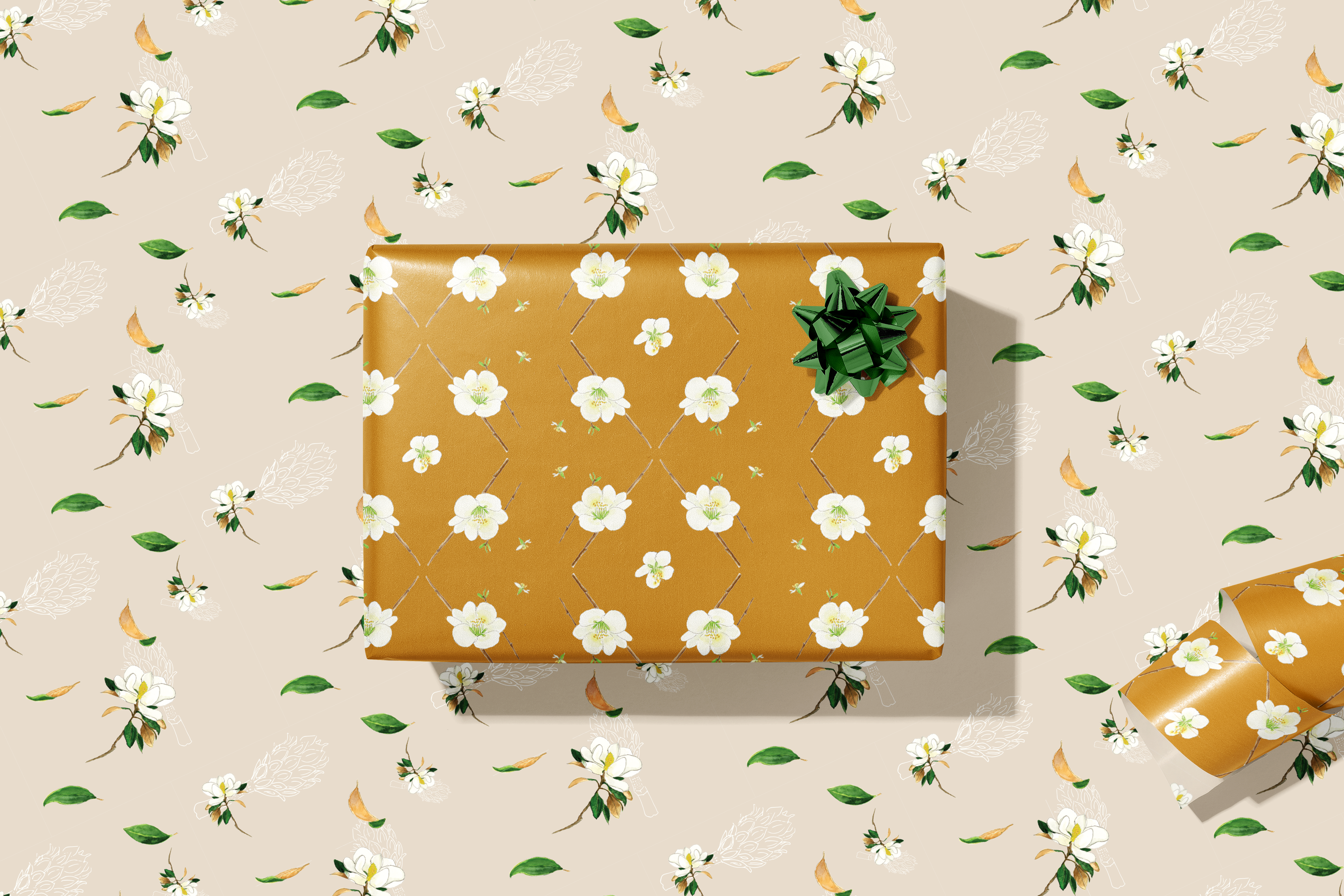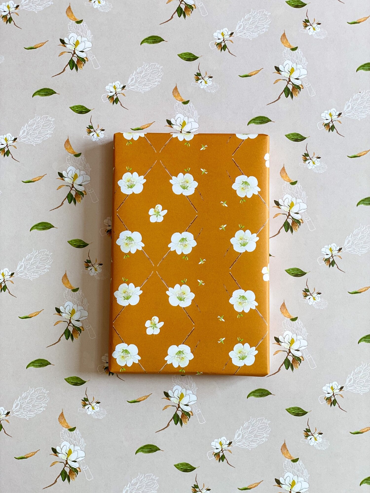 Double the fun with our double-sided wrapping paper featuring a cream and green scattered magnolia botanical pattern print on one side, gold and cream quince blossom tile print on the other. This sophisticated neutral gift wrap is a customer favorite throughout the year, perfect for weddings, birthdays, baby showers, Mother's Day and more with it's delicate watercolor and ink illustrations.