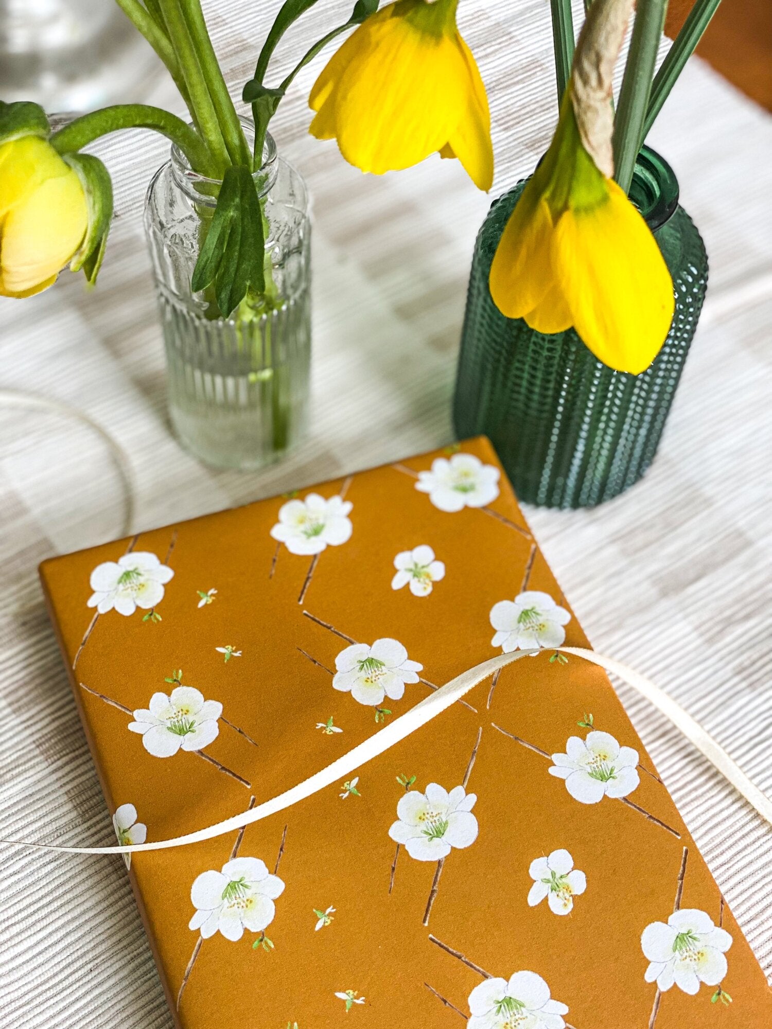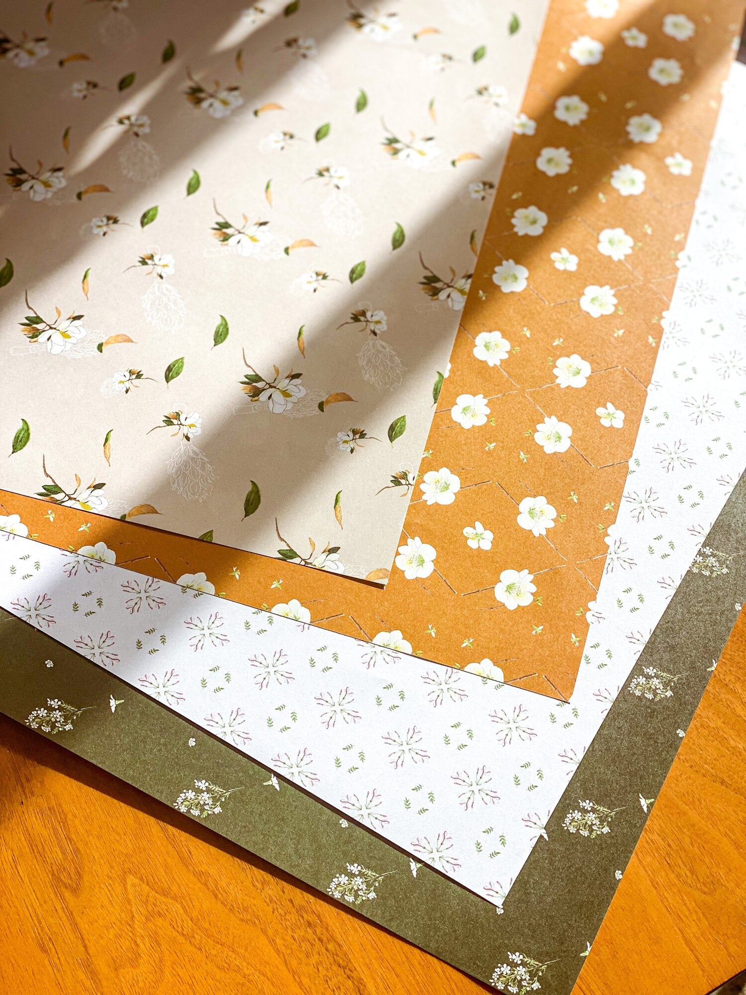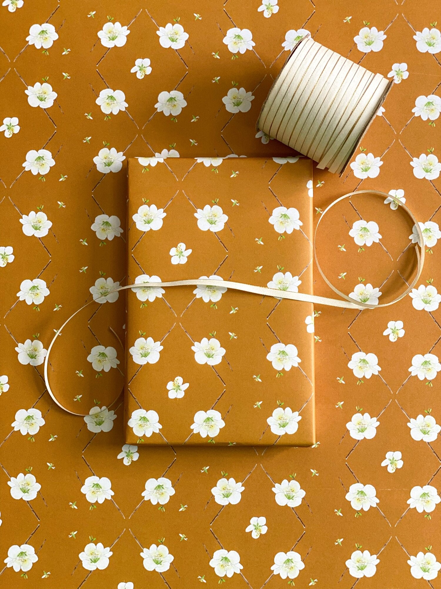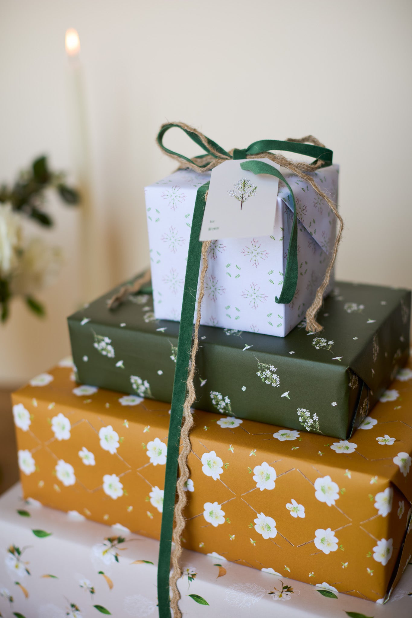 Double the fun with our double-sided wrapping paper featuring a cream and green scattered magnolia botanical pattern print on one side, gold and cream quince blossom tile print on the other. This sophisticated neutral gift wrap is a customer favorite throughout the year, perfect for weddings, birthdays, baby showers, Mother's Day and more with it's delicate watercolor and ink illustrations.