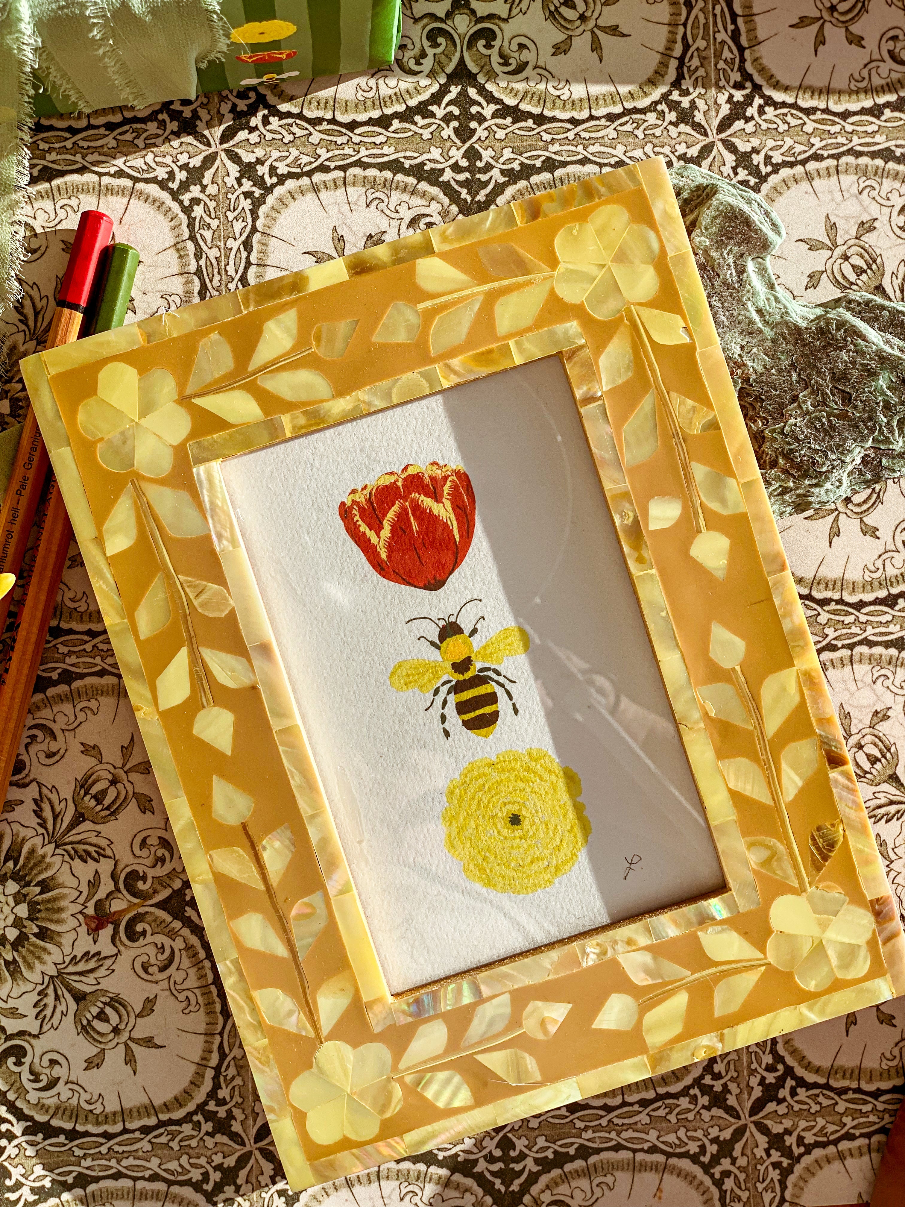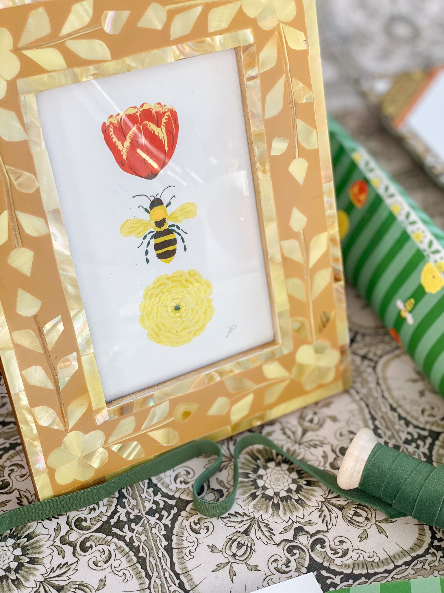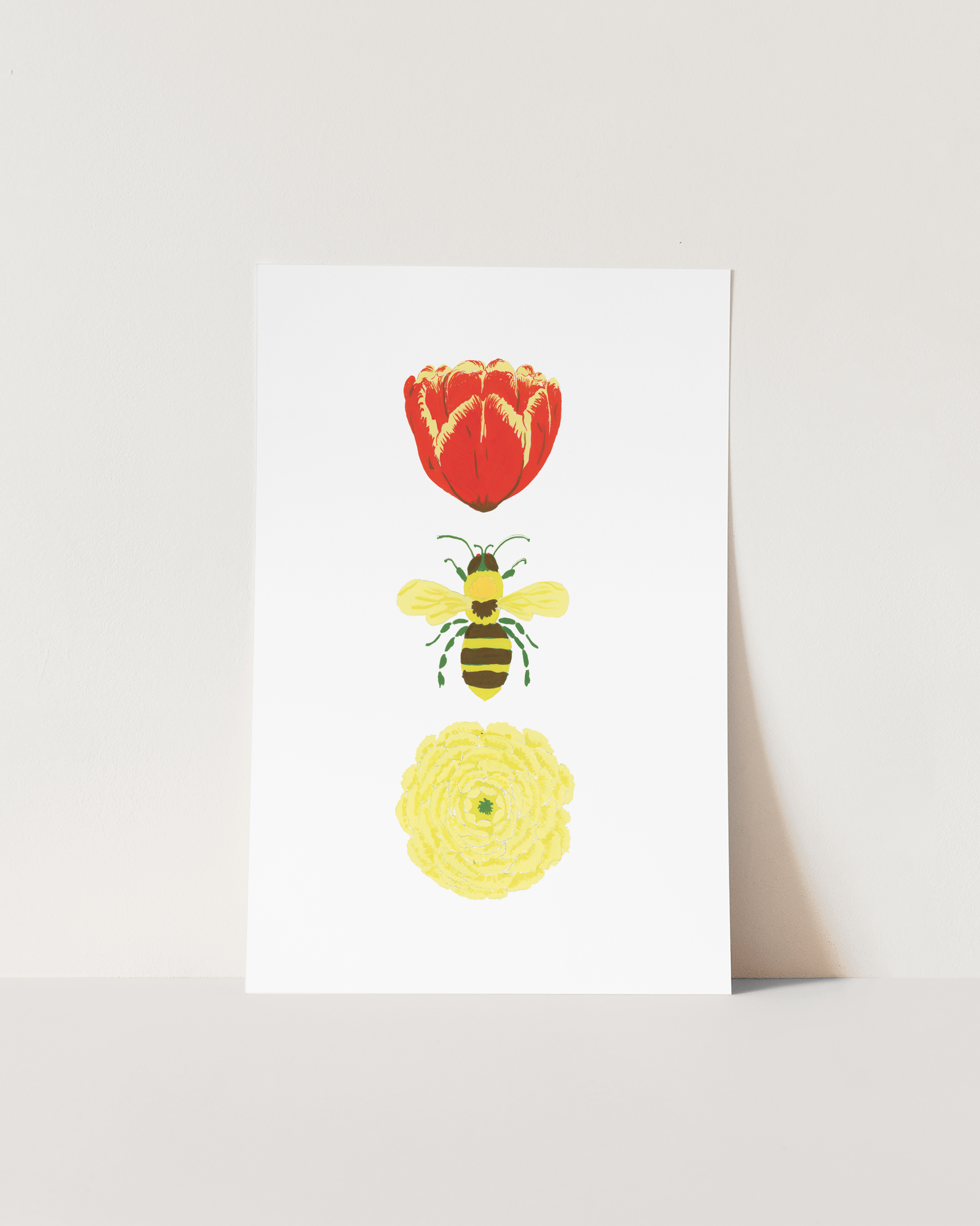 A charming spring and nature-inspired motif of a hand-painted trio of tulip, bee and ranunculus, make up this museum quality art print. The illustration is designed to pair with it's matching gift wrap and greeting cards in the "Spring Fling" pattern for a lovely coordinated gift opportunity. The perfect size for gifting or smaller additions to a gallery wall.