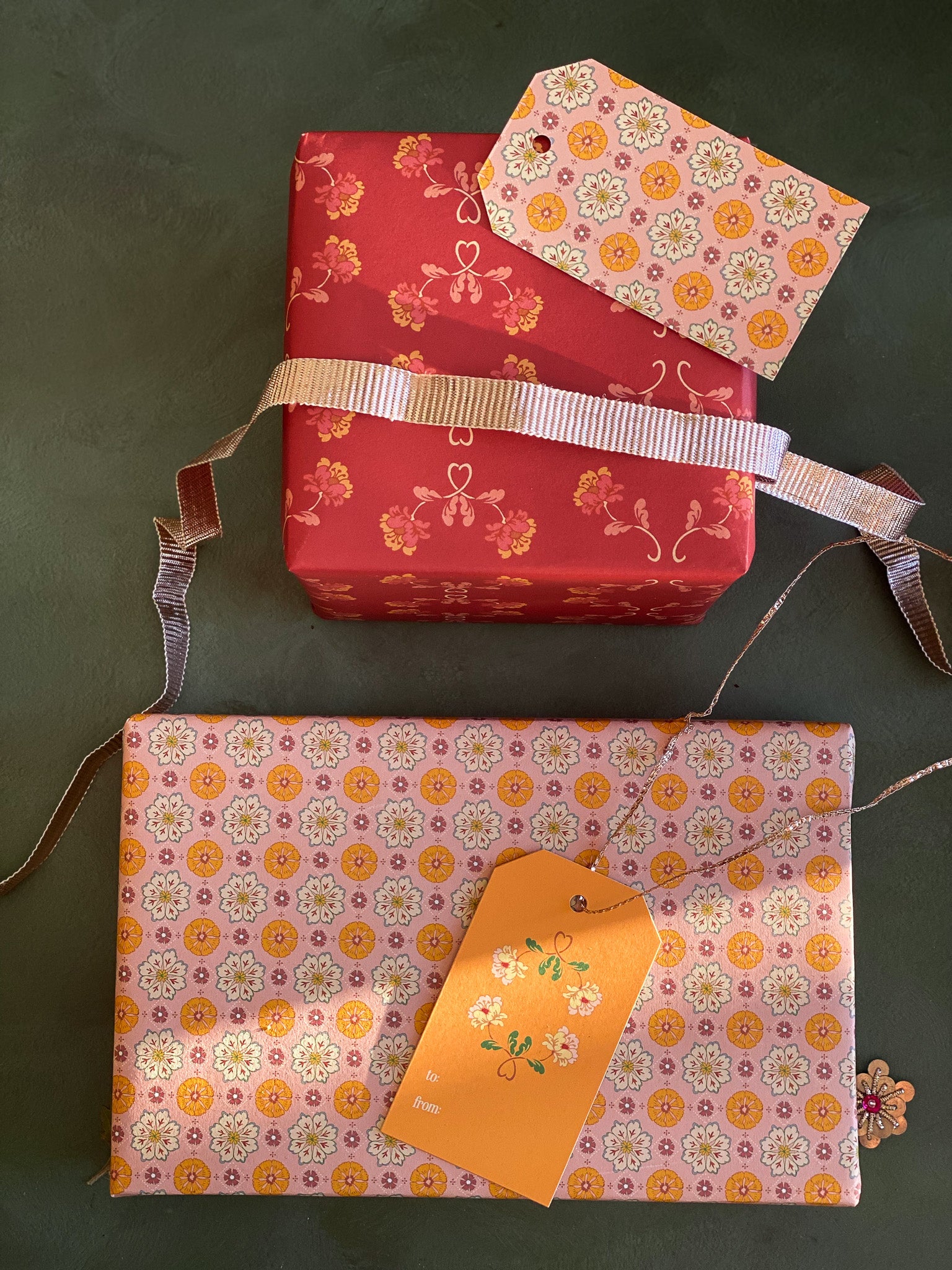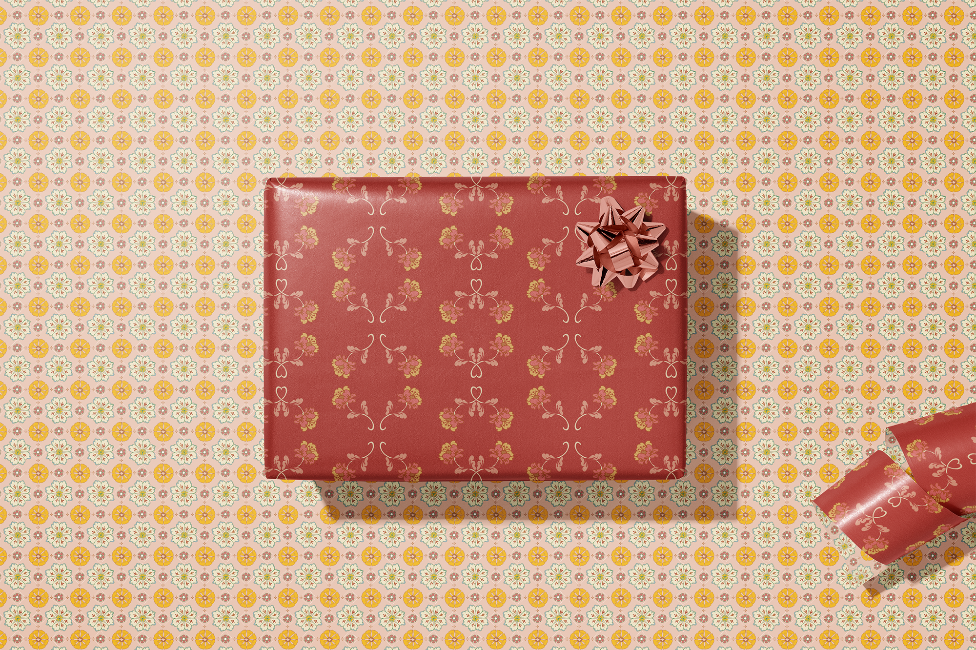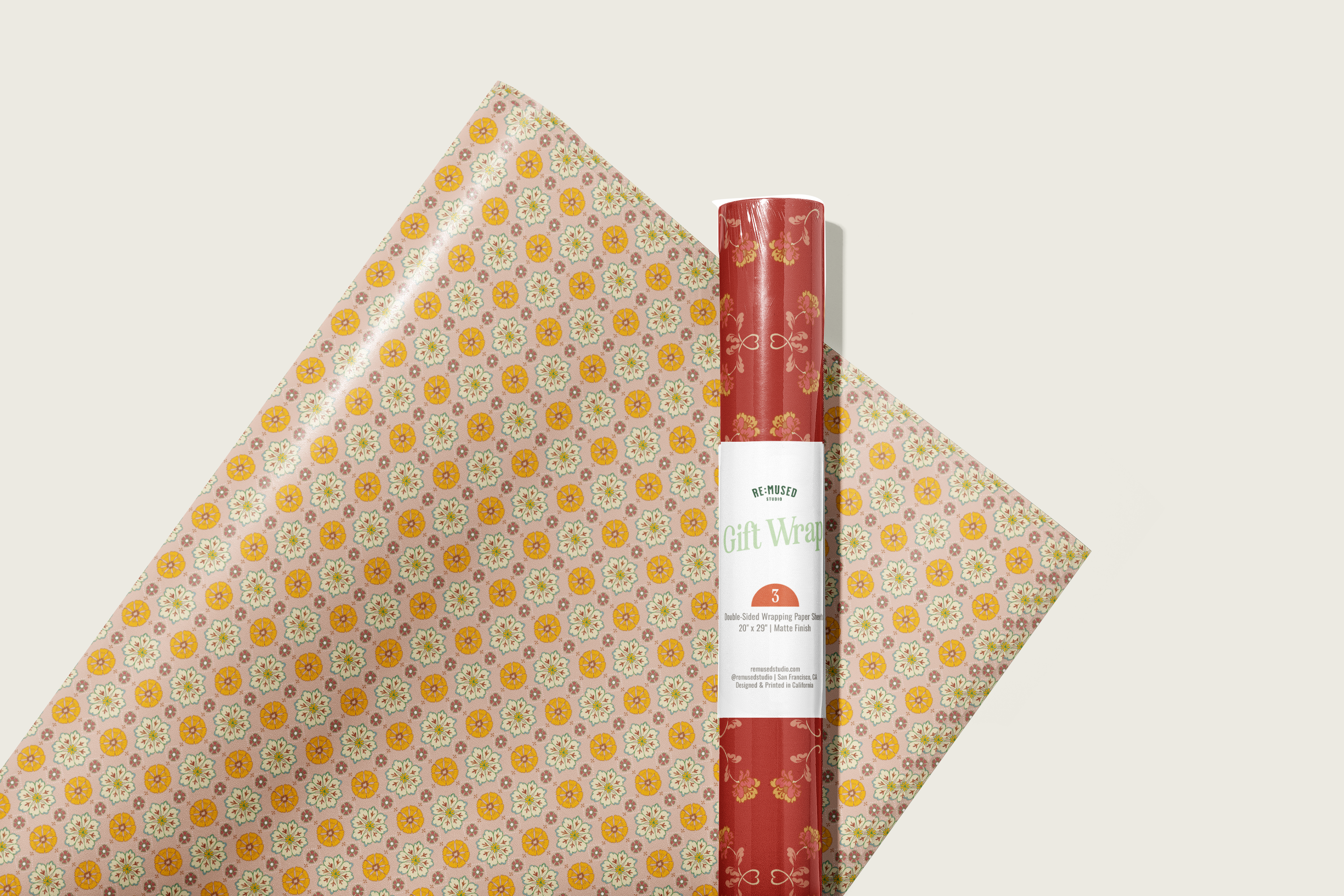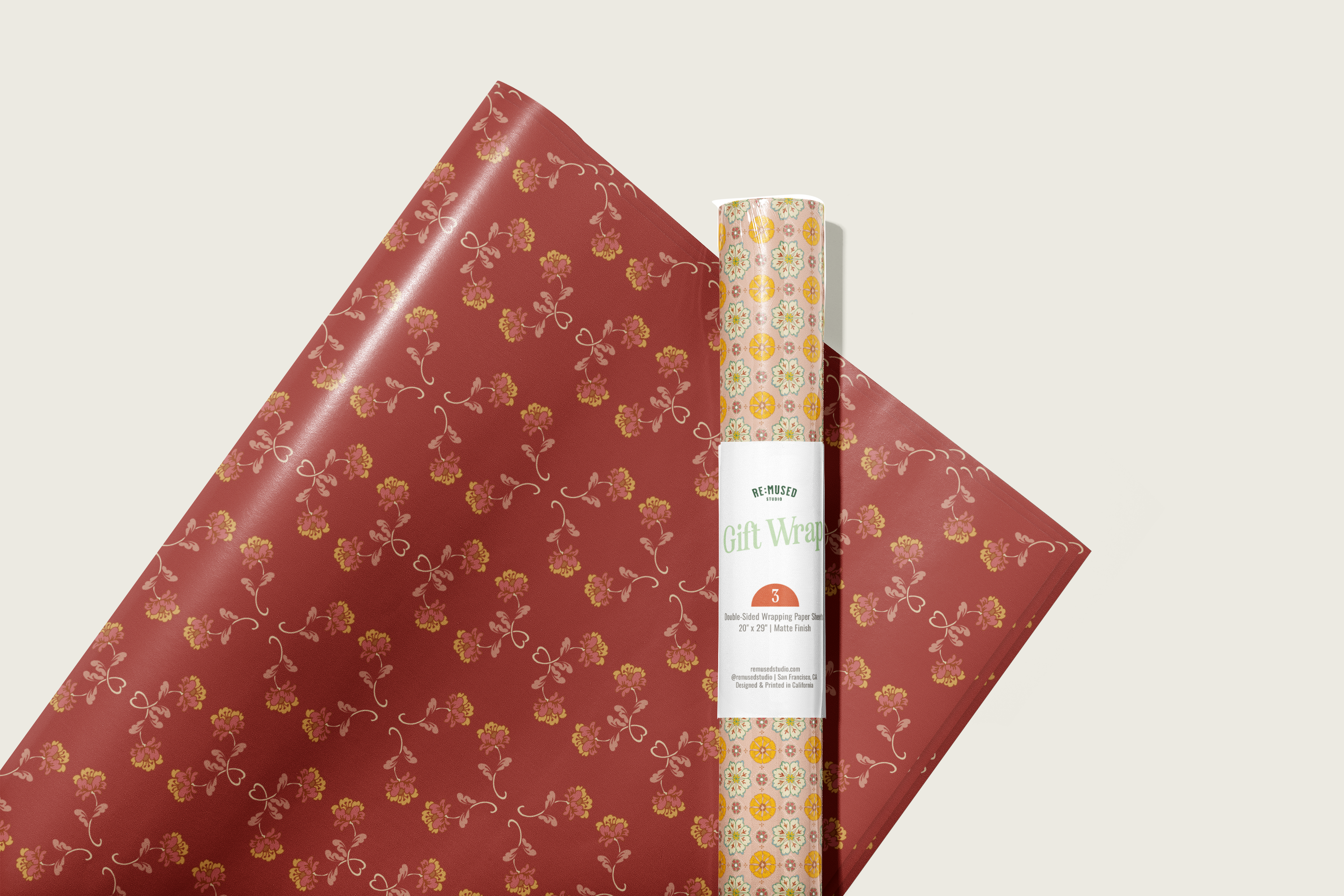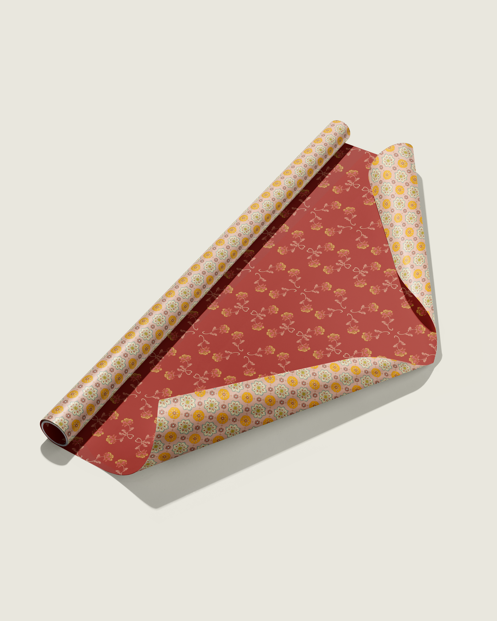 Double the festivities with our double-sided wrapping paper featuring a pair of vintage inspired floral sprig and rosette patterns. This gift wrap will brighten up the holidays and beyond.