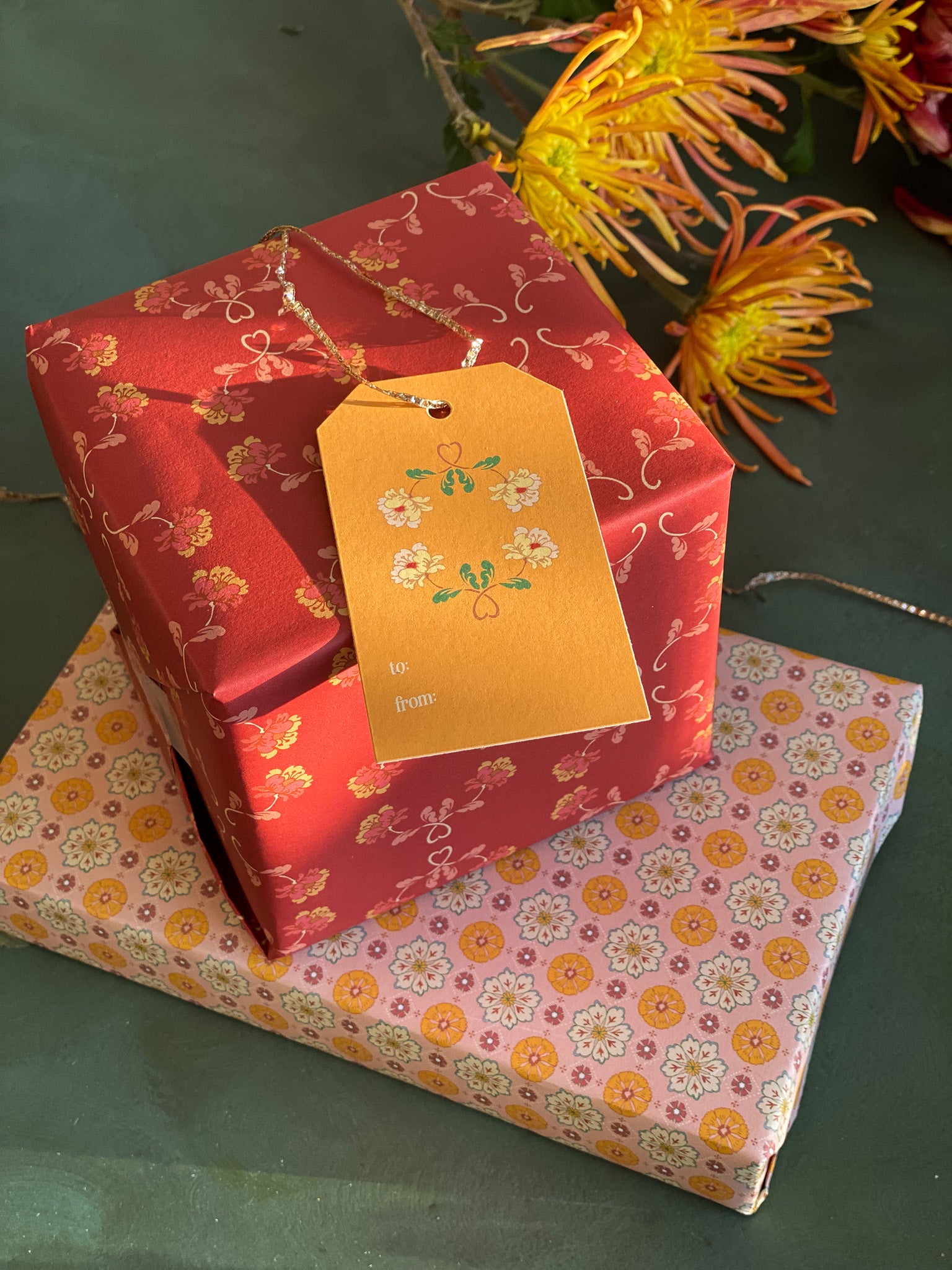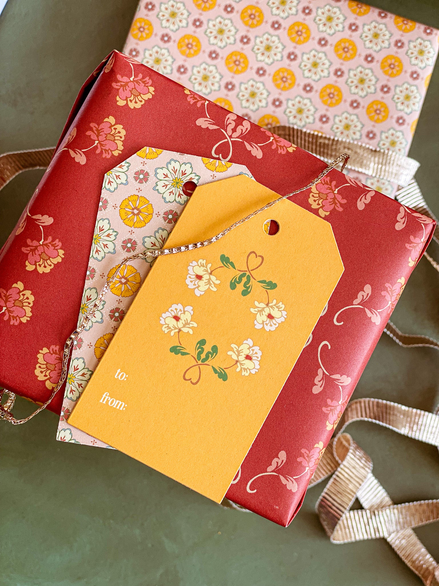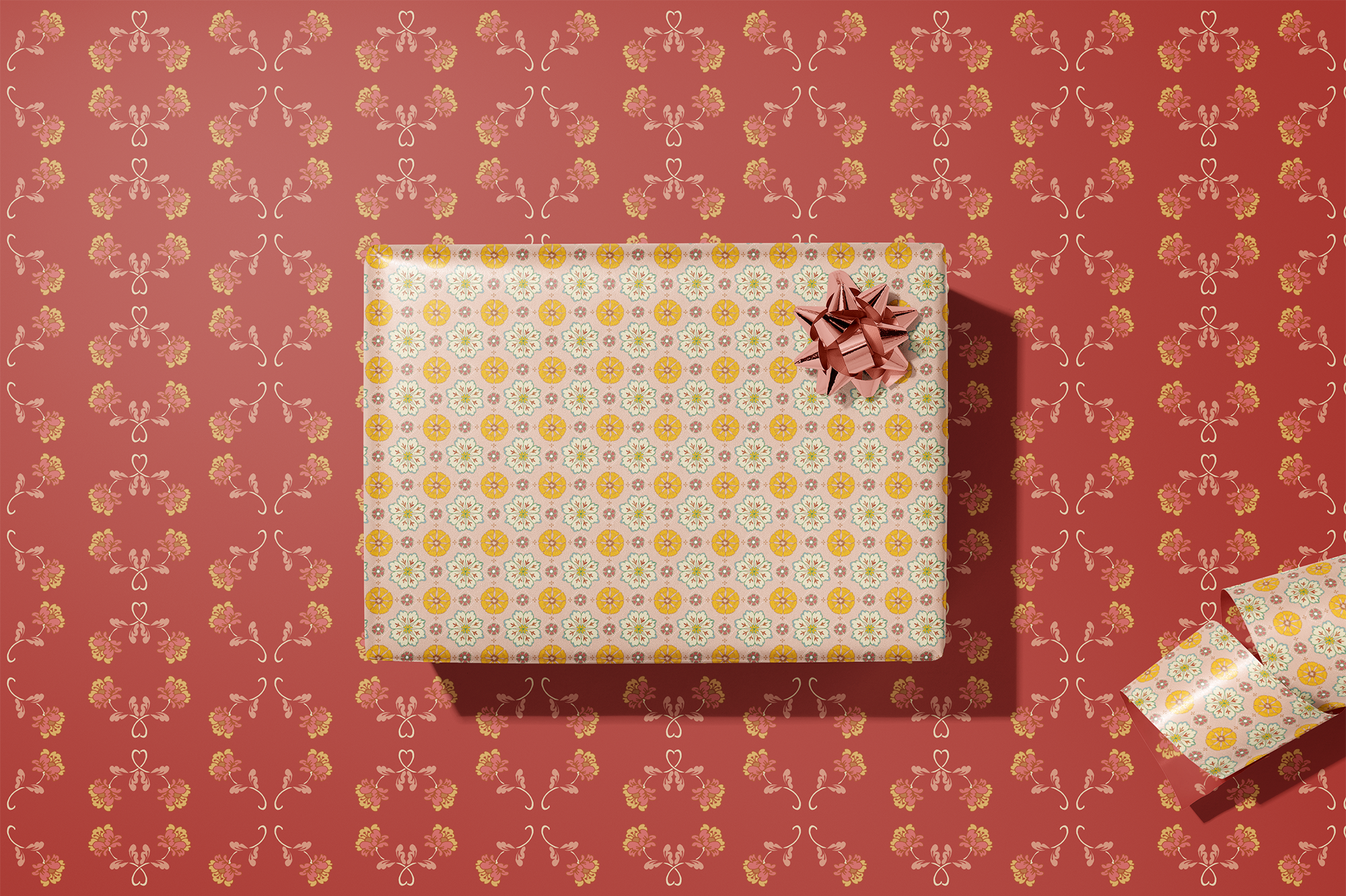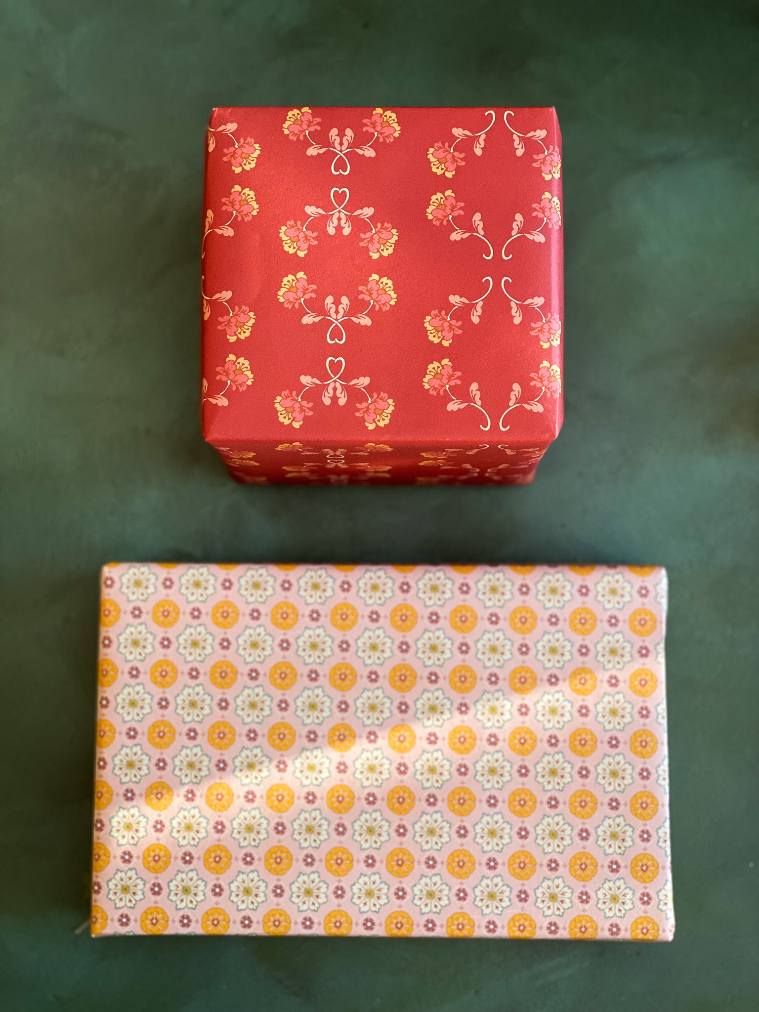 Double the festivities with our double-sided wrapping paper featuring a pair of vintage inspired floral sprig and rosette patterns. This gift wrap will brighten up the holidays and beyond.