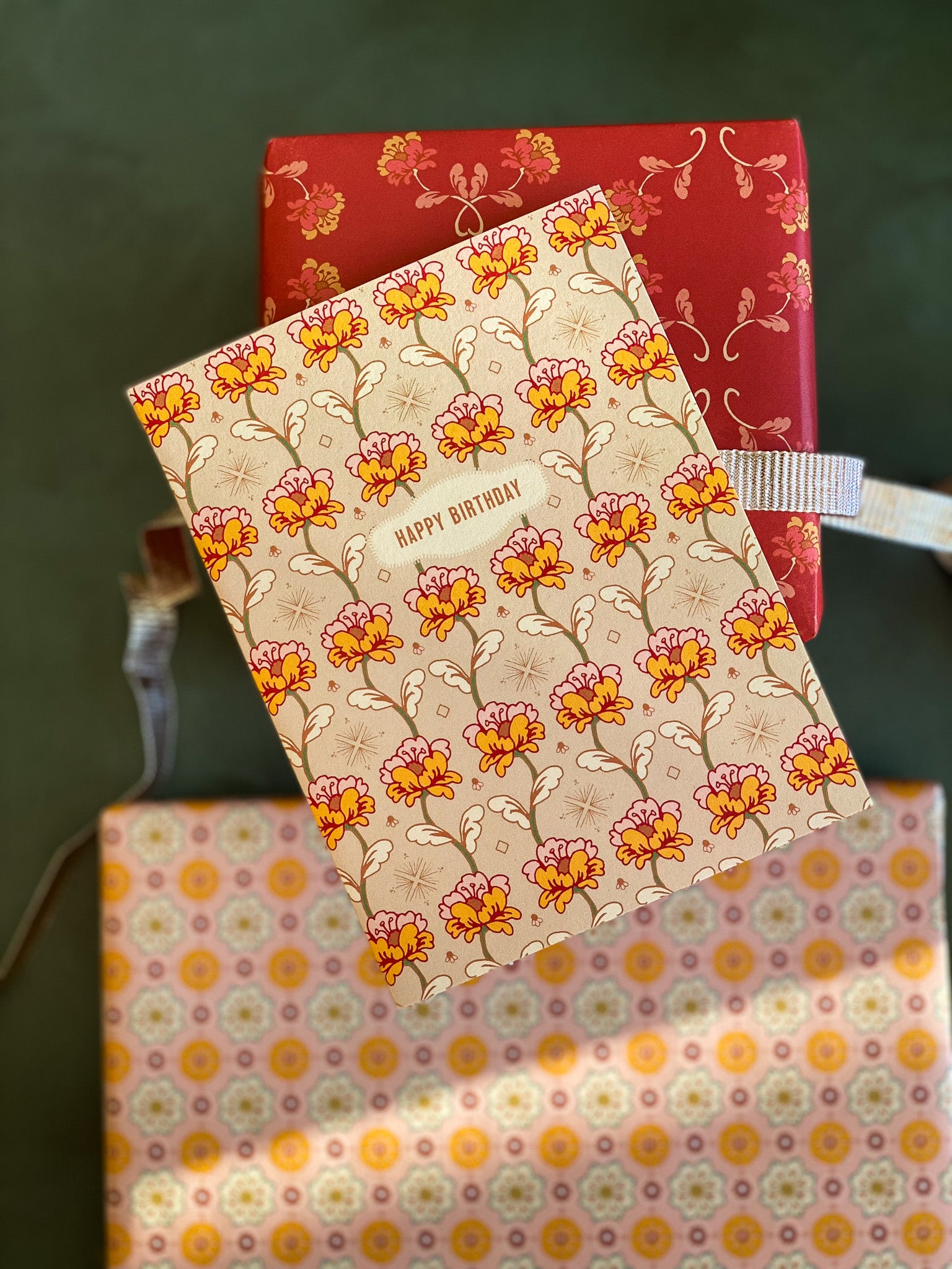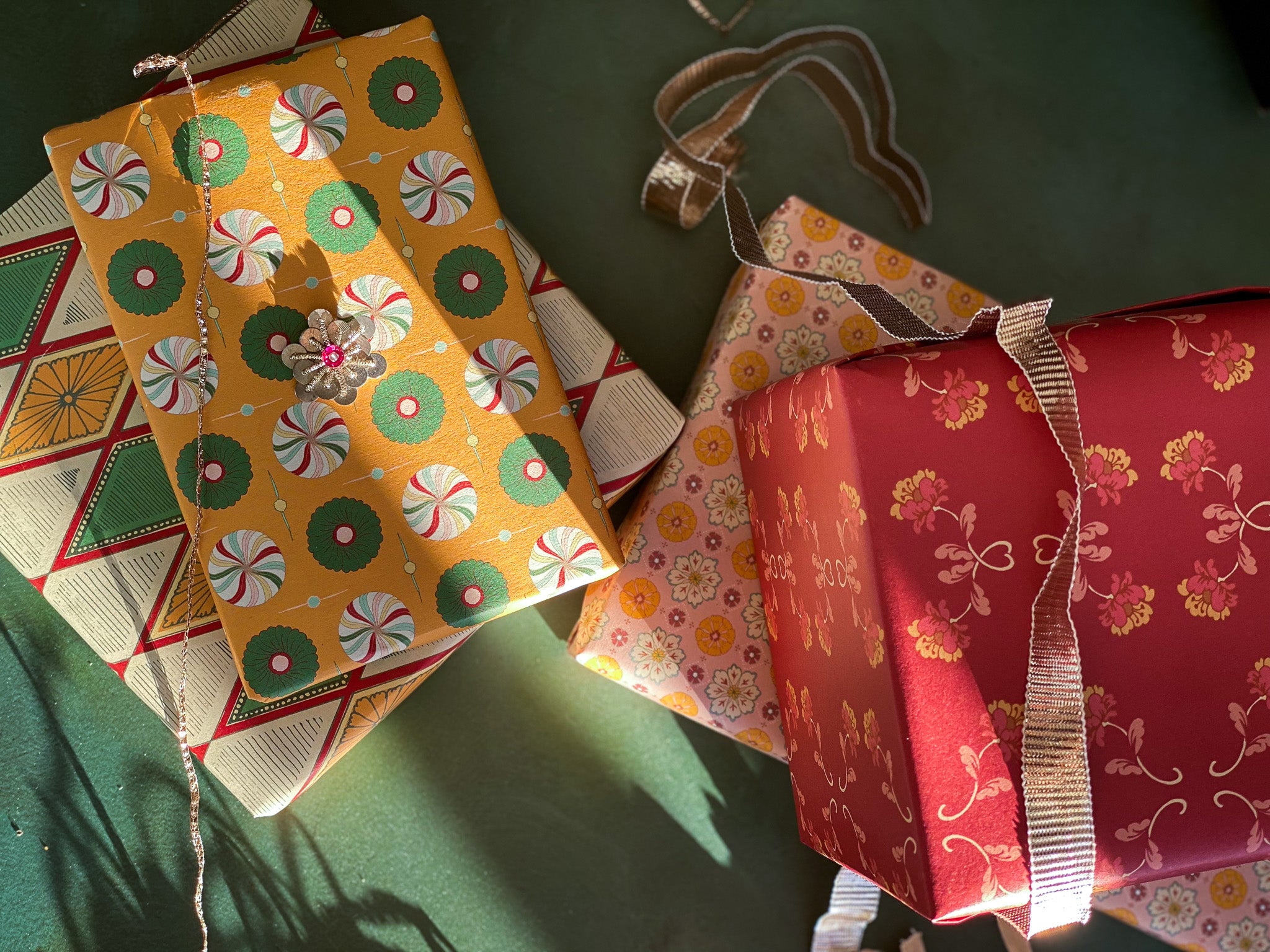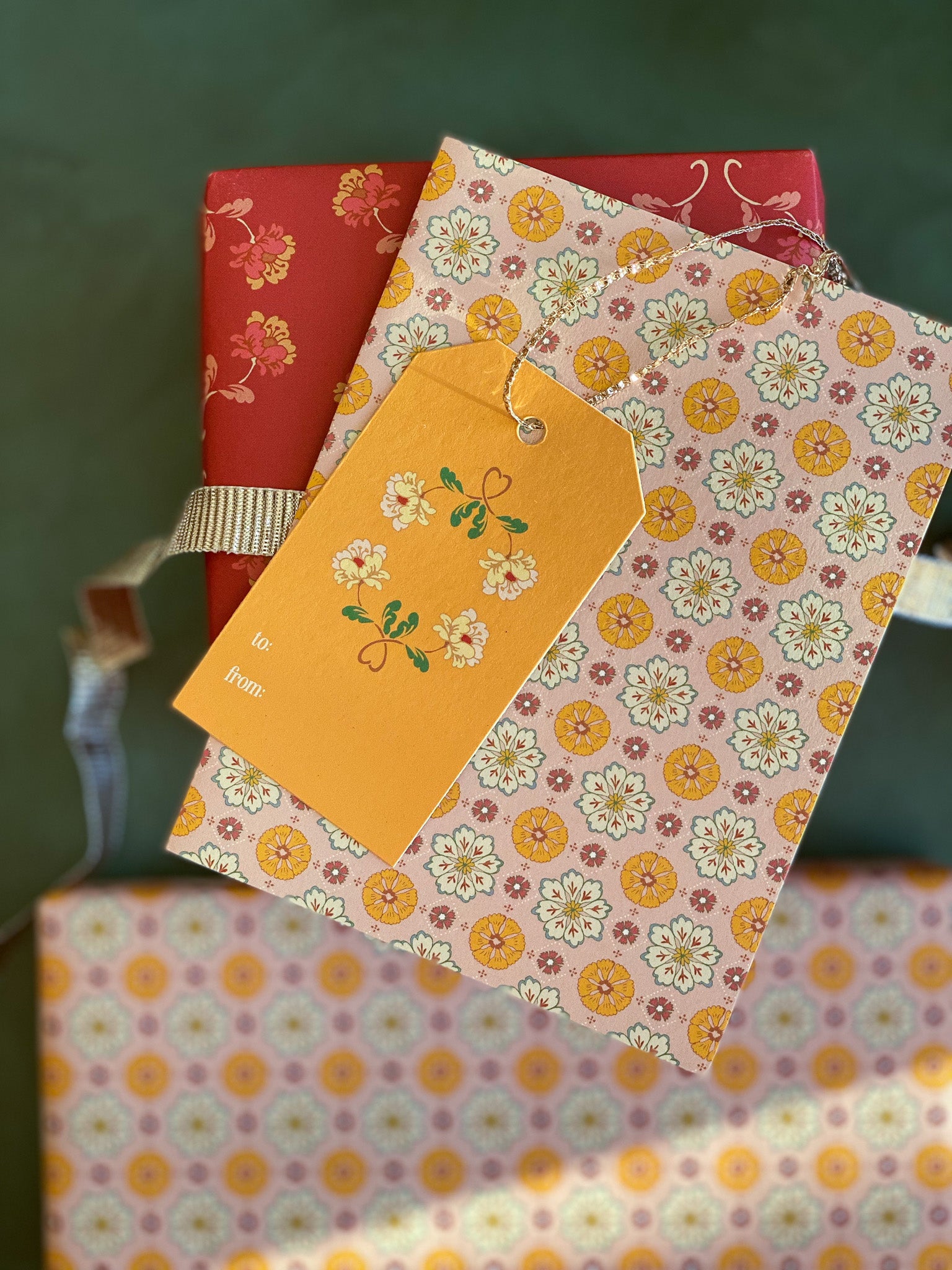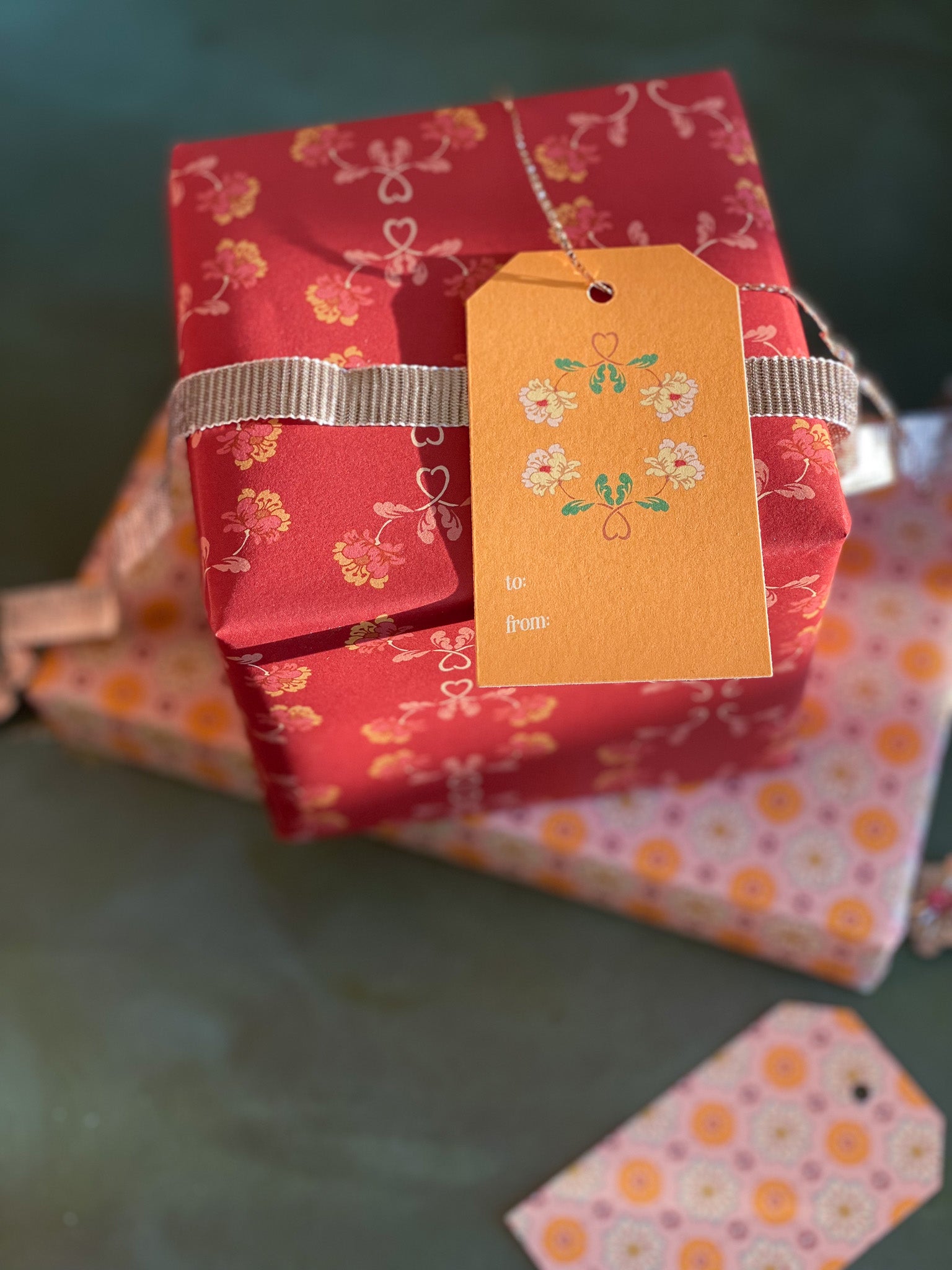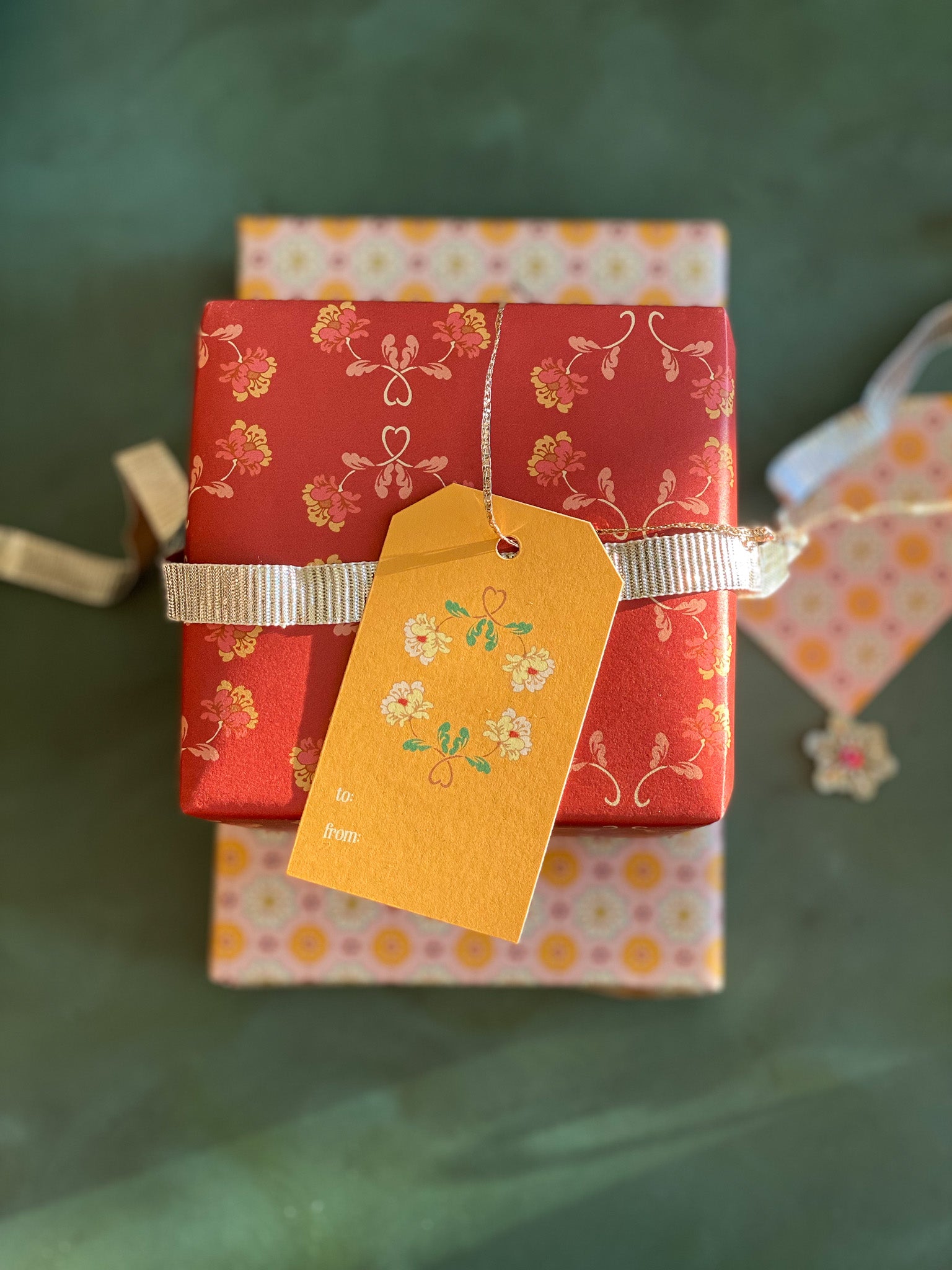 Double the festivities with our double-sided wrapping paper featuring a pair of vintage inspired floral sprig and rosette patterns. This gift wrap will brighten up the holidays and beyond.