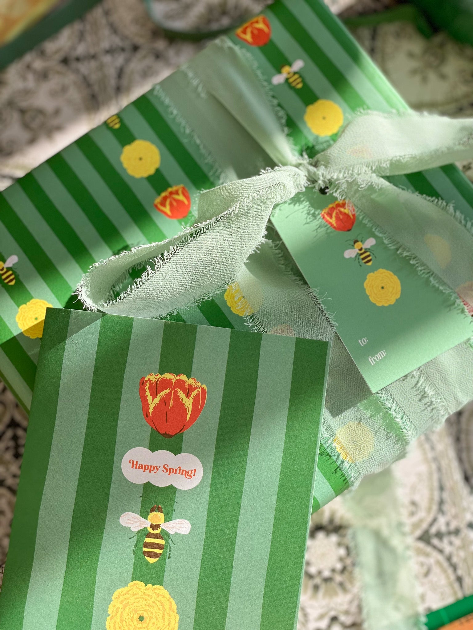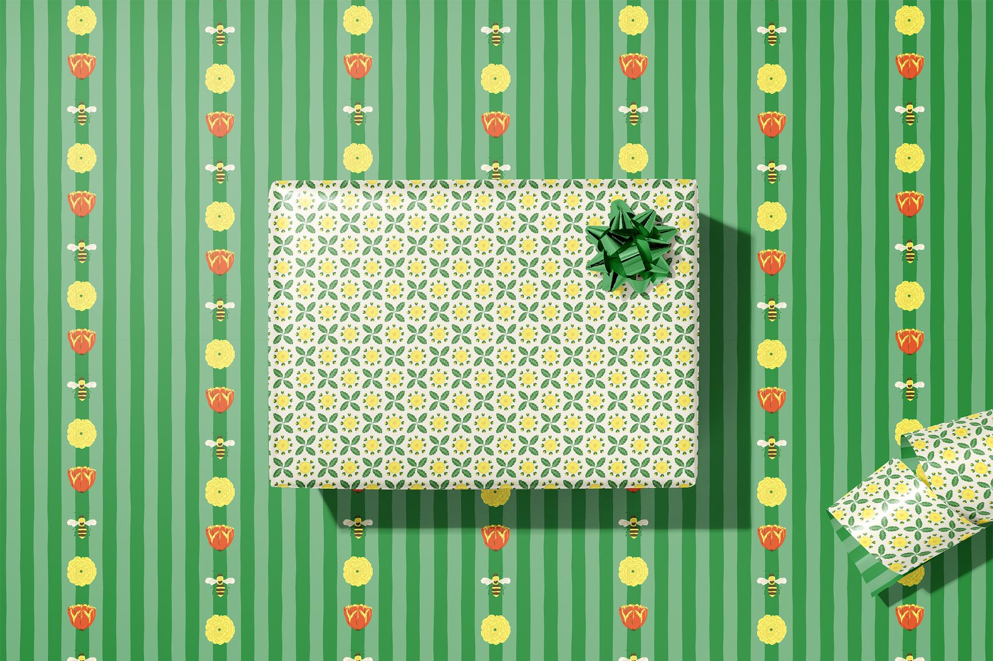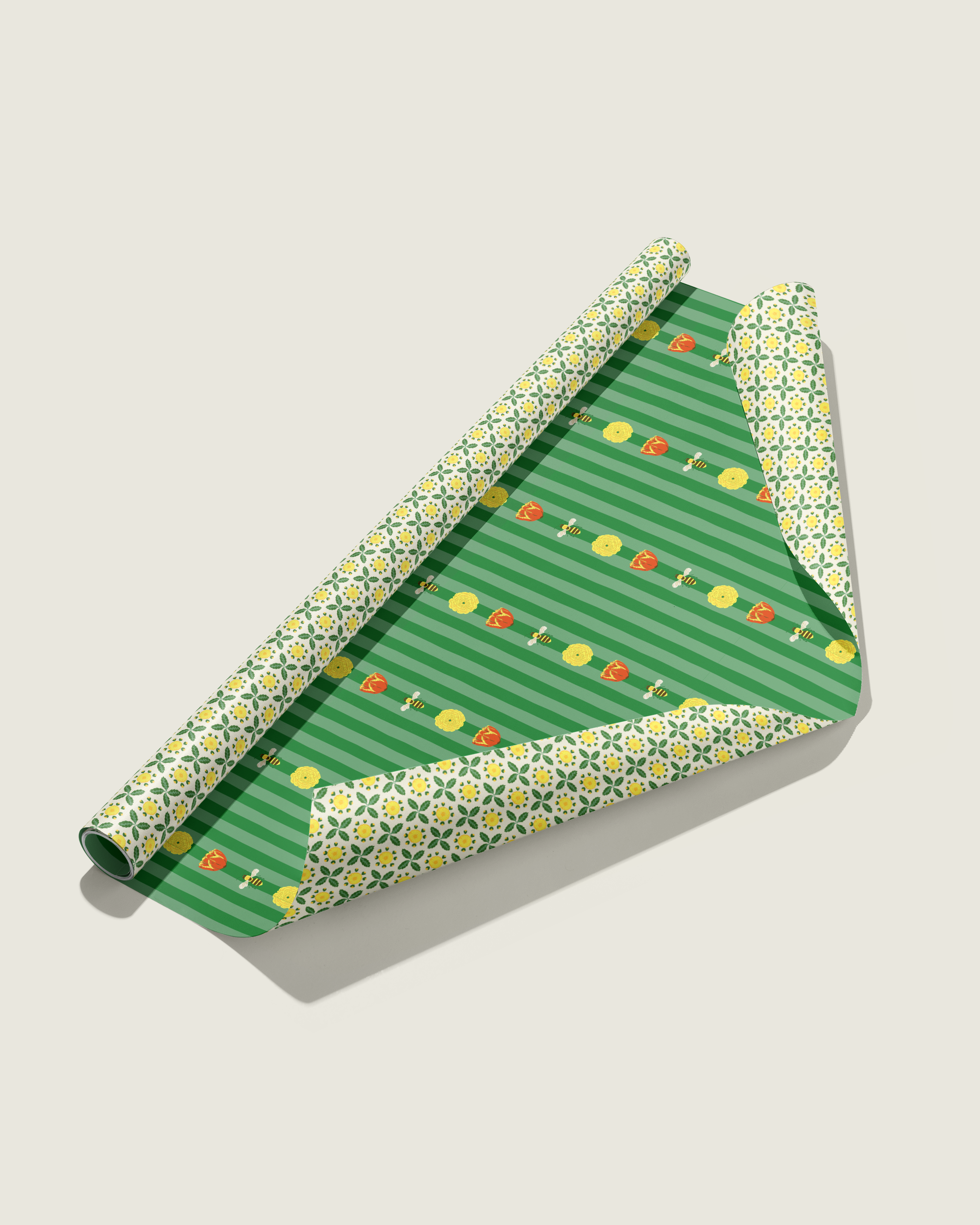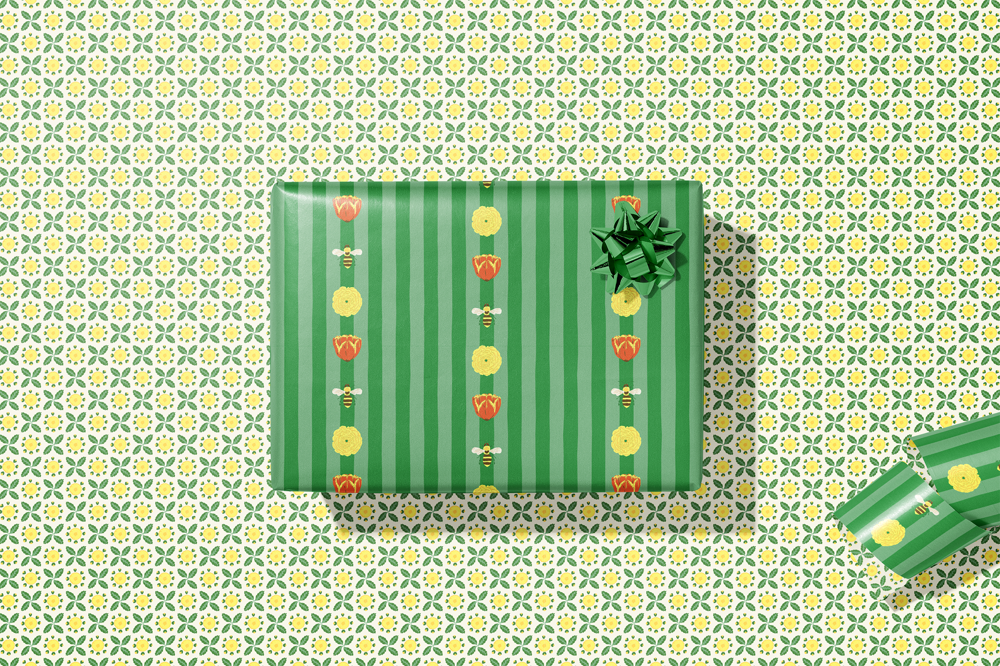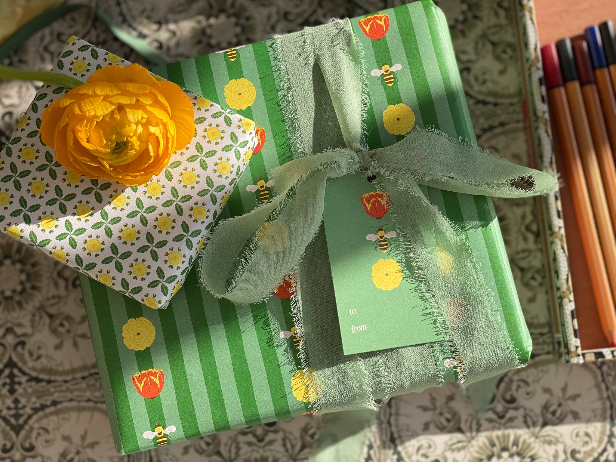 Double the possibilities with our double-sided wrapping paper featuring a pair vibrant Spring floral patterns inspired by the colors and art of the Italian coast. On one side a simple lemon yellow and green geometric tile grid floral and leaf pattern on a cream background and rows of tulips, ranunculus, bees on a green grass jumbo stripe background on the other. Wonderful for Spring and Summer birthdays, Easter, Spring Equinox celebrations, baby showers and beyond.