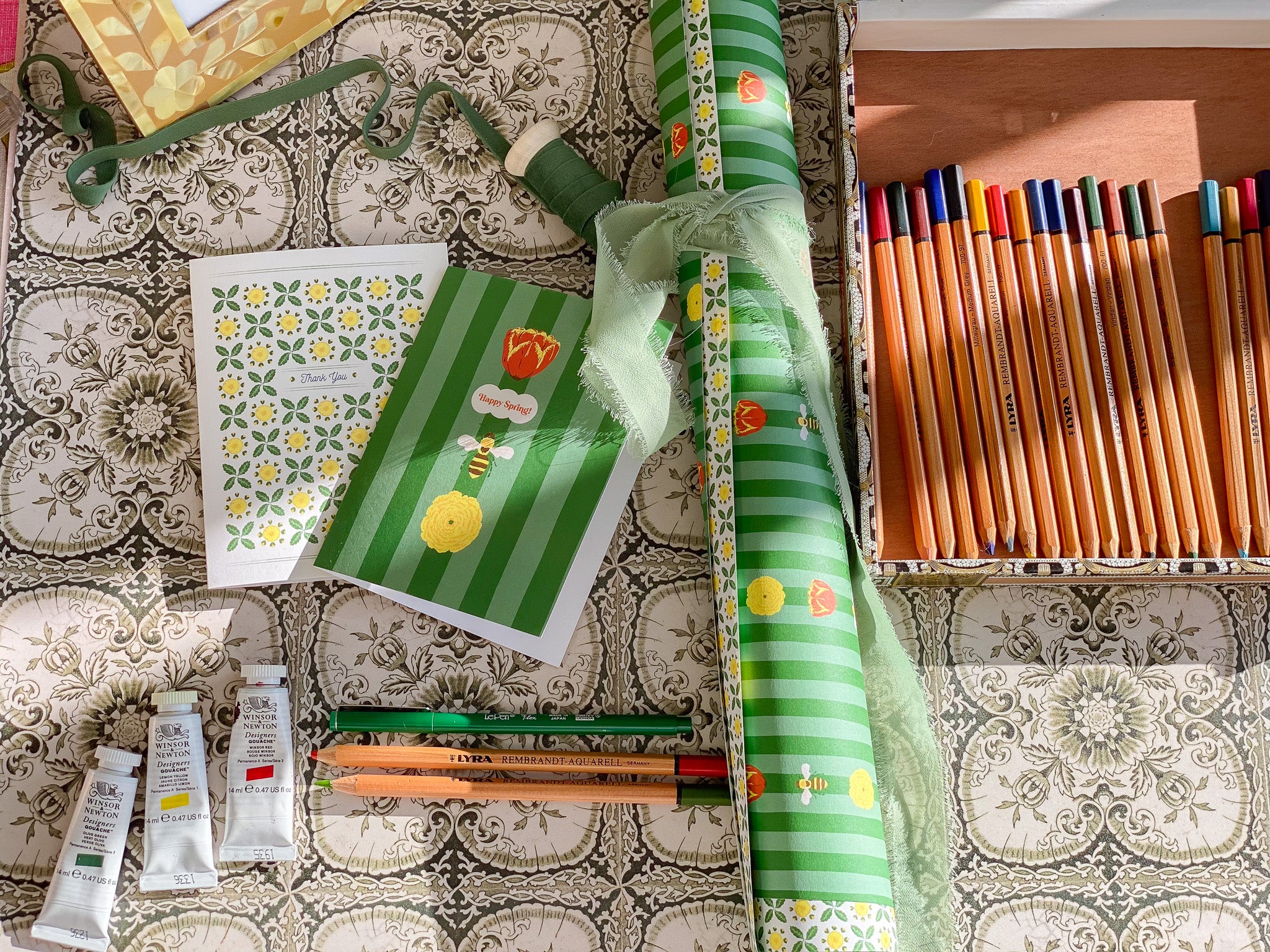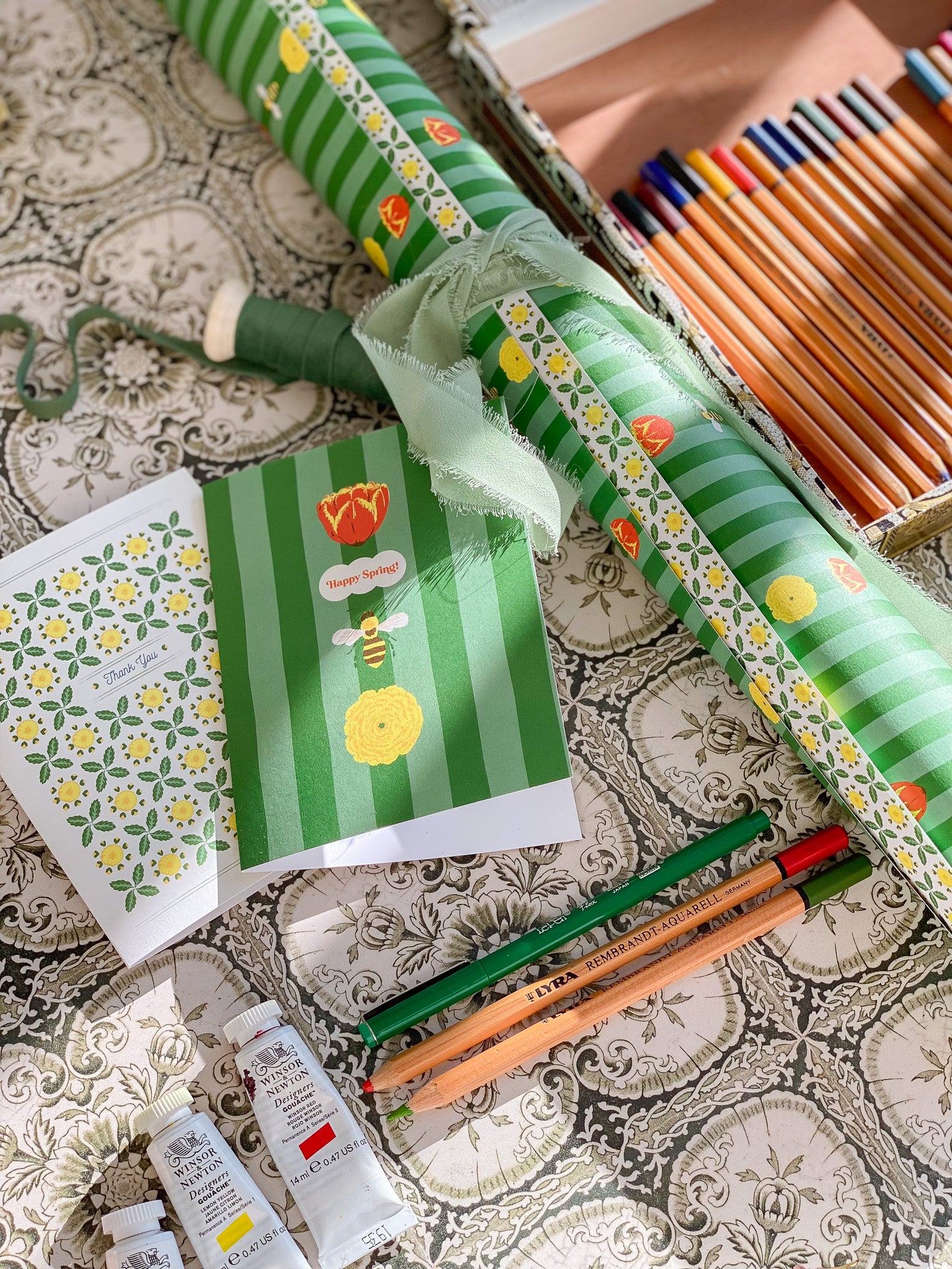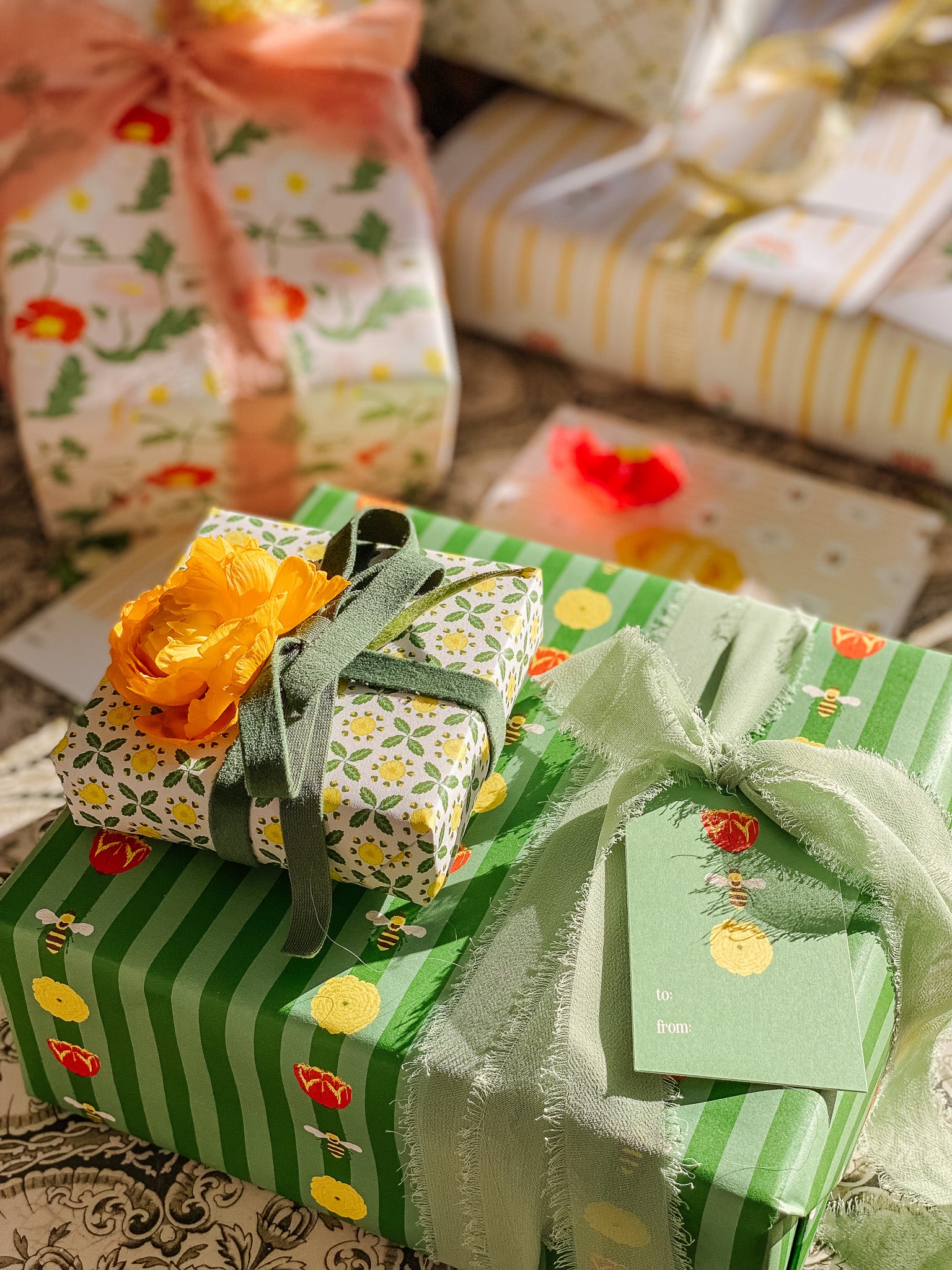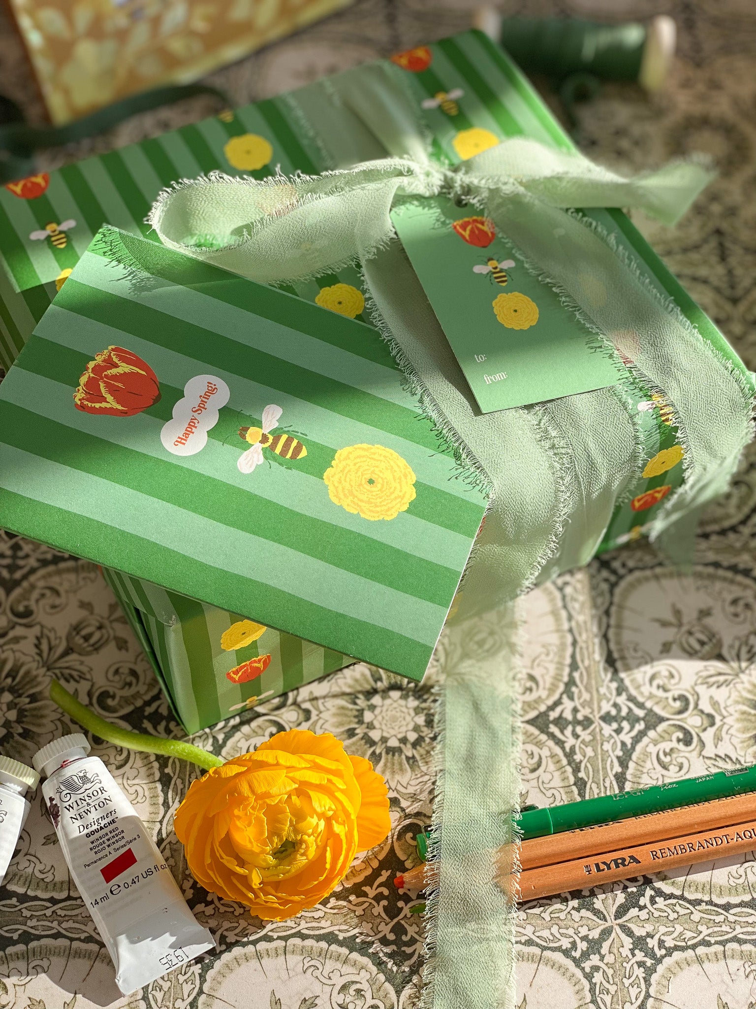 Double the possibilities with our double-sided wrapping paper featuring a pair vibrant Spring floral patterns inspired by the colors and art of the Italian coast. On one side a simple lemon yellow and green geometric tile grid floral and leaf pattern on a cream background and rows of tulips, ranunculus, bees on a green grass jumbo stripe background on the other. Wonderful for Spring and Summer birthdays, Easter, Spring Equinox celebrations, baby showers and beyond.
