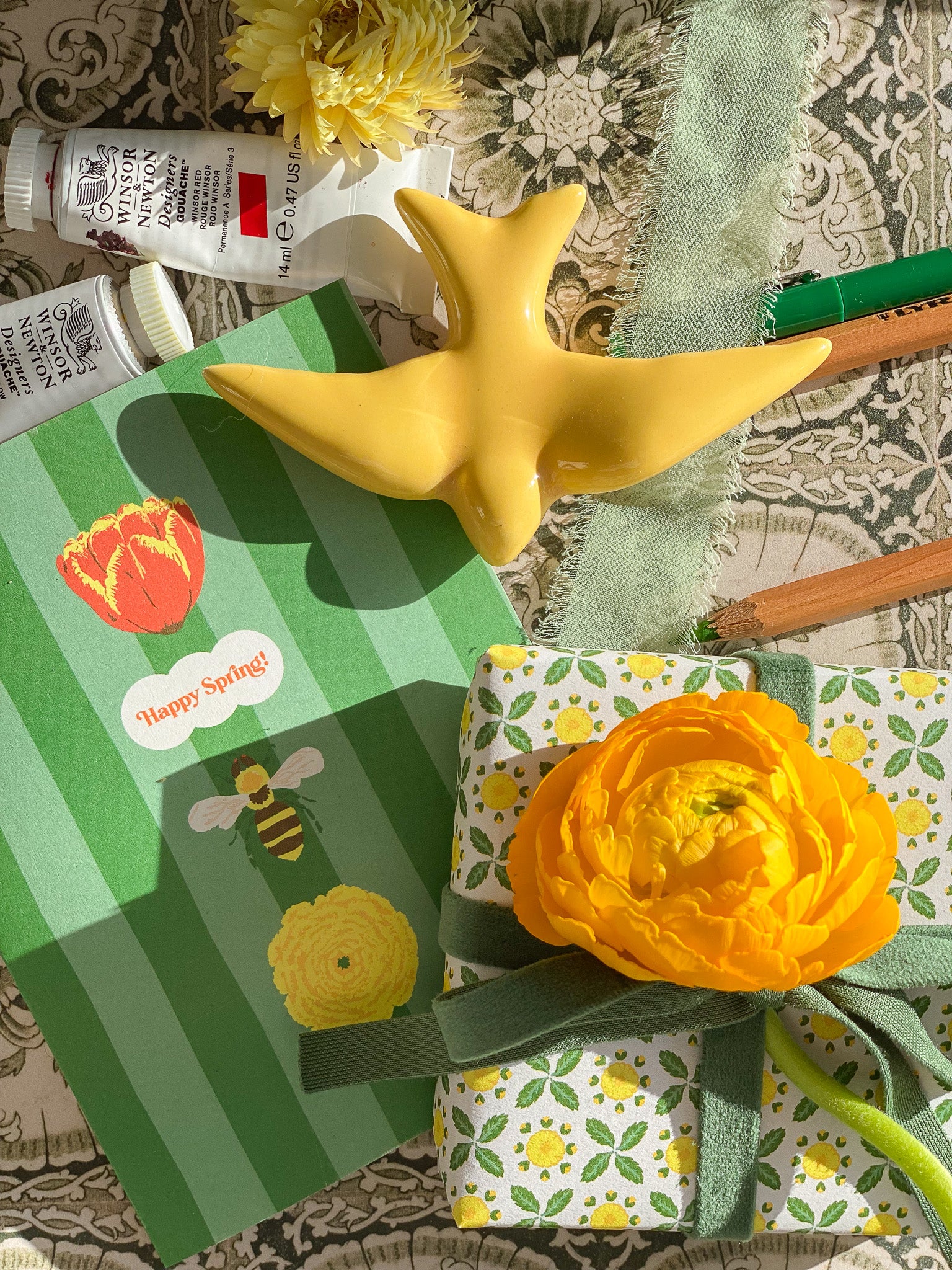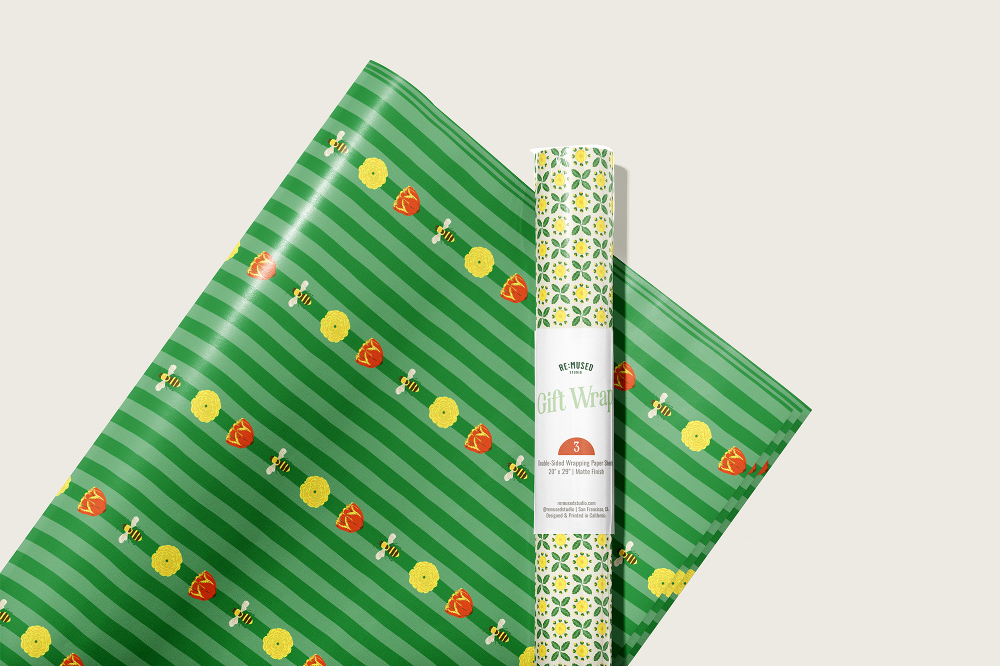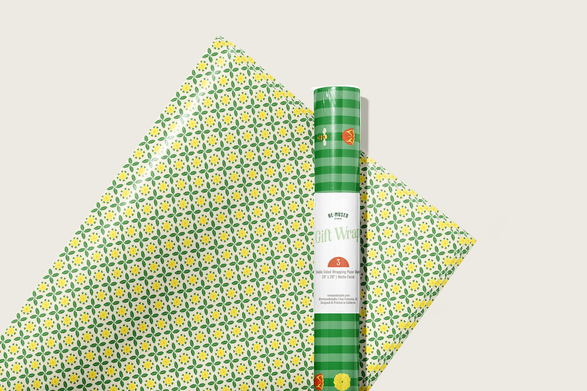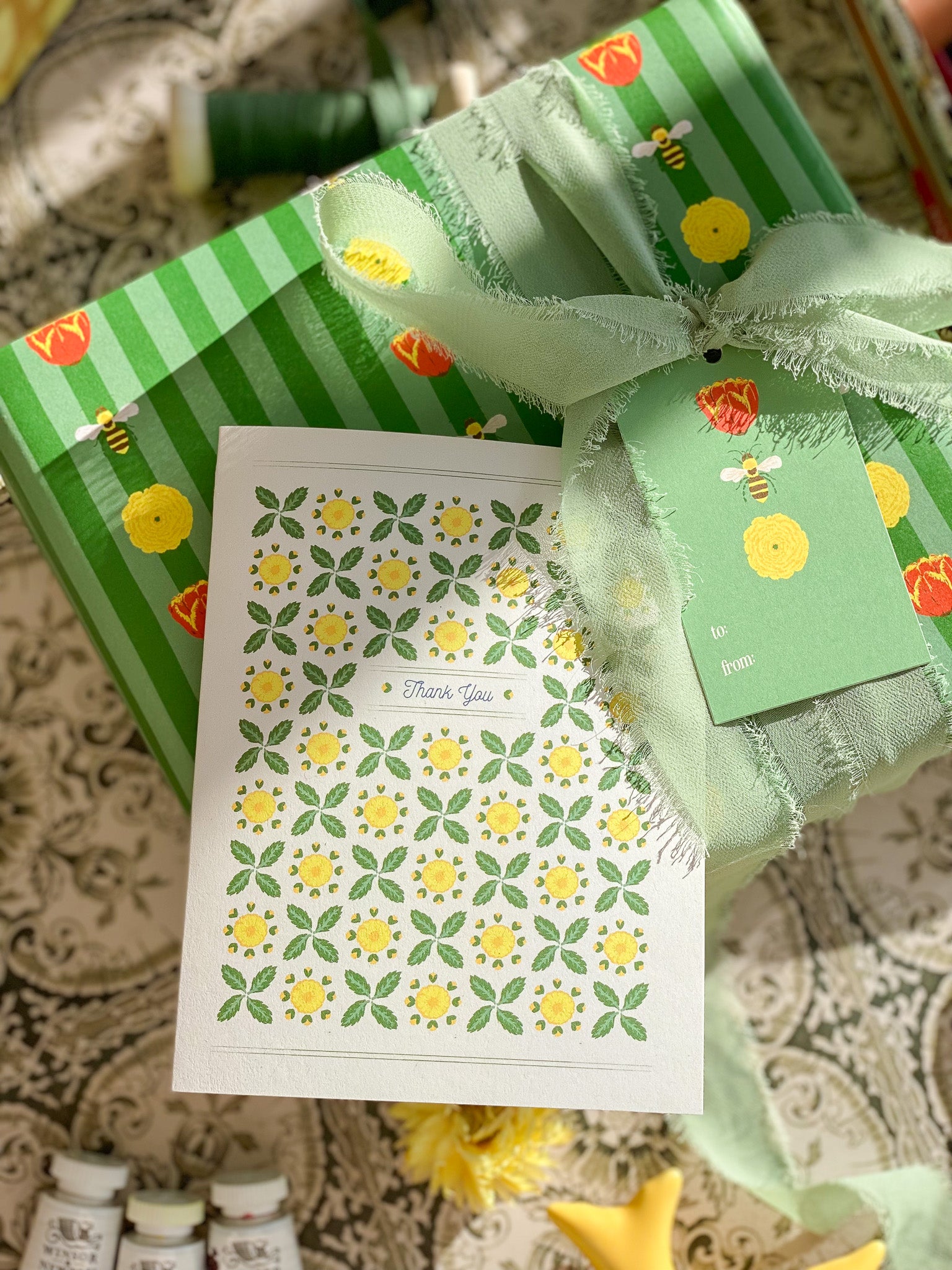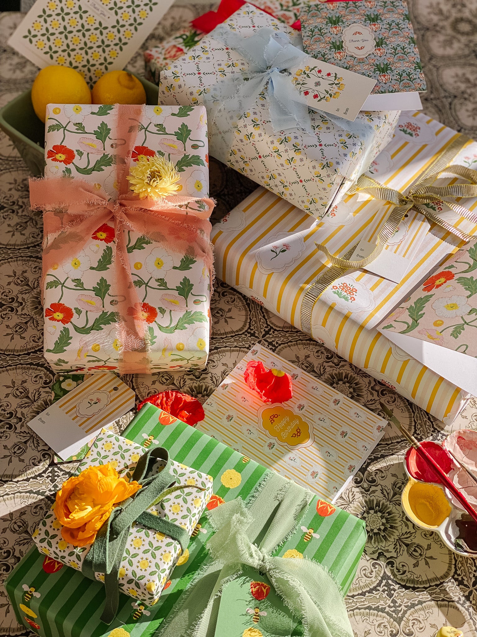 Double the possibilities with our double-sided wrapping paper featuring a pair vibrant Spring floral patterns inspired by the colors and art of the Italian coast. On one side a simple lemon yellow and green geometric tile grid floral and leaf pattern on a cream background and rows of tulips, ranunculus, bees on a green grass jumbo stripe background on the other. Wonderful for Spring and Summer birthdays, Easter, Spring Equinox celebrations, baby showers and beyond.