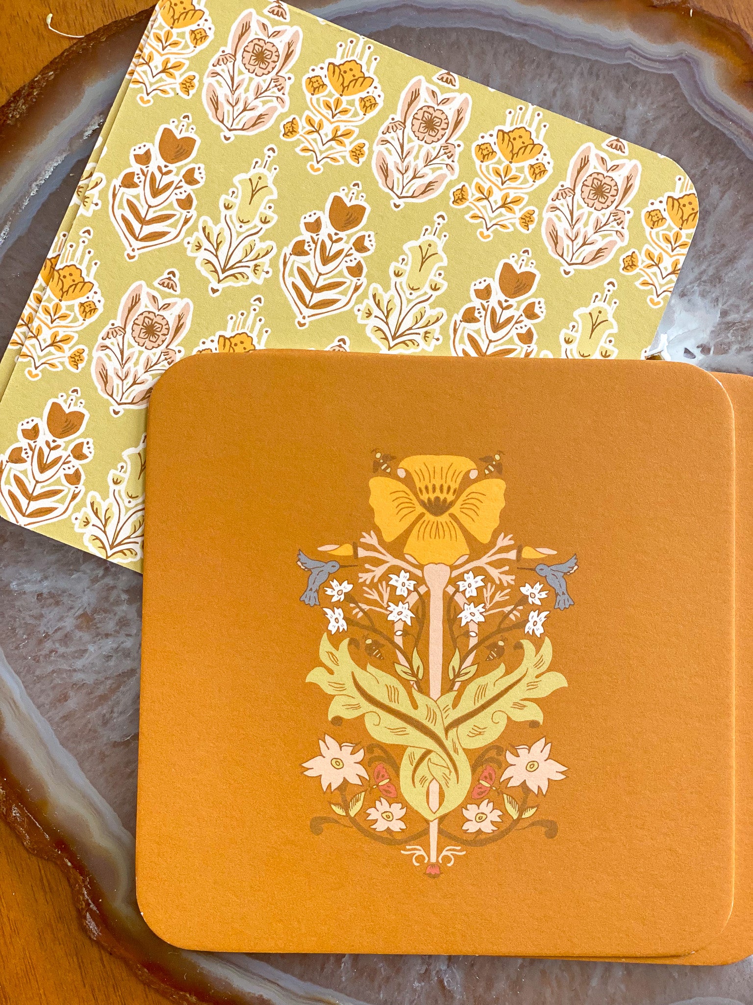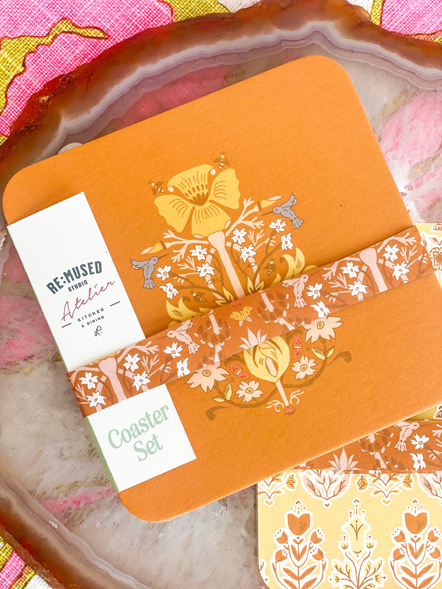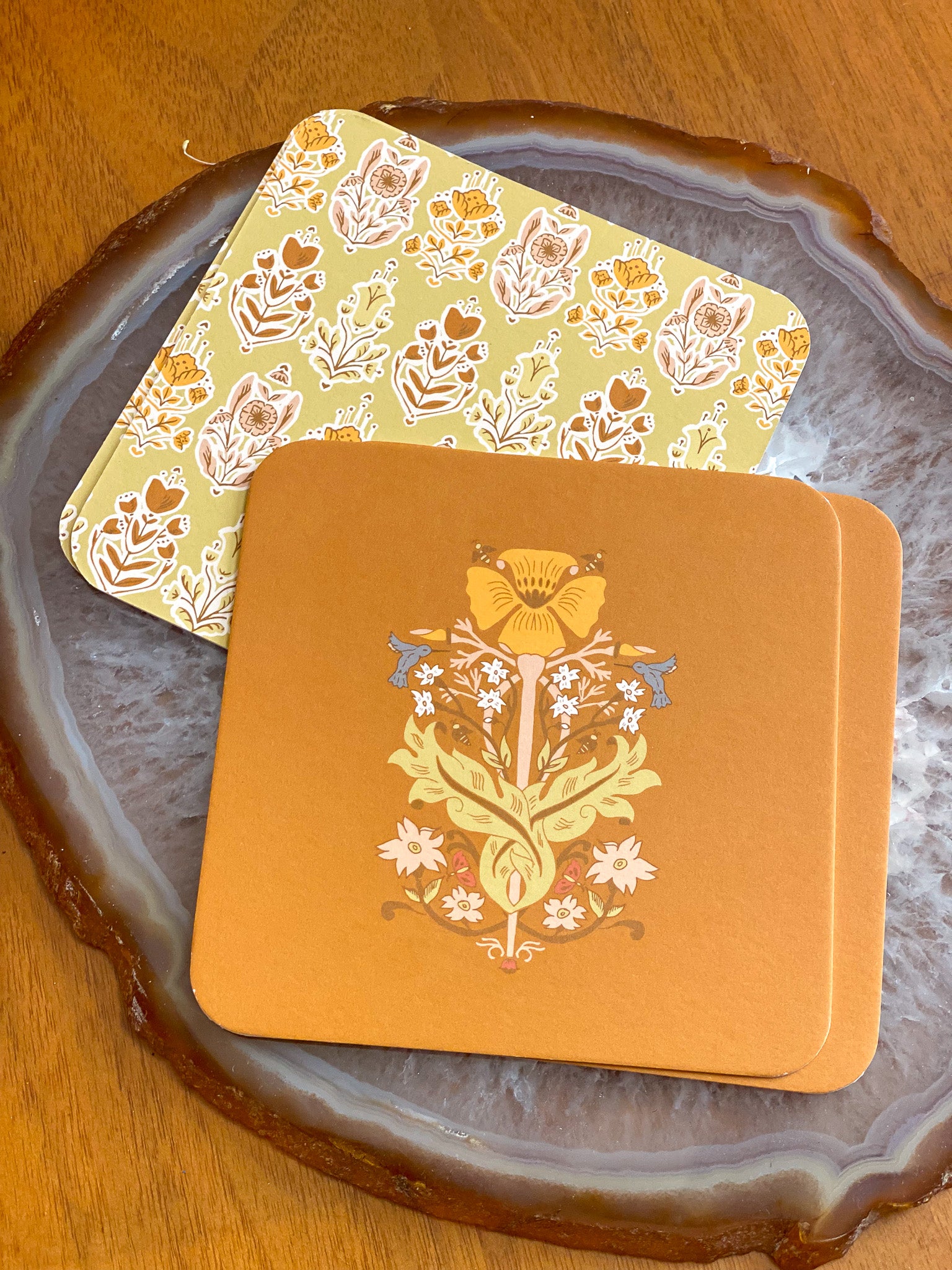 Our Wildflower double-sided coaster sets add a sophisticated vintage touch to your home entertaining. Warm up your table scape for Spring and Summer parties with these double thick paper coasters featuring a California poppy, hummingbird and butterfly floral motif on a caramel background one side and our folk florals pattern on the other. Save table surfaces in style for Mother's Day, birthdays, baby and bridal showers or any special occasion, brunch or party. They even make for party favors.