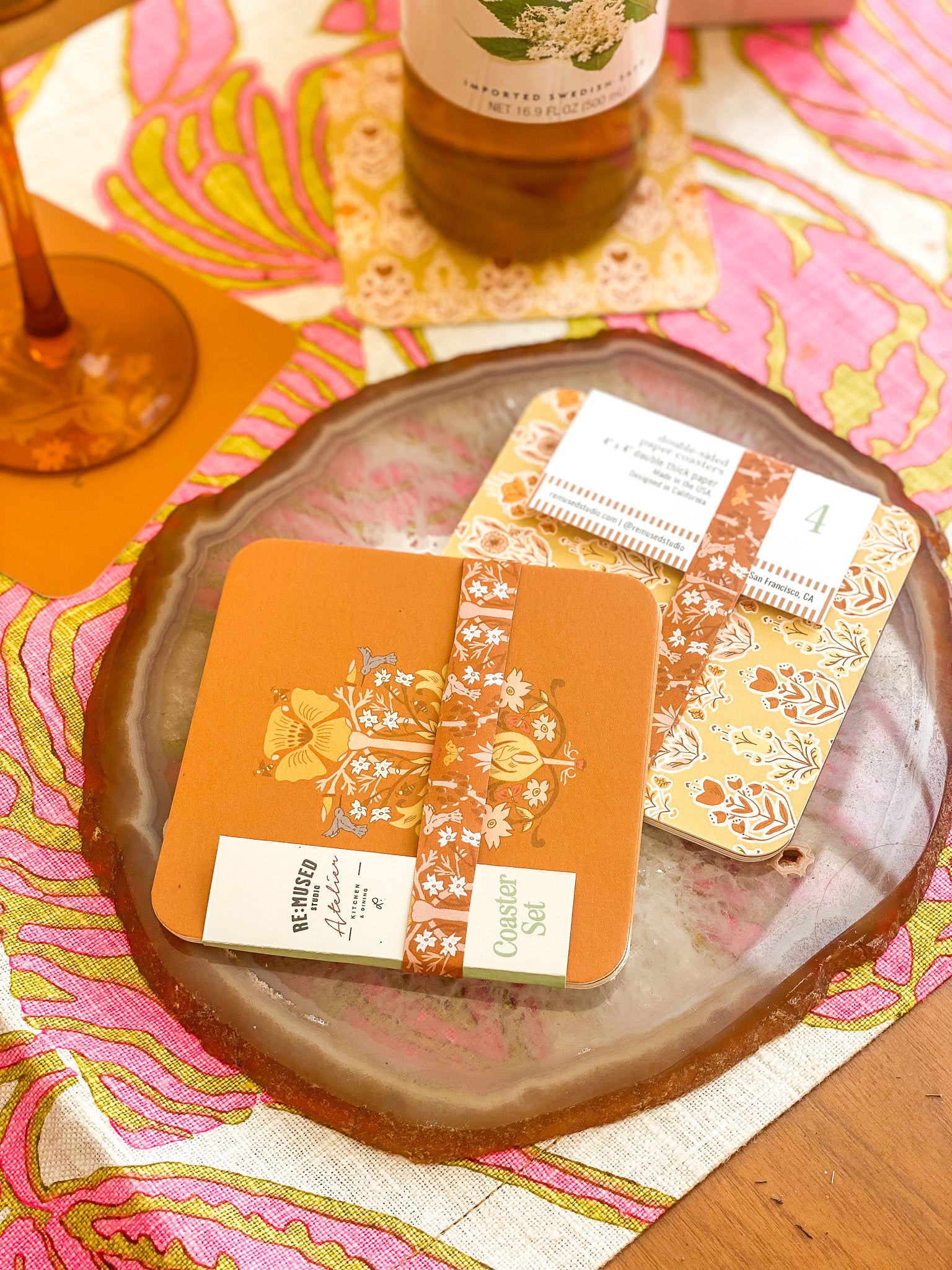 • Coasters come packaged with a paper paper wrapped label enclosed with a coordinating bellyband of our double-sided gift wrap to reduce packaging