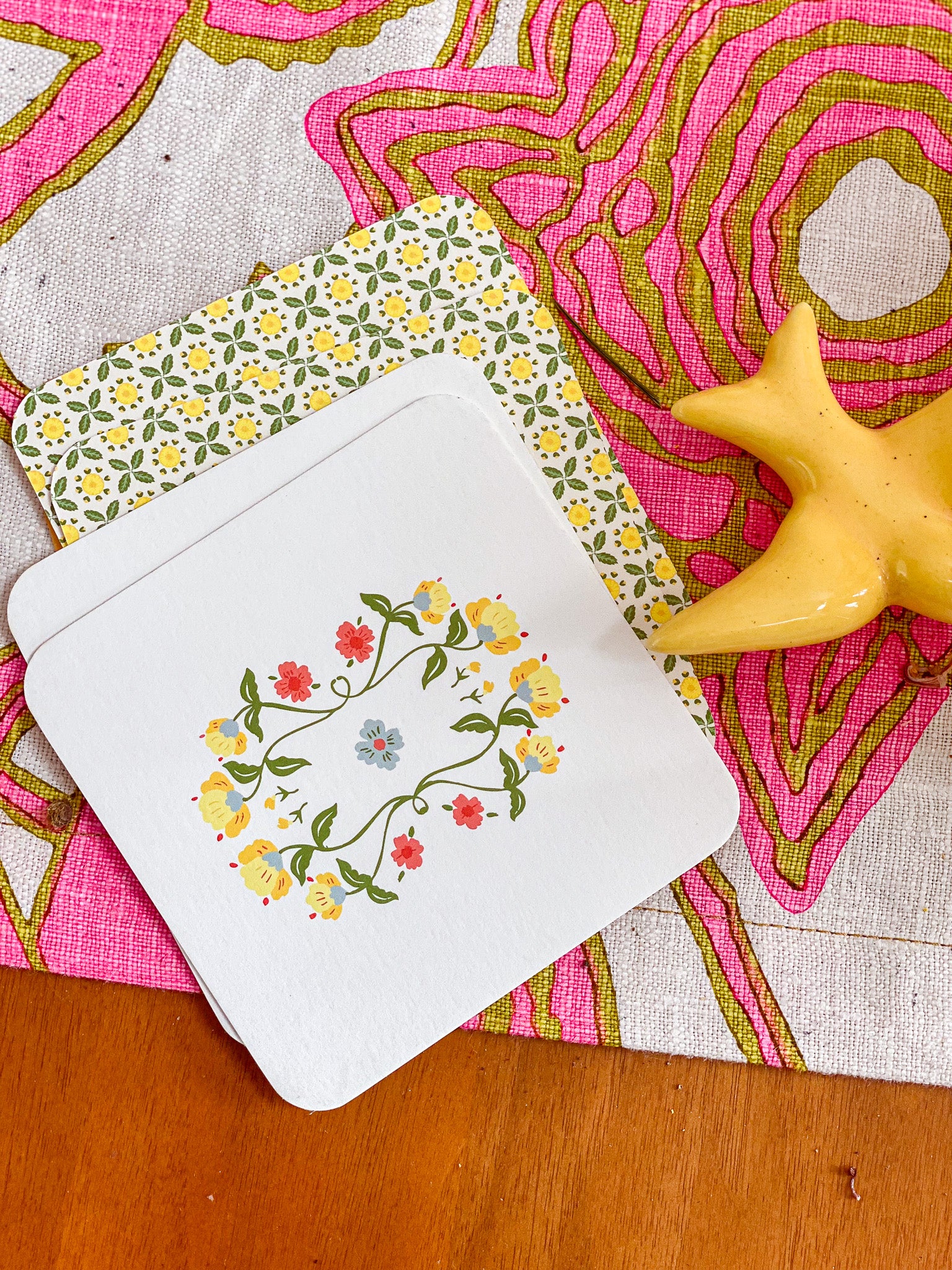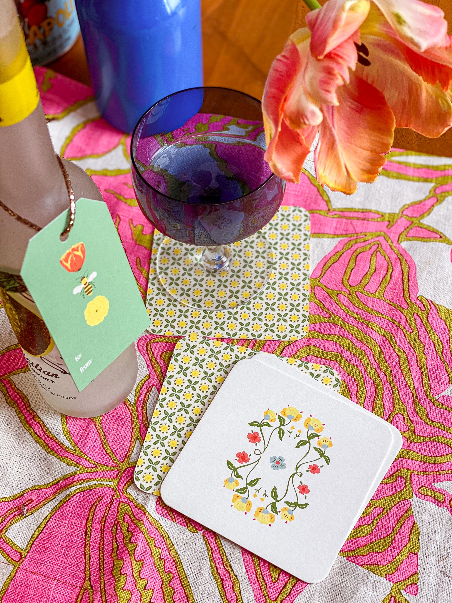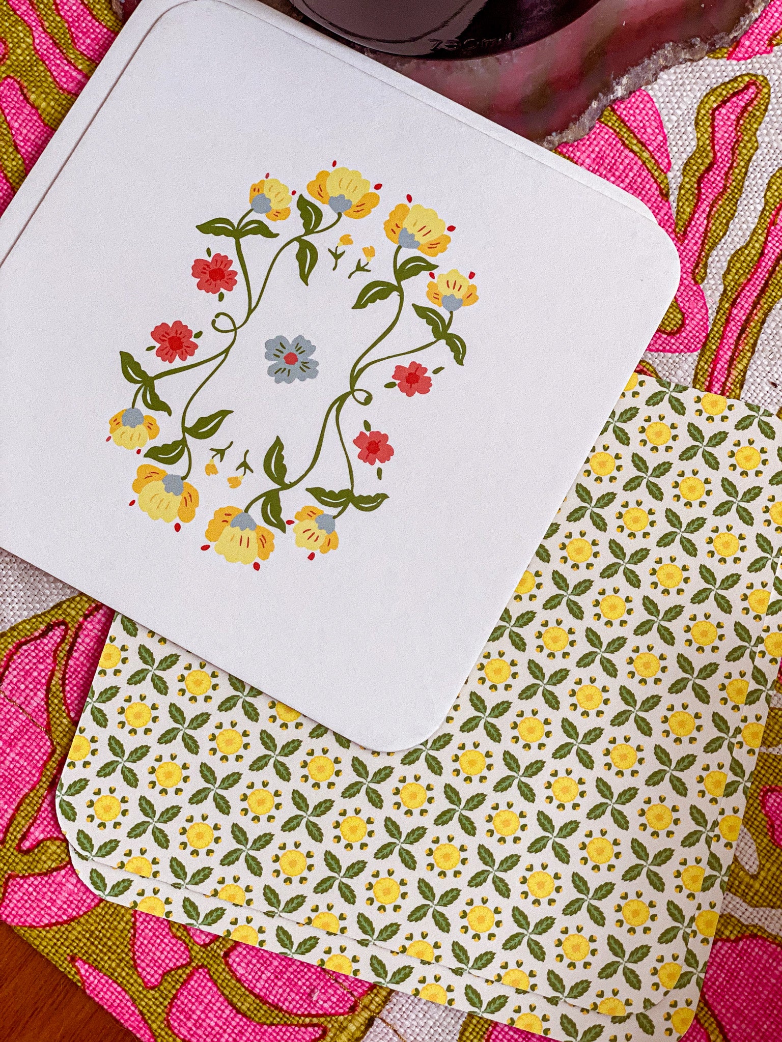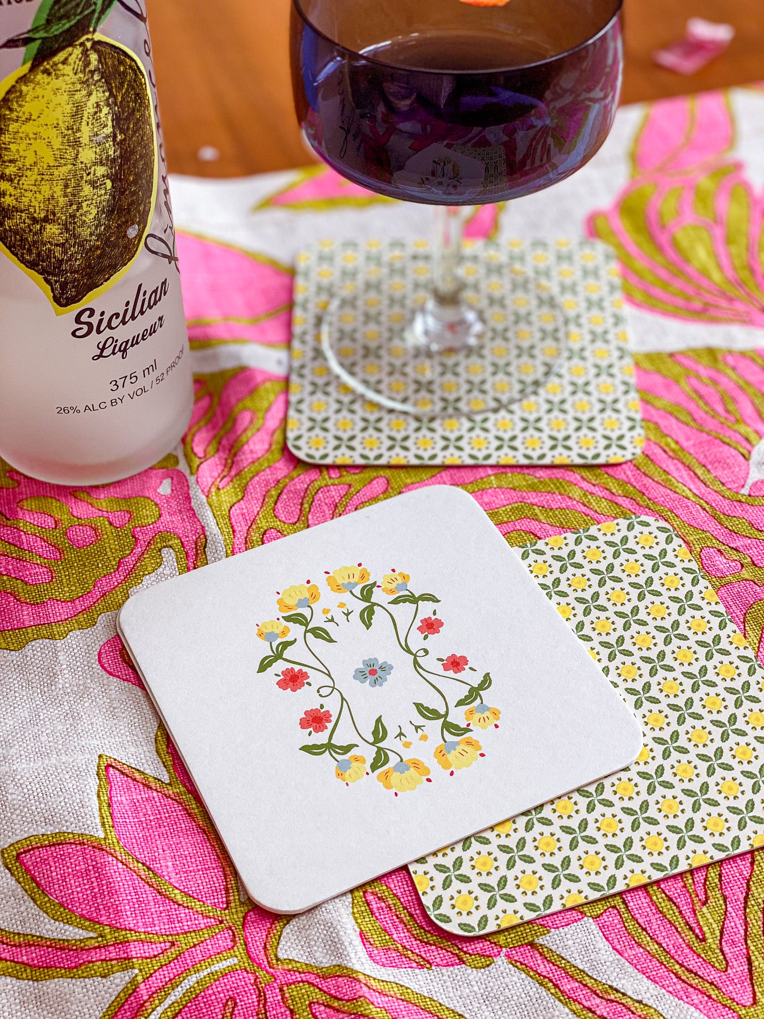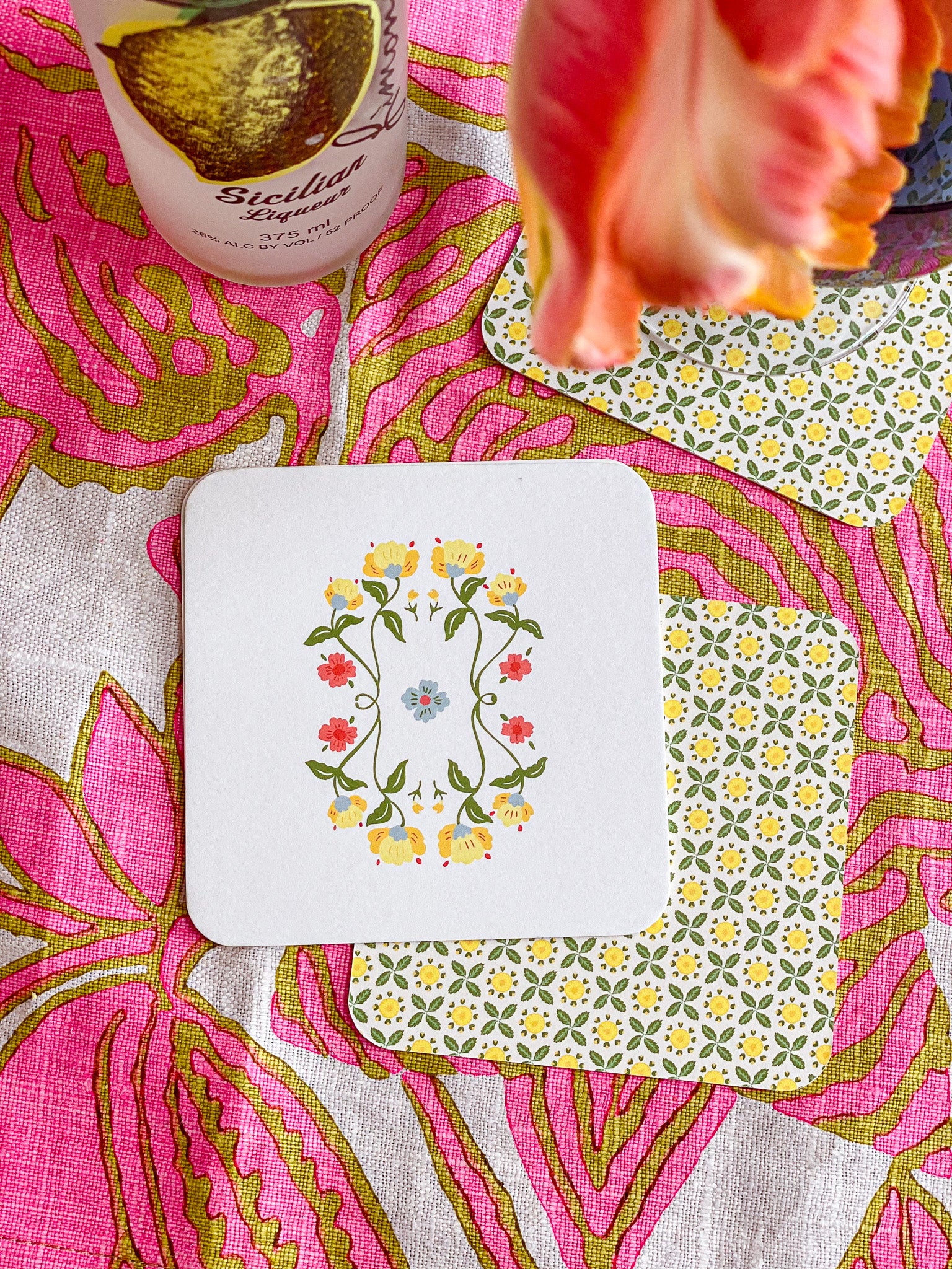 Our Positano double-sided coaster sets add a touch of Italian coastal charm to your home entertaining. Brighten up your table scape for Spring and Summer parties with these double thick paper coasters featuring a mirrored floral sprig motif on one side and our lemon floral grid pattern on the other. Save table surfaces in style for Mother's Day, Easter, birthdays, baby and bridal showers or any special occasion. Or include them in gift bags for party favors.