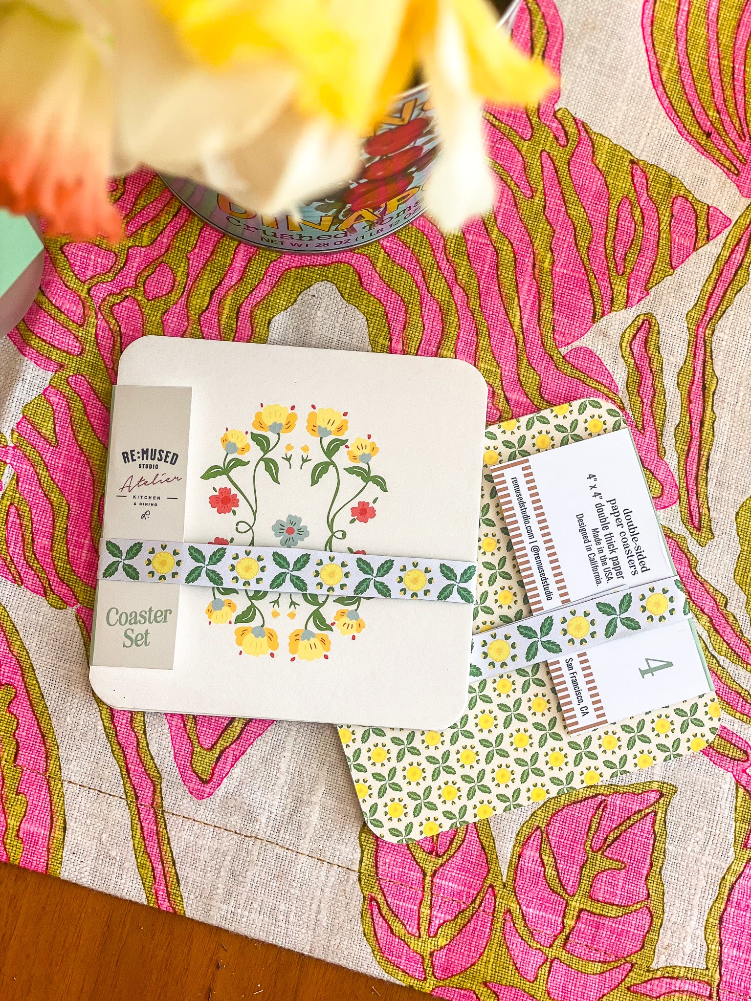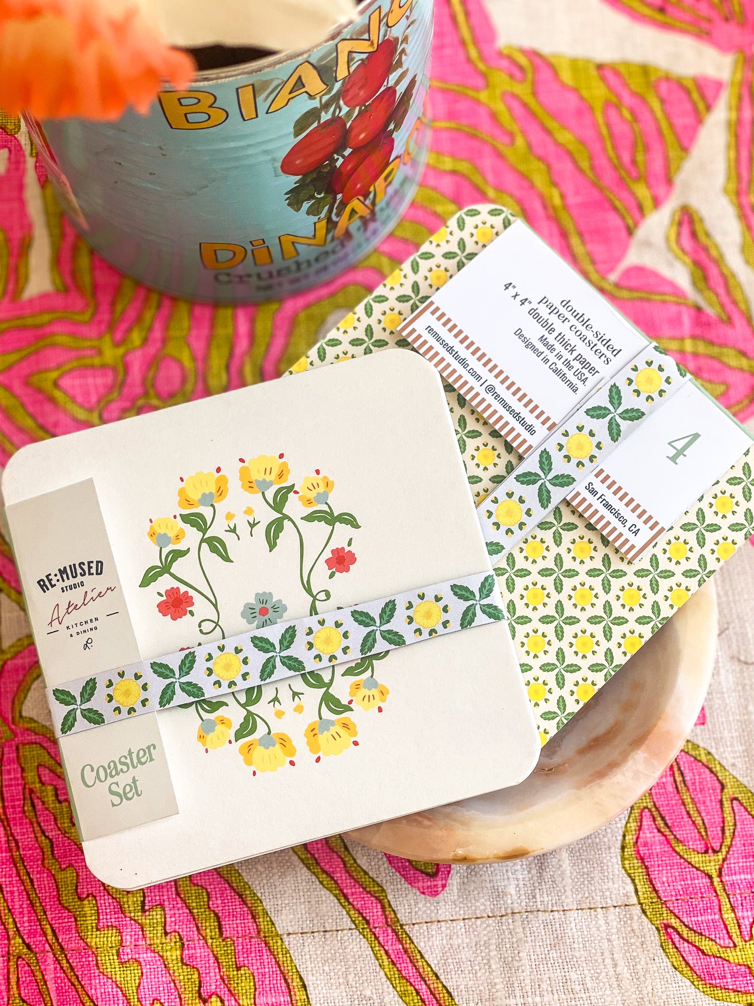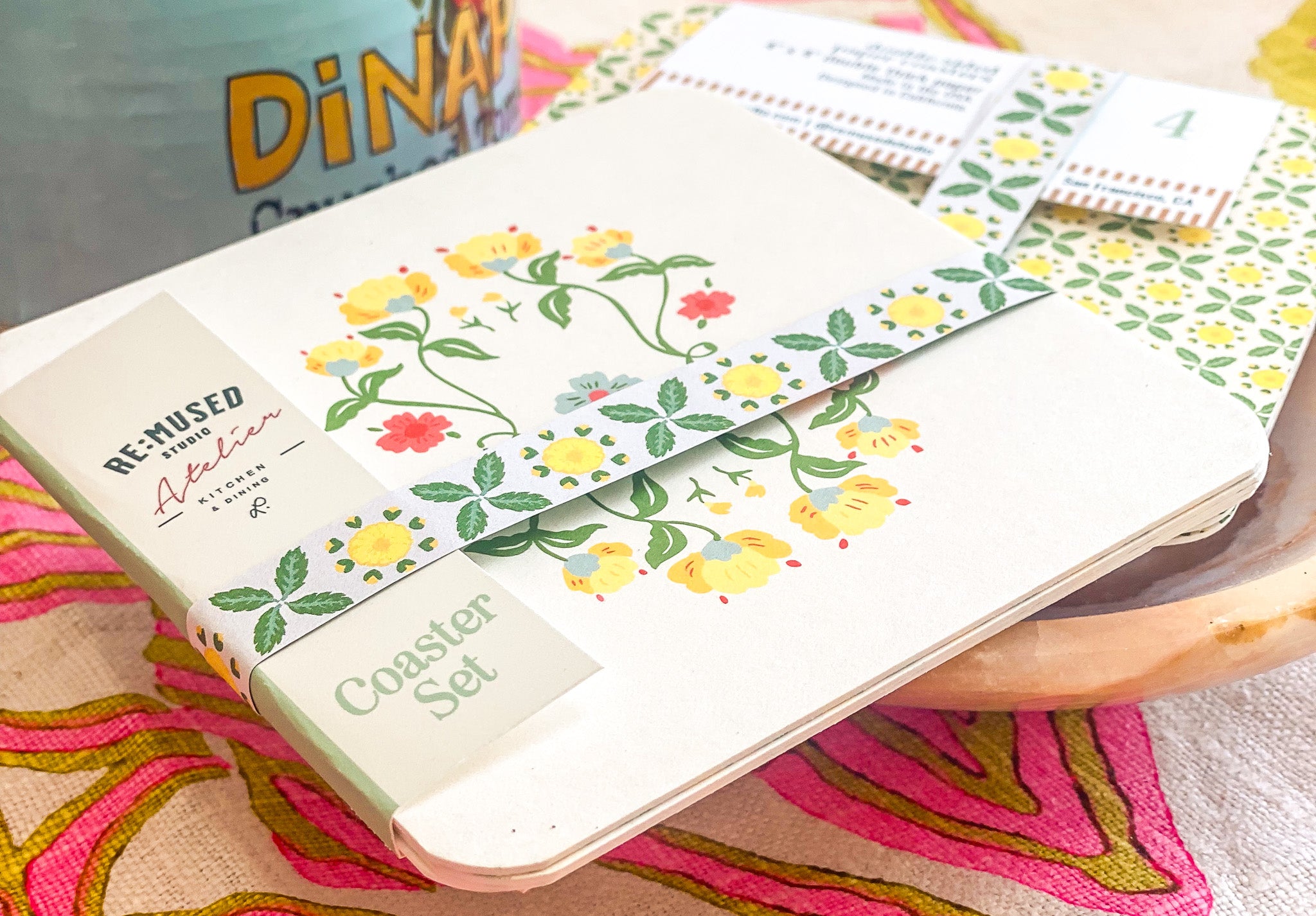 •  Coasters come packaged with a paper paper wrapped label enclosed with a coordinating bellyband of our double-sided gift wrap to reduce packaging.