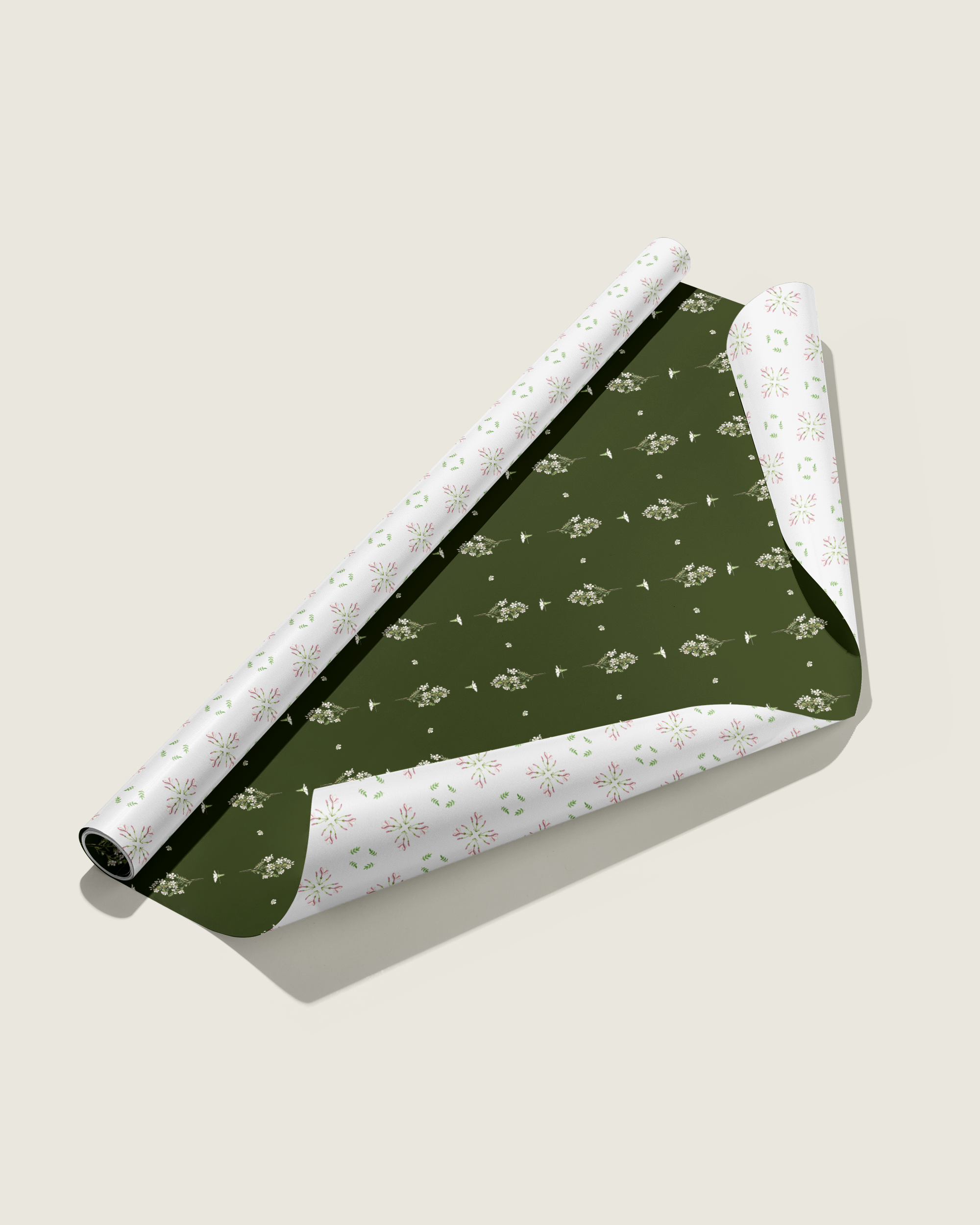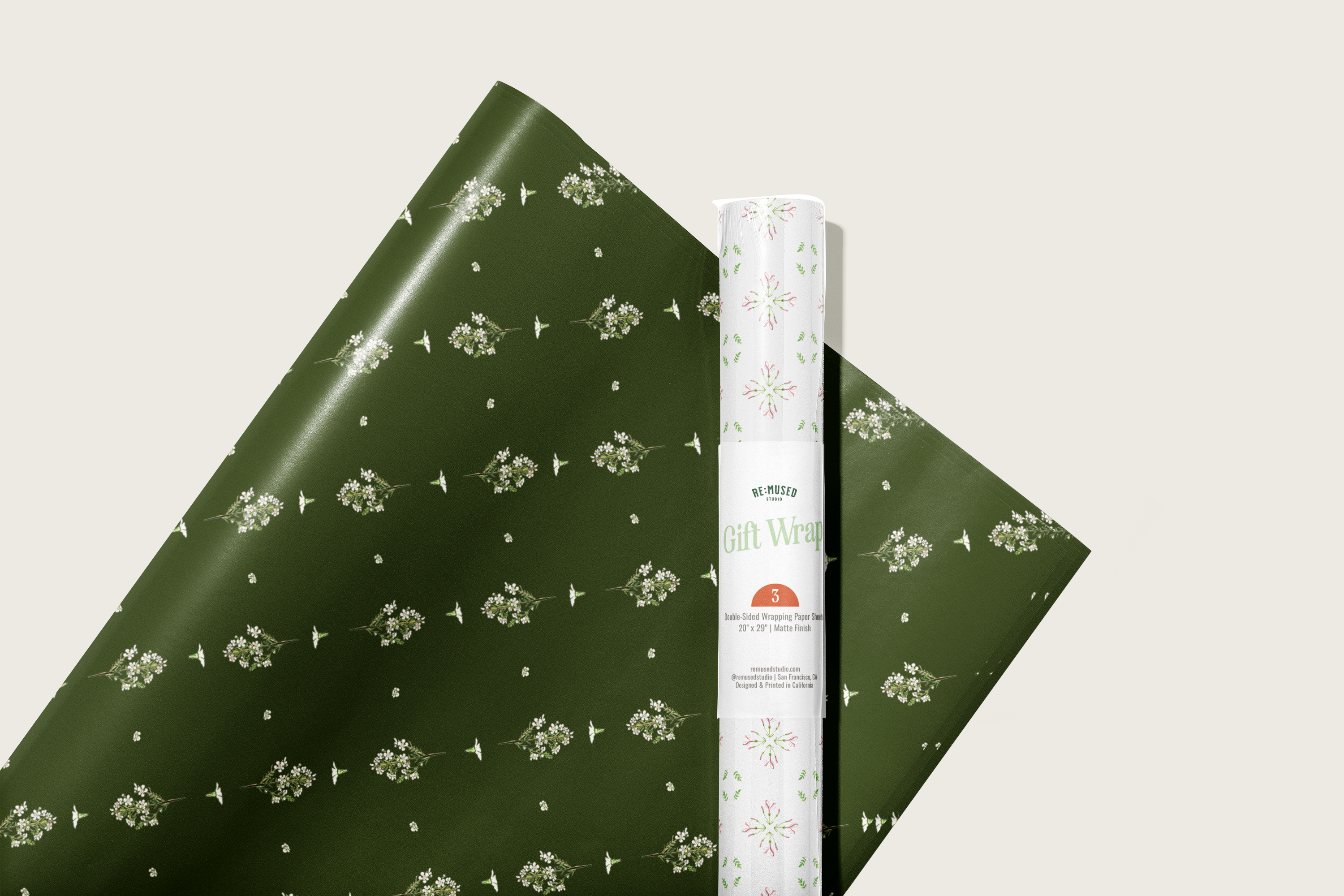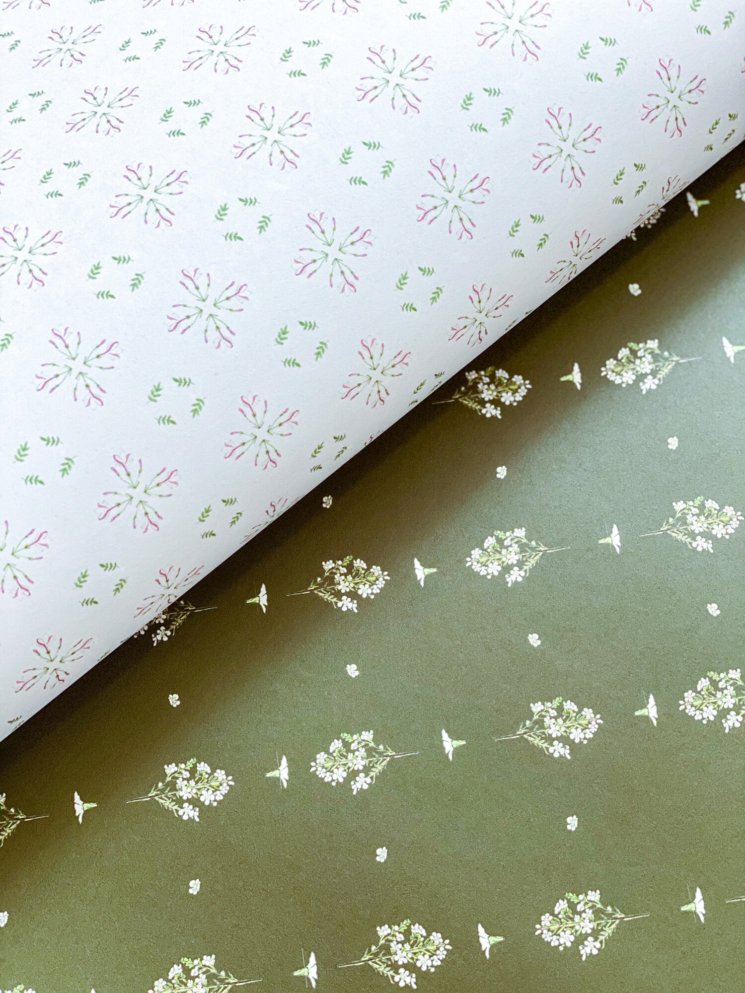Double the beauty with our double-sided wrapping paper featuring a deep evergreen waxflower grid pattern on one side and a delicate purple and green jasmine flower tile print on off-white on the other. This elegant combination works well year-round for birthdays, weddings and other special moments.