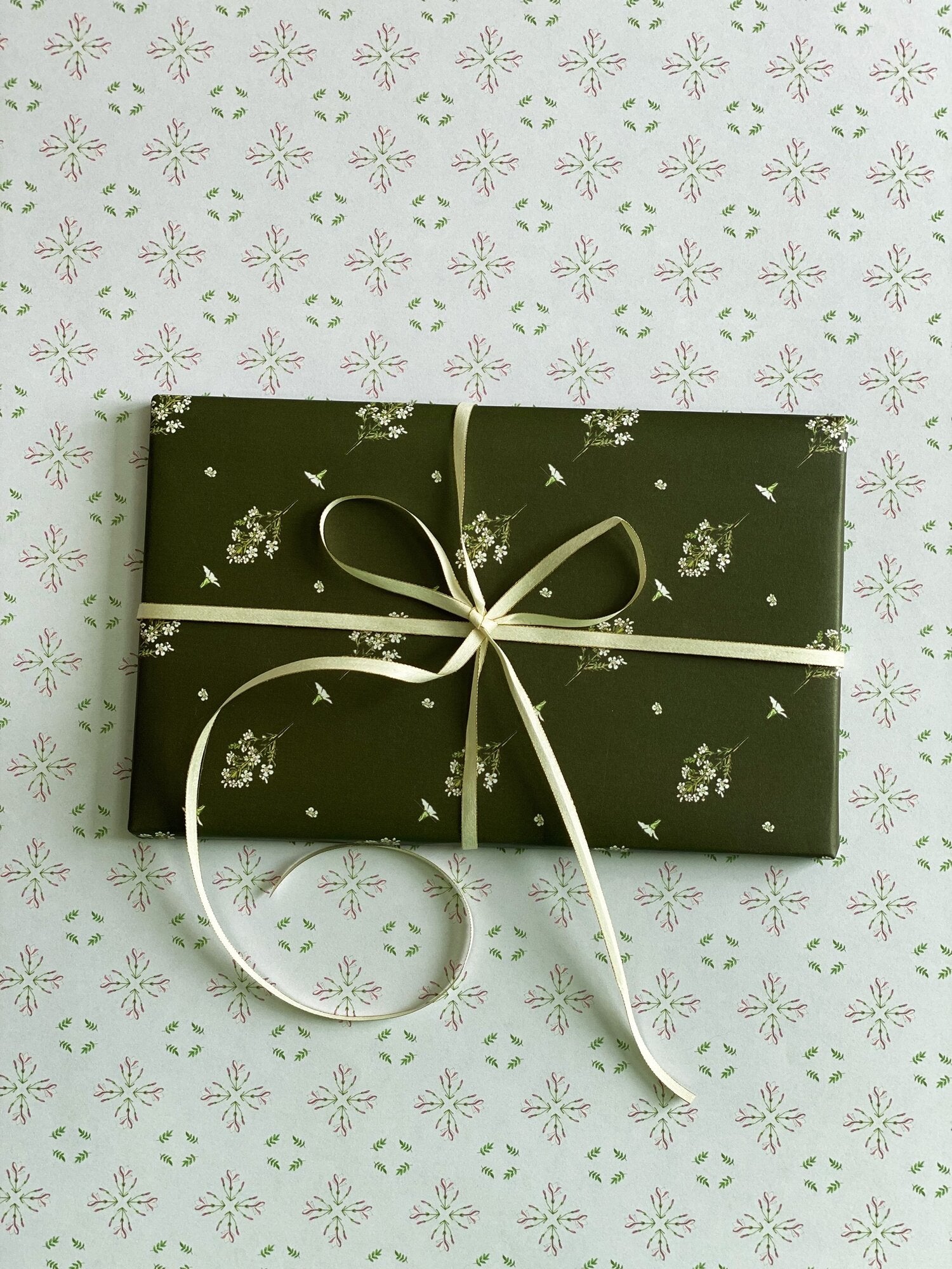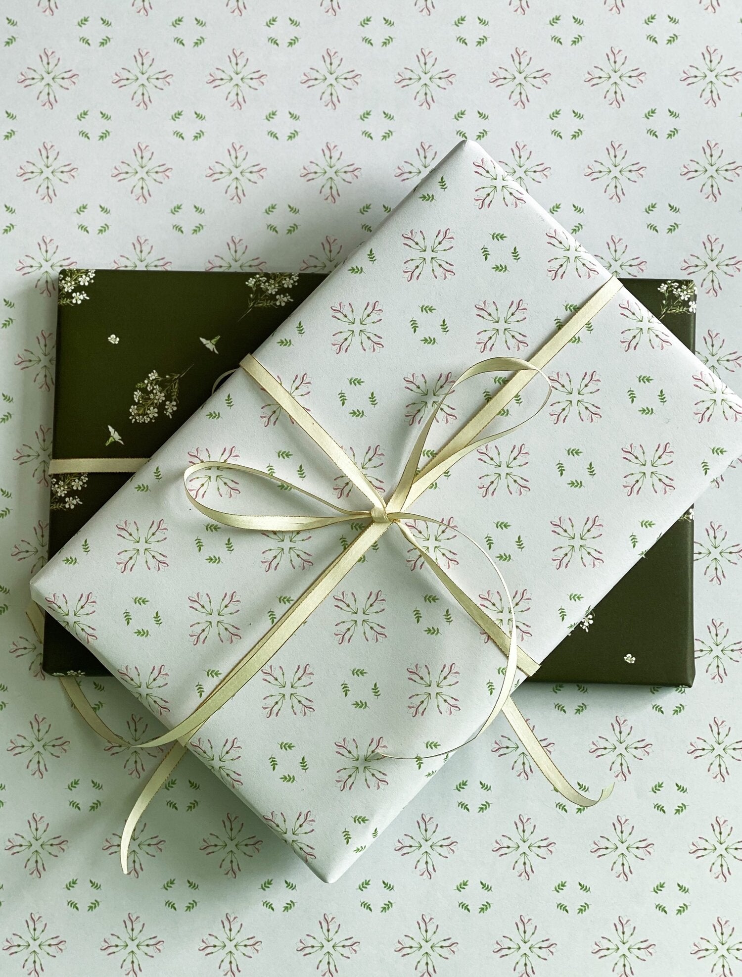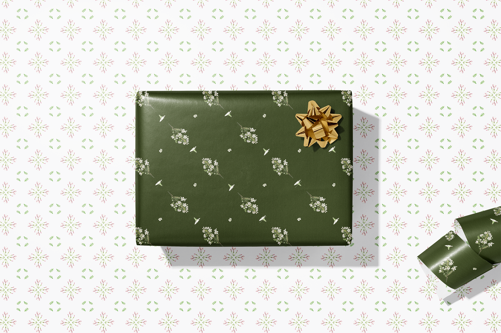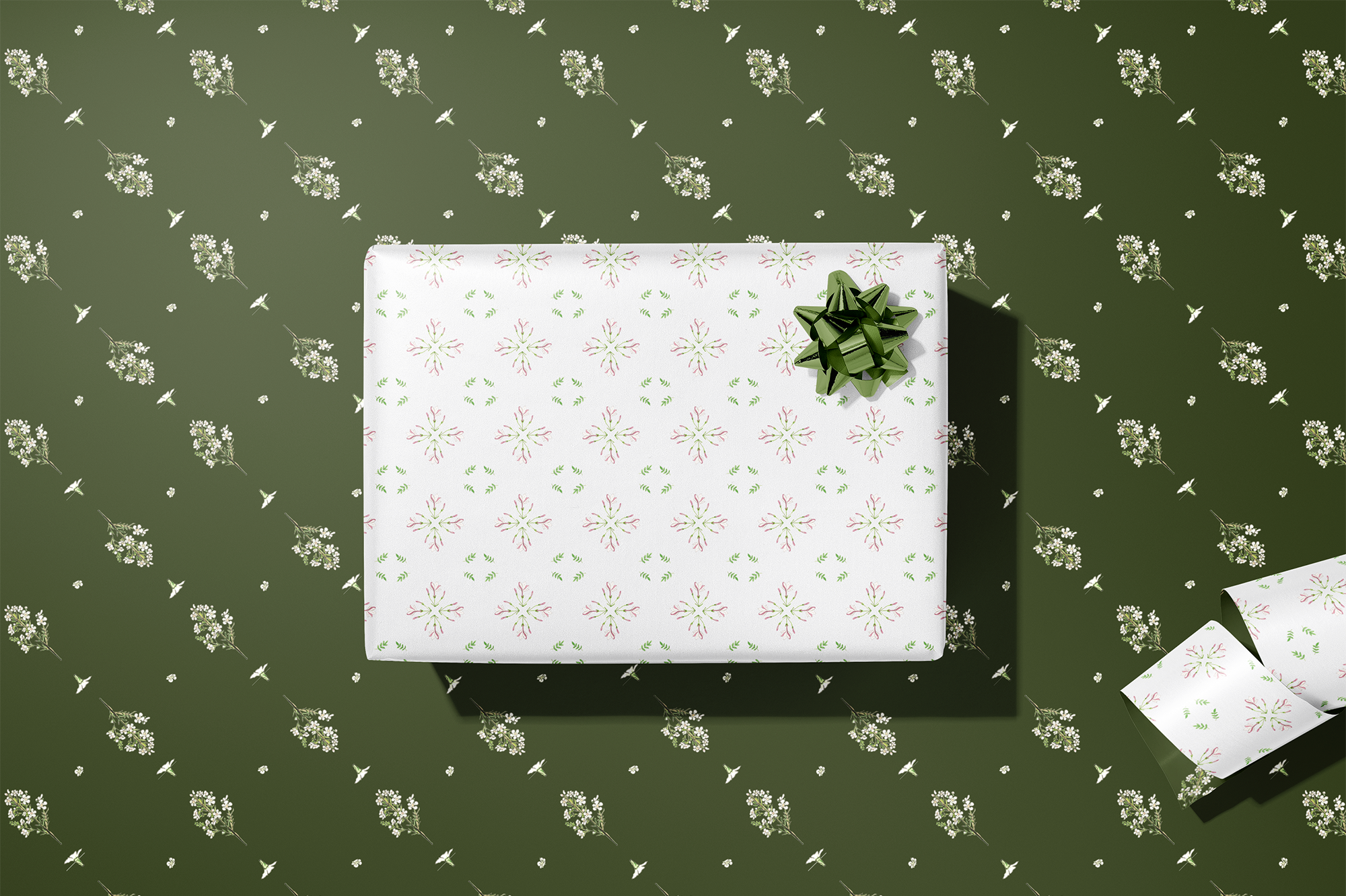 Double the beauty with our double-sided wrapping paper featuring a deep evergreen waxflower grid pattern on one side and a delicate purple and green jasmine flower tile print on off-white on the other. This elegant combination works well year-round for birthdays, weddings and other special moments.