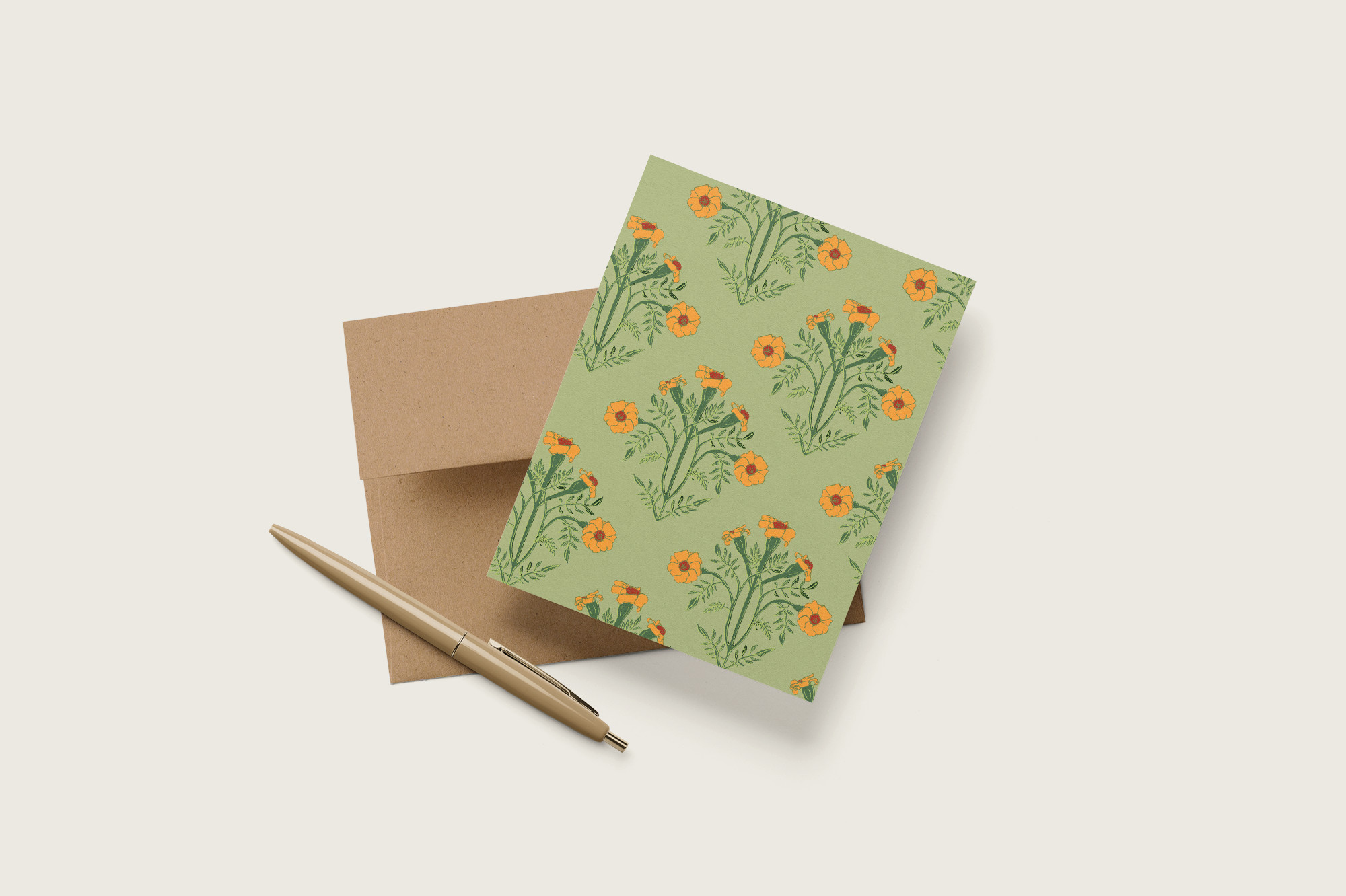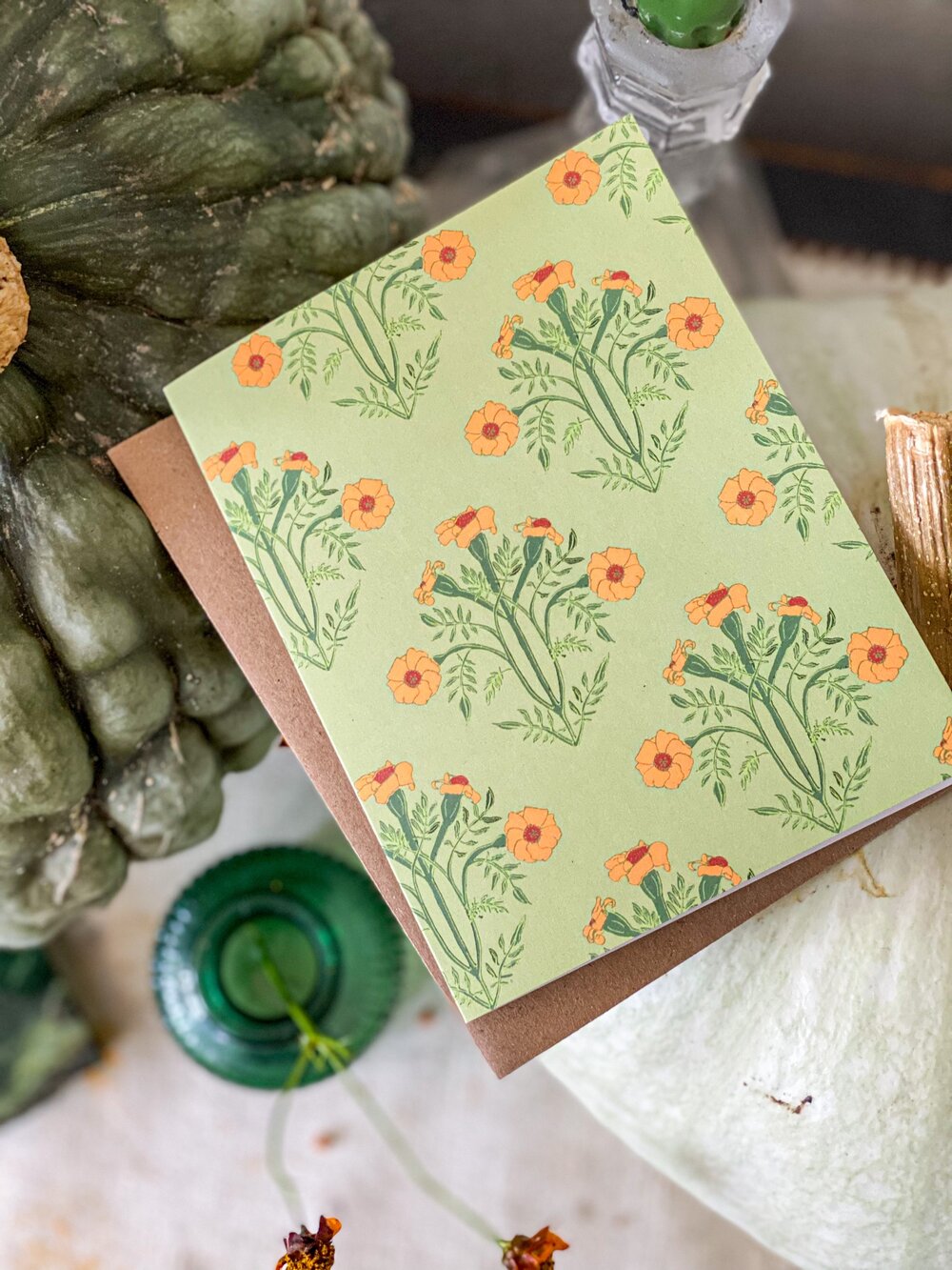 A2 folded notecard with a blank interior to personalize your own note. Features a green and orange French marigold floral pattern from the “Harvest Garden Collection.” This best-seller is great year-round for thank you cards, birthdays, housewarmings and other celebrations.