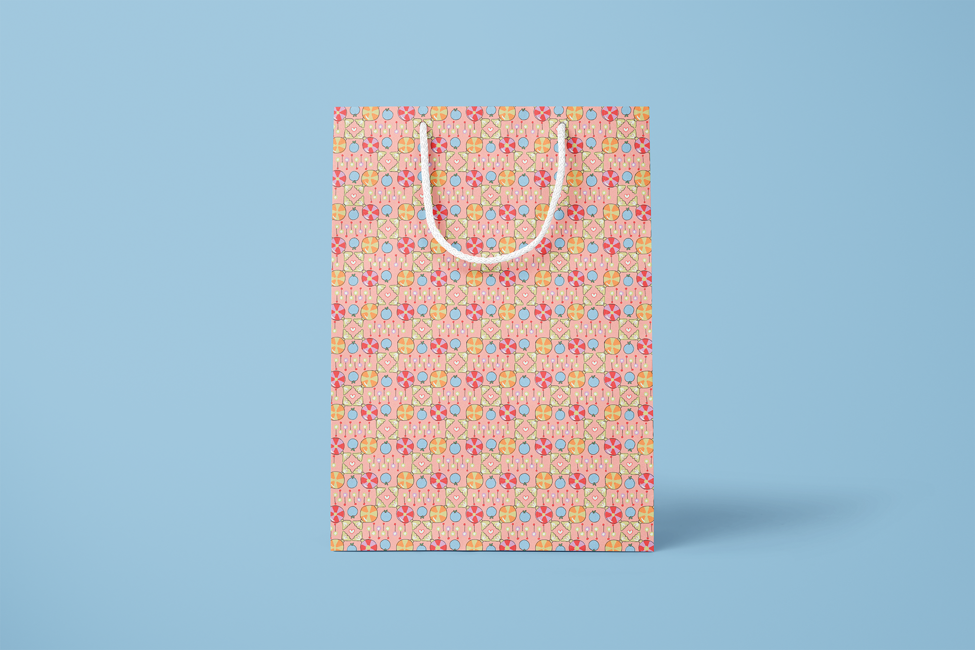 Sweet Check features a playful addition to the La Vie En Rose collection, drawing from vintage candy motifs, classic check patterns, and Valentine-inspired details. Pastel sweets, hearts, and geometric accents create a joyful, nostalgic design, complemented by a coordinating check pattern along the gusseted sides and finished with a white braided handle.