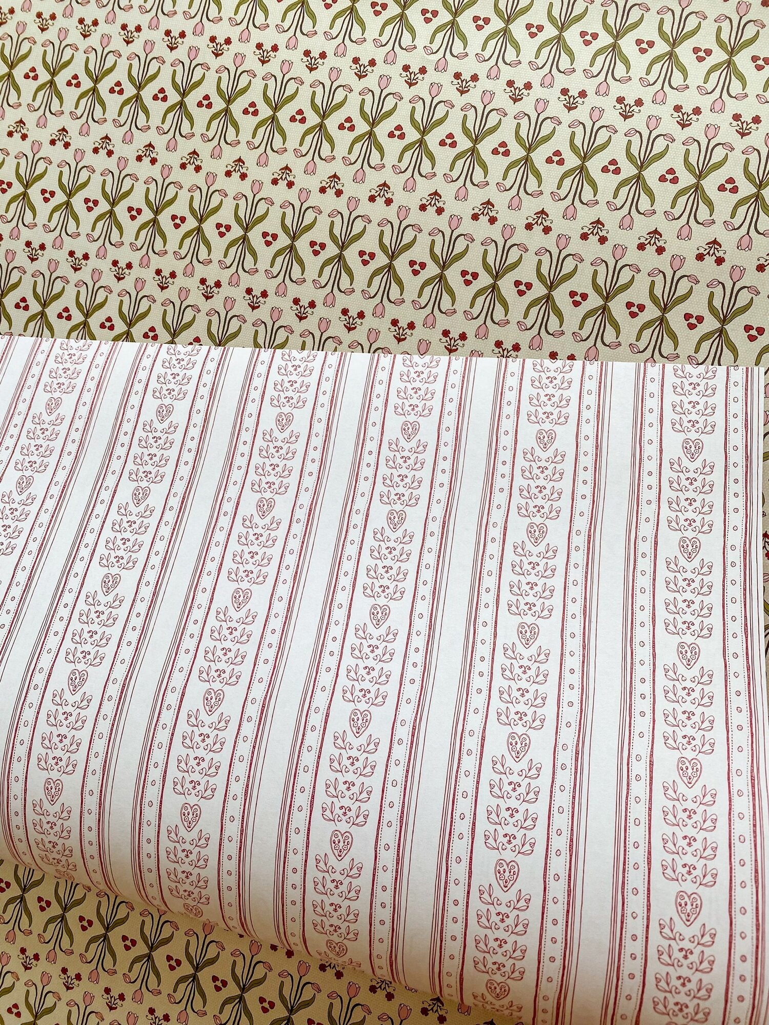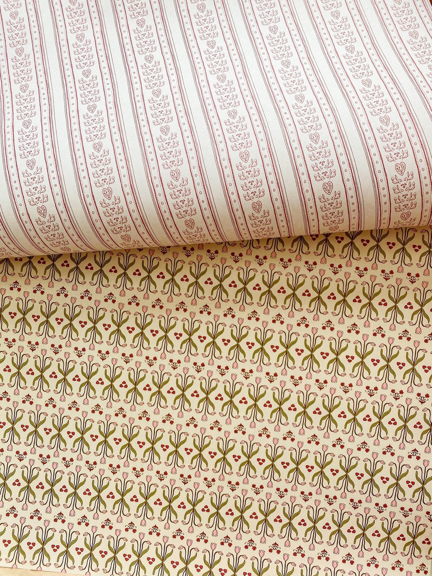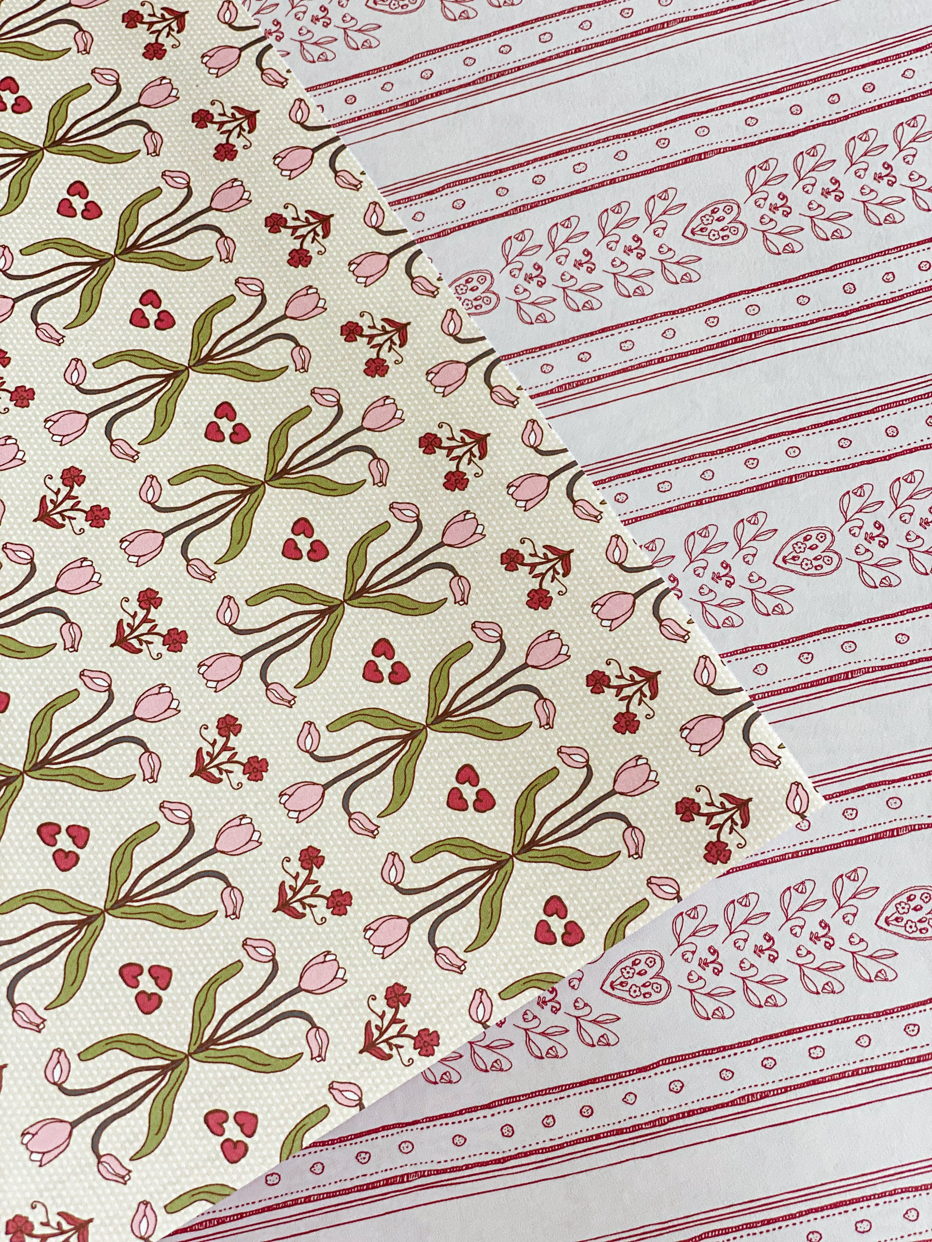 Double the possibilities with our double-sided wrapping paper featuring a pair of romantic striped patterns inspired by the wallpapers and fabrics of Parisian brasseries. Hearts, tulips and other motifs in burgundy reds, white, pastel yellows, pinks and greens have made this gift wrap a best-seller for Valentine’s Day and Galentines, Mother's Day, birthdays, bridal or baby showers and beyond.