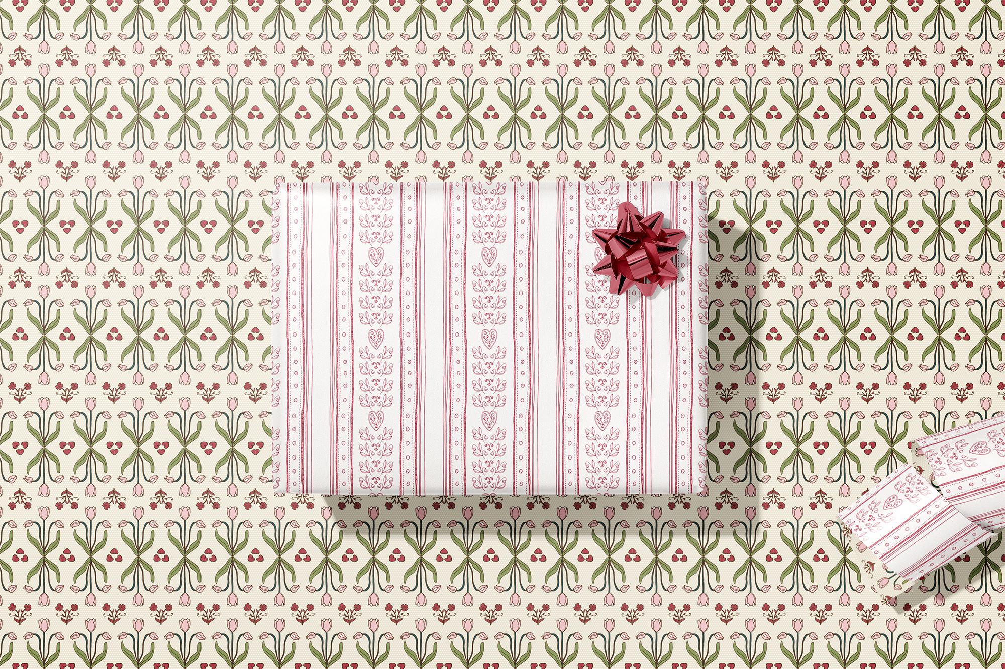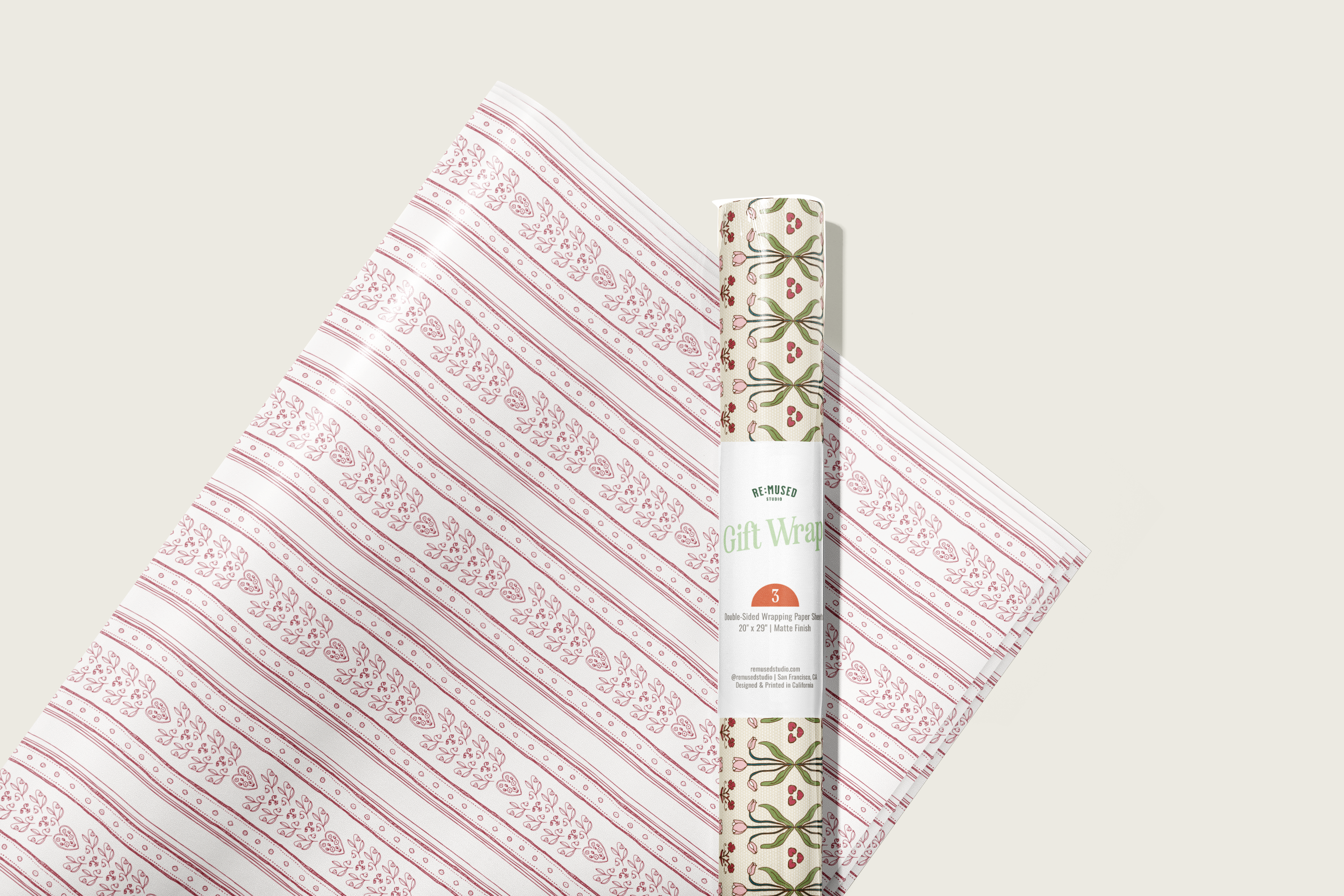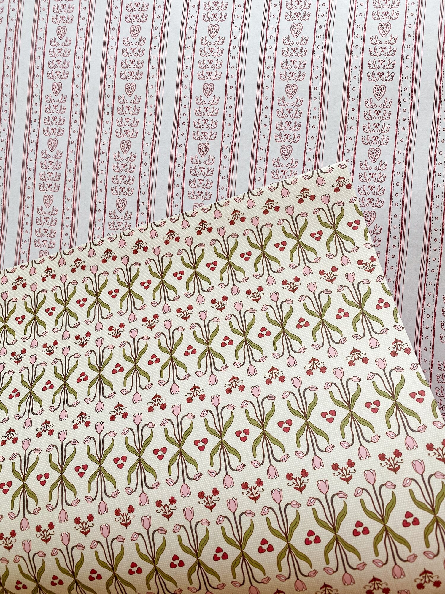 Double the possibilities with our double-sided wrapping paper featuring a pair of romantic striped patterns inspired by the wallpapers and fabrics of Parisian brasseries. Hearts, tulips and other motifs in burgundy reds, white, pastel yellows, pinks and greens have made this gift wrap a best-seller for Valentine’s Day and Galentines, Mother's Day, birthdays, bridal or baby showers and beyond.