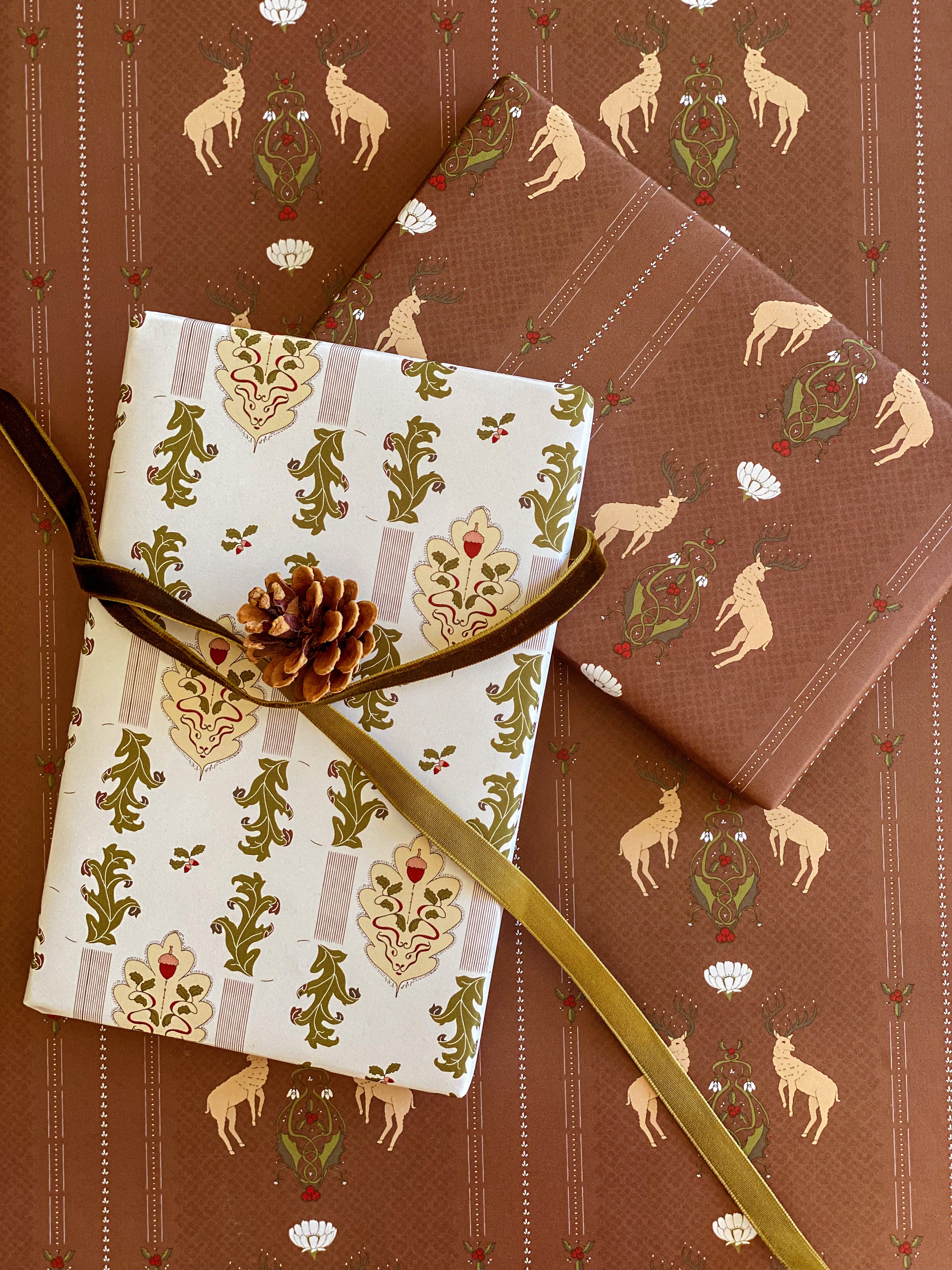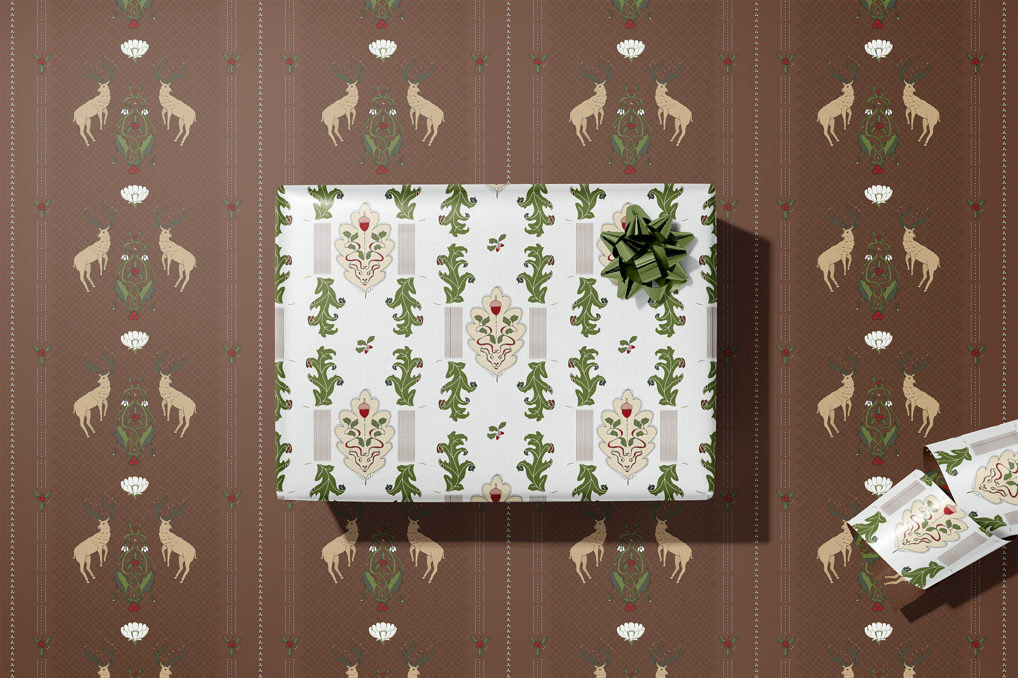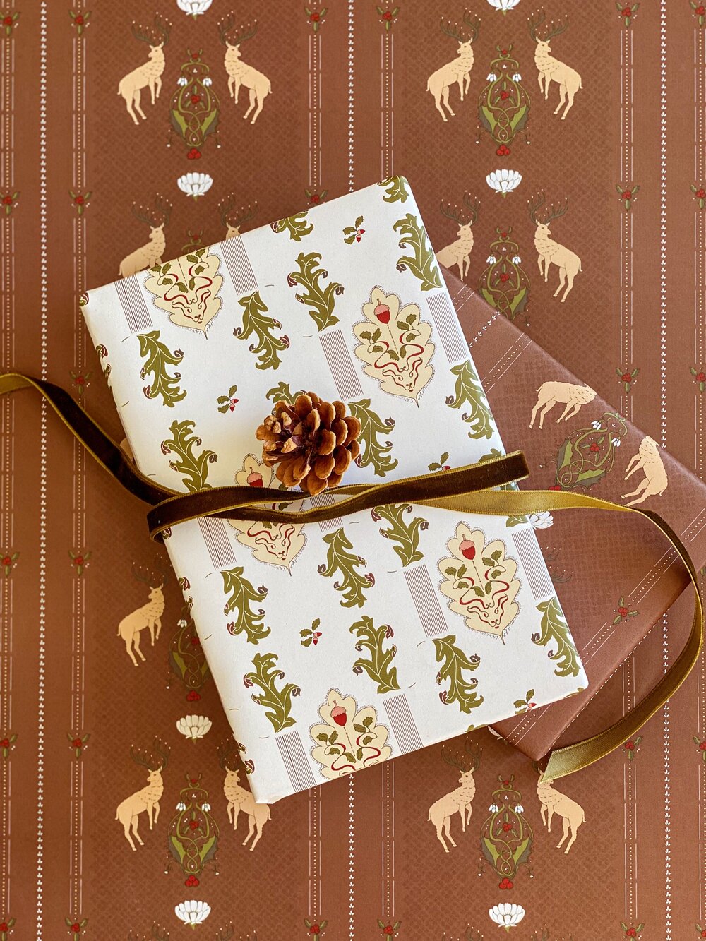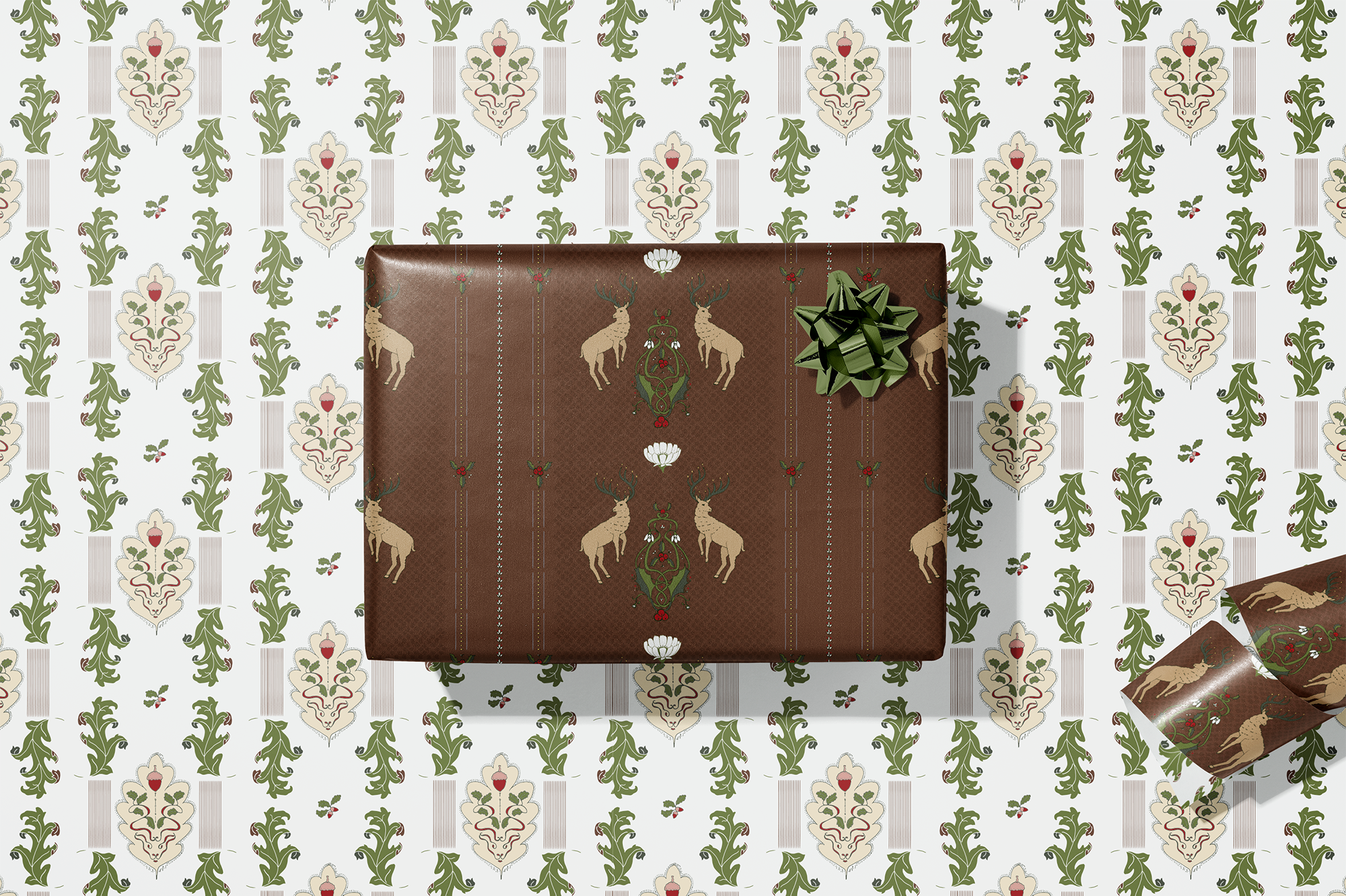Double the merry with our double-sided wrapping paper featuring Arts & Crafts and Nouveau inspired patterns with the winter solstice themes of the Holly King and the Oak King.
