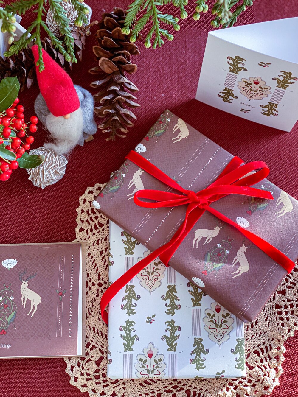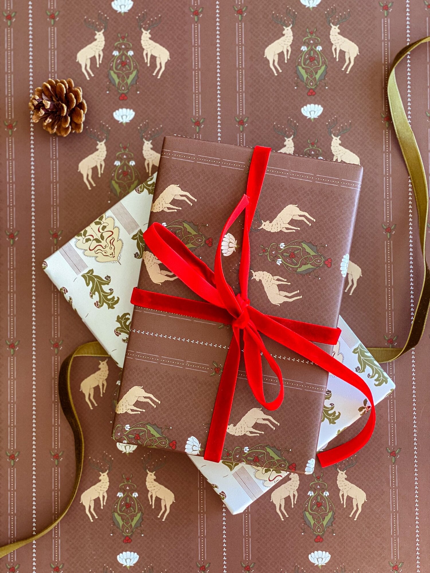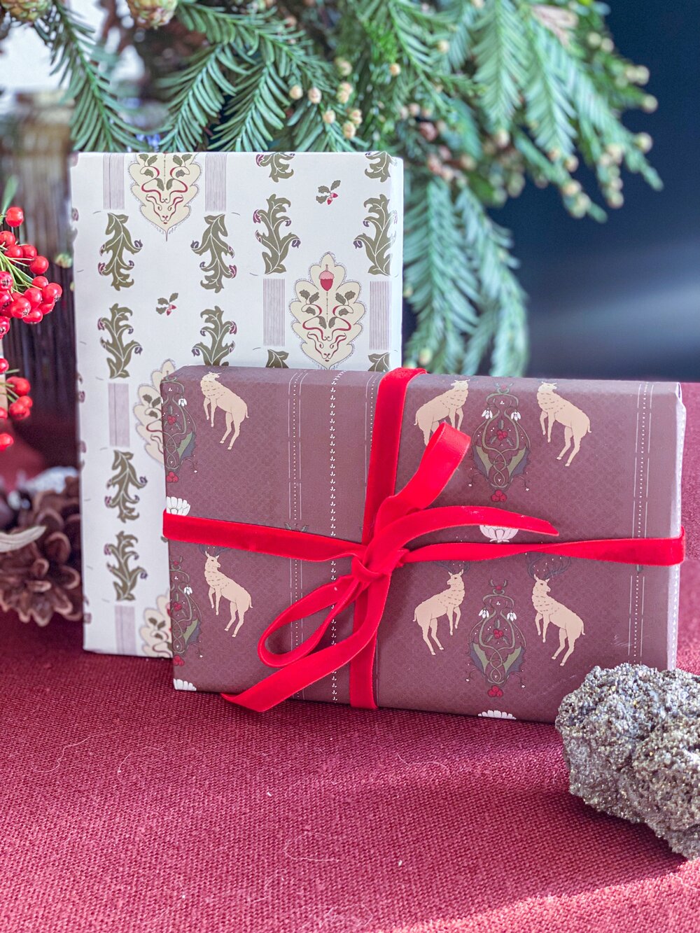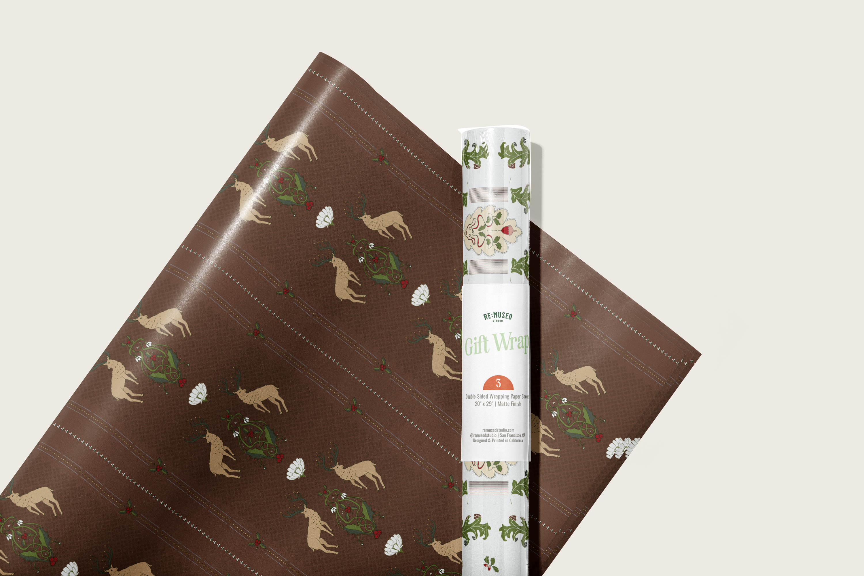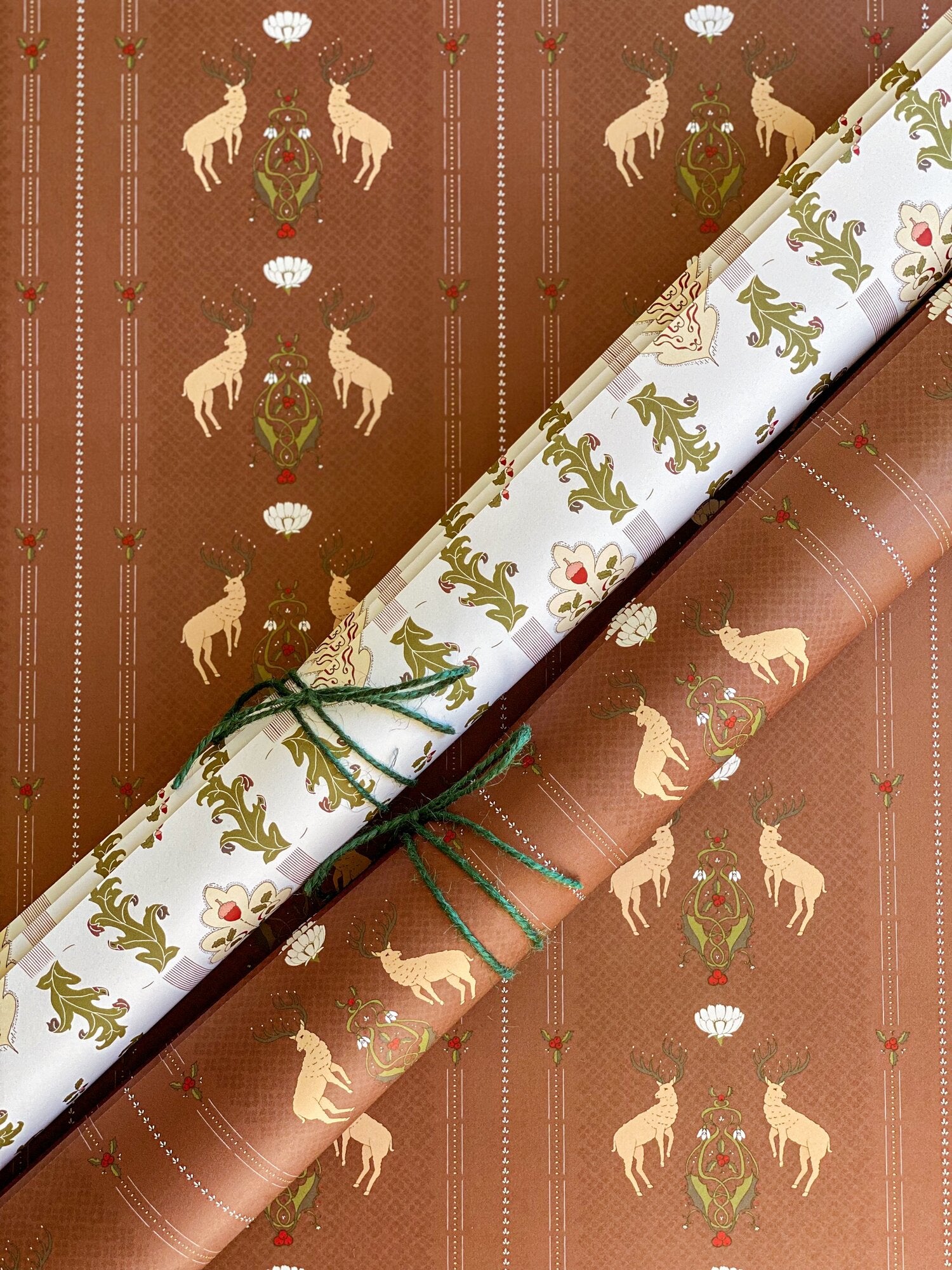 Double the merry with our double-sided wrapping paper featuring Arts & Crafts and Nouveau inspired patterns with the winter solstice themes of the Holly King and the Oak King.