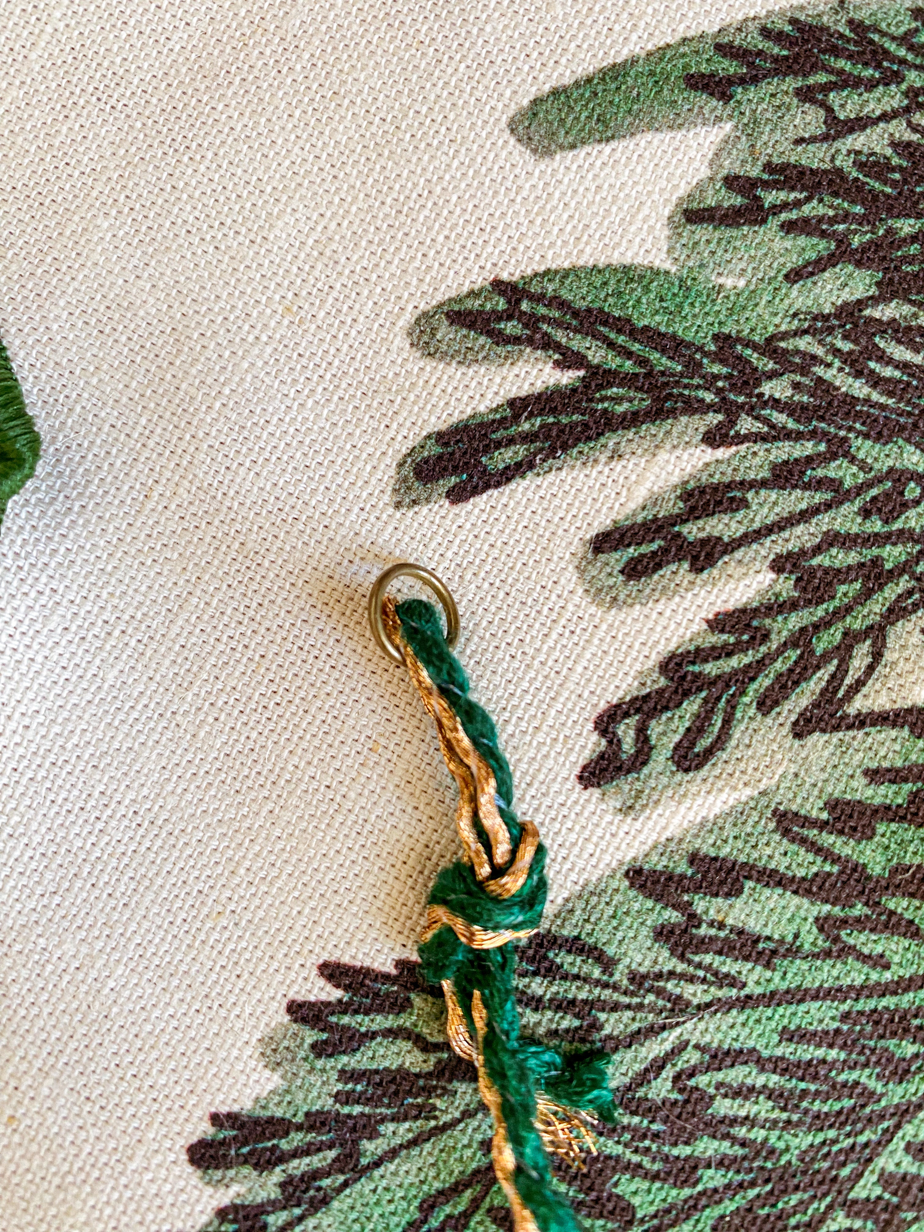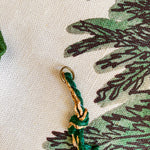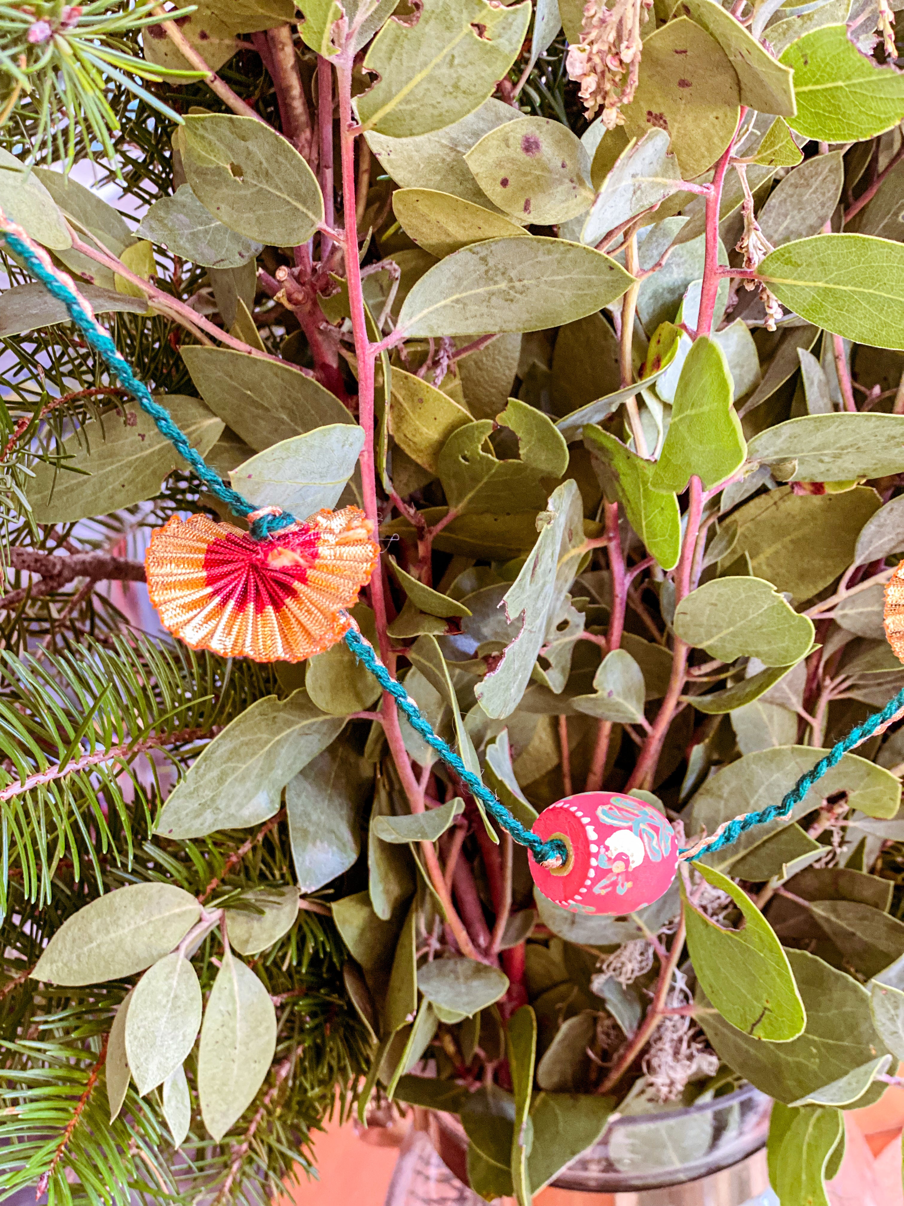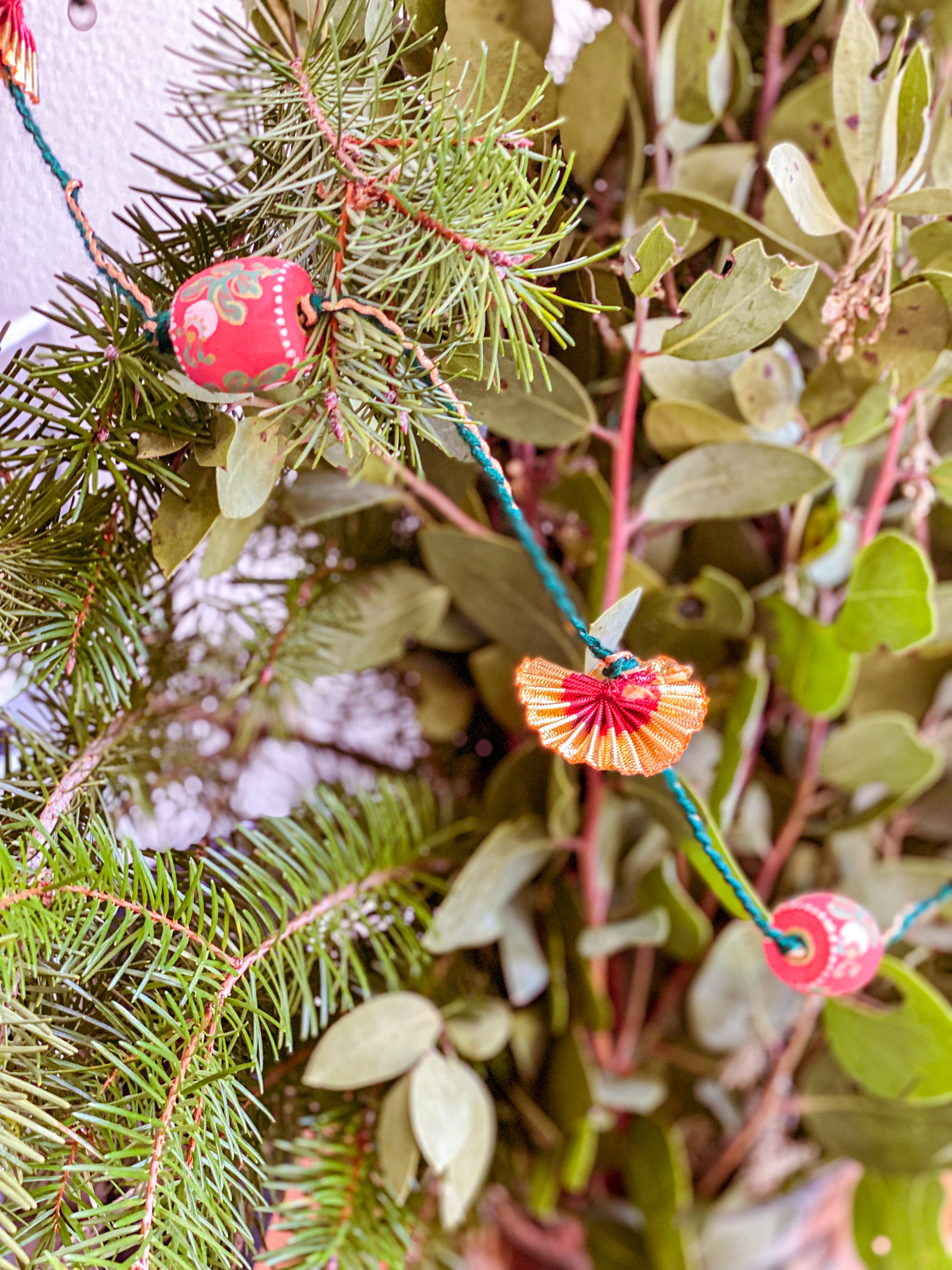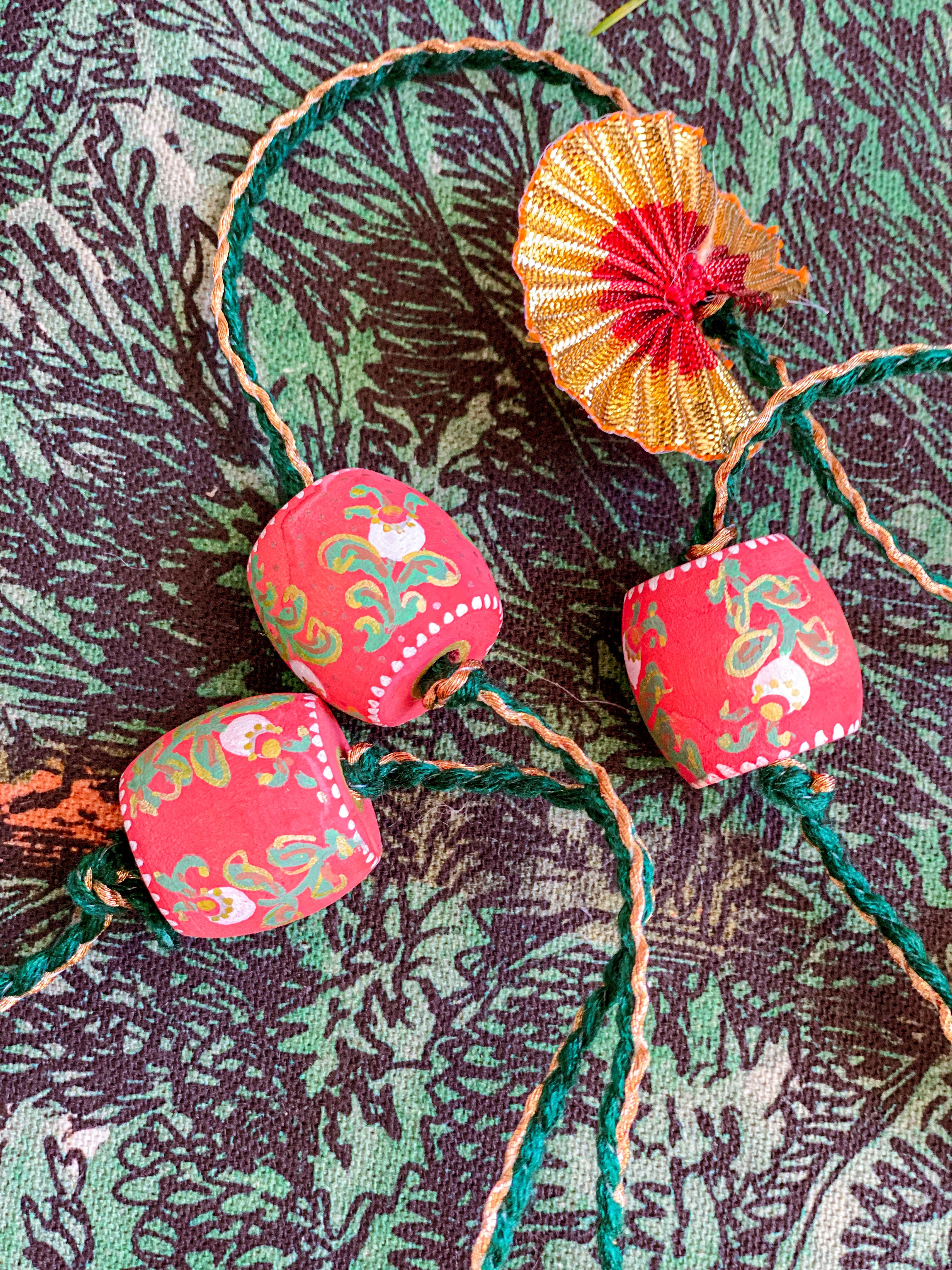 Six hand-painted wooden beads alternate with red and gold metallic fans on an old-stock vintage cord from India. Each end holds a small jump ring to make attaching hooks or other ribbons easy. Drape along a wall or hearth, on a tree or hang vertically in a window to add some festive flair to your home this holiday.