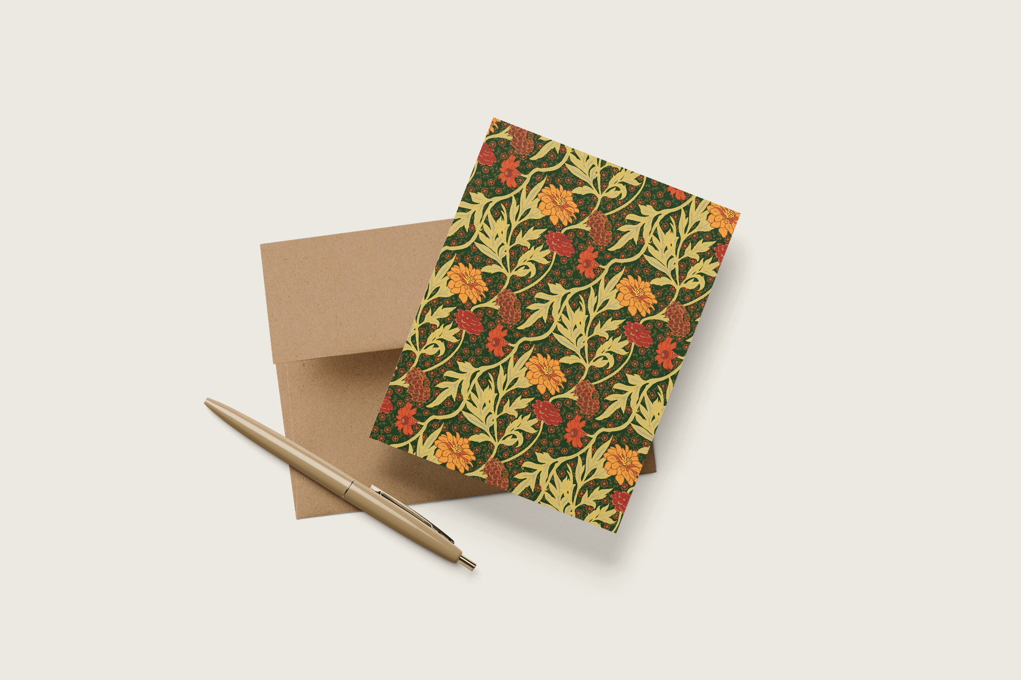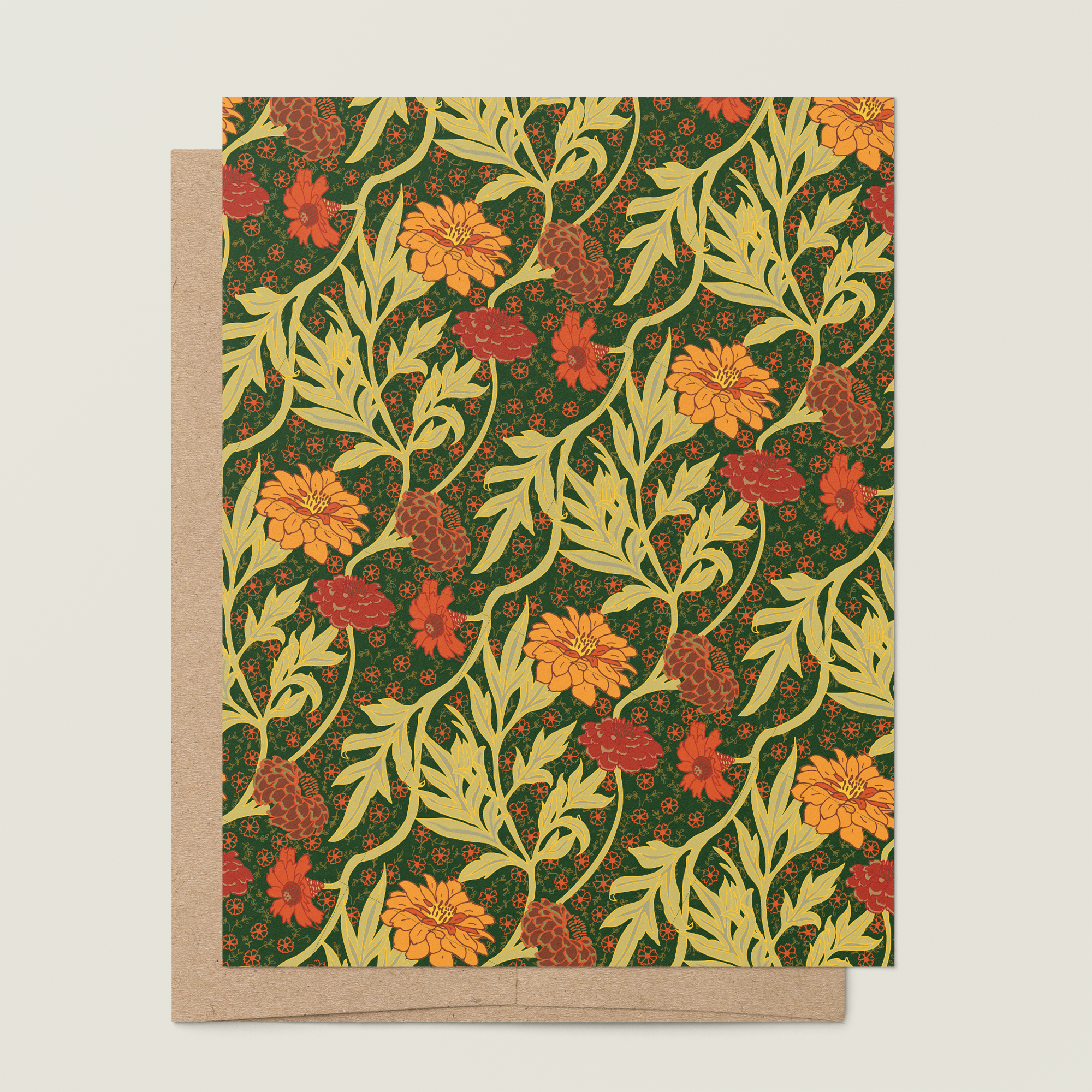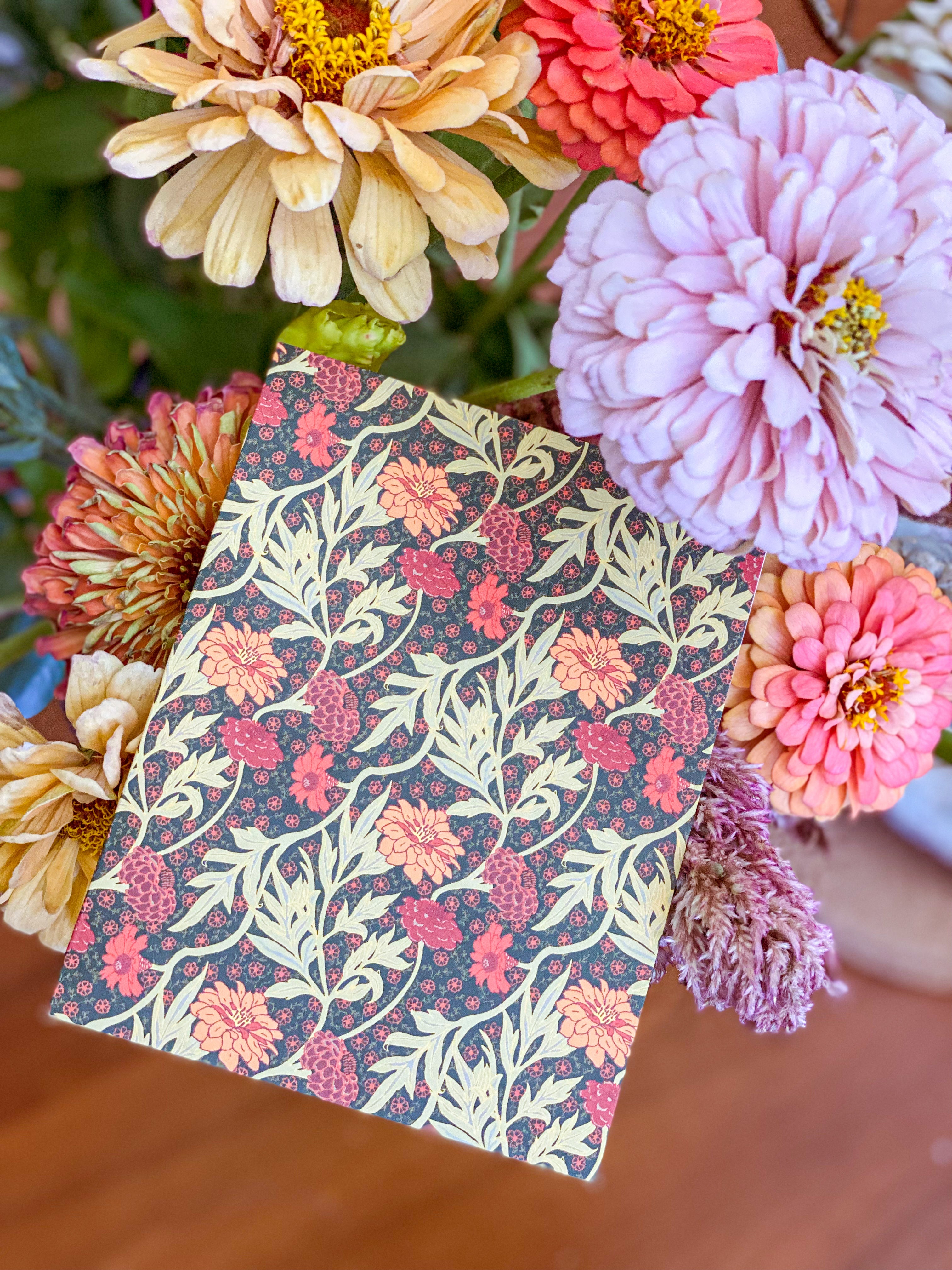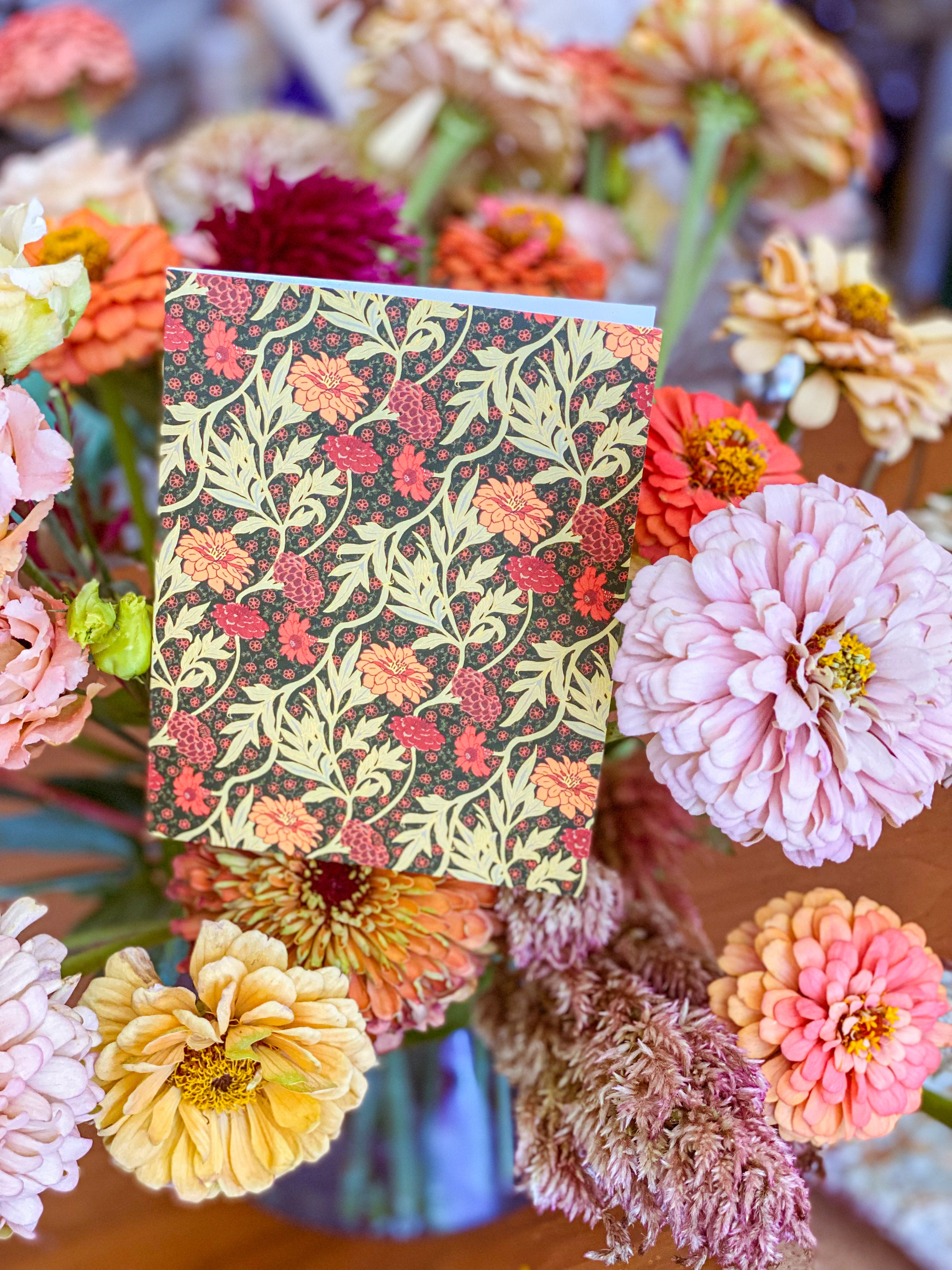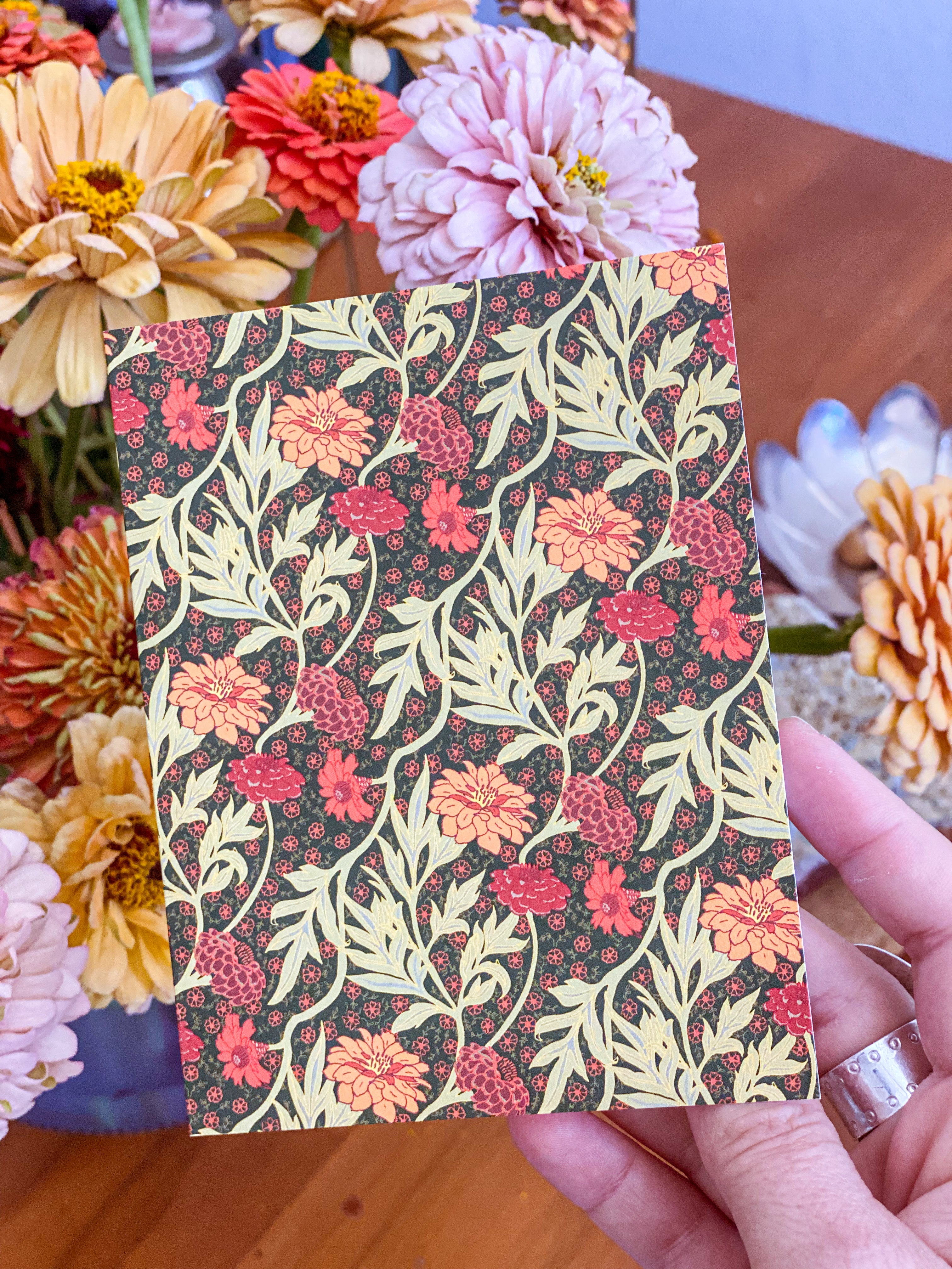 A2 notecard with a blank interior to personalize your own note. Features a zinnia floral pattern from the “Harvest Garden Collection.” In floriography (the language of flowers), zinnias mean “thinking of an absent friend.” Send a note to a friend near or far with this card to let them know they’re missed.