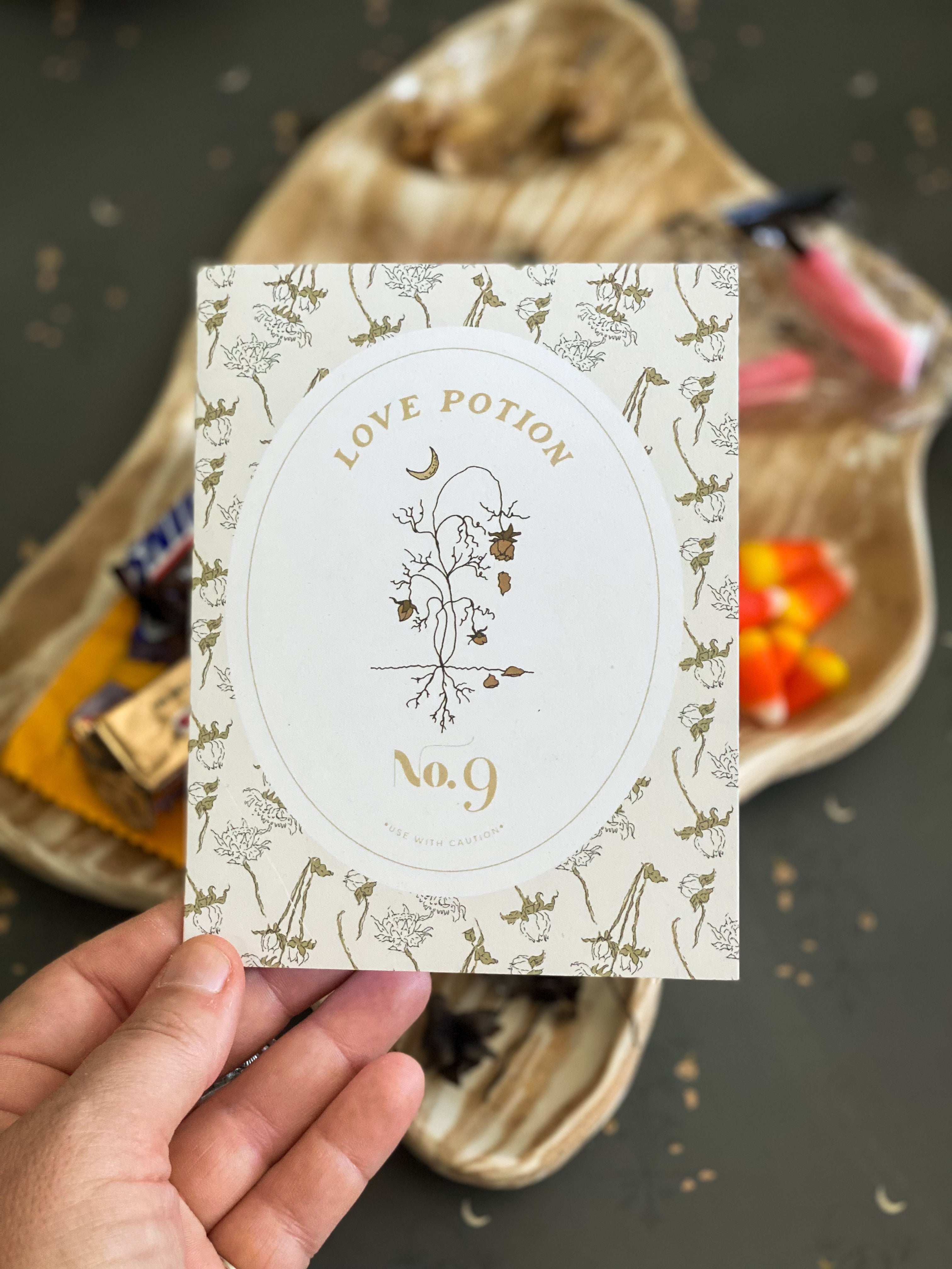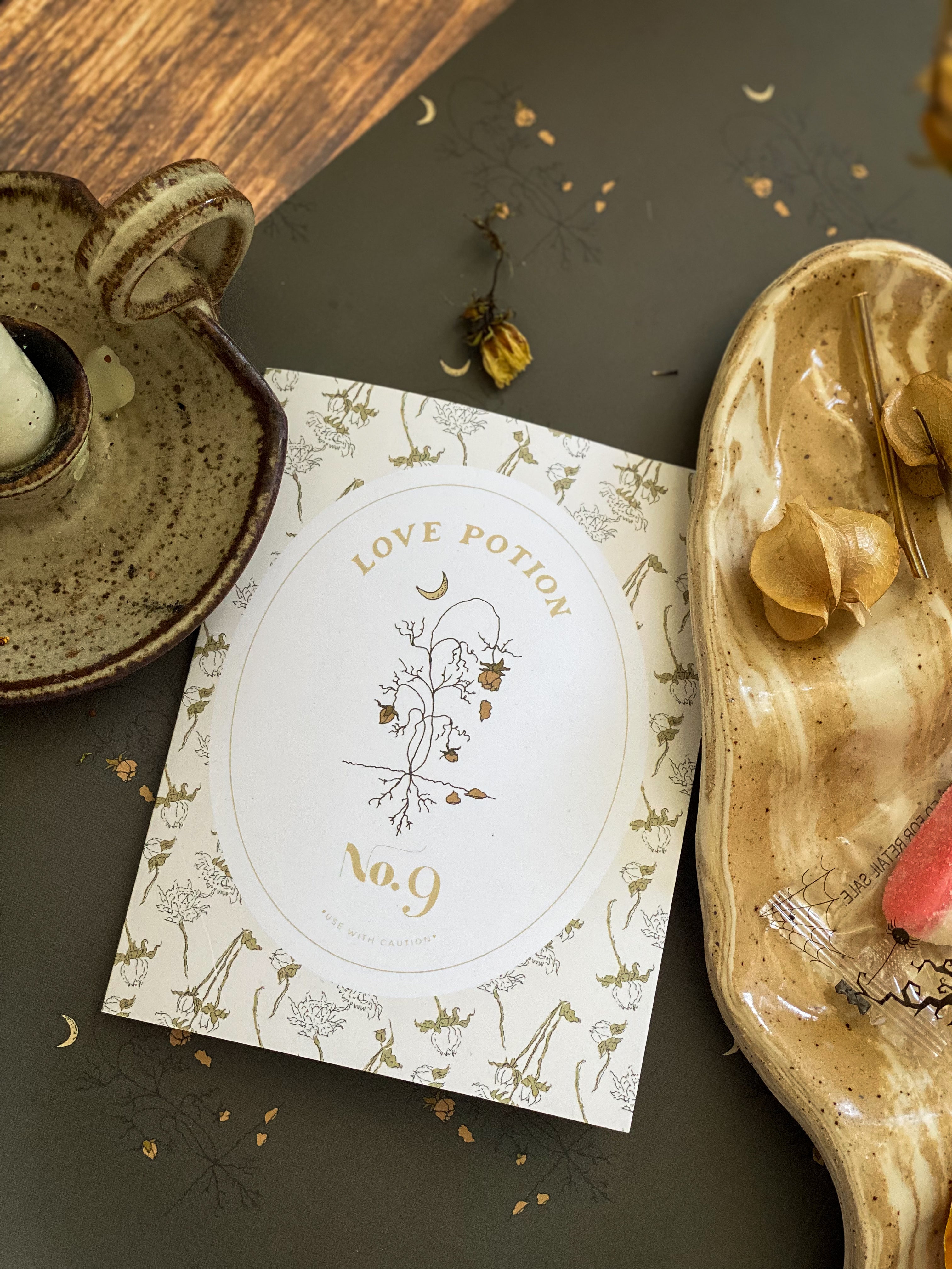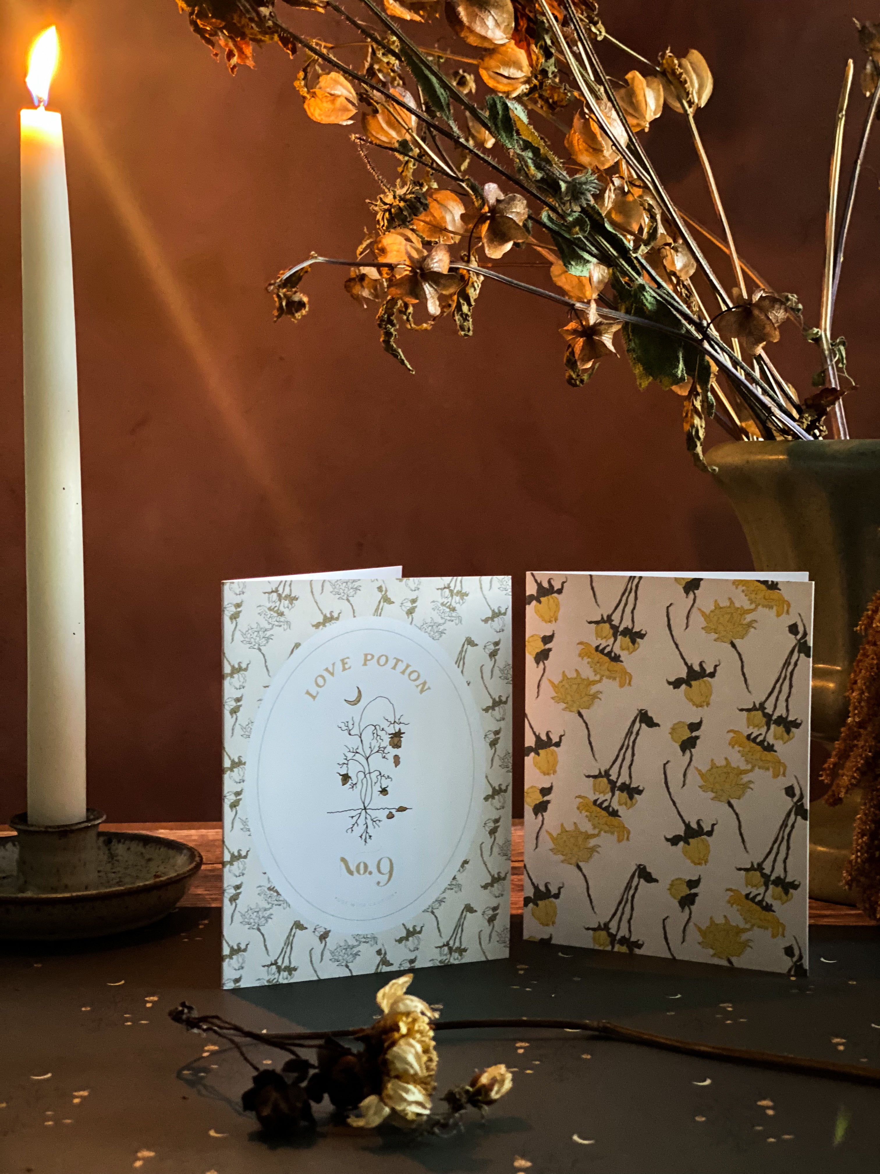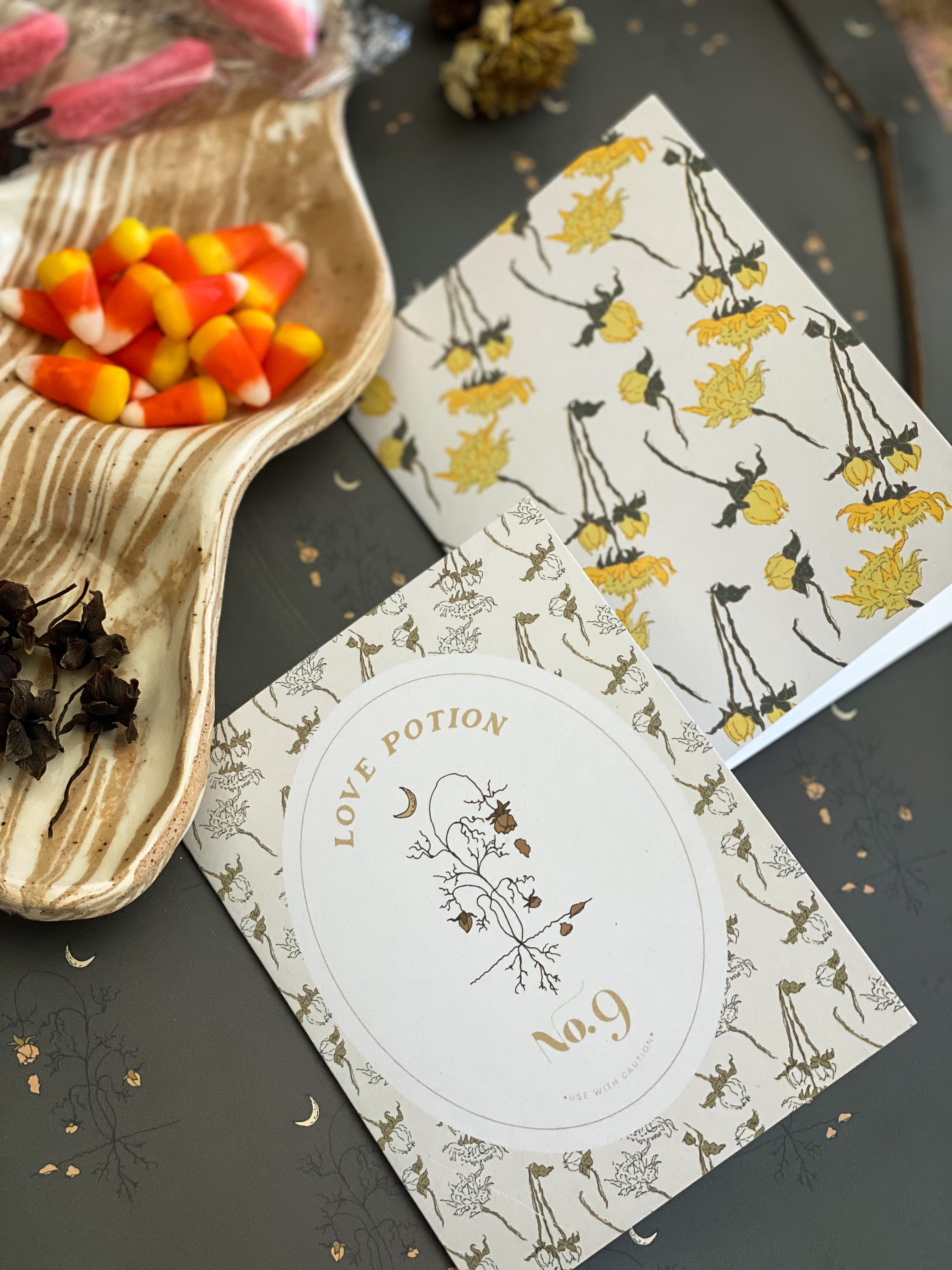 A2 notecard with a blank interior to personalize your own note. Features a "spooky season" magical love potion label motif and dried floral pattern background. Created for our Halloween capsule within our best-selling Harvest Garden Collection.