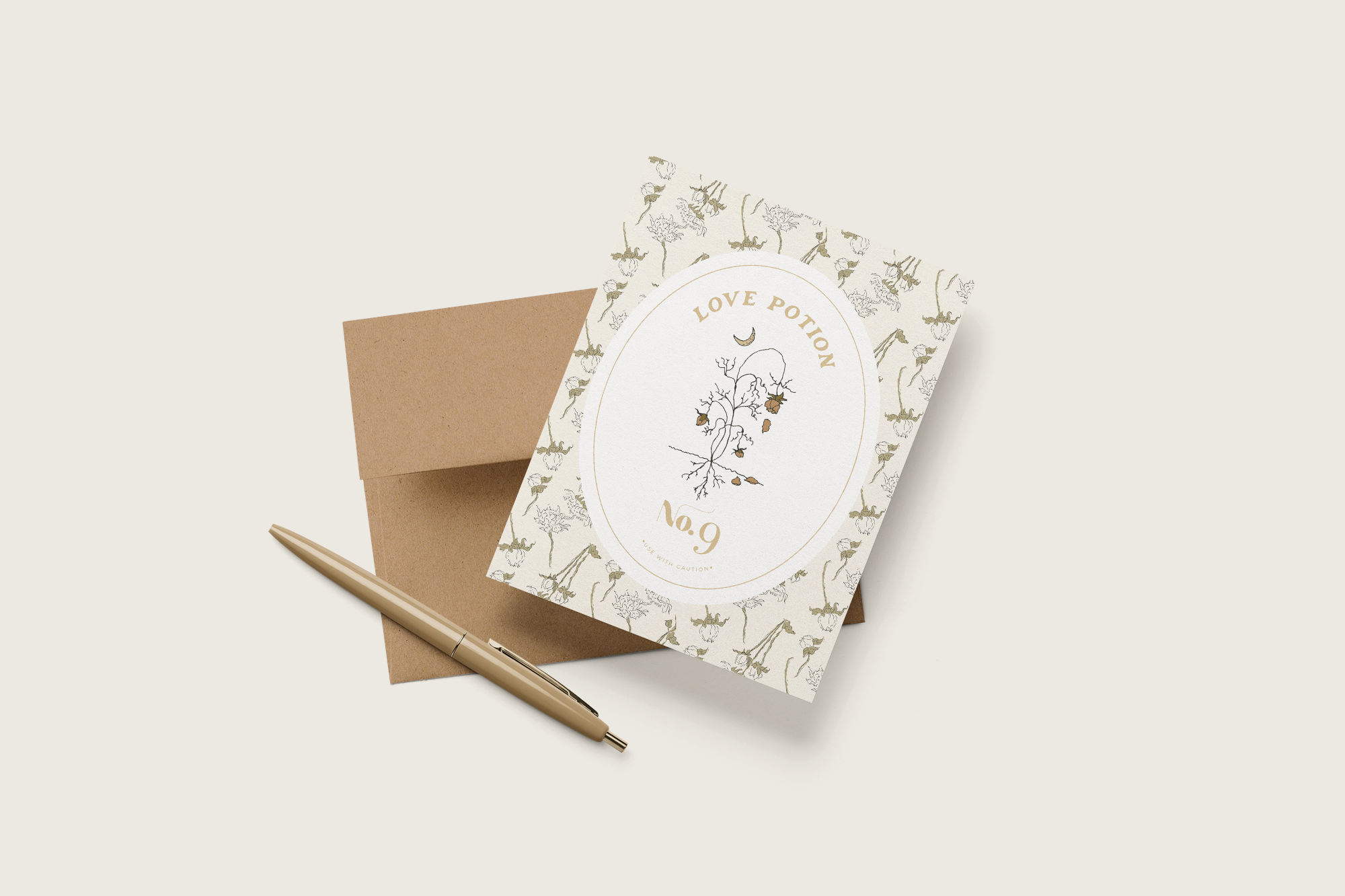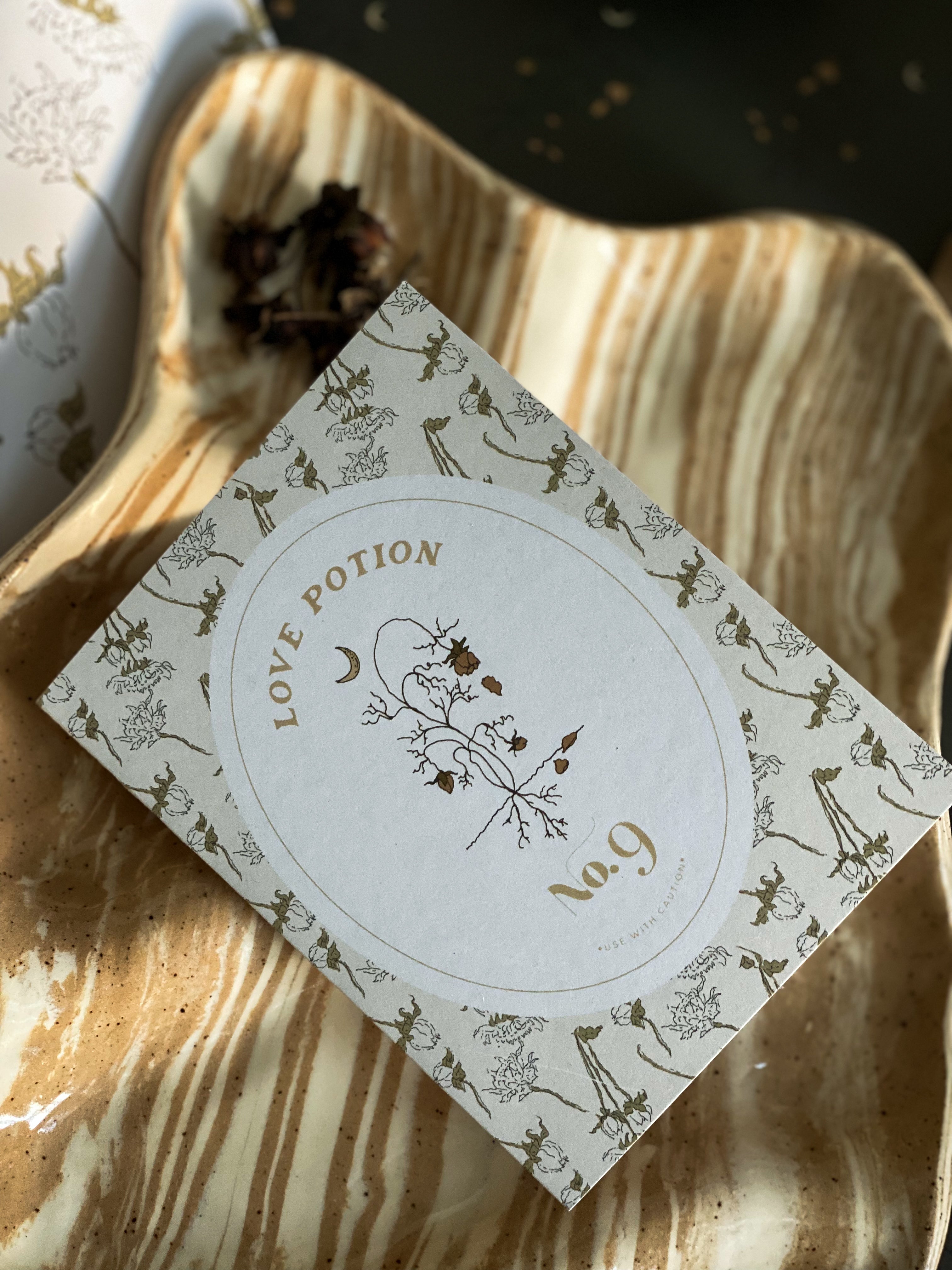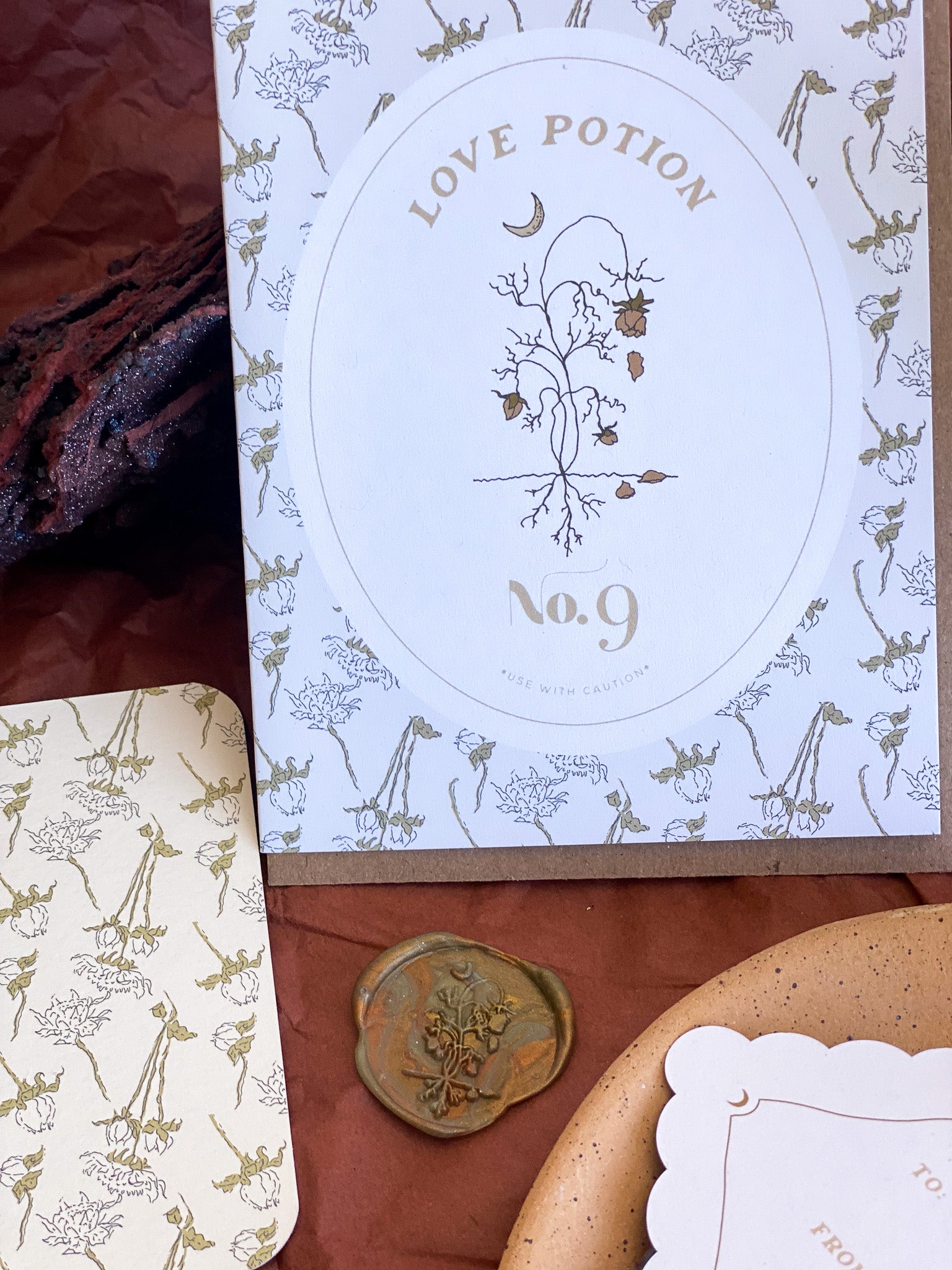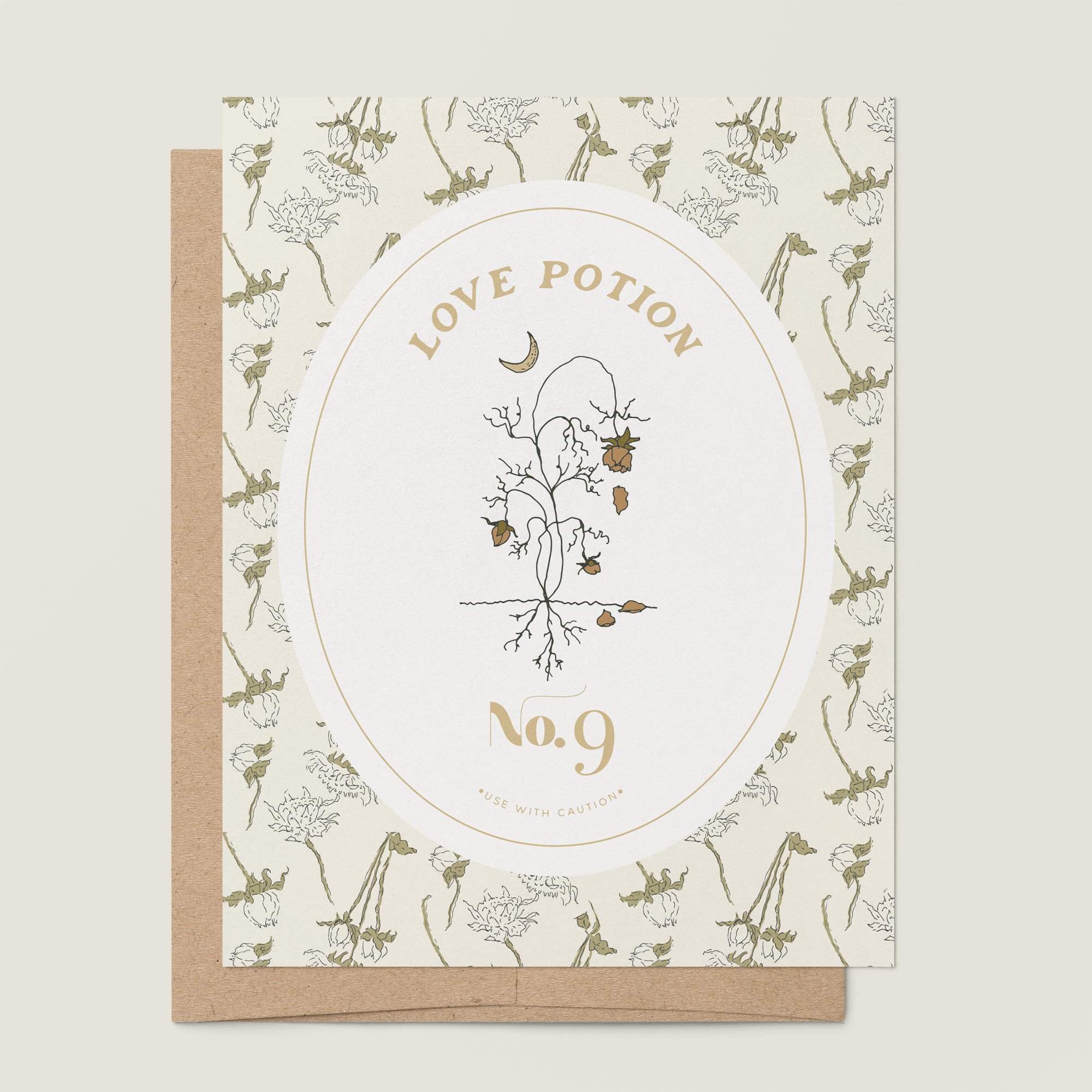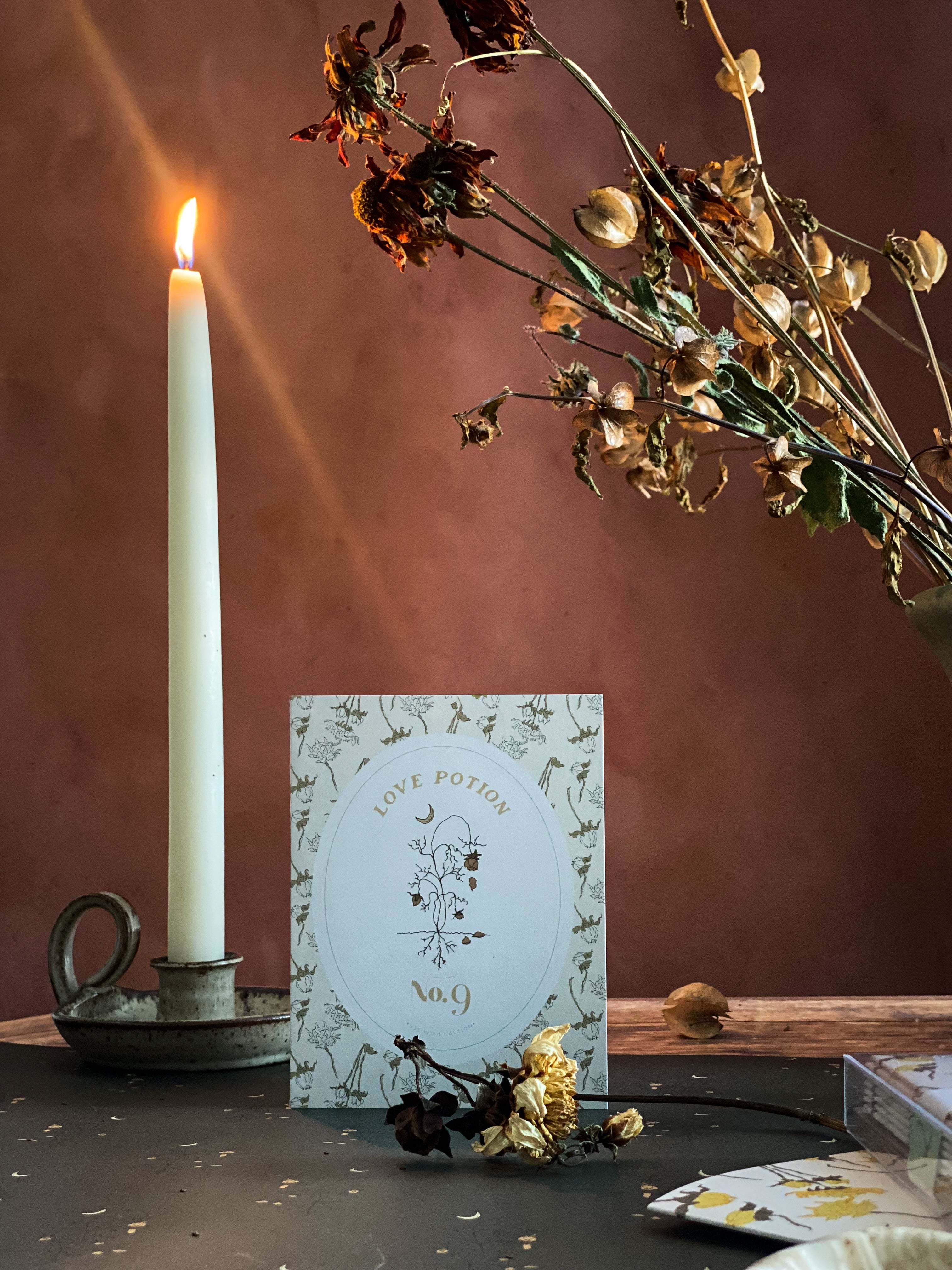 A2 notecard with a blank interior to personalize your own note. Features a "spooky season" magical love potion label motif and dried floral pattern background. Created for our Halloween capsule within our best-selling Harvest Garden Collection.