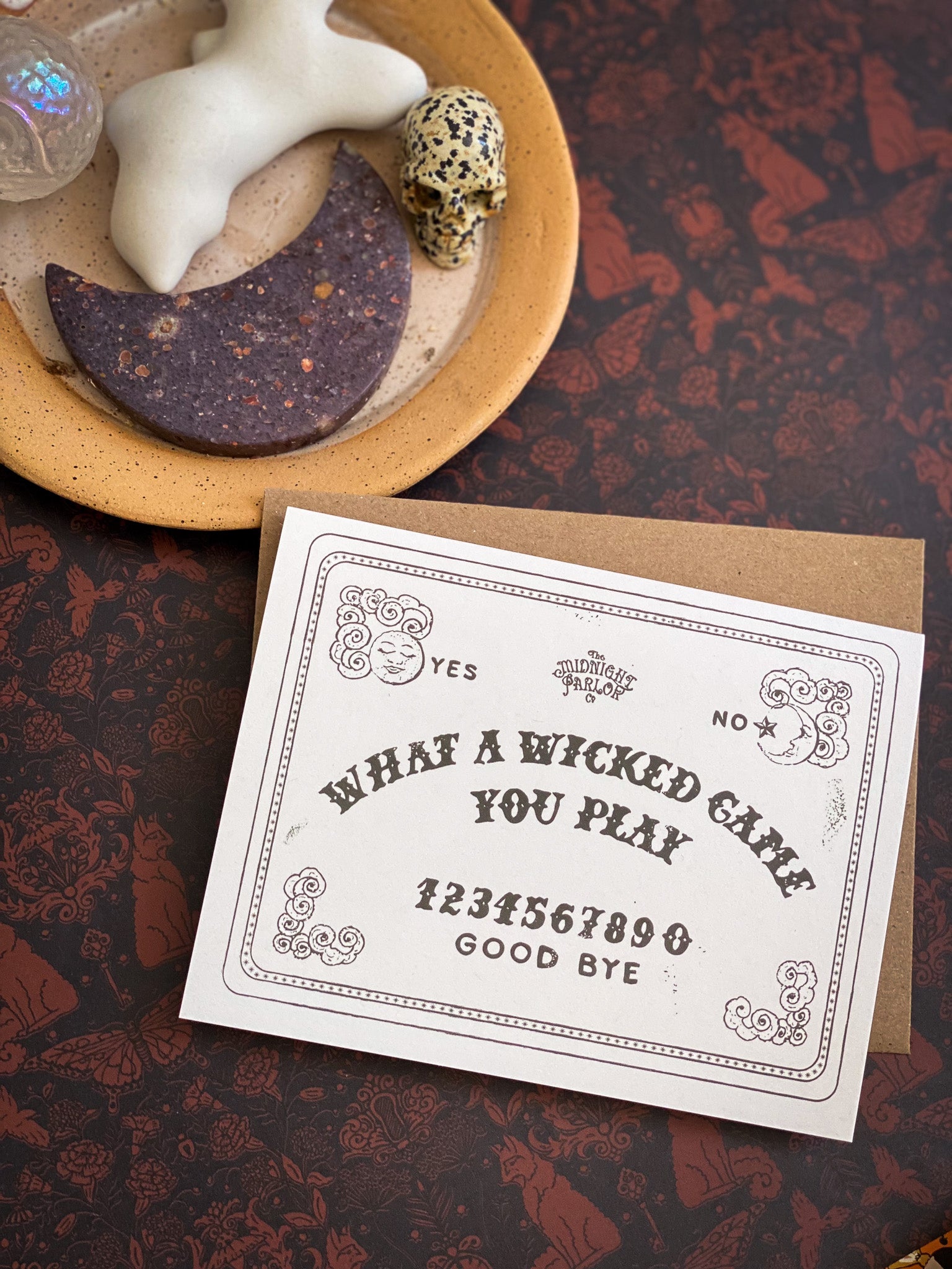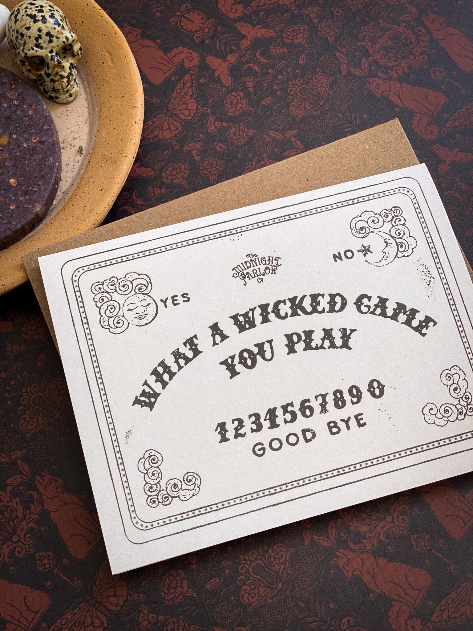 Is it love… or something a little more mysterious? Our “Wicked Games” card channels the vintage mystique of a spirit board to deliver your message with a wink and a whisper. This hand-illustrated design is perfect for Halloween flirtations, ghosted lovers, or anyone who enjoys a little enchantment with their mischief.