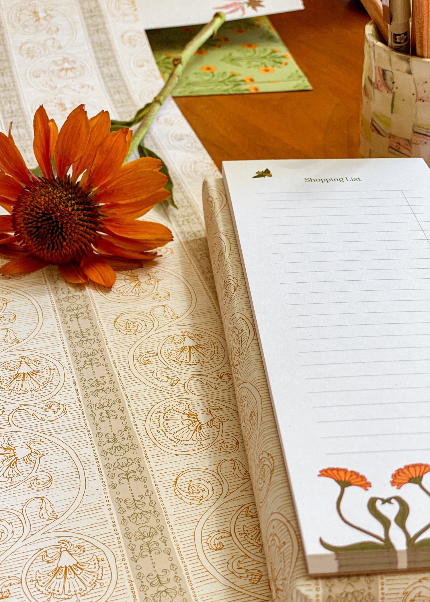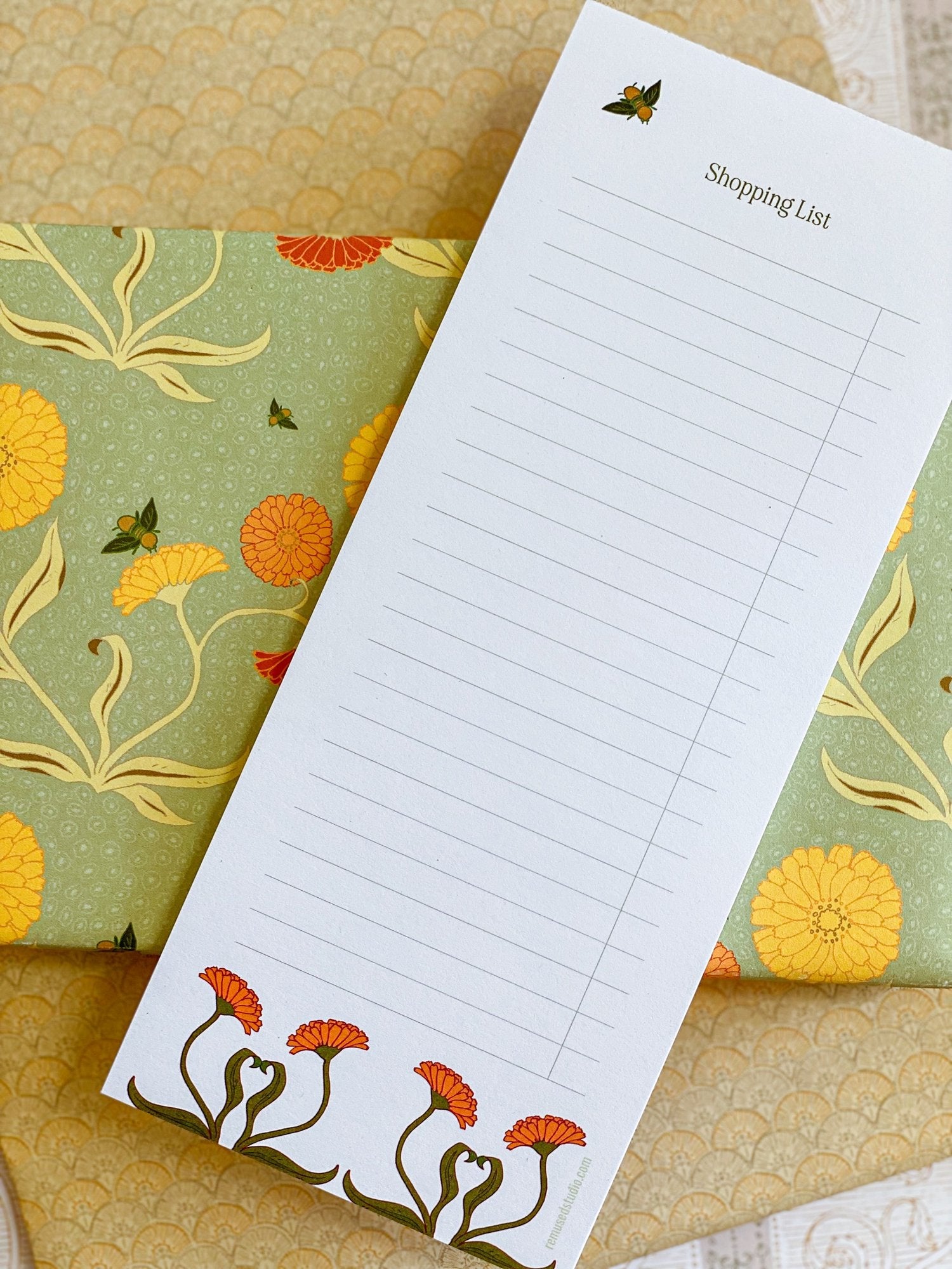 The Calendula Shopping List notepad is the perfect kitchen companion for an elegant place to jot down grocery lists and other needs. Decorated with an orange and green nouveau inspired calendula floral motif and bumble bee accent, it pairs perfectly with our Calendula Kitchen Recipe Book and Weekly Planner Notepad for beautiful gift bundle options along with matching gift wrap, gift bags, gift tags, greeting cards, washi tape and stickers.