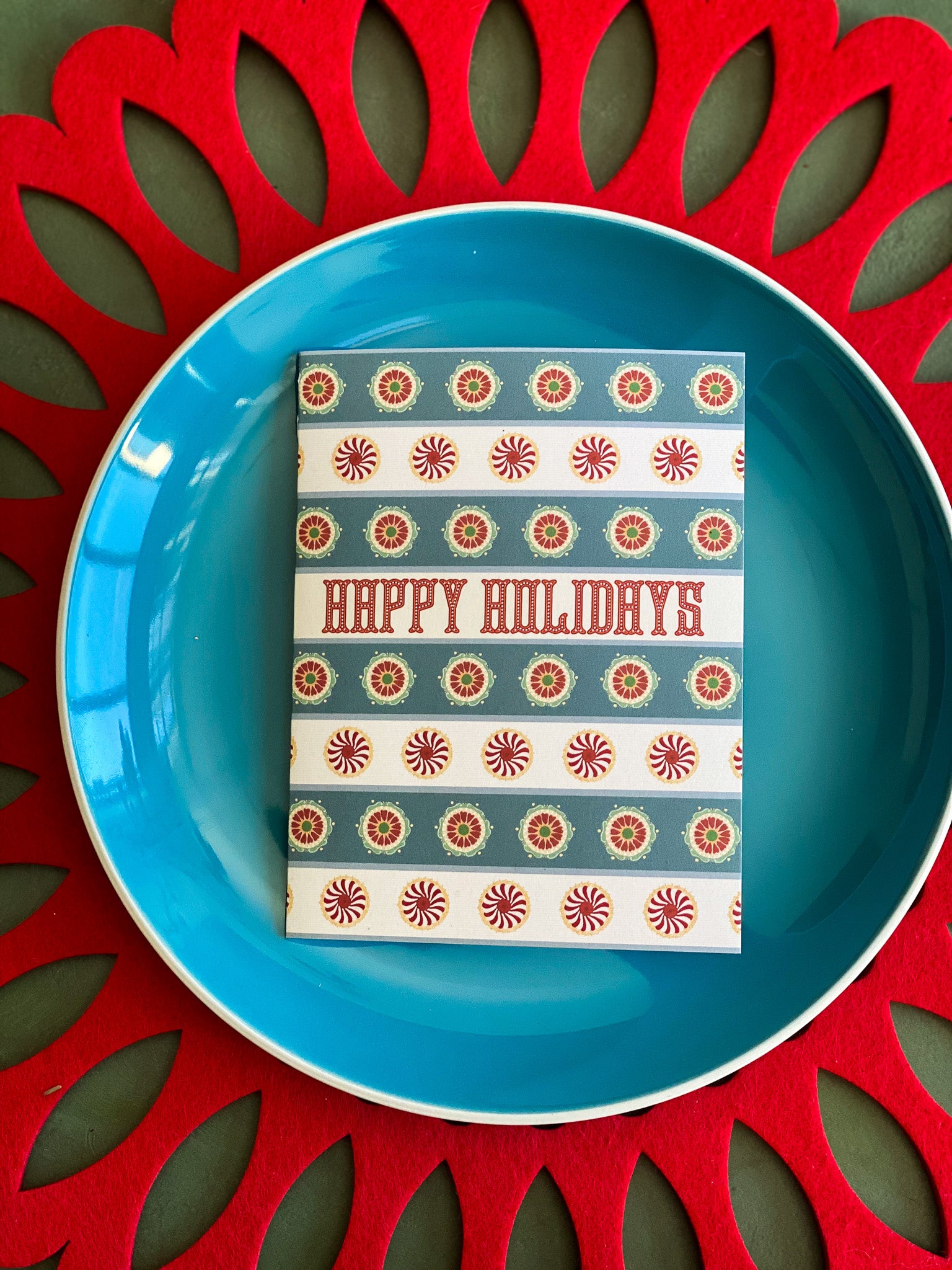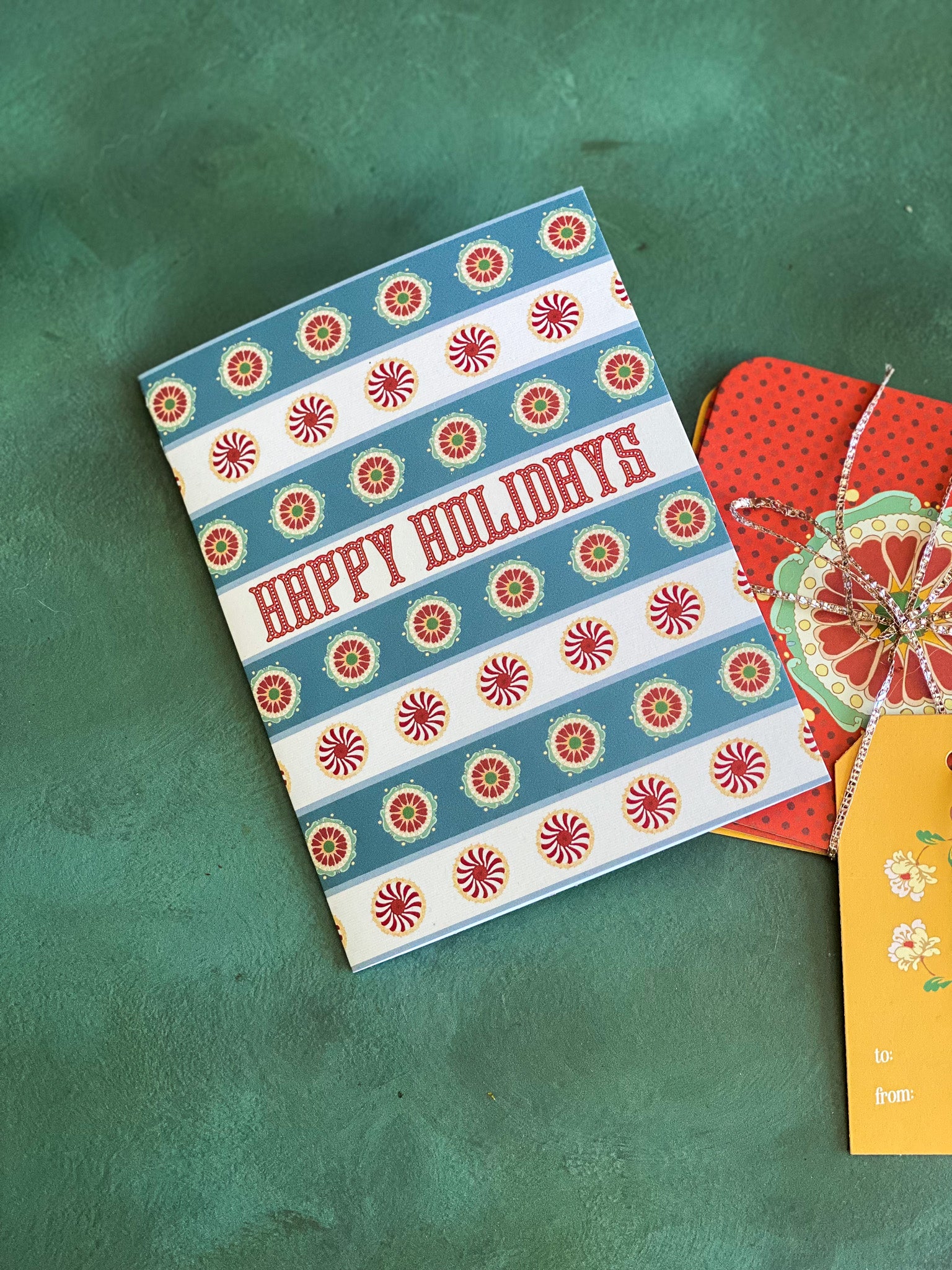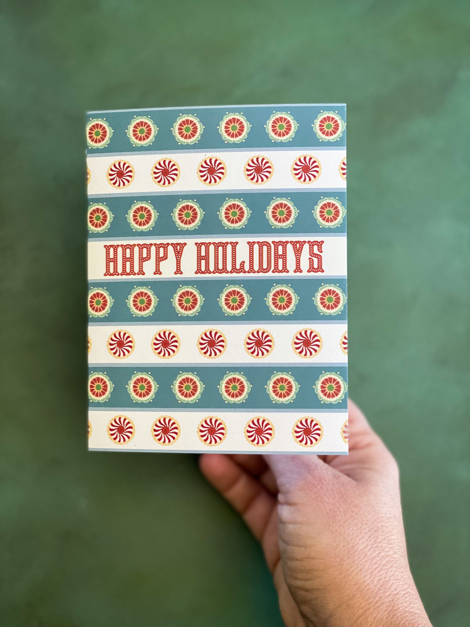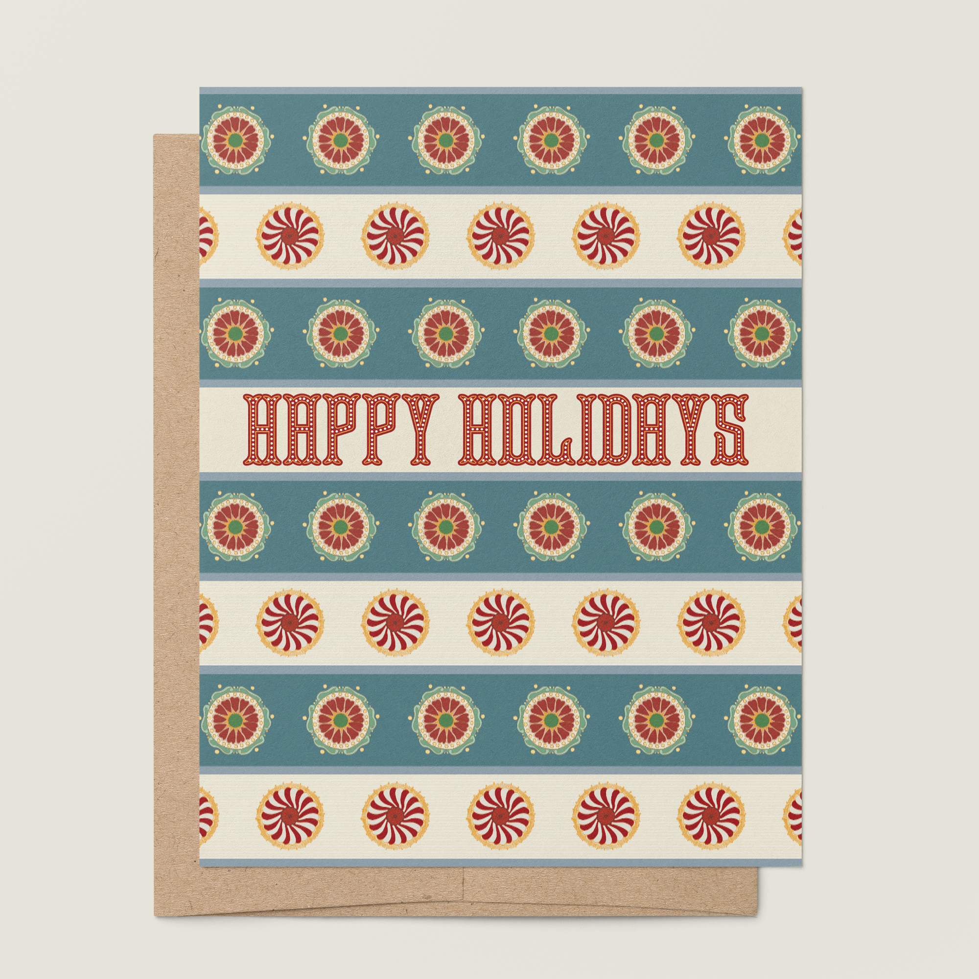 A2 folded notecard with an vintage carnival inspired holiday pattern with a "Happy Holidays" message on the front and a blank interior to personalize your own note.