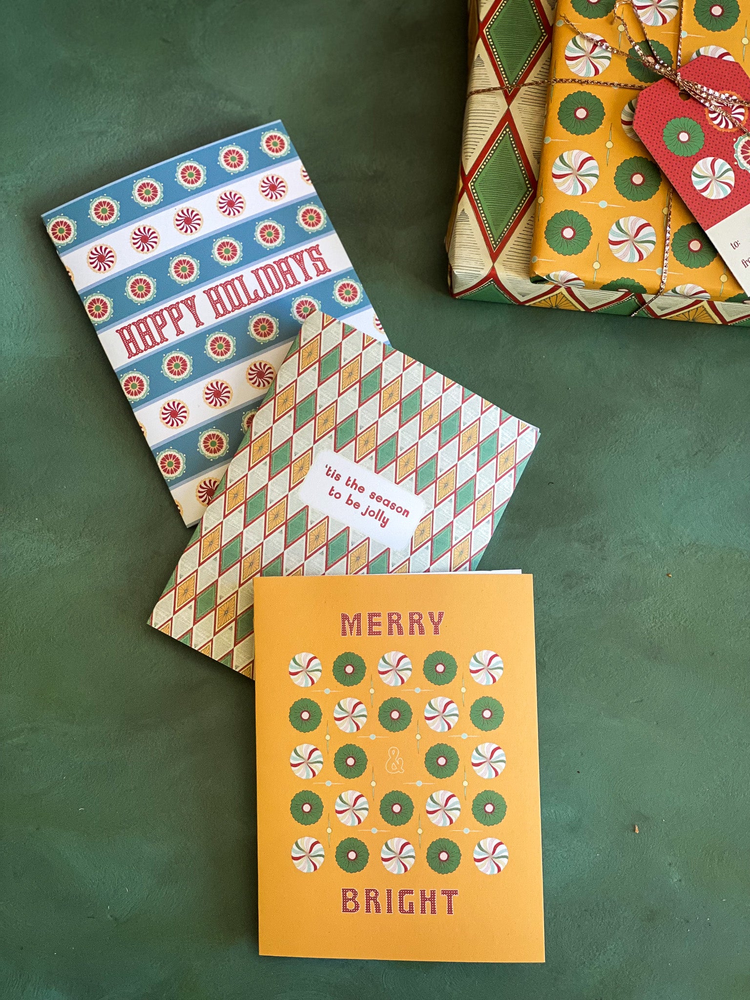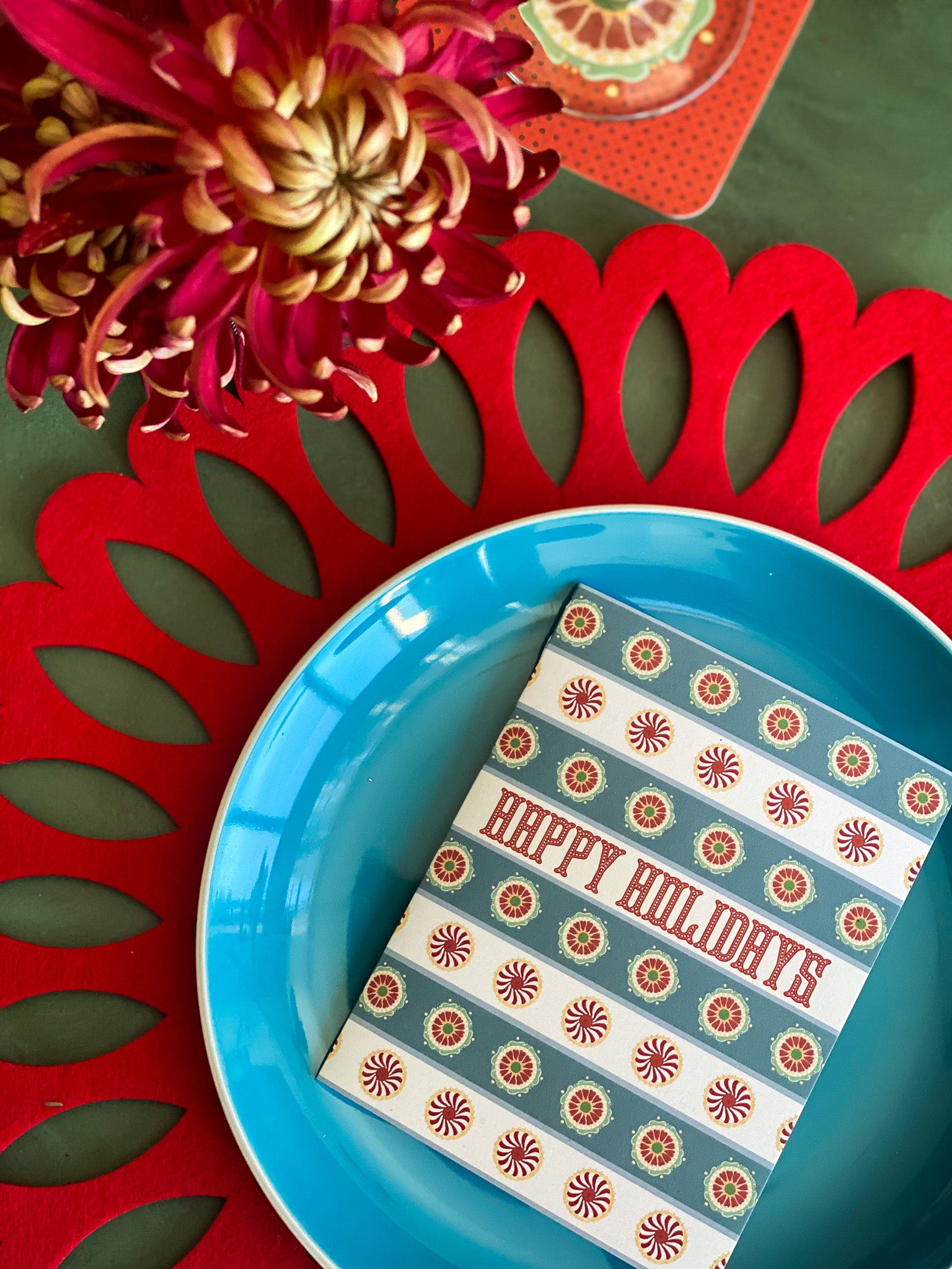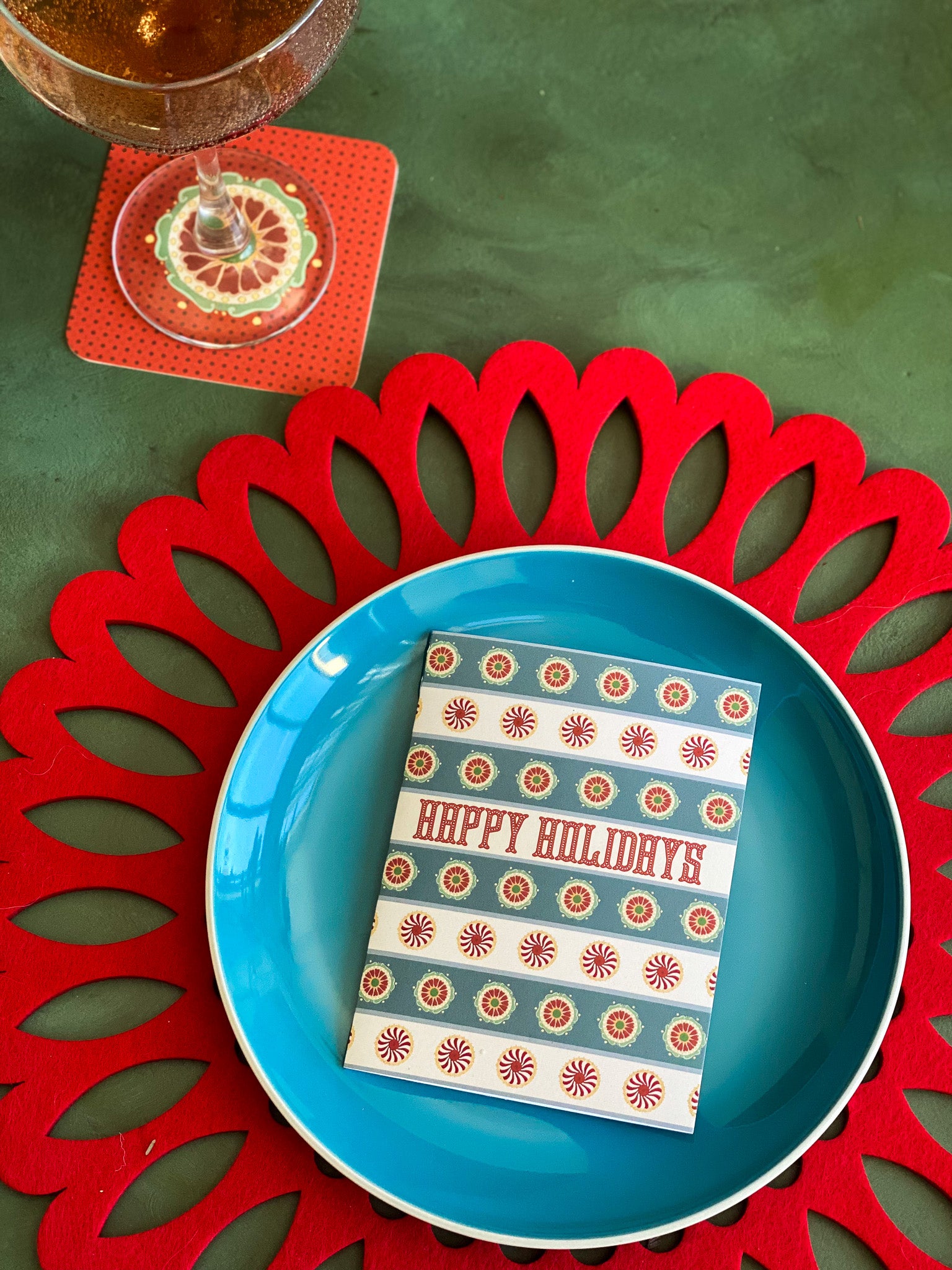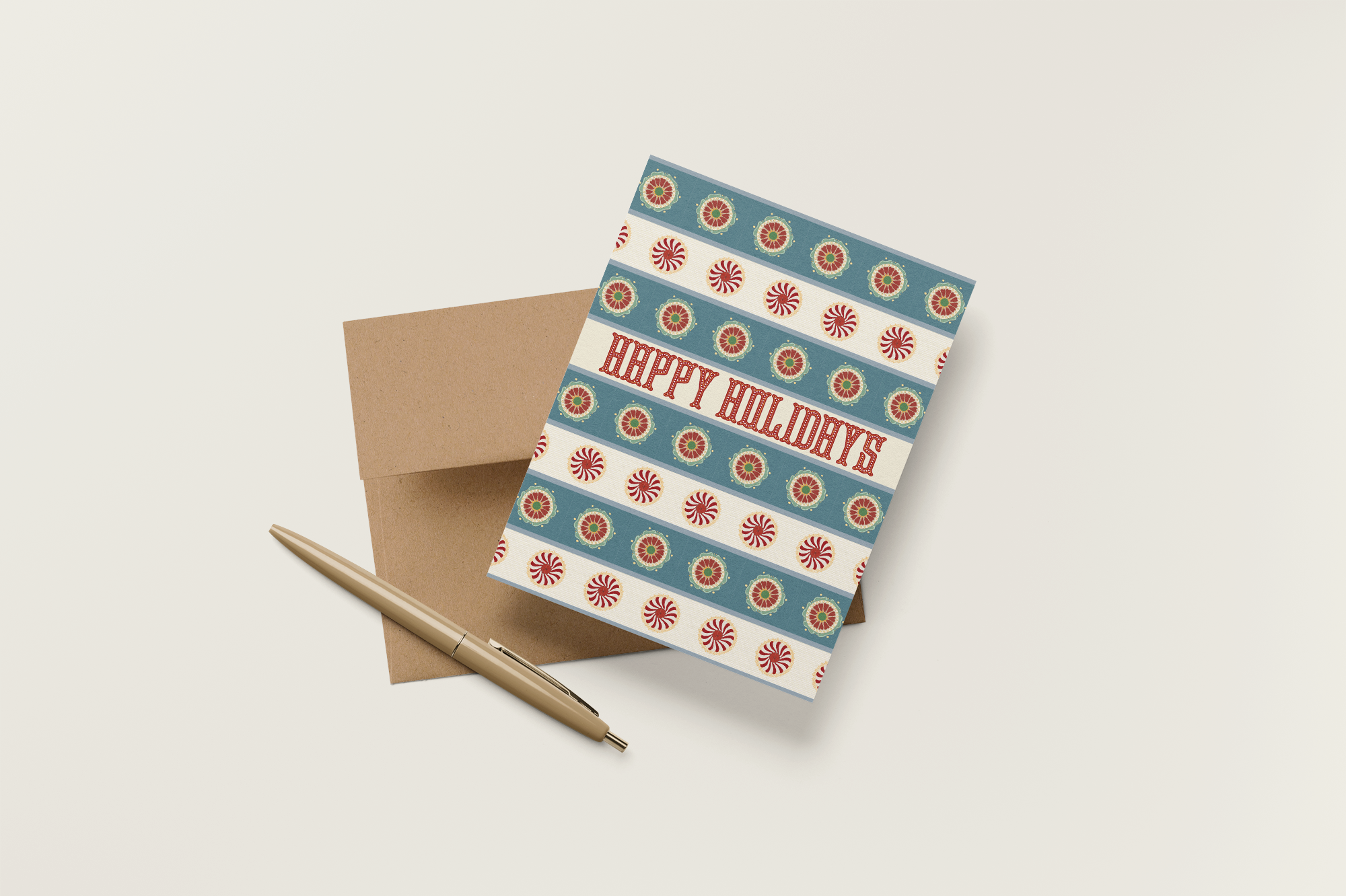 A2 folded notecard with an vintage carnival inspired holiday pattern with a "Happy Holidays" message on the front and a blank interior to personalize your own note.