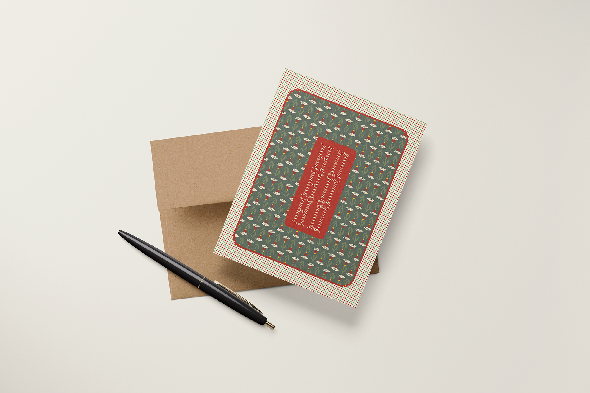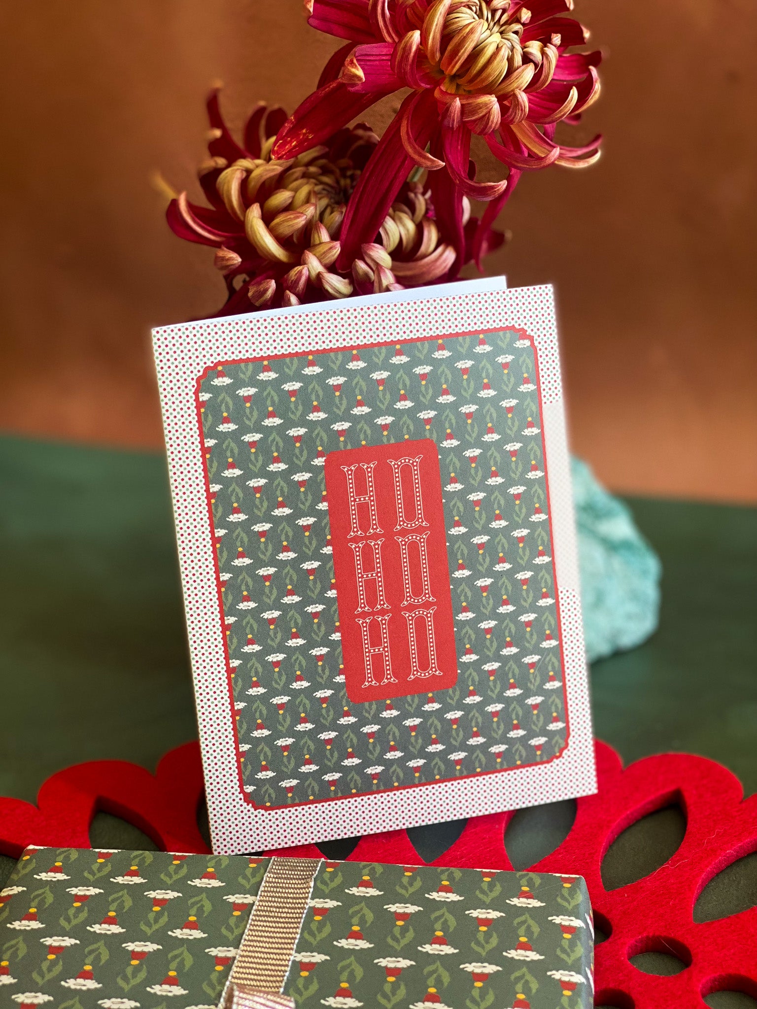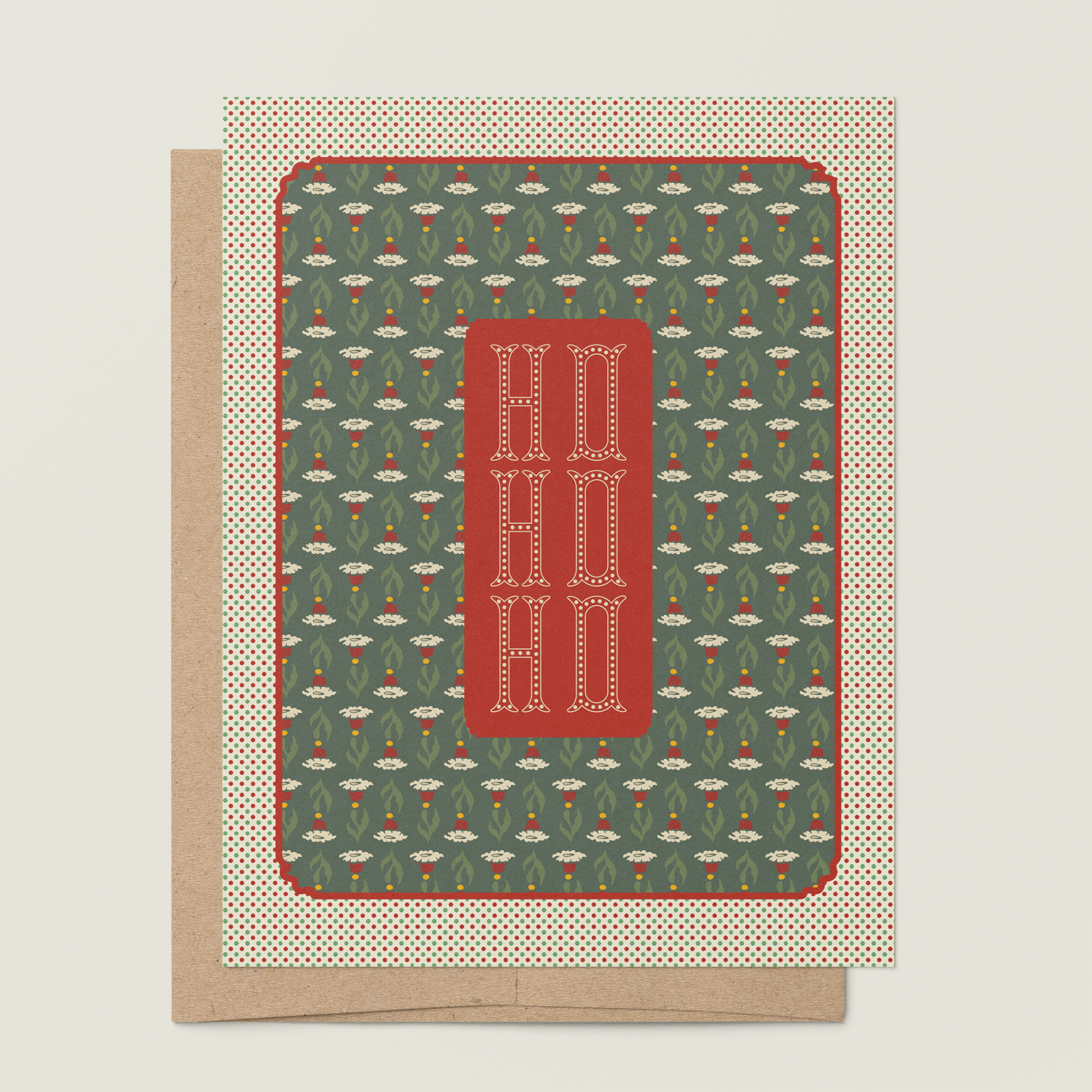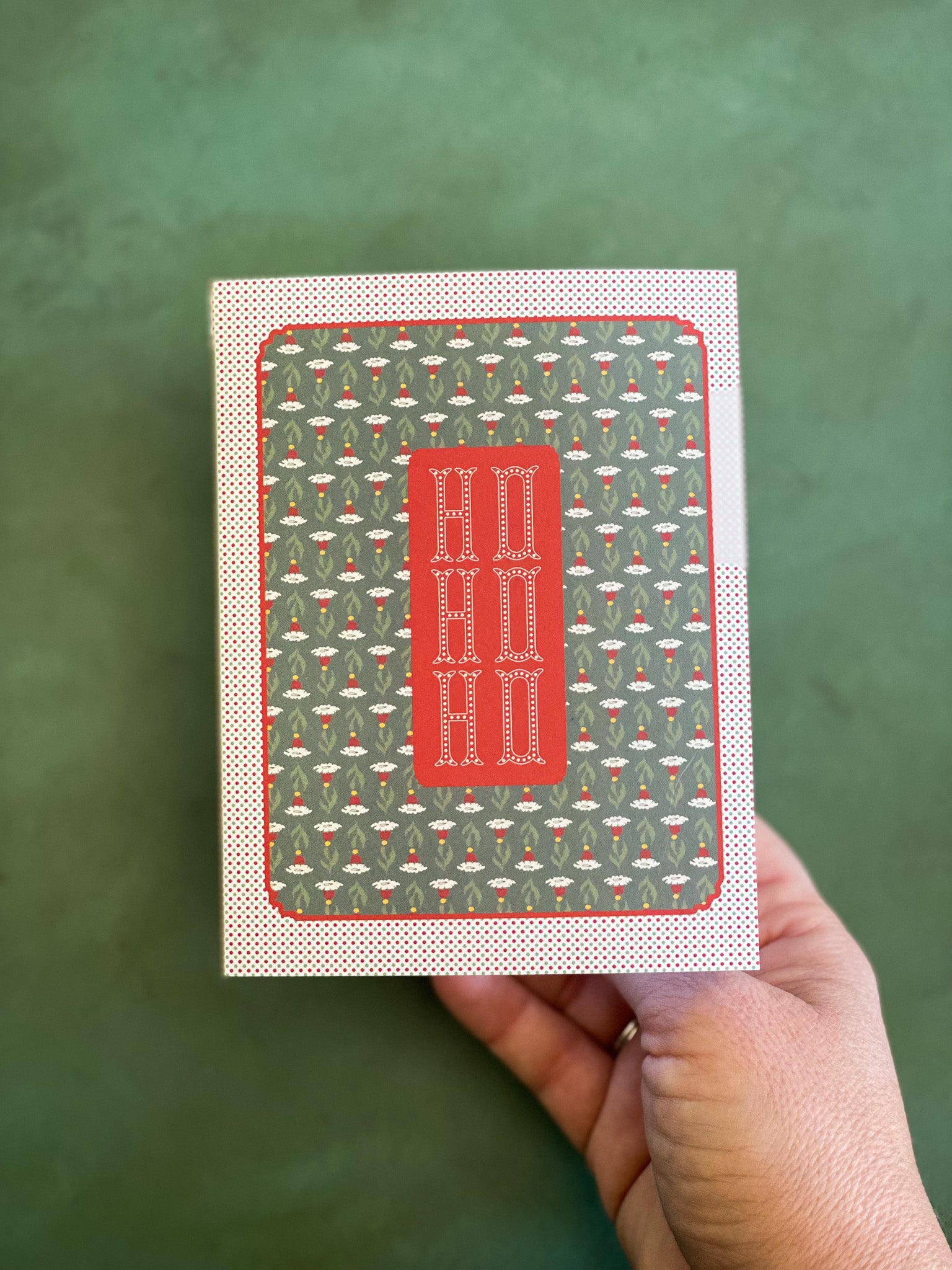 A2 folded notecard with an vintage carnival inspired holiday floral Santa Hat pattern with a "Ho Ho Ho" message on the front and a blank interior to personalize your own note.