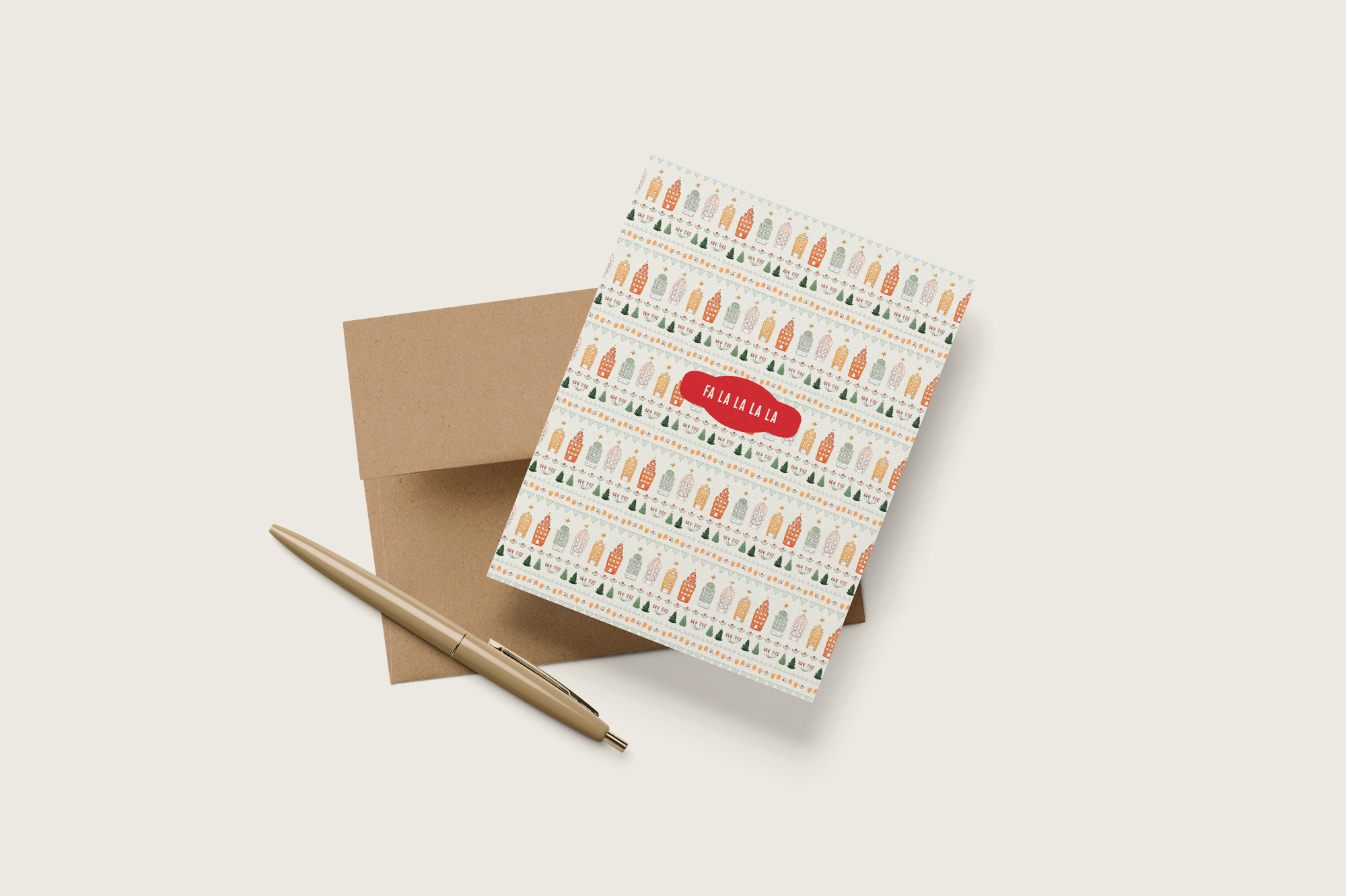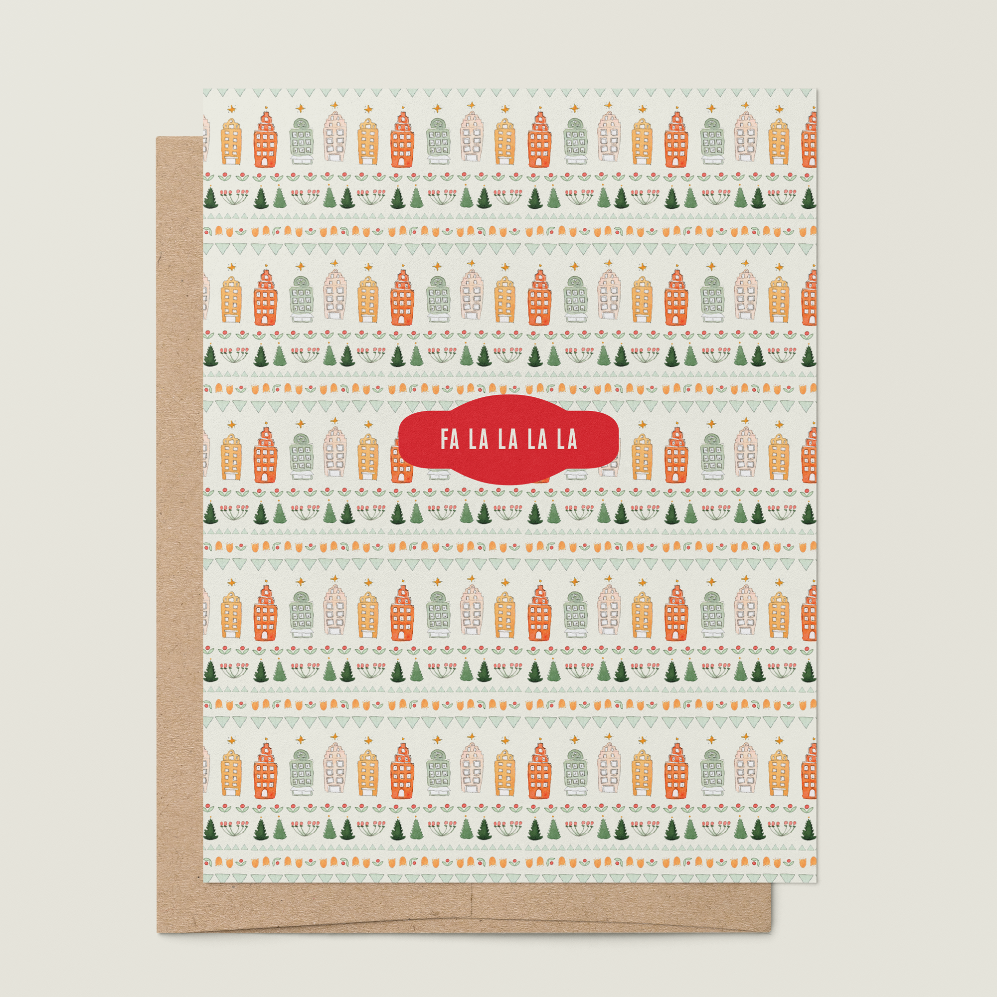 A2 folded notecard with "Fa La La La La La" on the front, a pattern inspired by Old Town Stockholm and a blank interior to personalize your own note.