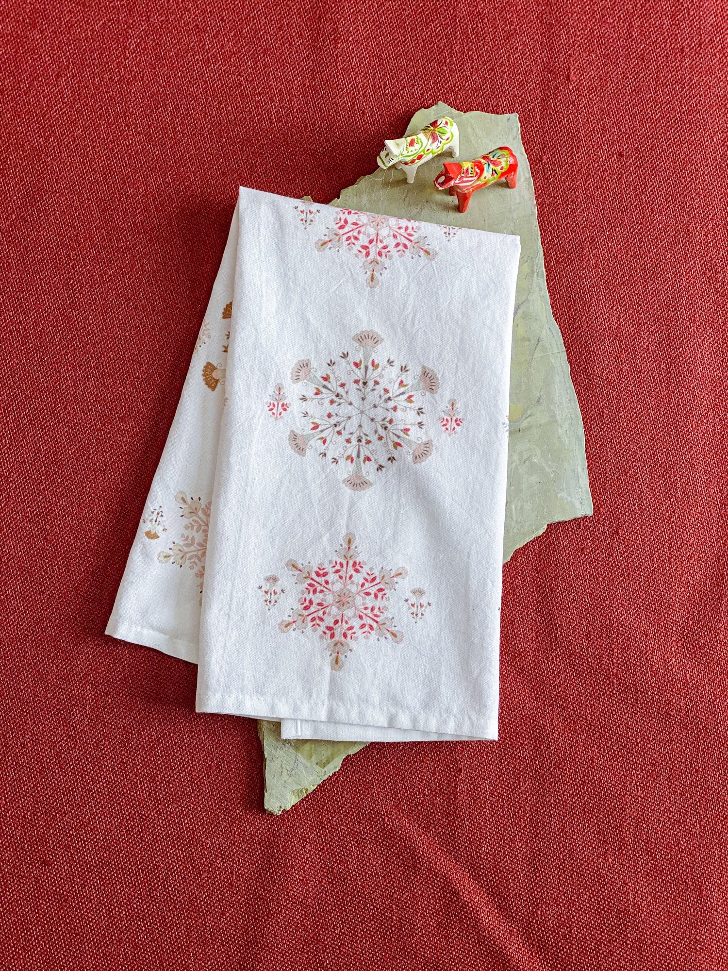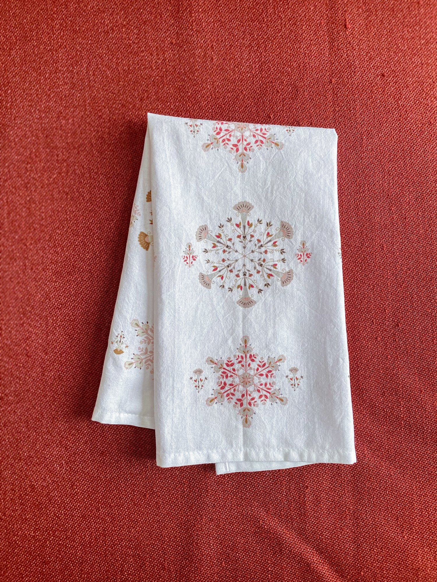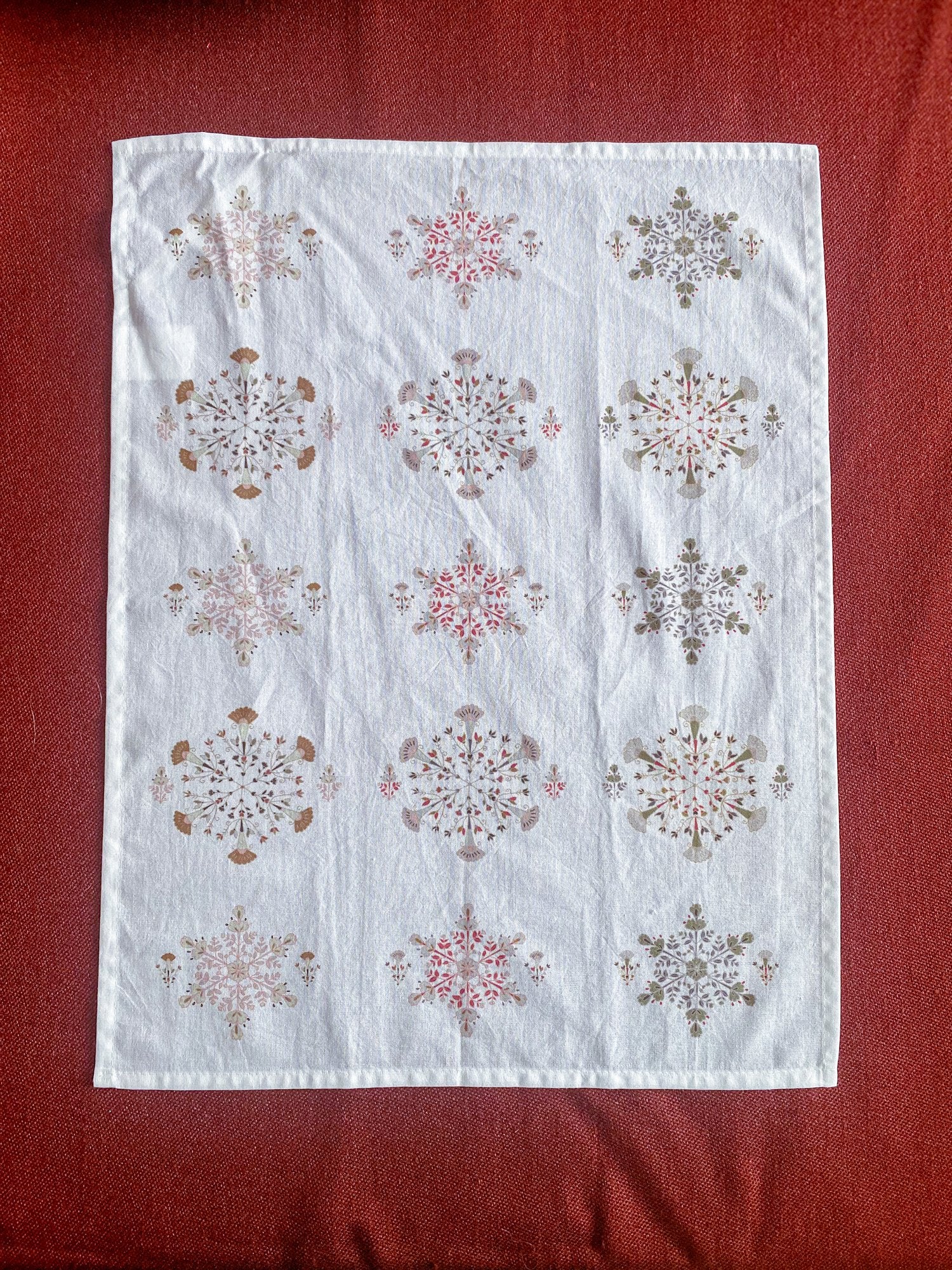 Brighten up your kitchen or dining table with this floral snowflake pattern, perfect for the holiday season. Great for use as a tea towel or as napkins for your holiday place settings. Wrap them up in your favorite ribbon for a lovely hostess gift or stocking stuffer.