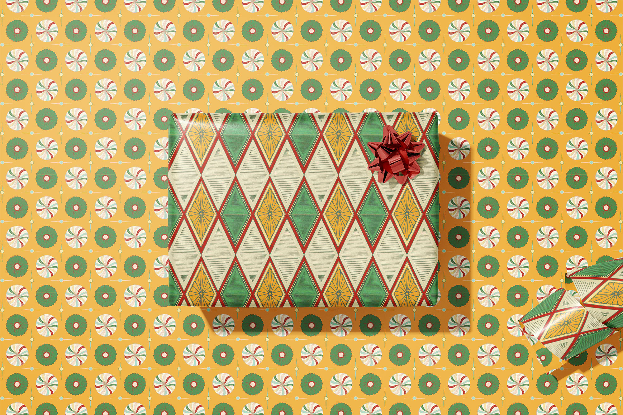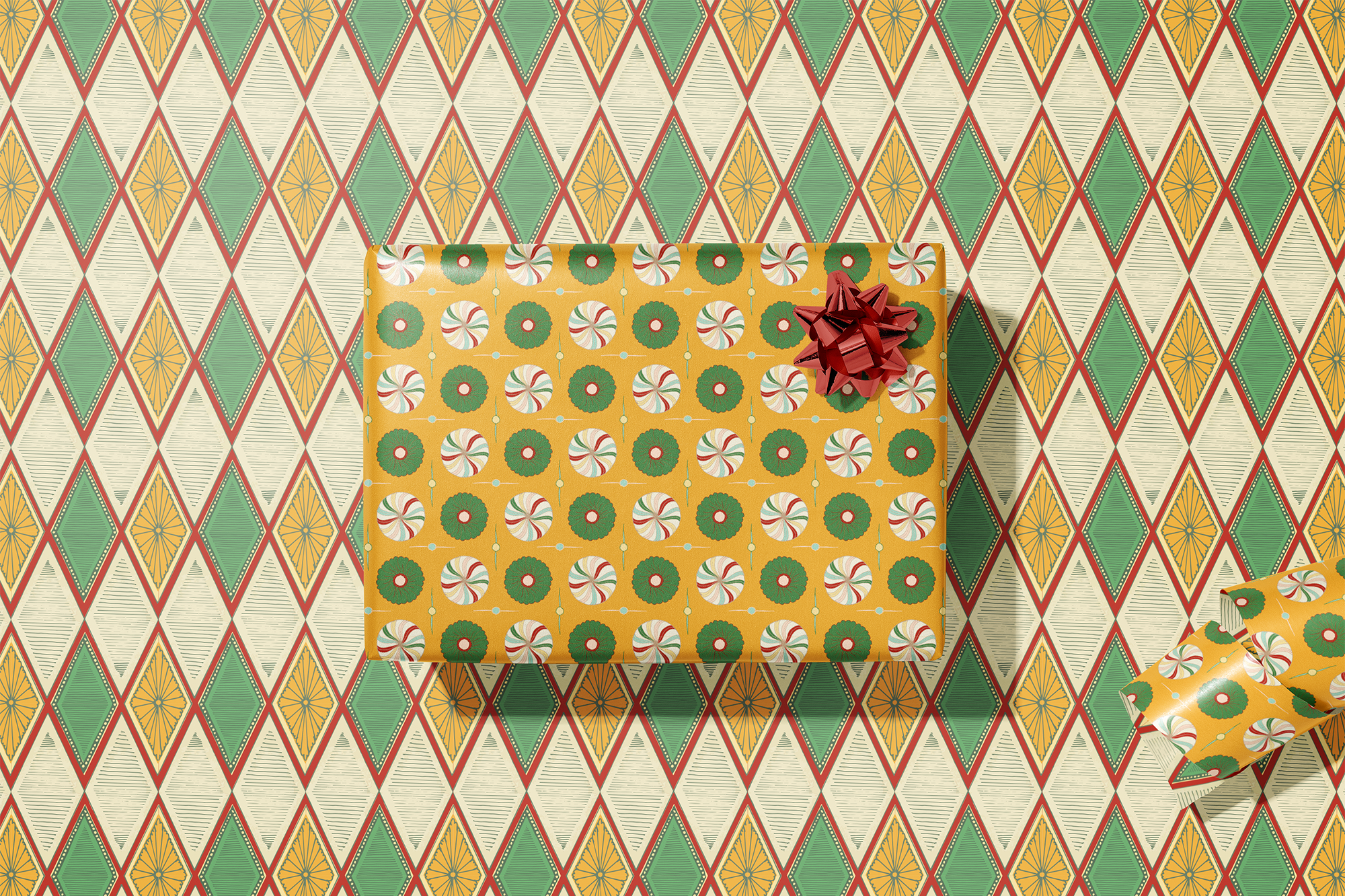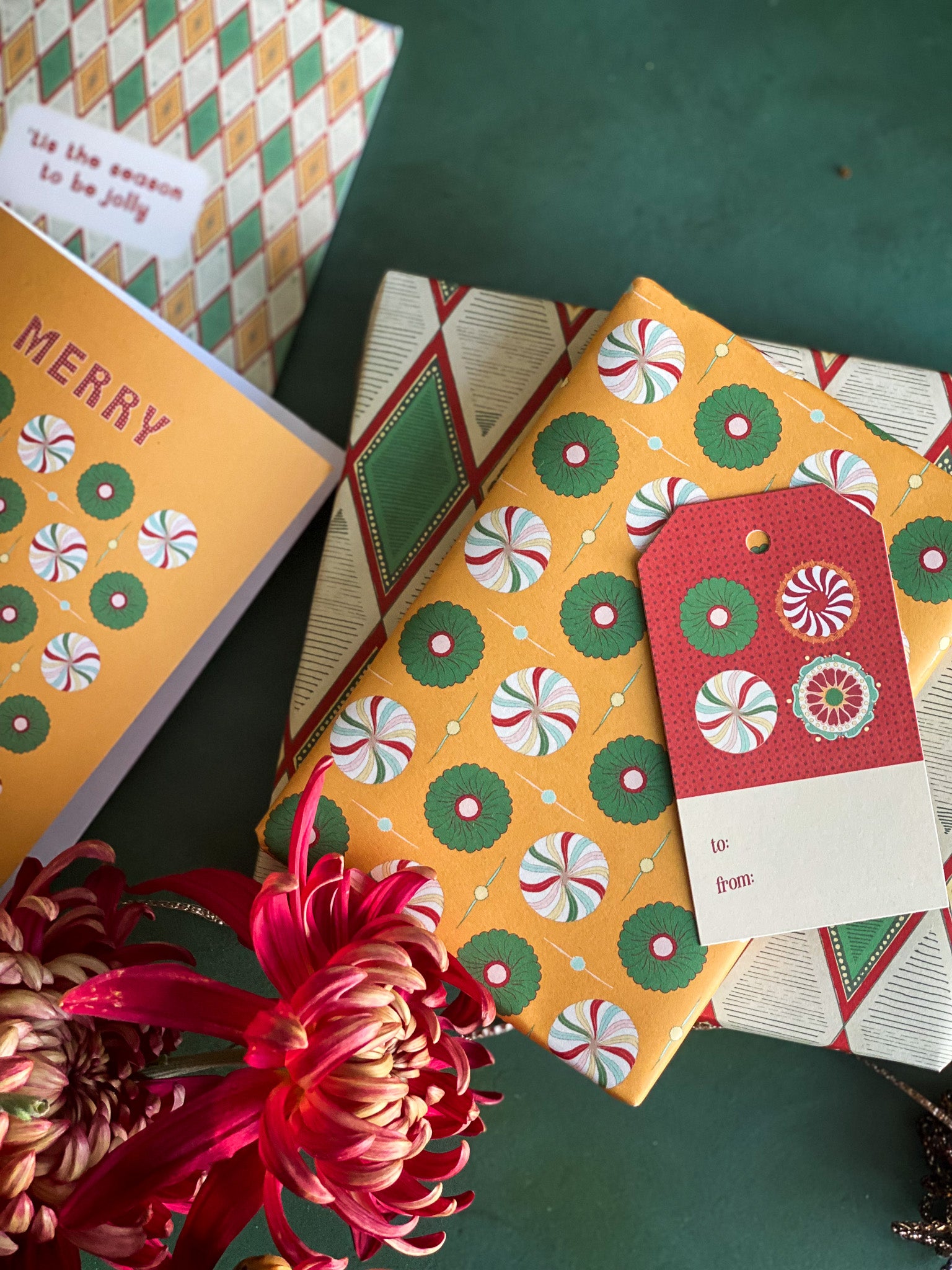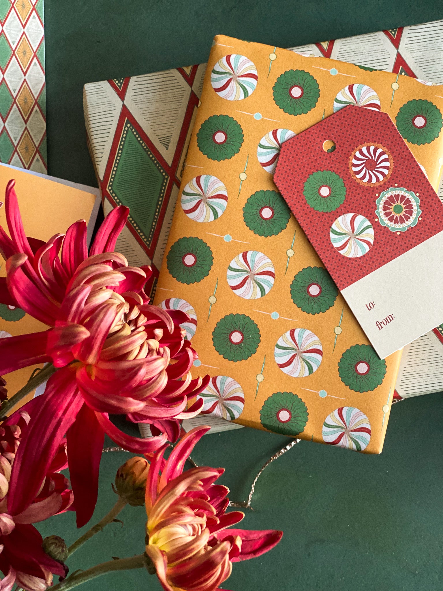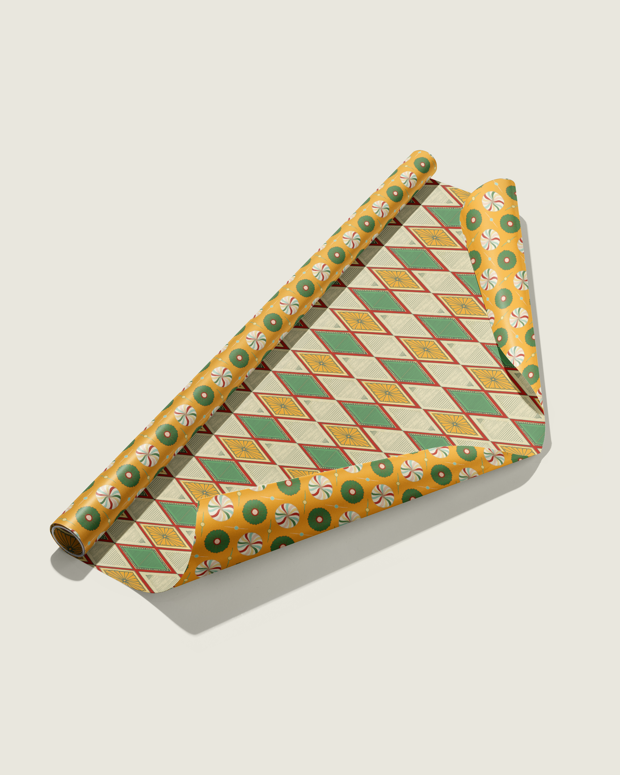 Step right up to a festive season filled with color and cheer with this double-sided wrapping paper featuring a pair of vintage carnival inspired designs. This gift wrap combines nostalgic motifs with playful patterns in a vibrant palette of peppermint reds, golden mustard, and vintage greens perfect for the holidays. Mix-and-match with the Holiday collection and stand out from the ordinary.
