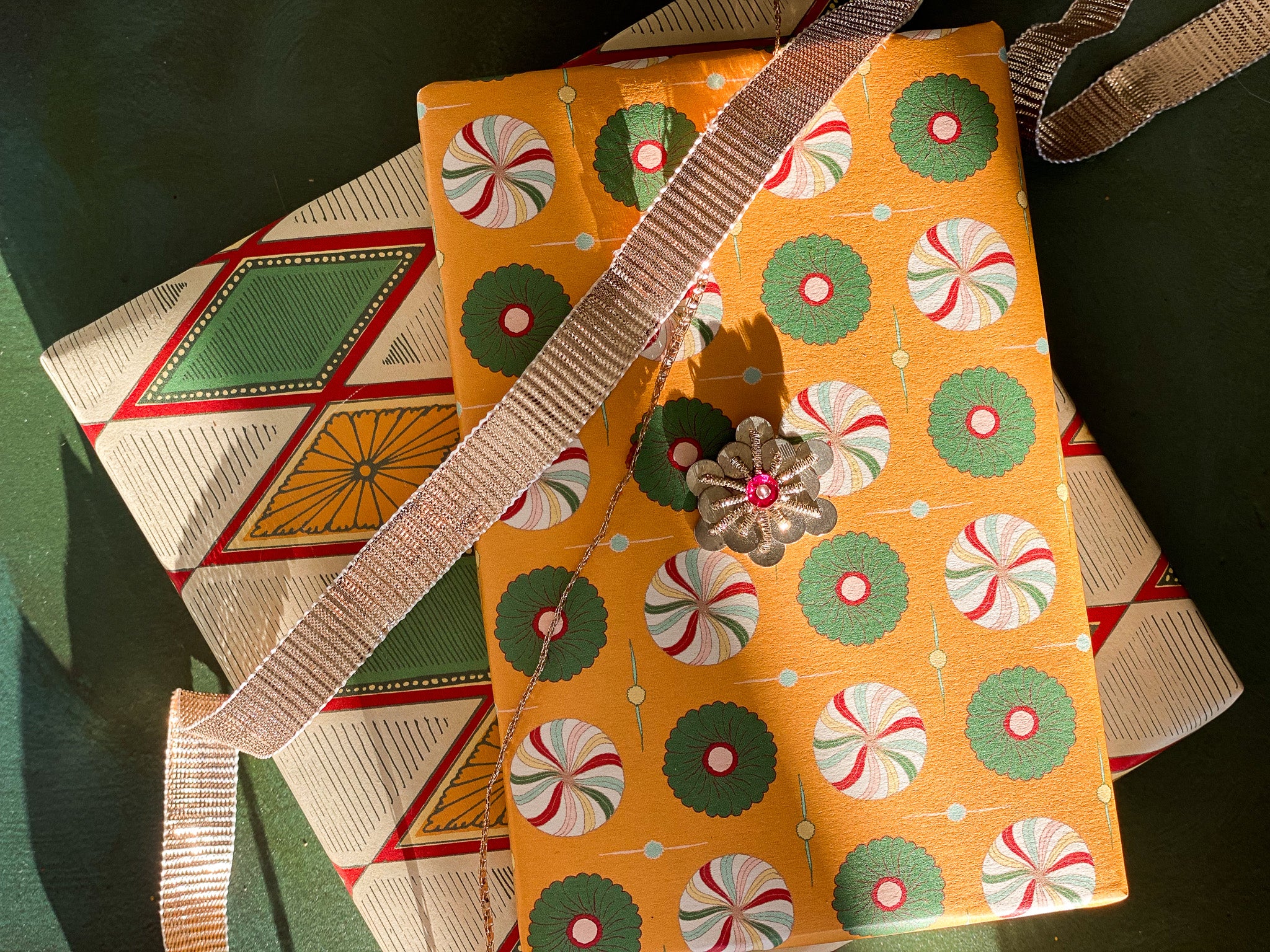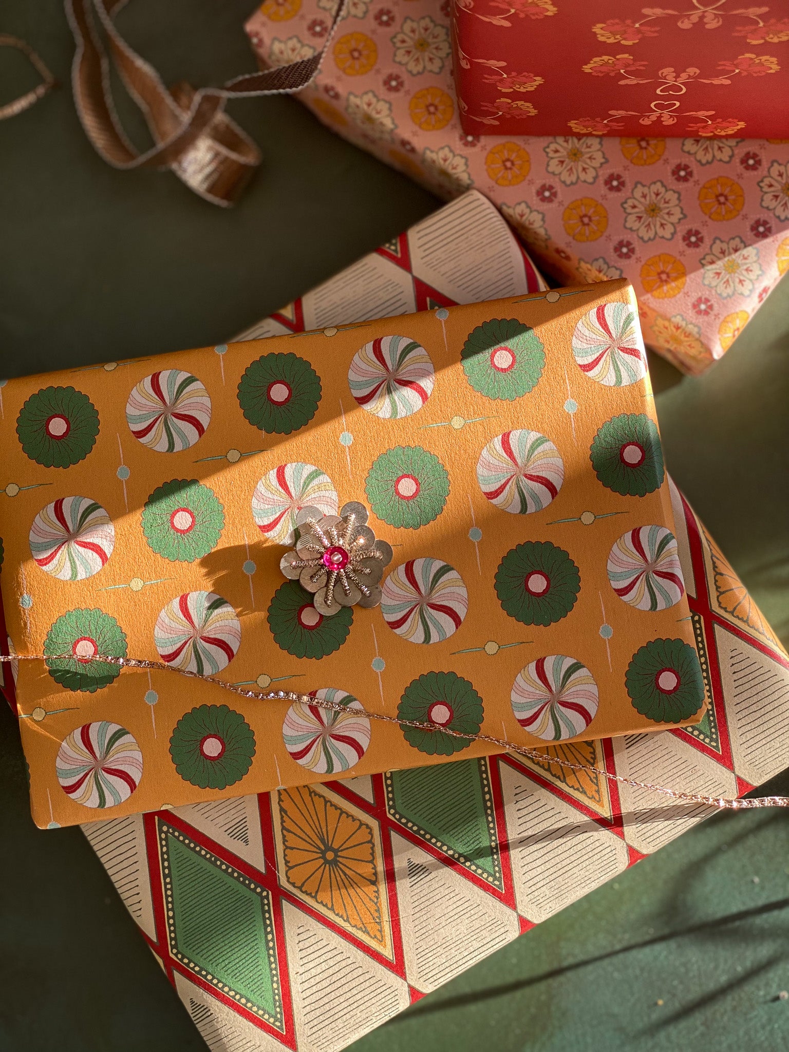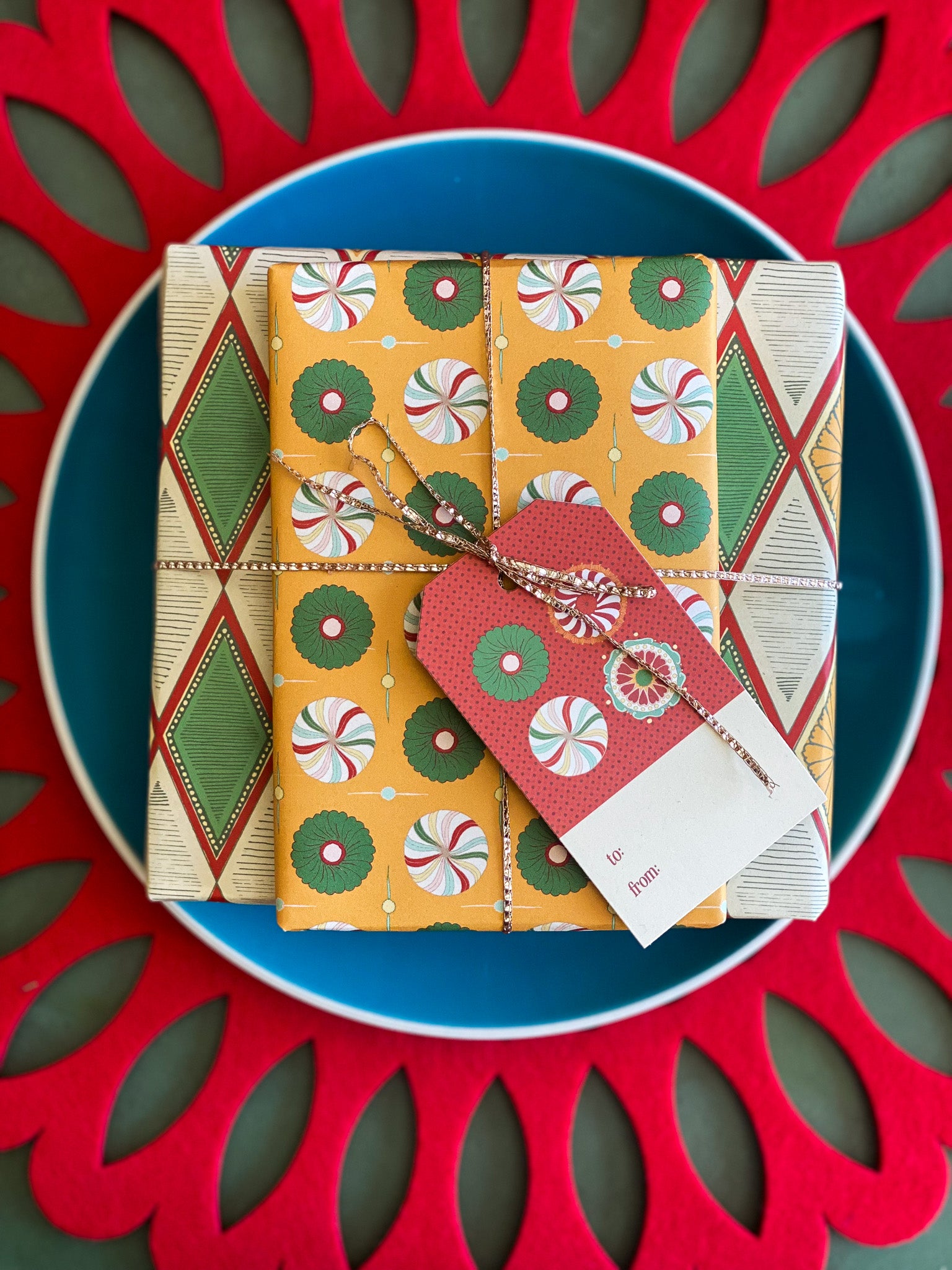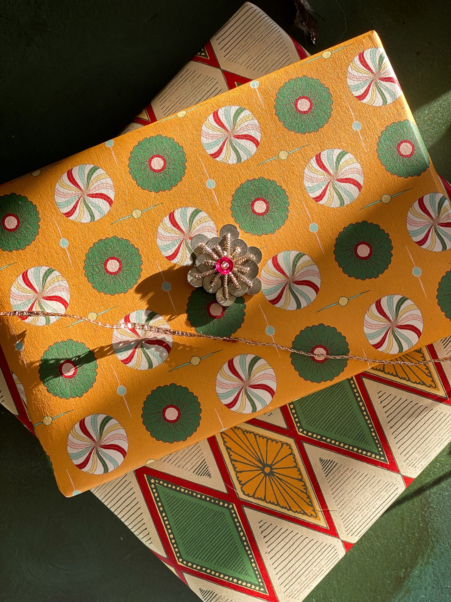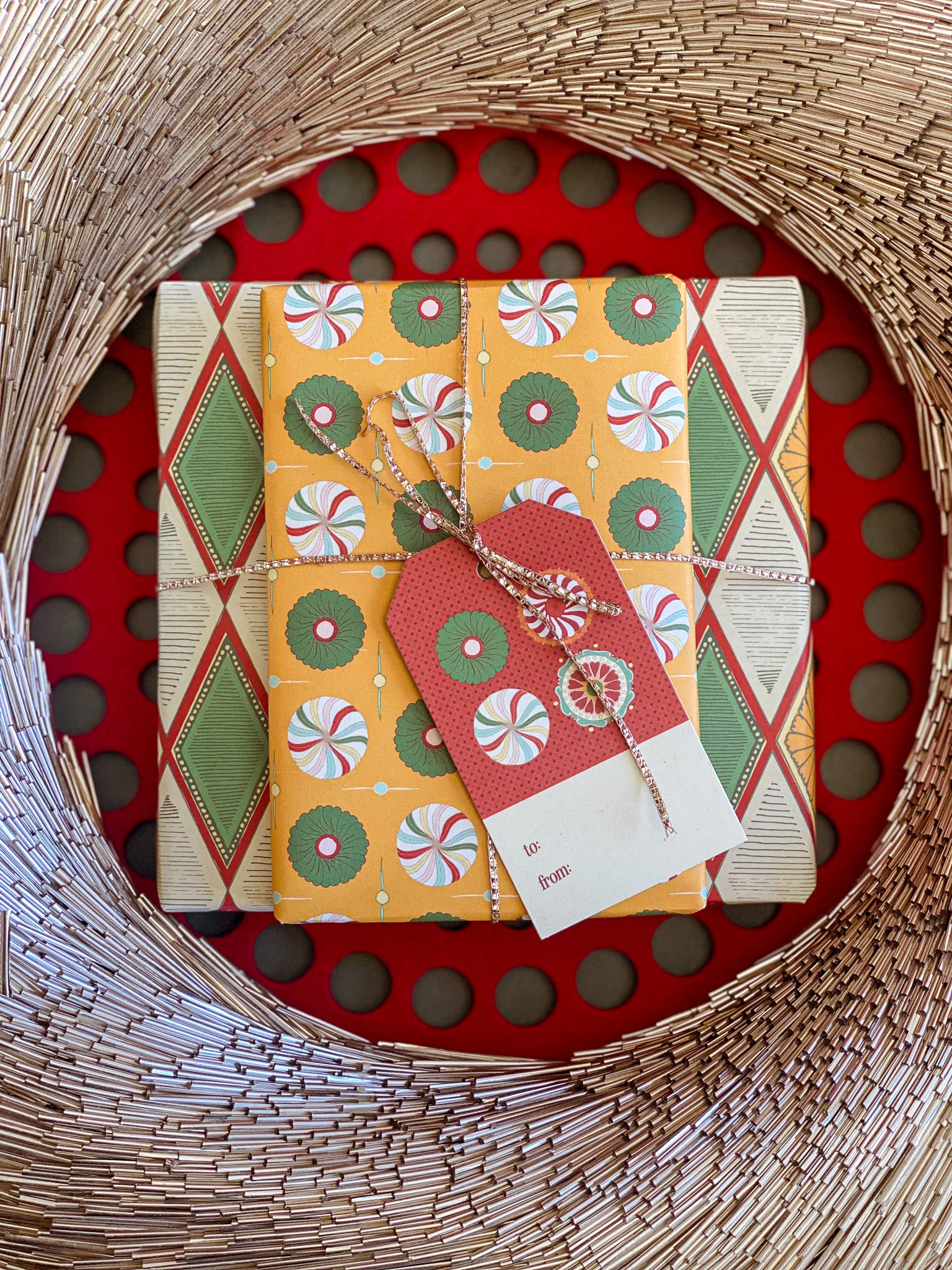 Step right up to a festive season filled with color and cheer with this double-sided wrapping paper featuring a pair of vintage carnival inspired designs. This gift wrap combines nostalgic motifs with playful patterns in a vibrant palette of peppermint reds, golden mustard, and vintage greens perfect for the holidays. Mix-and-match with the Holiday collection and stand out from the ordinary.