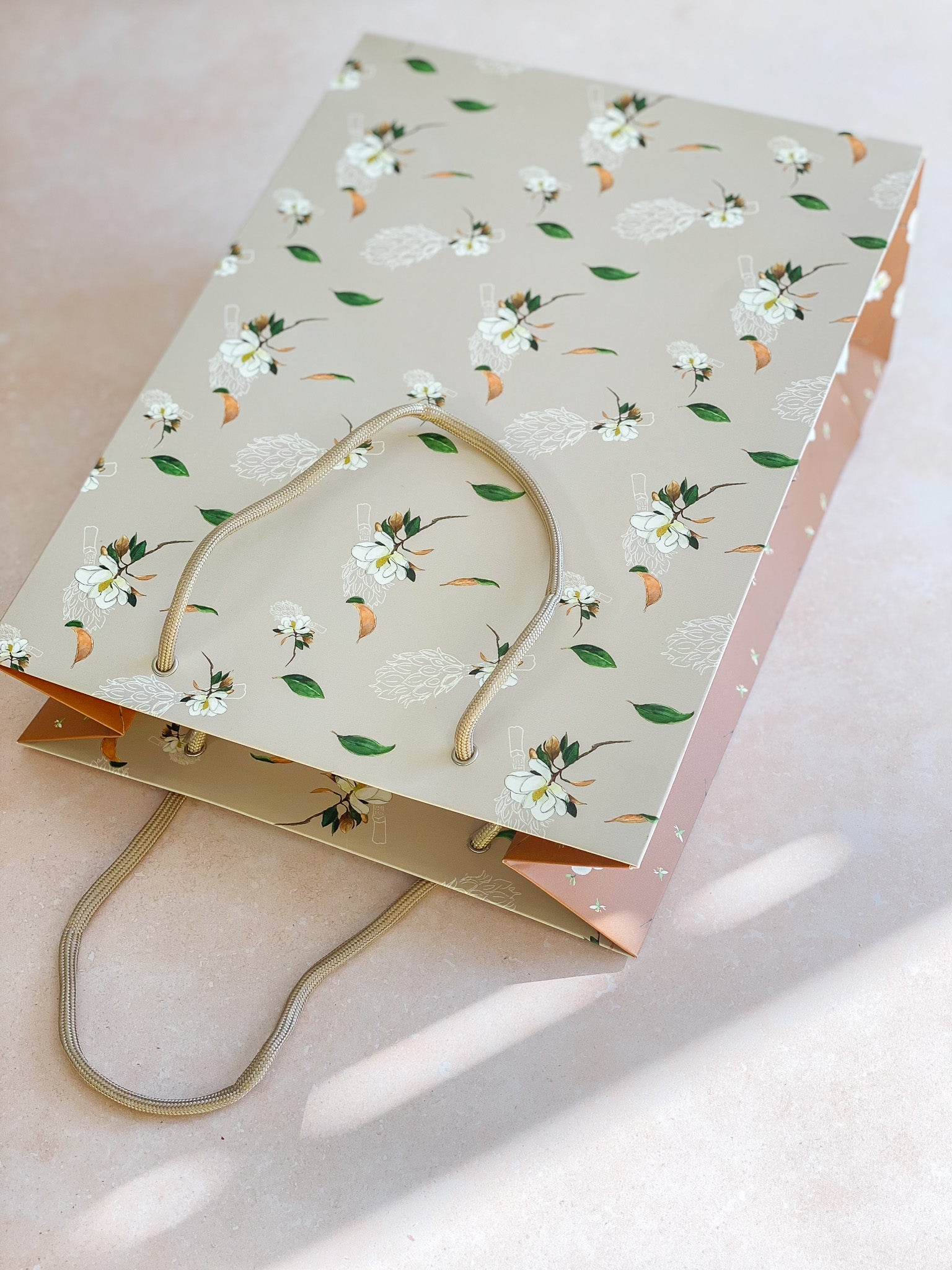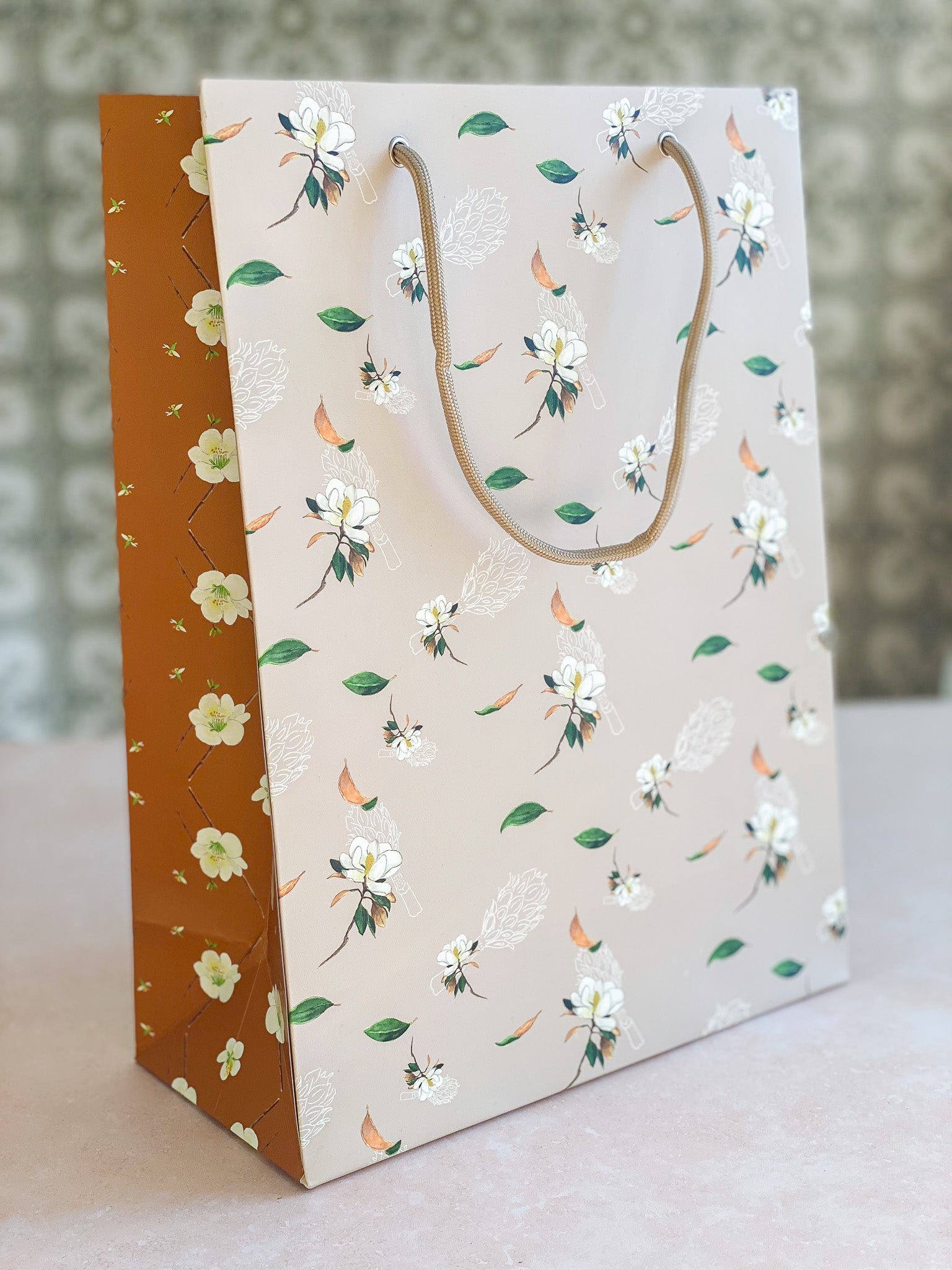 Make gift wrapping easy with the “Magnolia Blossoms” Gift Bag. Whether on it’s own or paired with our double-sided gift wrap, our premium gift bags will make for an extra special gifting presentation. Featuring a classic neutral and green watercolor and ink floral magnolia pattern accented by a deep golden quince blossom and branch on the gusseted sides and a tan braided handle. This bag will is ideal for bridal showers and wedding gifts, birthdays and baby showers, Mother's Day and celebrations throughout the year. Add a coordinating gift tag to the bag handle for a personal touch.