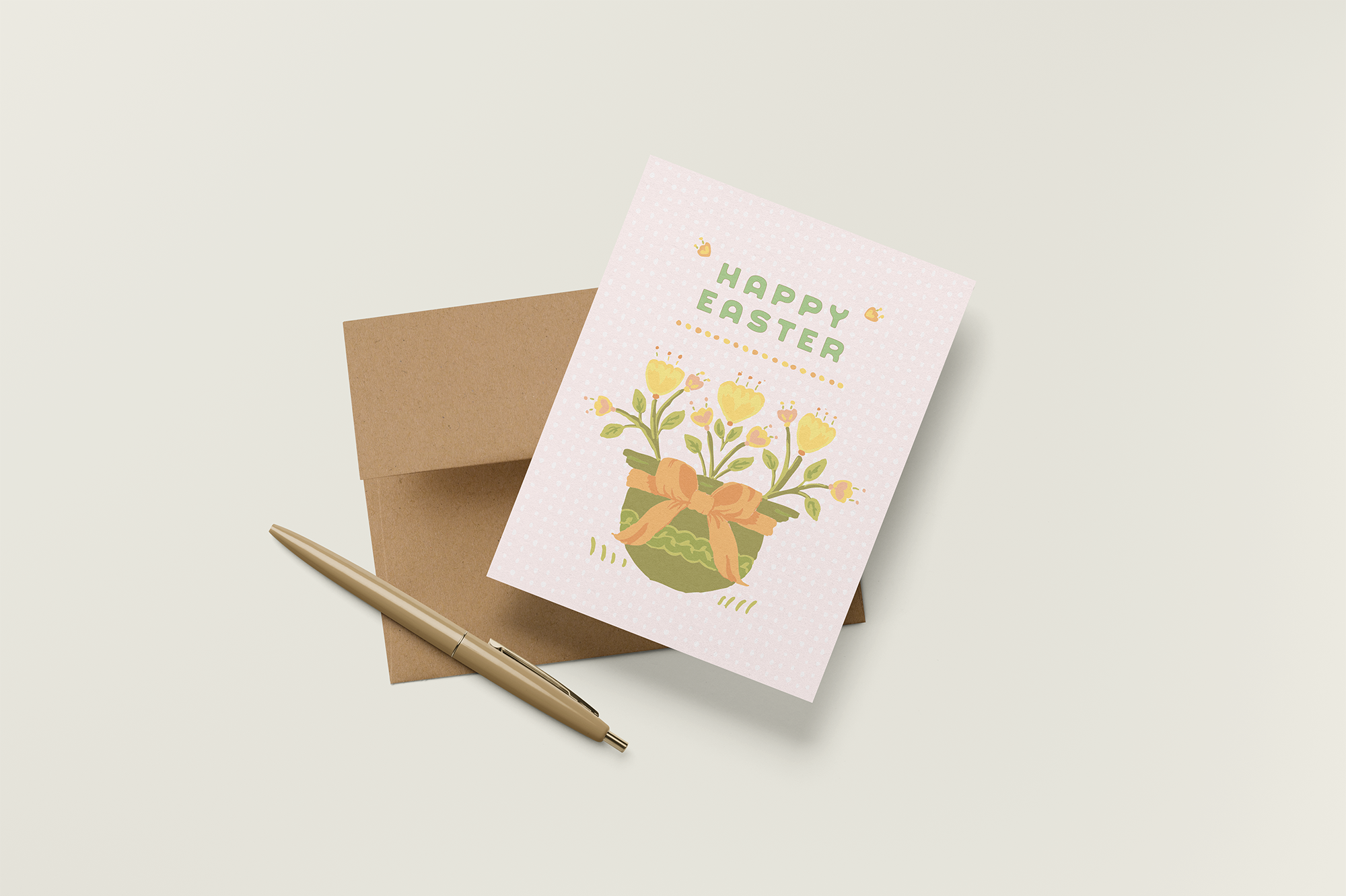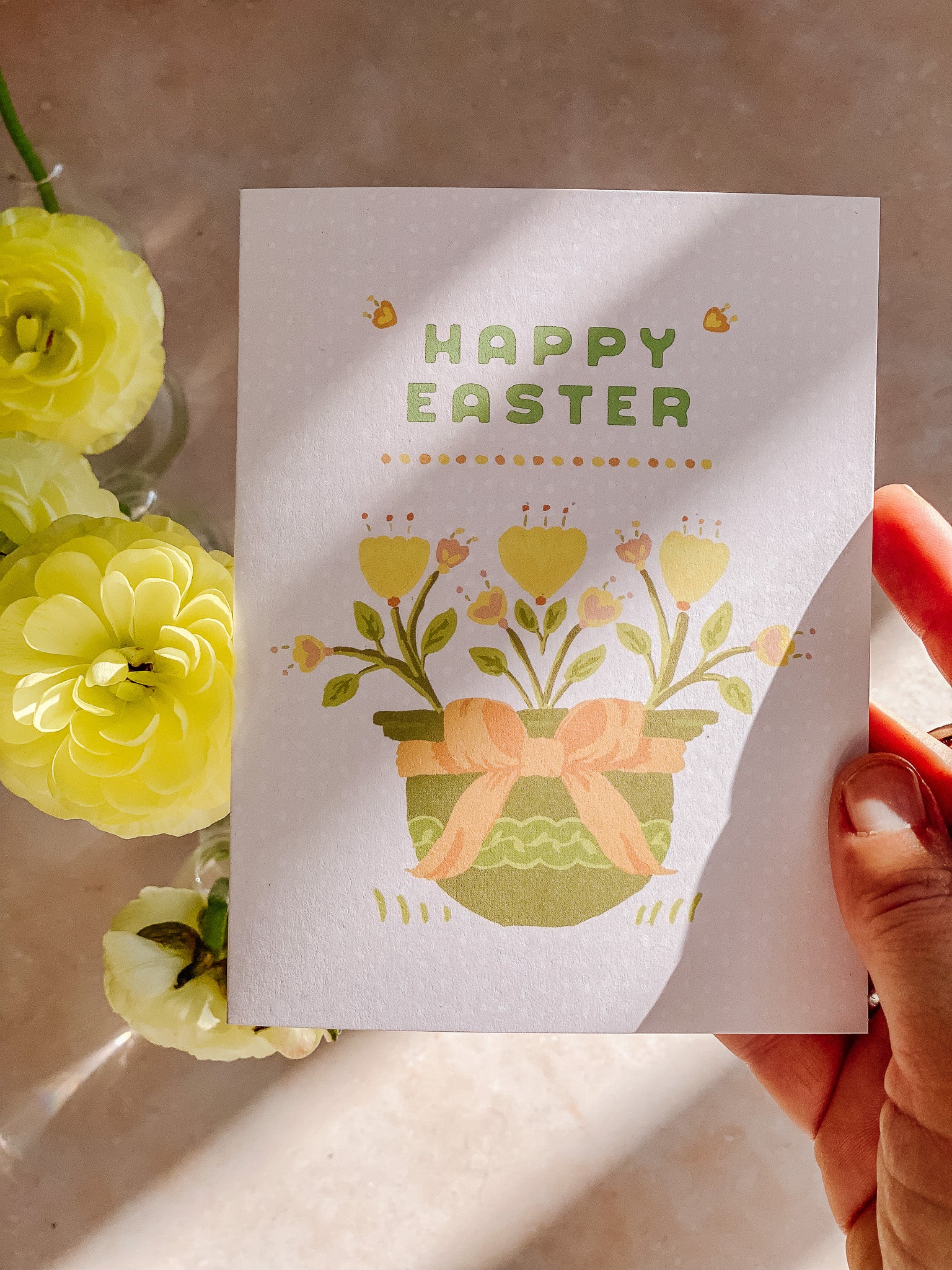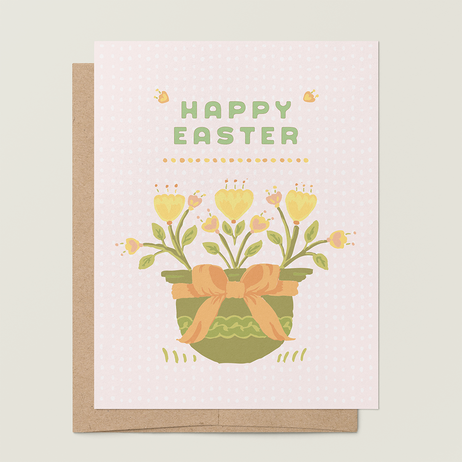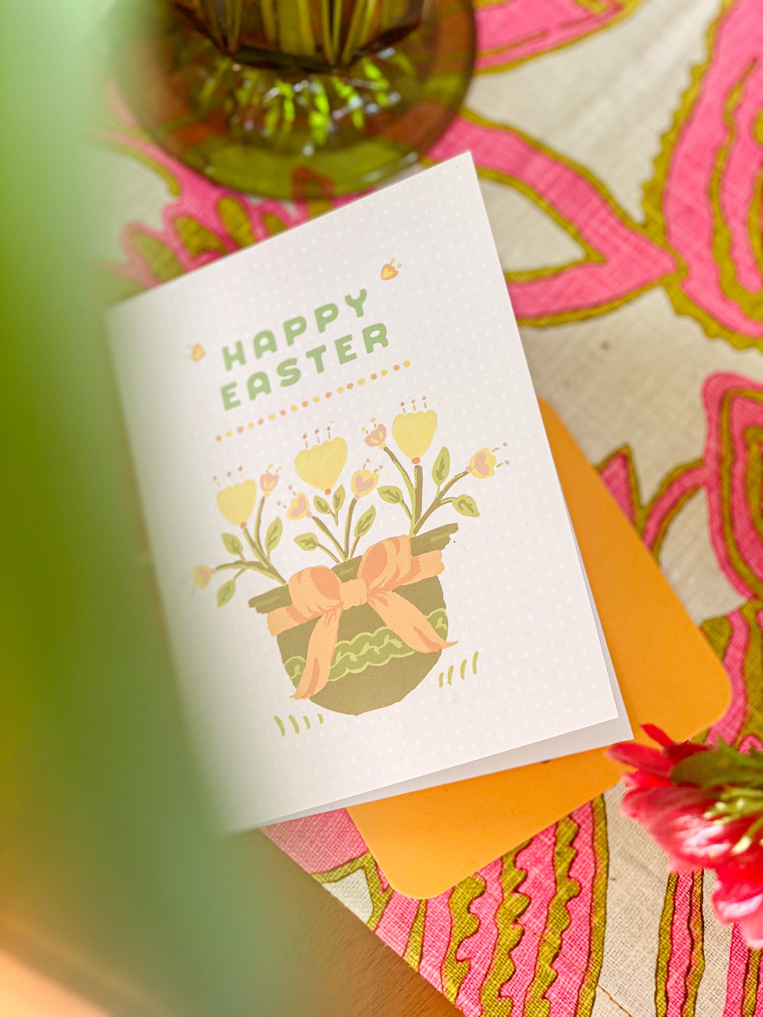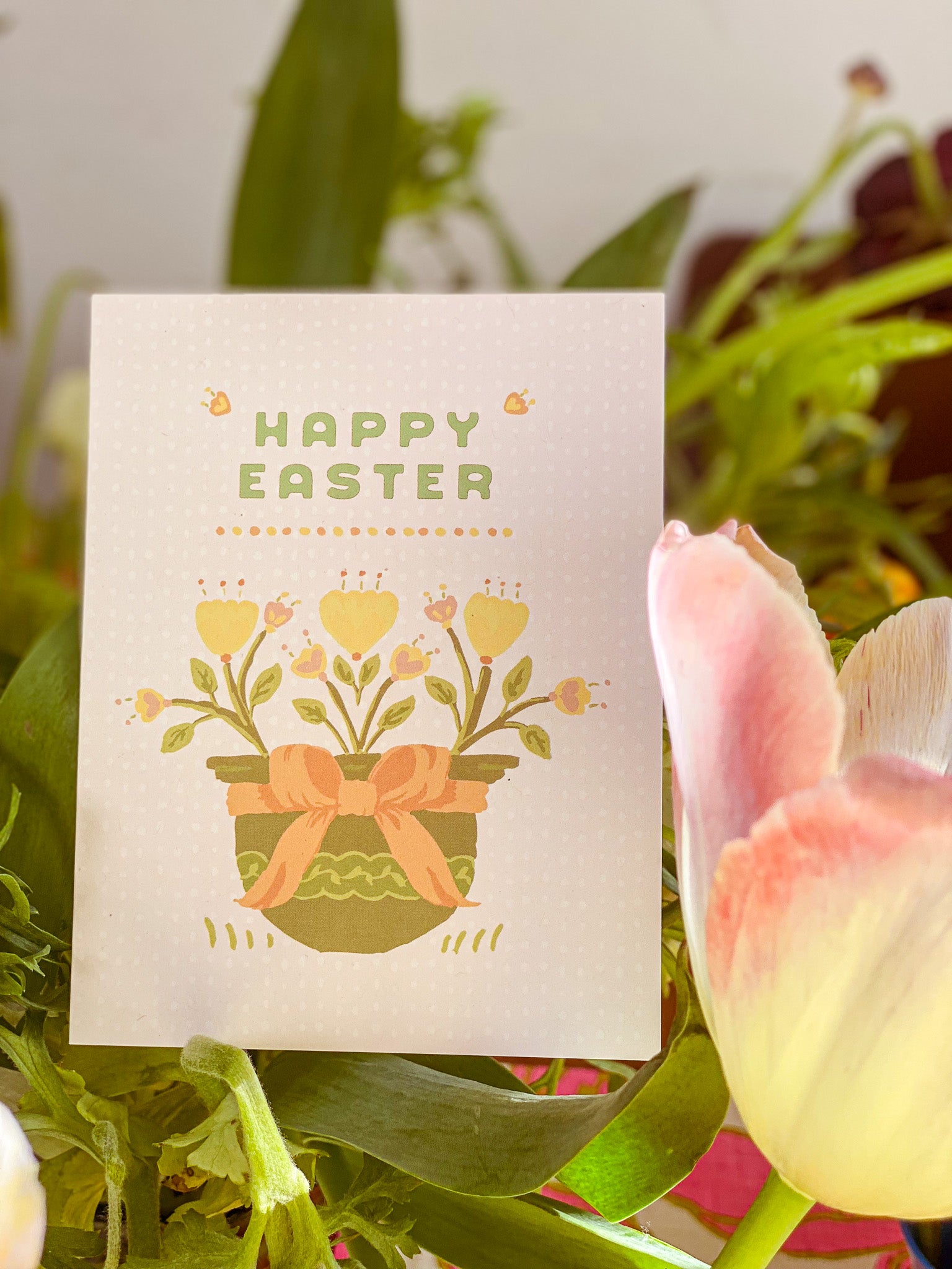 A2 folded notecard with an illustrated planter of tulips with a bow on a pink textured dot background and “Happy Easter” message on the front and a blank interior to personalize your own note. A sweet Easter card in pastel colors to represent Spring.