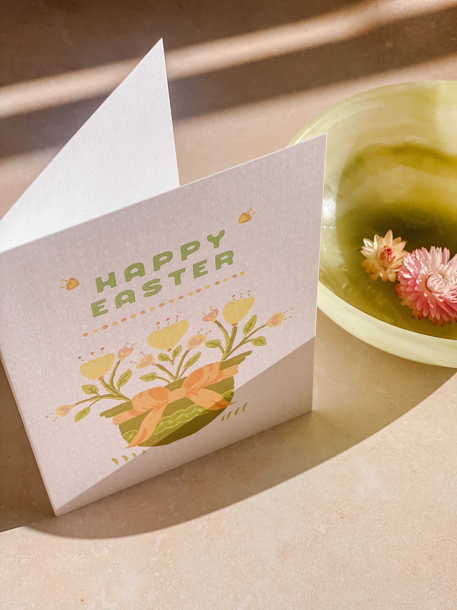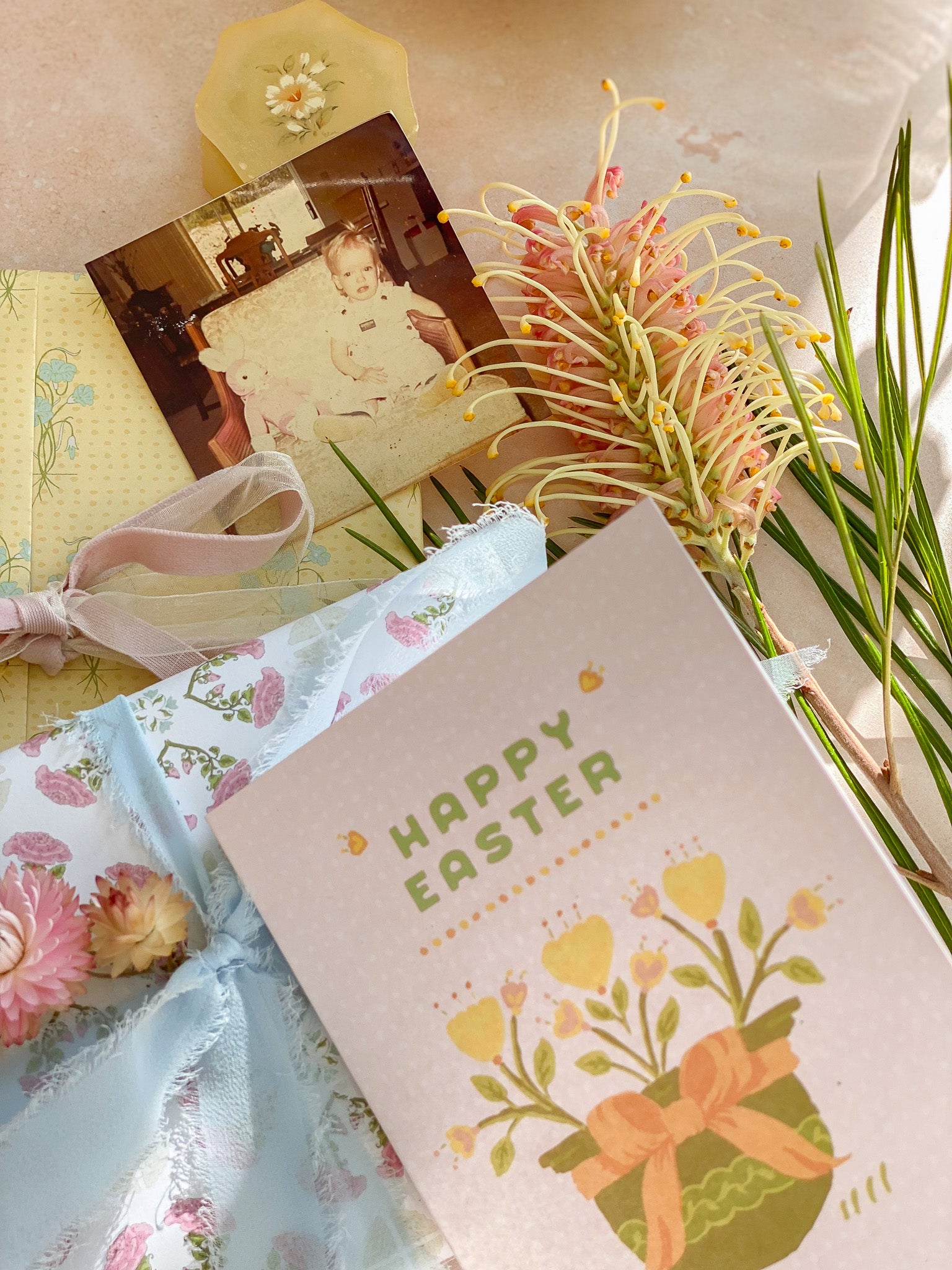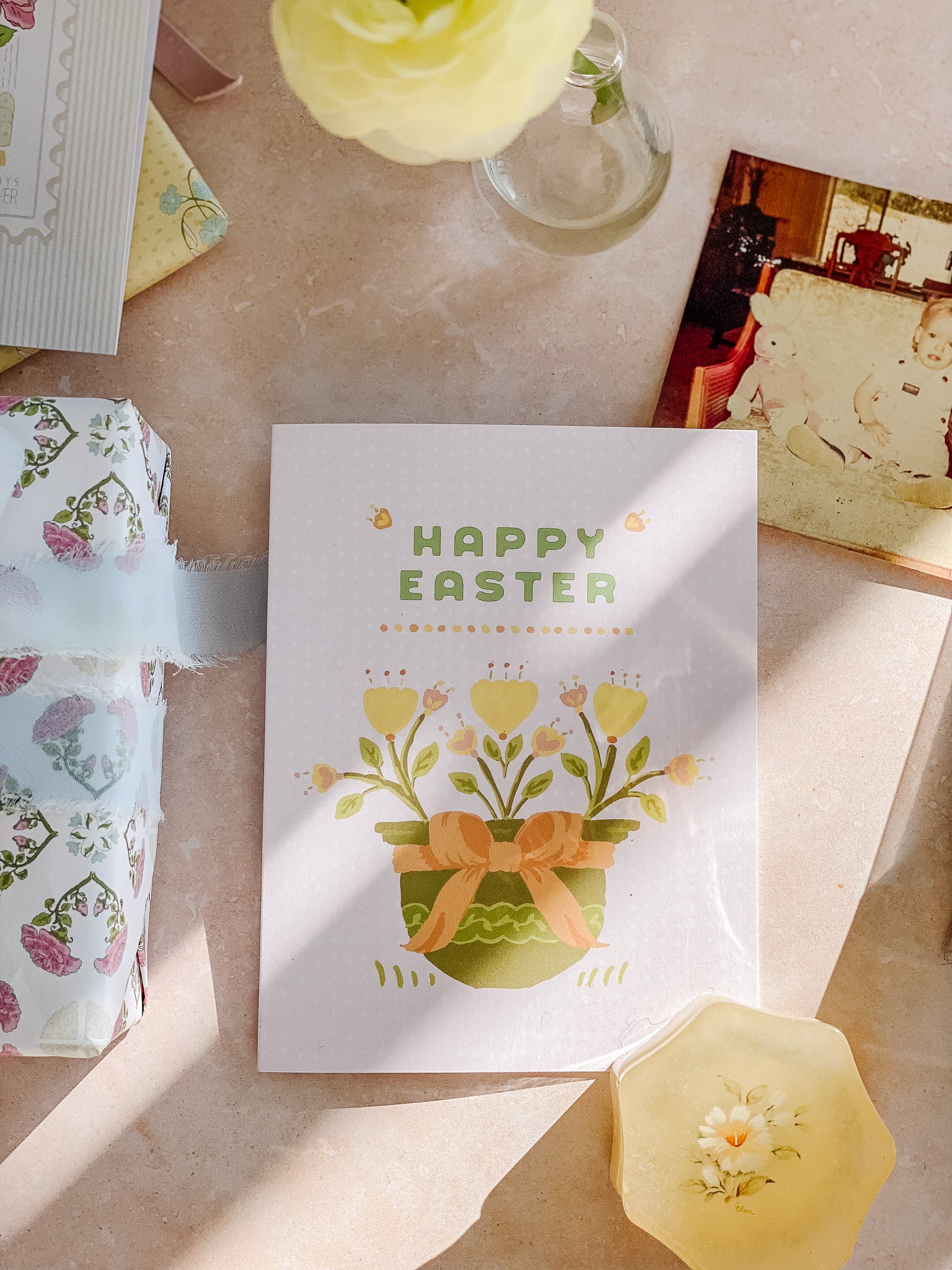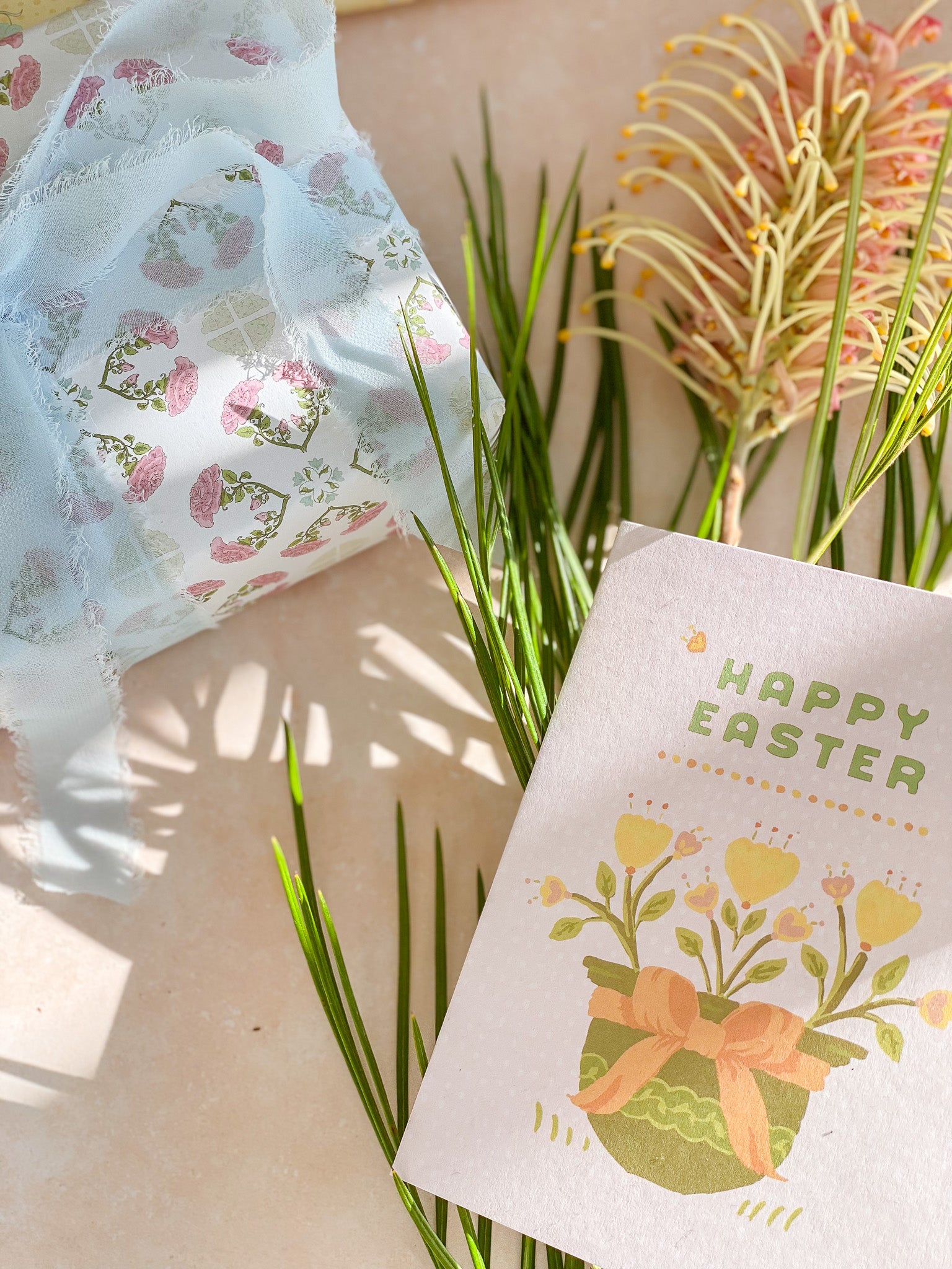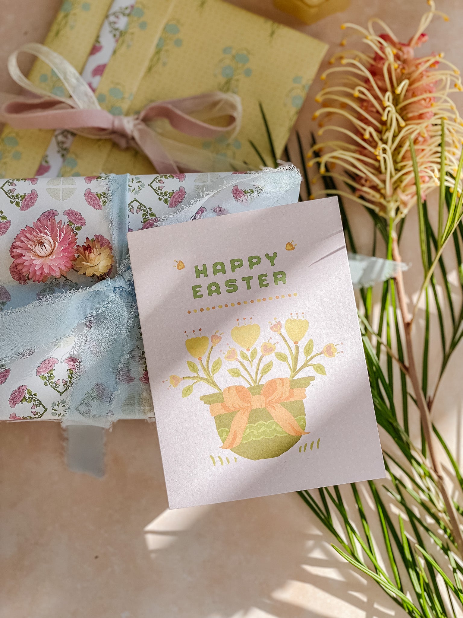 A2 folded notecard with an illustrated planter of tulips with a bow on a pink textured dot background and “Happy Easter” message on the front and a blank interior to personalize your own note. A sweet Easter card in pastel colors to represent Spring.
