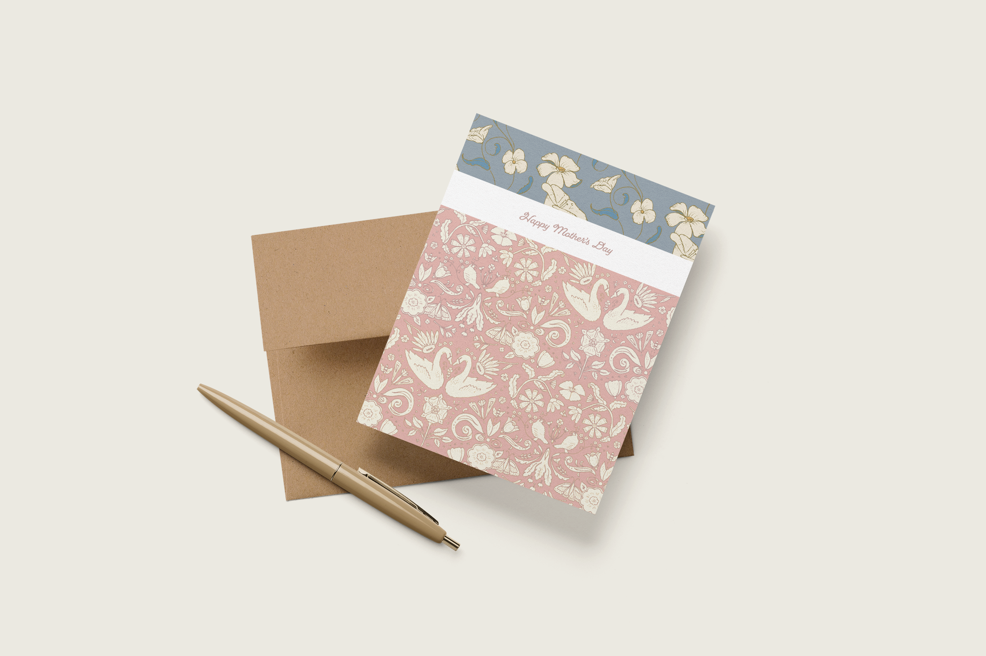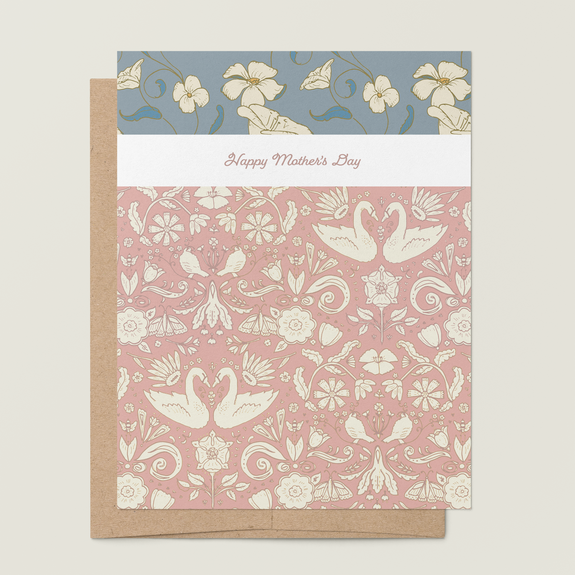 A2 notecard with “Happy Mother’s Day” message on the front of a pink and blue pairing of delicate and sweet floral and bird patterns with a blank interior to personalize your own note.