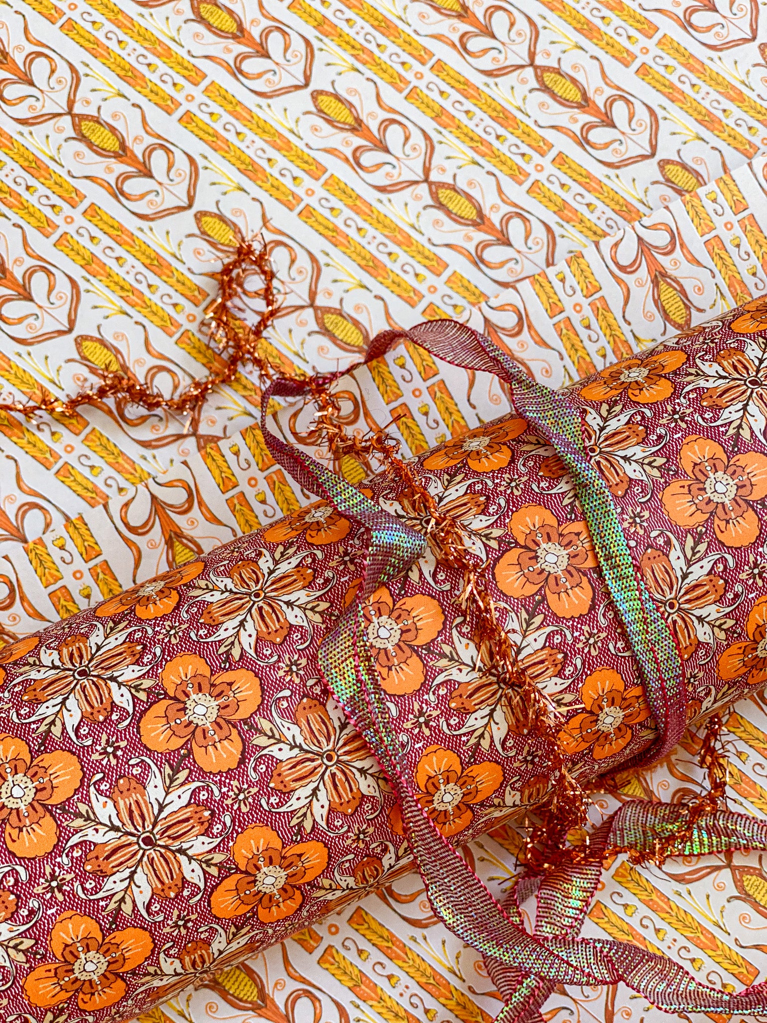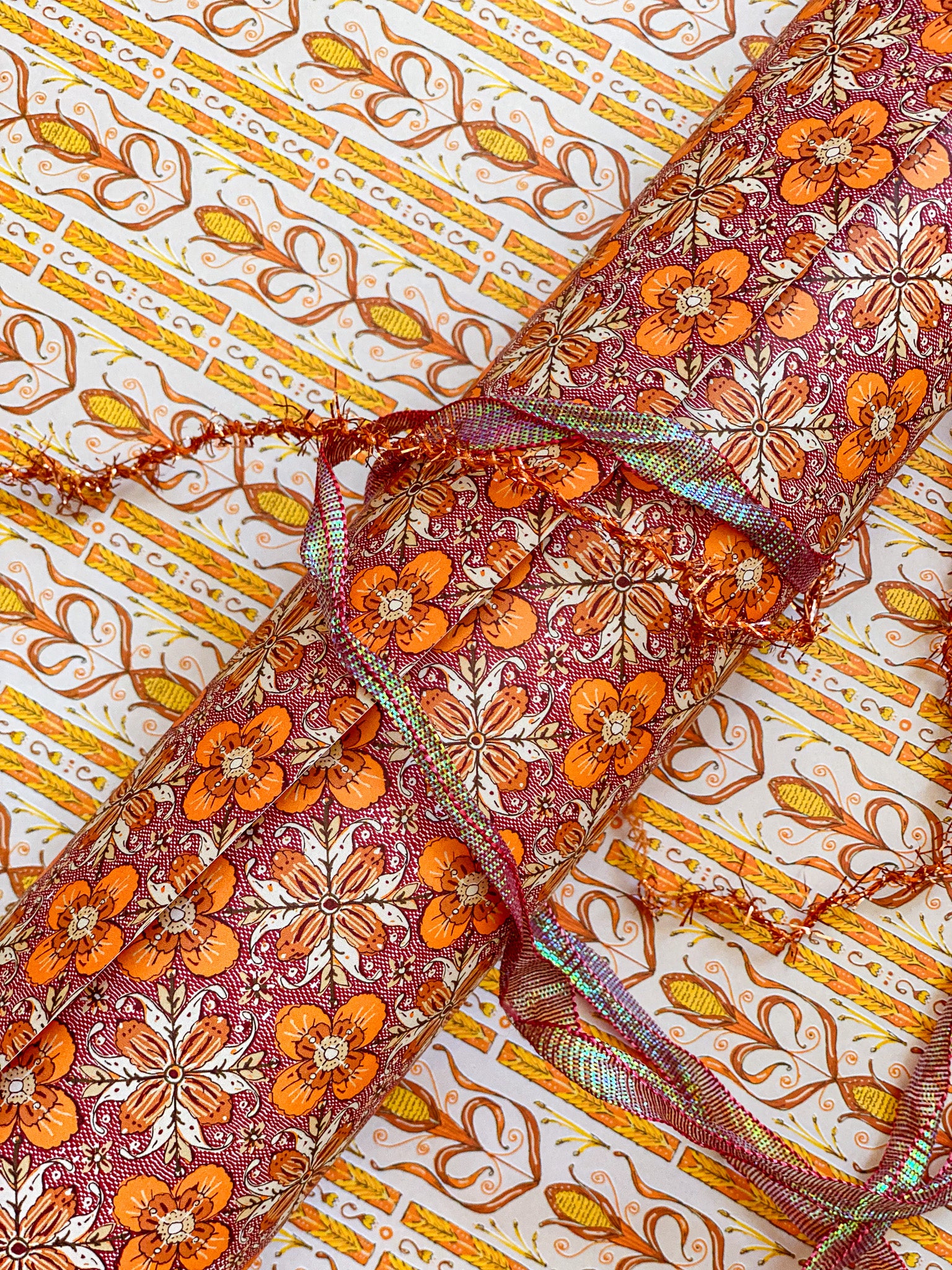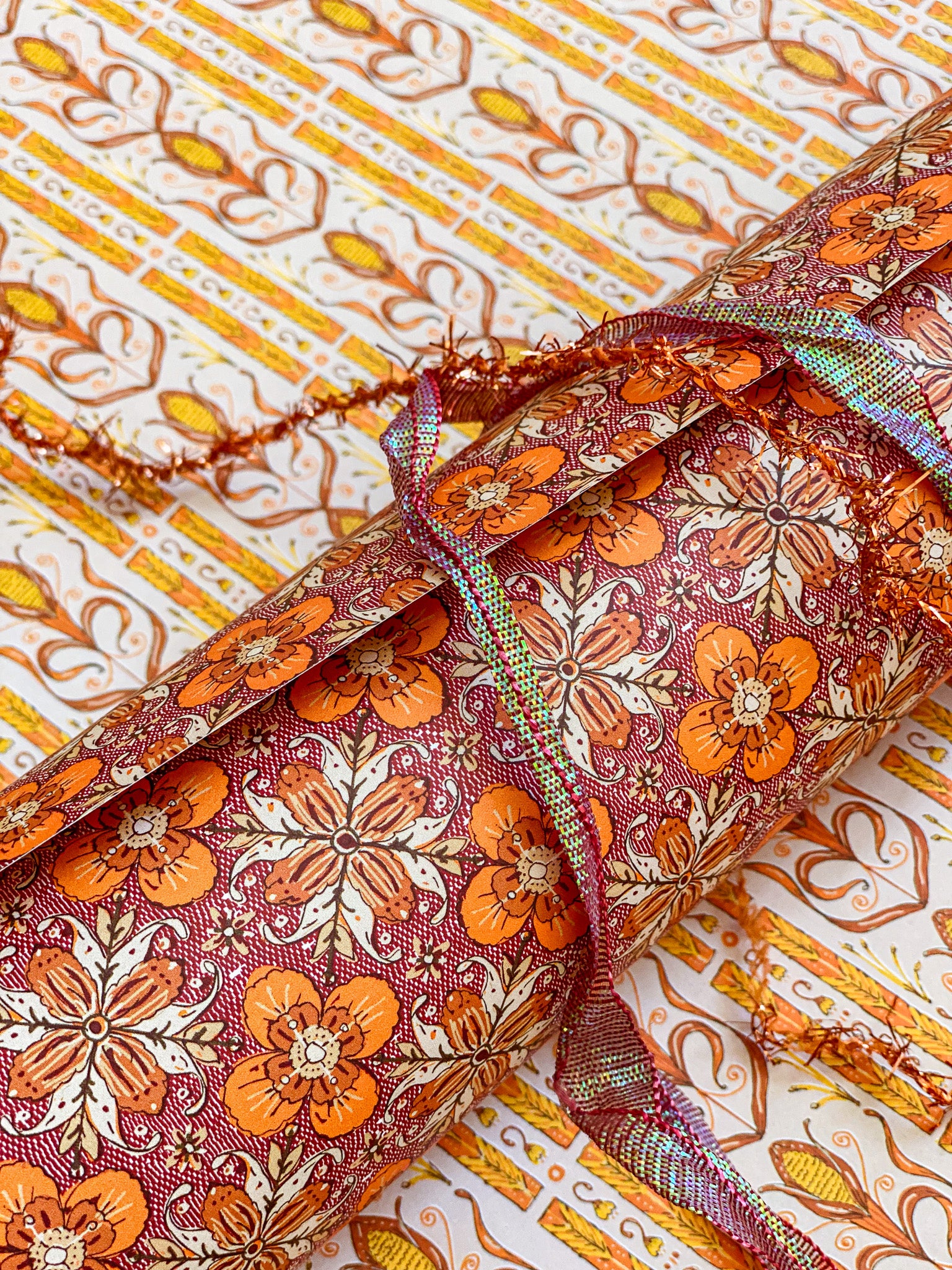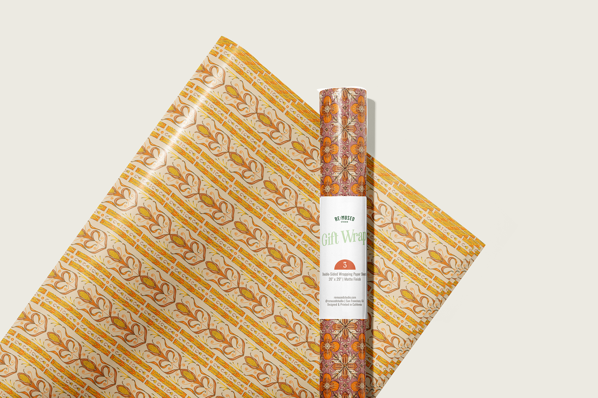 A bounty of autumn warmth and wonder packs this vintage-inspired double-sided gift wrap. Featuring a pair hand-illustrated botanical patterns in a palette of pumpkin orange, warm wheat, candied apple red and cornfield yellows and greens. One side features a nostalgic nouveau-esque corn stalk stripe motif reminiscent of parlor room wallpapers. The other side boasts a textured fall floral tile pattern, both ready to take you through the fall harvest season into Thanksgiving festivities.