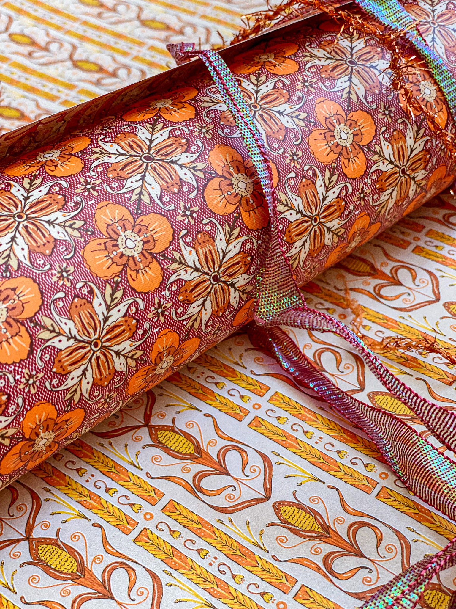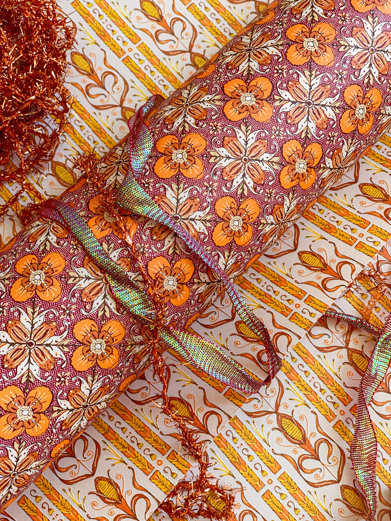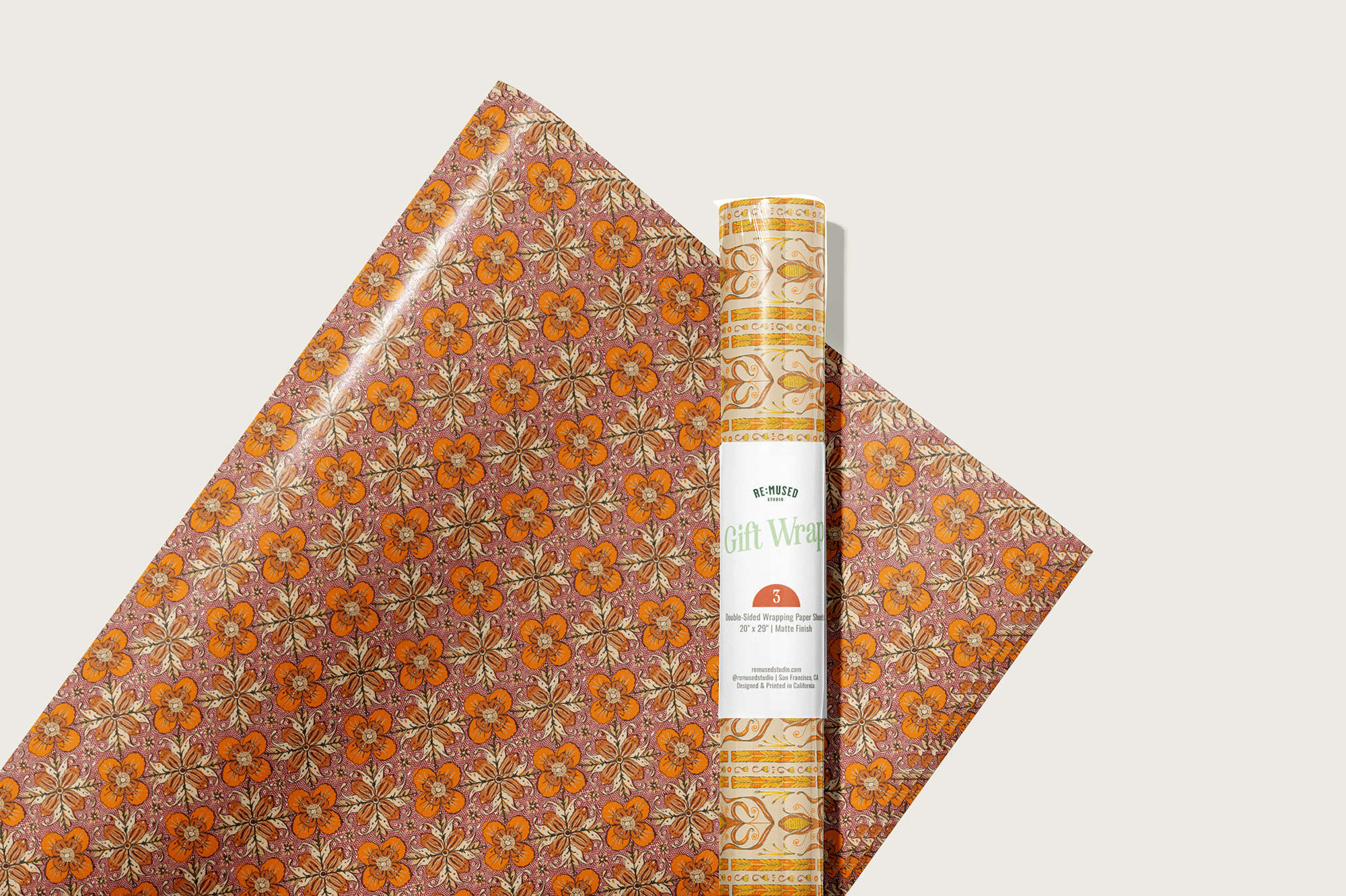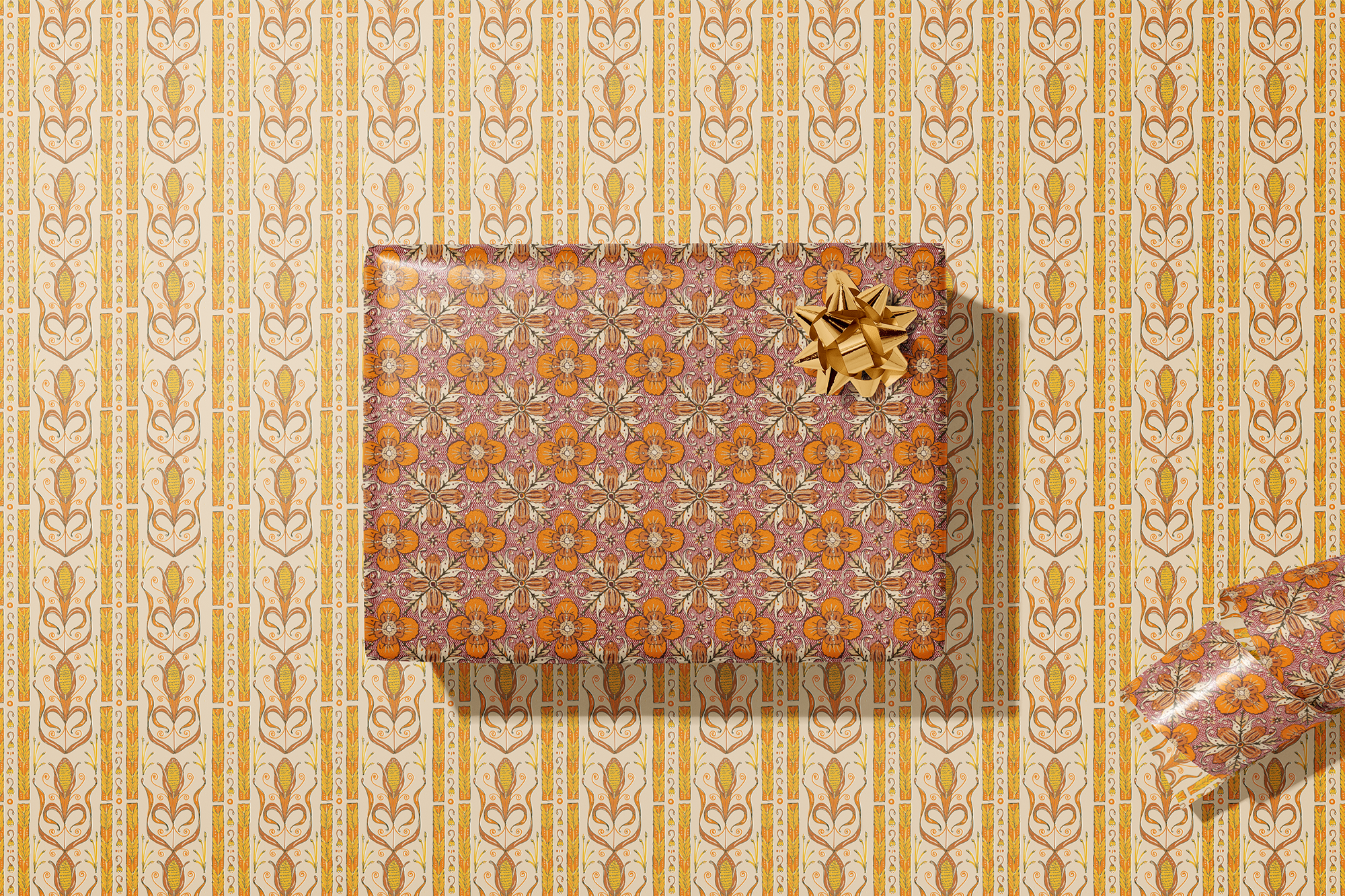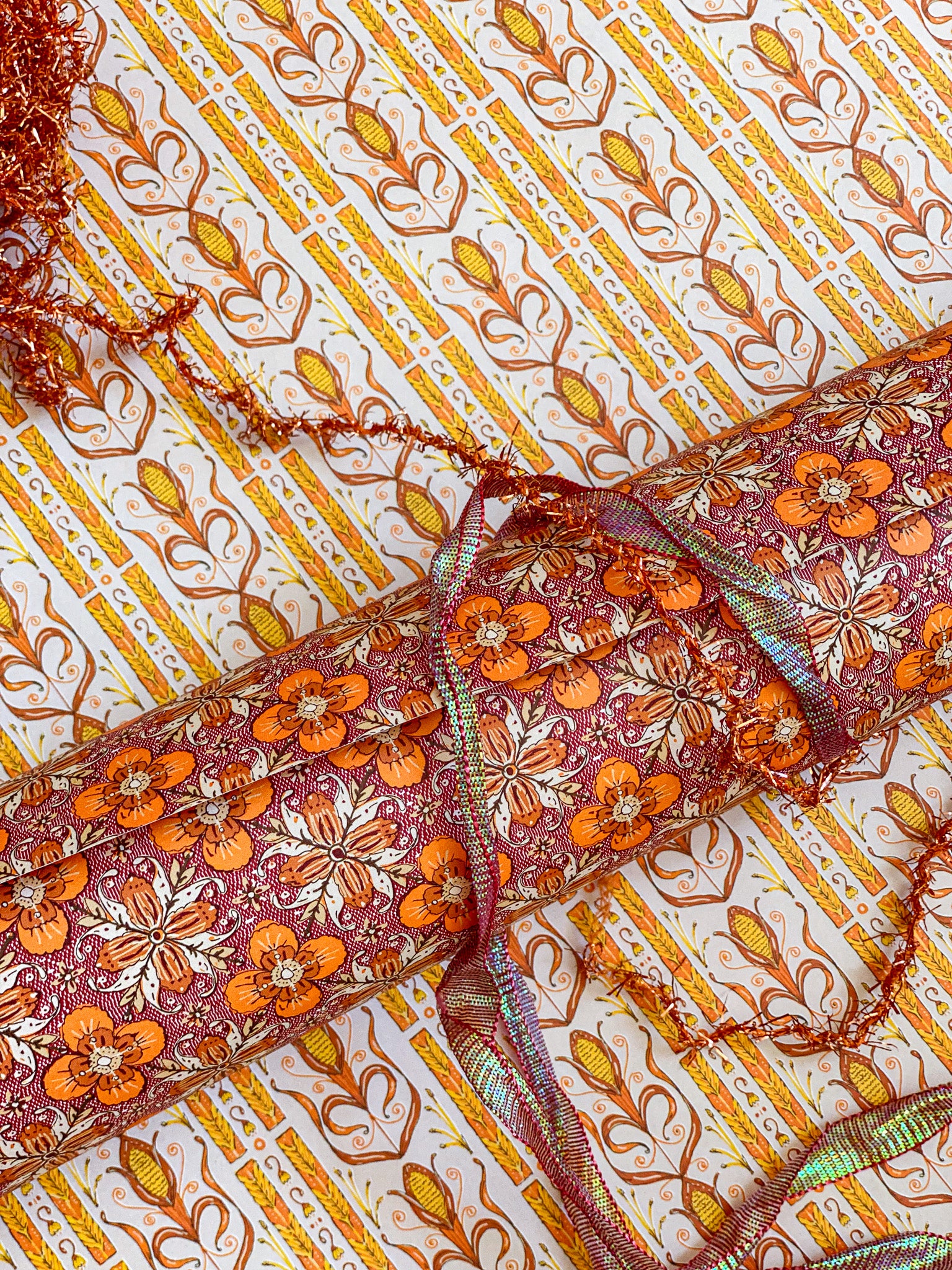 A bounty of autumn warmth and wonder packs this vintage-inspired double-sided gift wrap. Featuring a pair hand-illustrated botanical patterns in a palette of pumpkin orange, warm wheat, candied apple red and cornfield yellows and greens. One side features a nostalgic nouveau-esque corn stalk stripe motif reminiscent of parlor room wallpapers. The other side boasts a textured fall floral tile pattern, both ready to take you through the fall harvest season into Thanksgiving festivities.