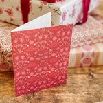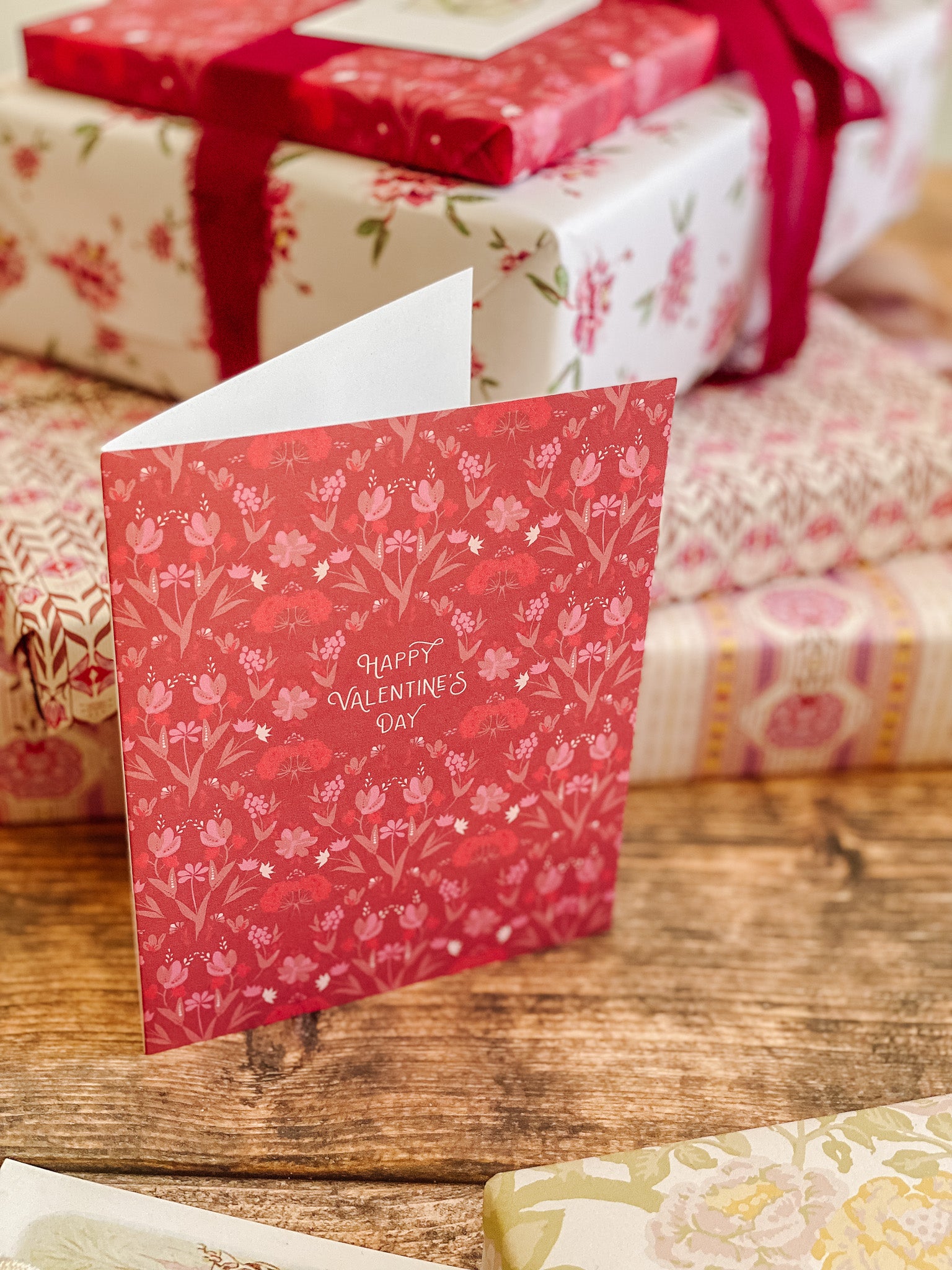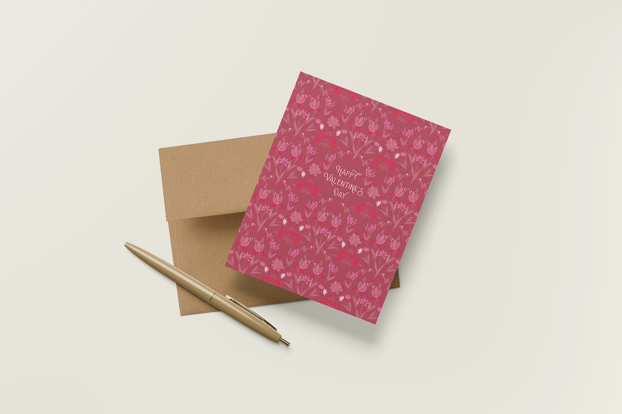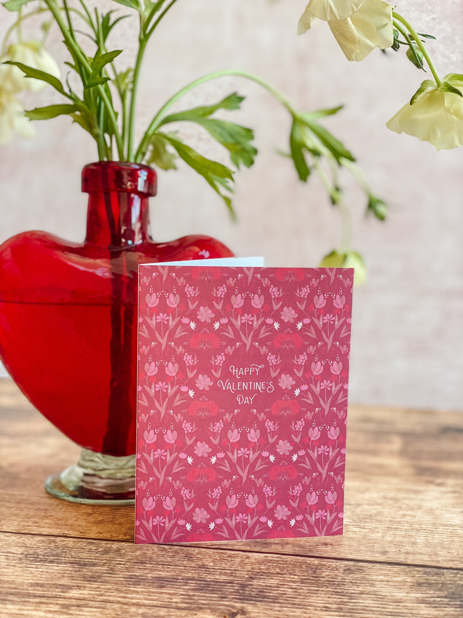Raspberry Valentines features an allover botanical pattern in deep raspberry, blush, and soft pink tones, creating a card that feels lush, expressive, and quietly romantic. Inspired by Ukranian folk florals and decorative motifs, this design offers a heartfelt Valentine’s message with a timeless, artful sensibility.