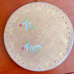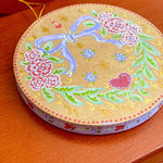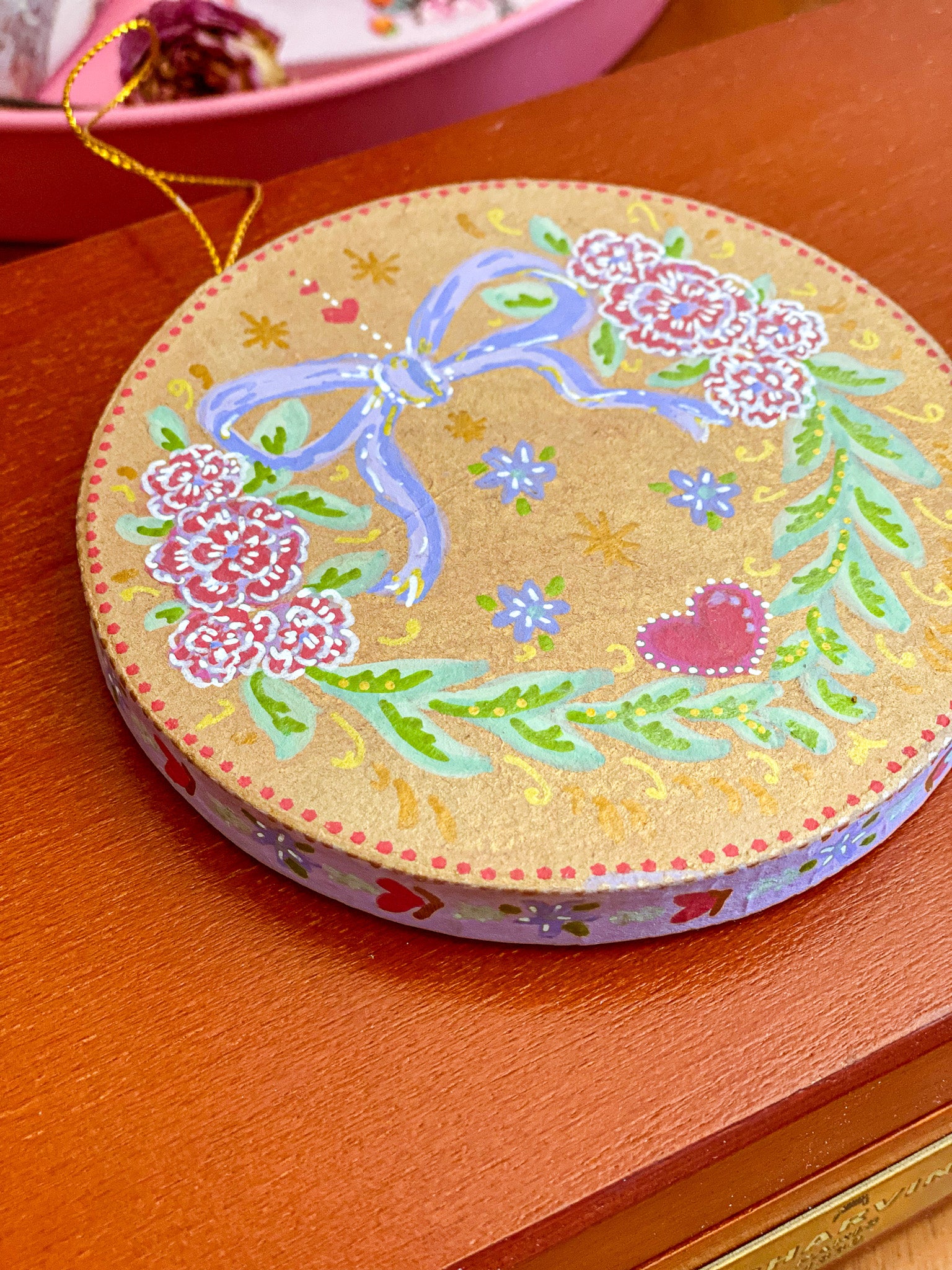 A vintage heart shaped rose and bow motif inspired by Victorian Valentines and folk art traditions bring hand-painted charm and shimmering metallic touches to this sweet gift.