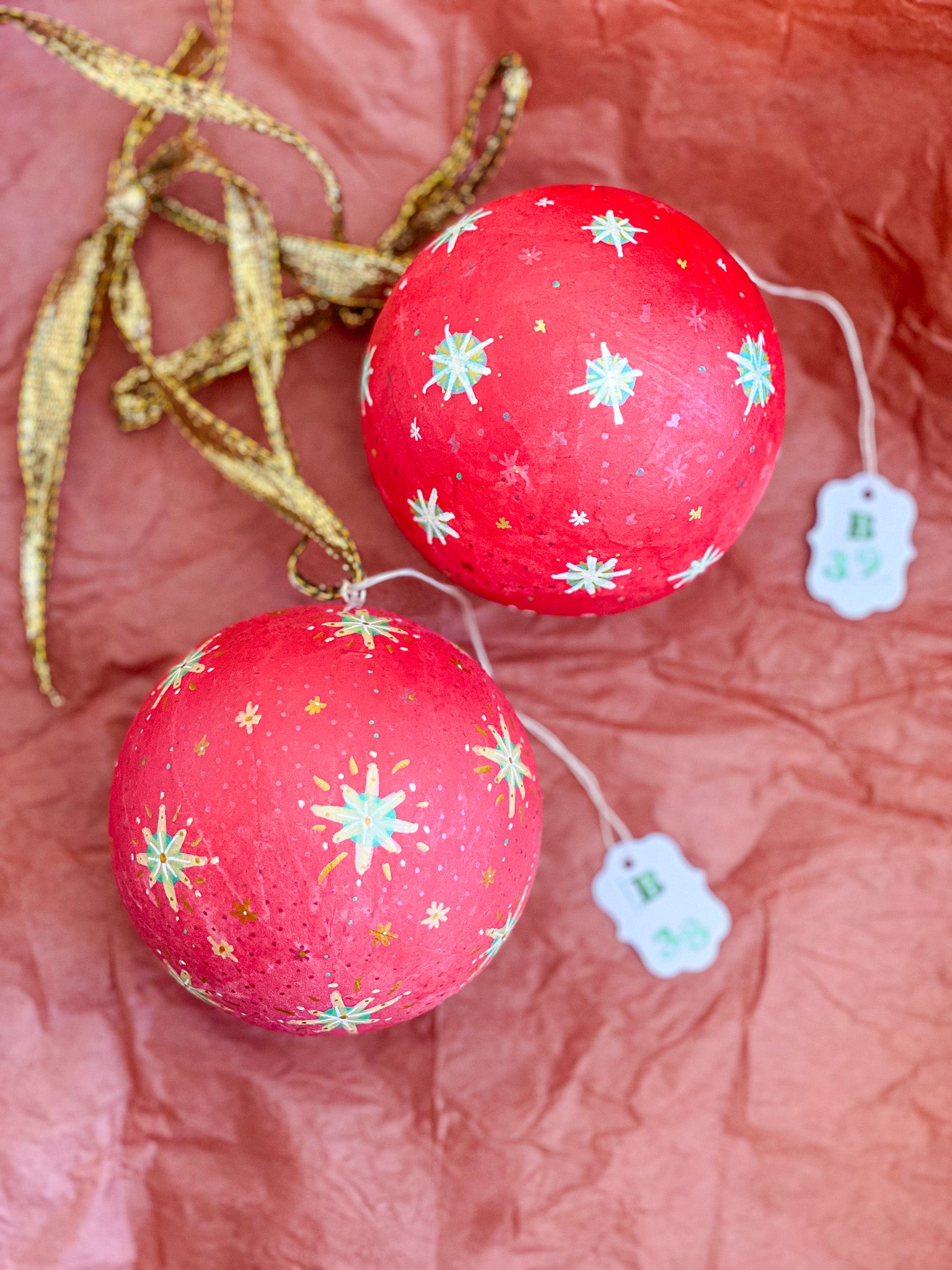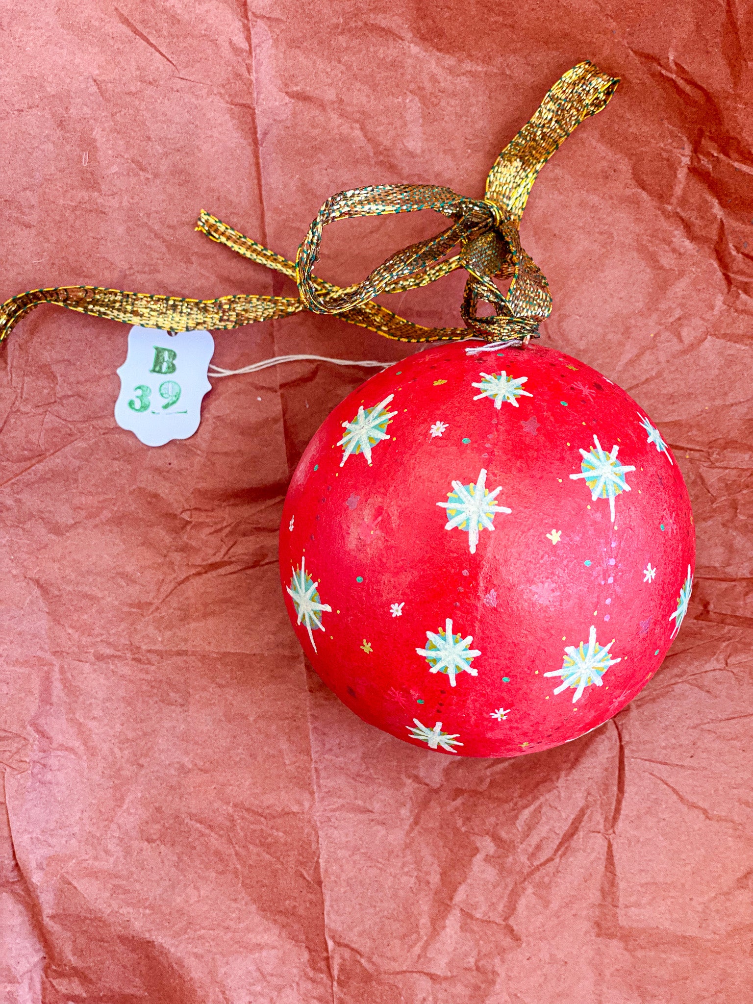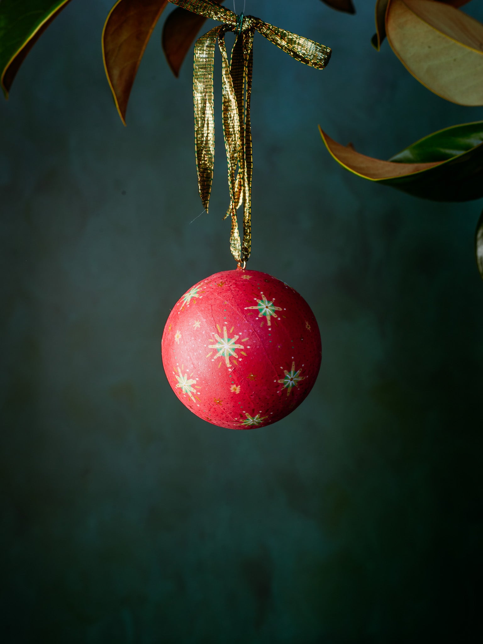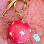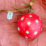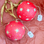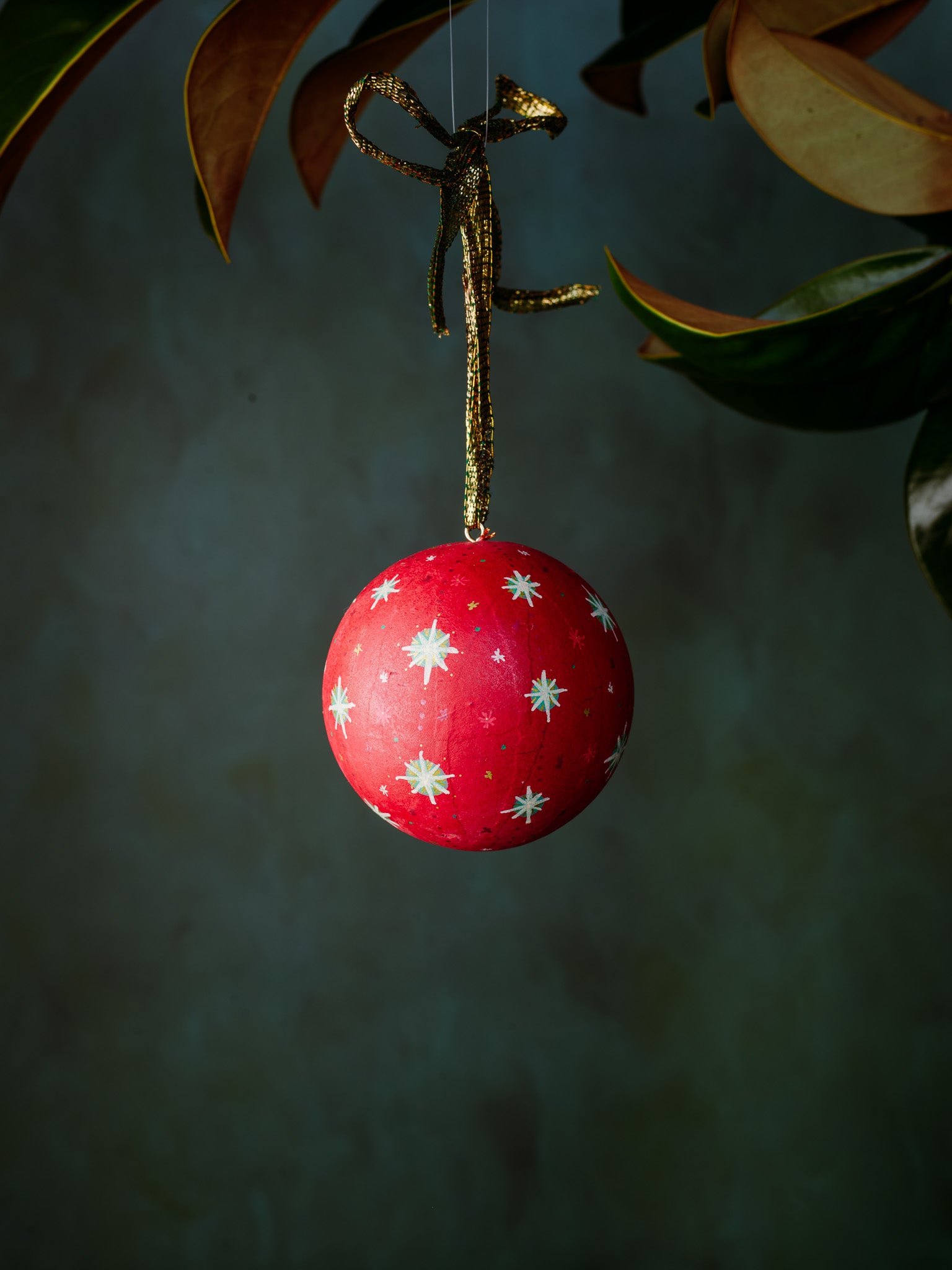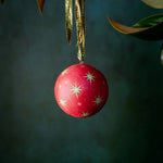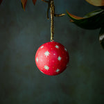 A festive starry sky pattern in rich red, cream and green reminiscent of French and Italian block prints and carnival decorations adorn this vintage inspired bauble.