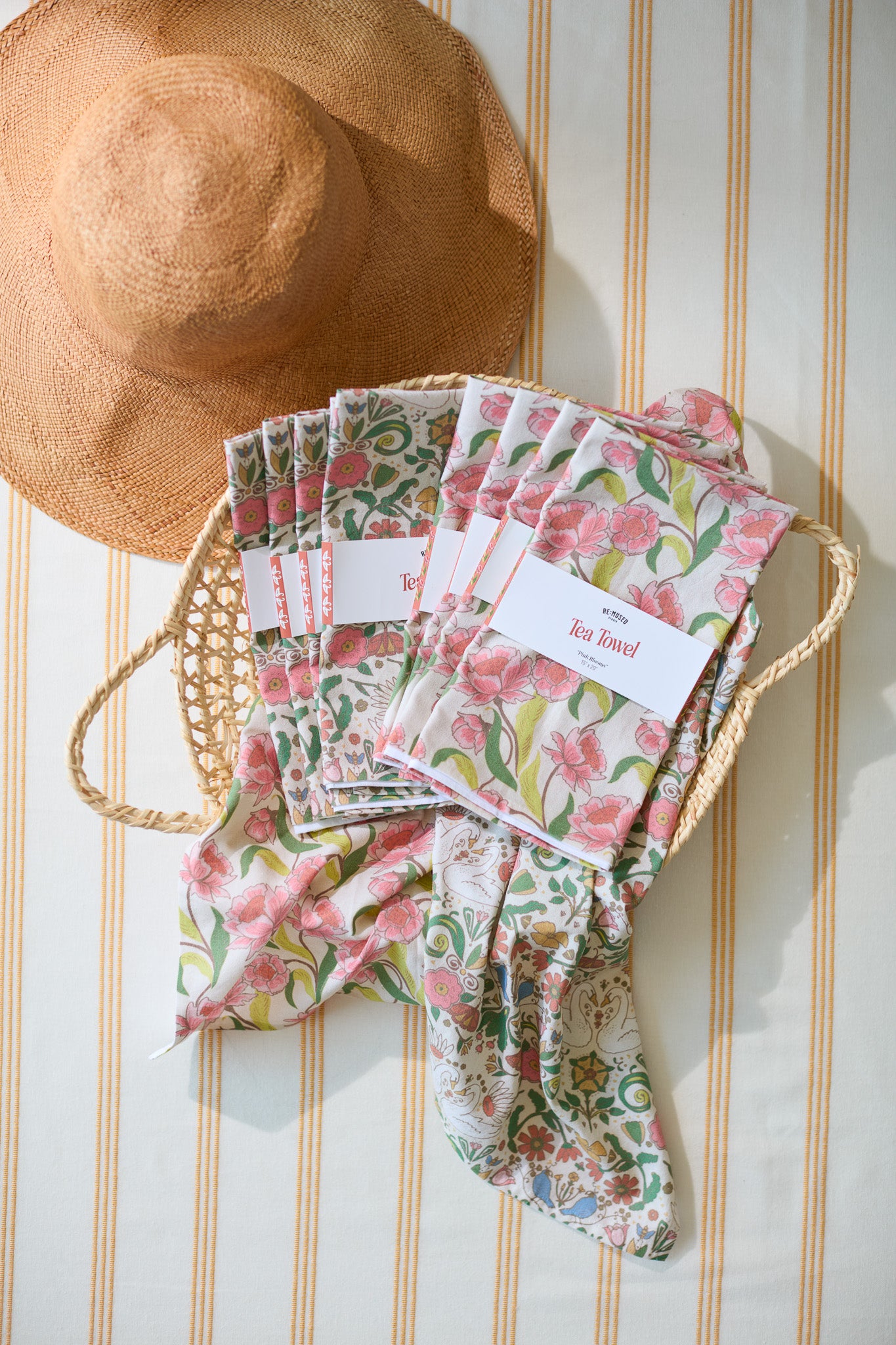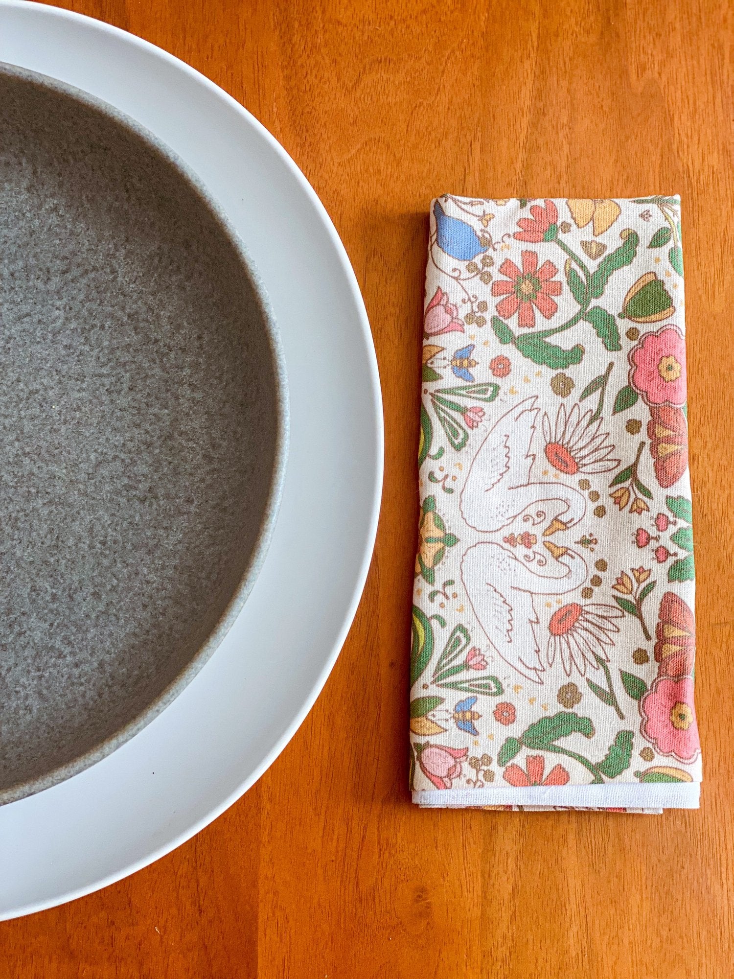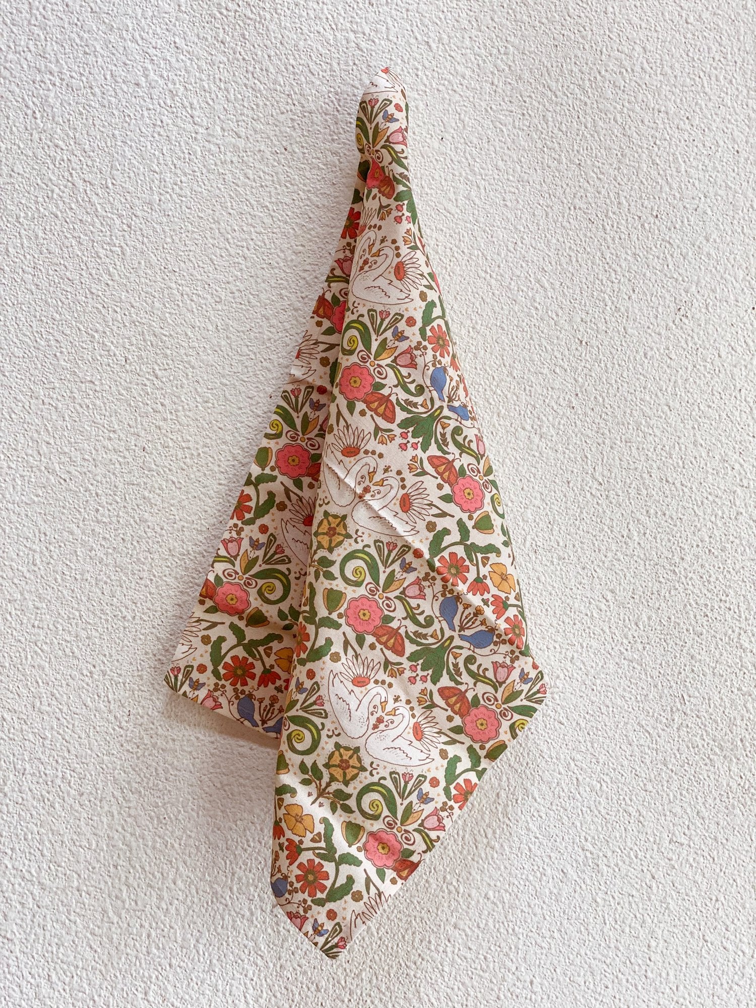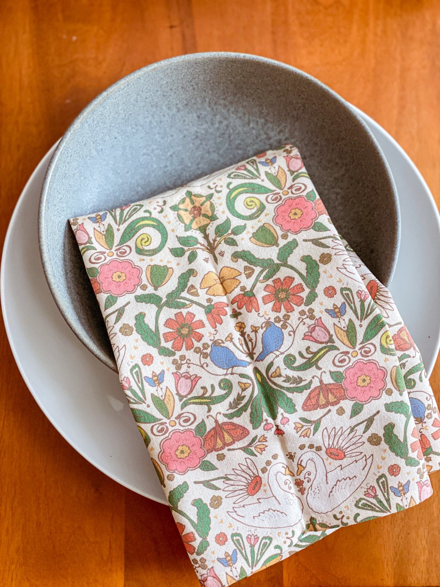 Brighten up your kitchen or dining table with this bird and floral pattern. Great for use as a tea towel or as napkins for your dinner party or brunch place settings. Wrap them up for a lovely hostess or housewarming gift.