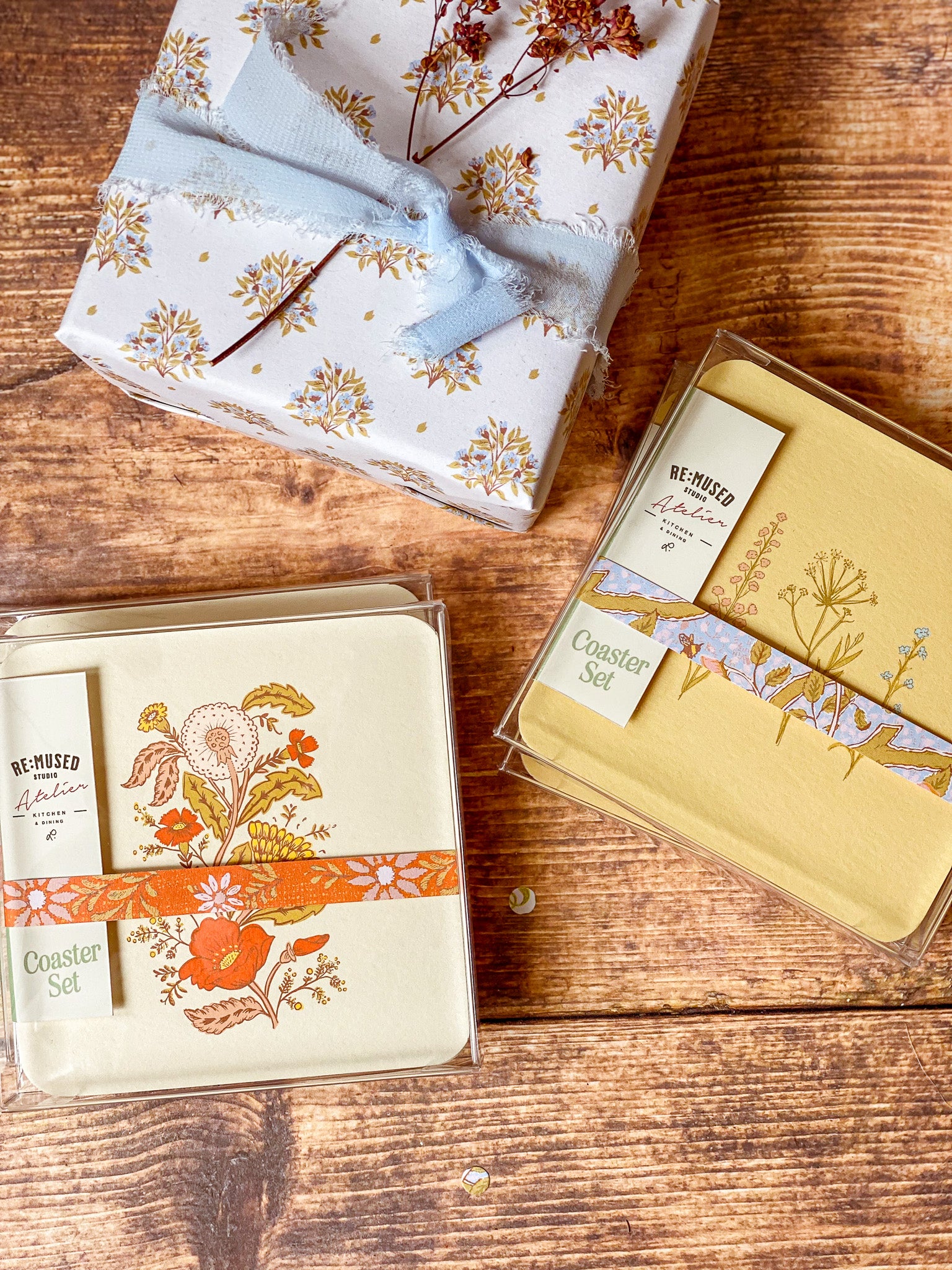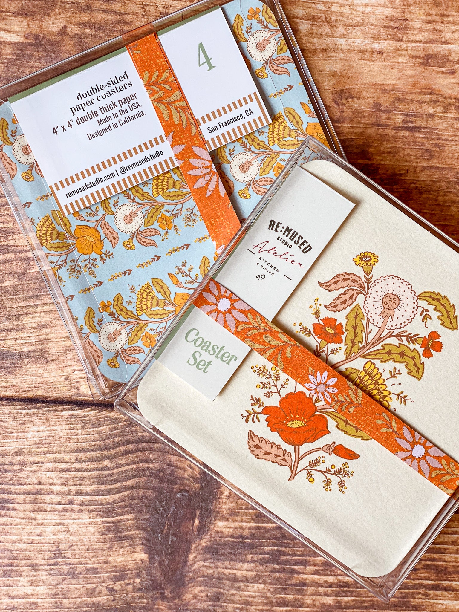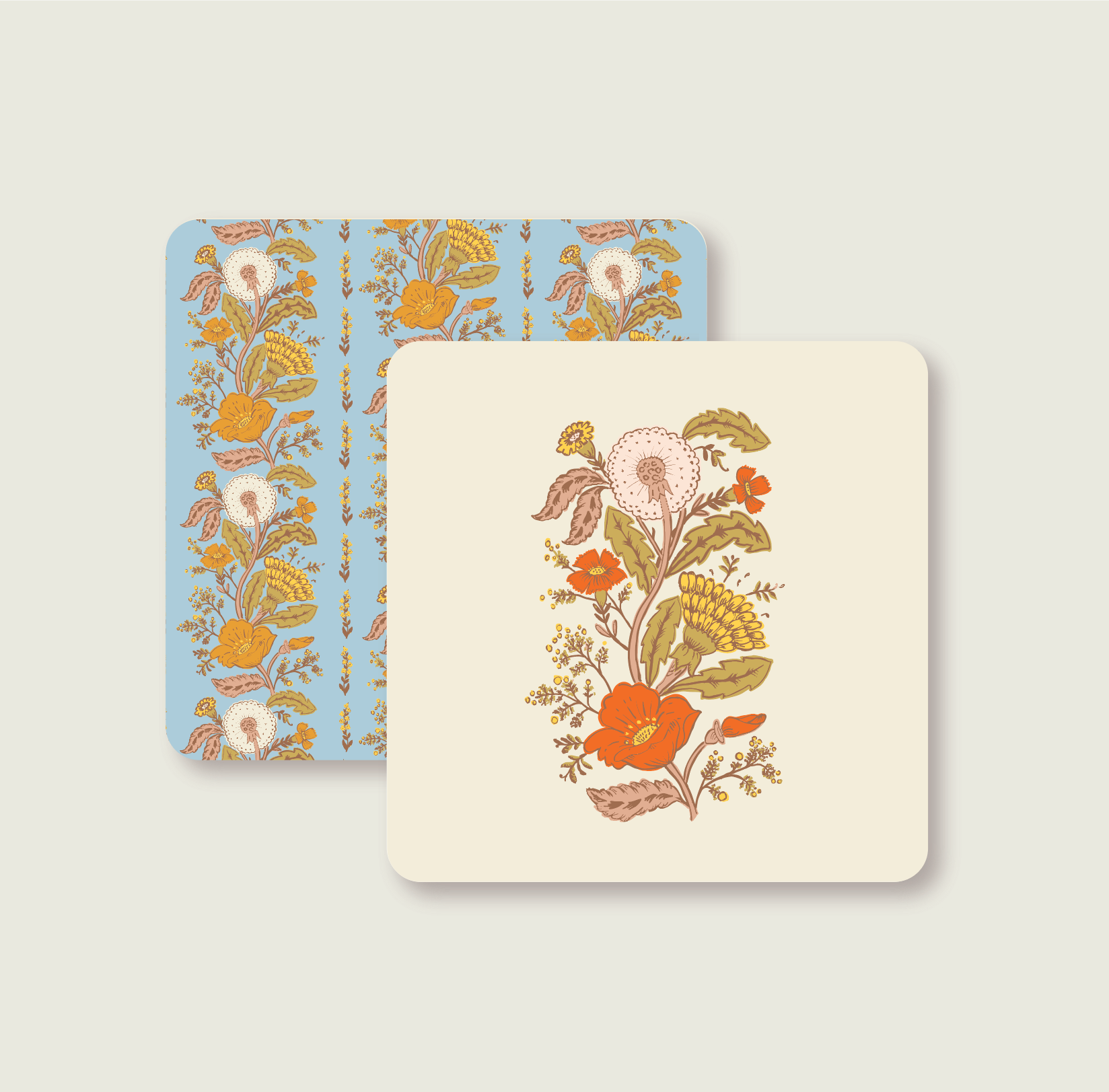 Our Wildflower Reverie double-sided coaster sets add a sophisticated vintage touch to your home entertaining. Warm up your table scape for Summer and Fall parties with these double thick paper coasters featuring a California poppy and dandelion motif on a cream background one side and blue striped pattern version on the other. Save table surfaces in style for celebrations, birthdays, baby and bridal showers, brunch or just elevate your every day dining. They even make for great party favors.