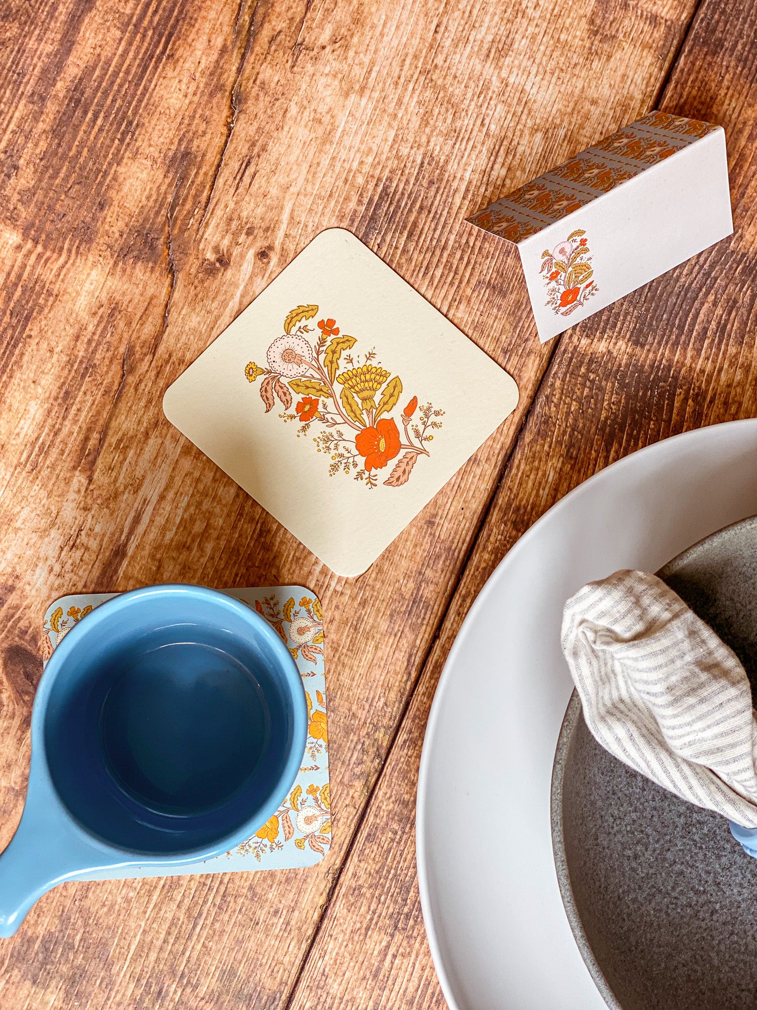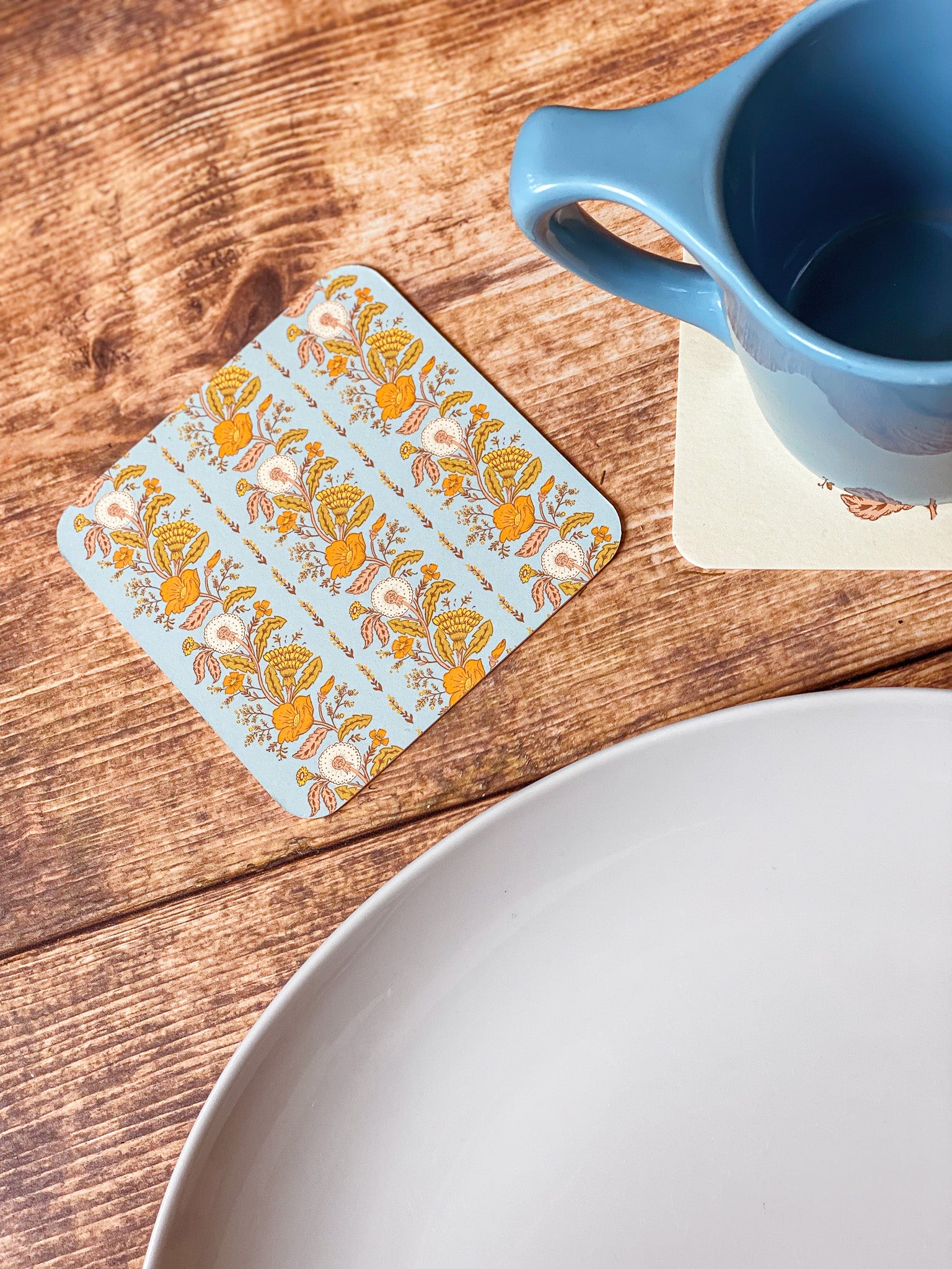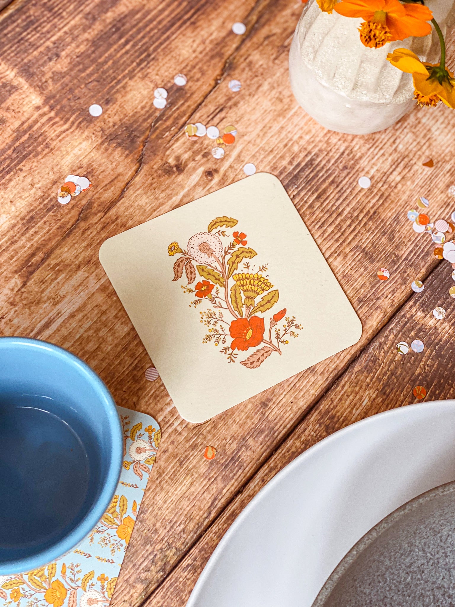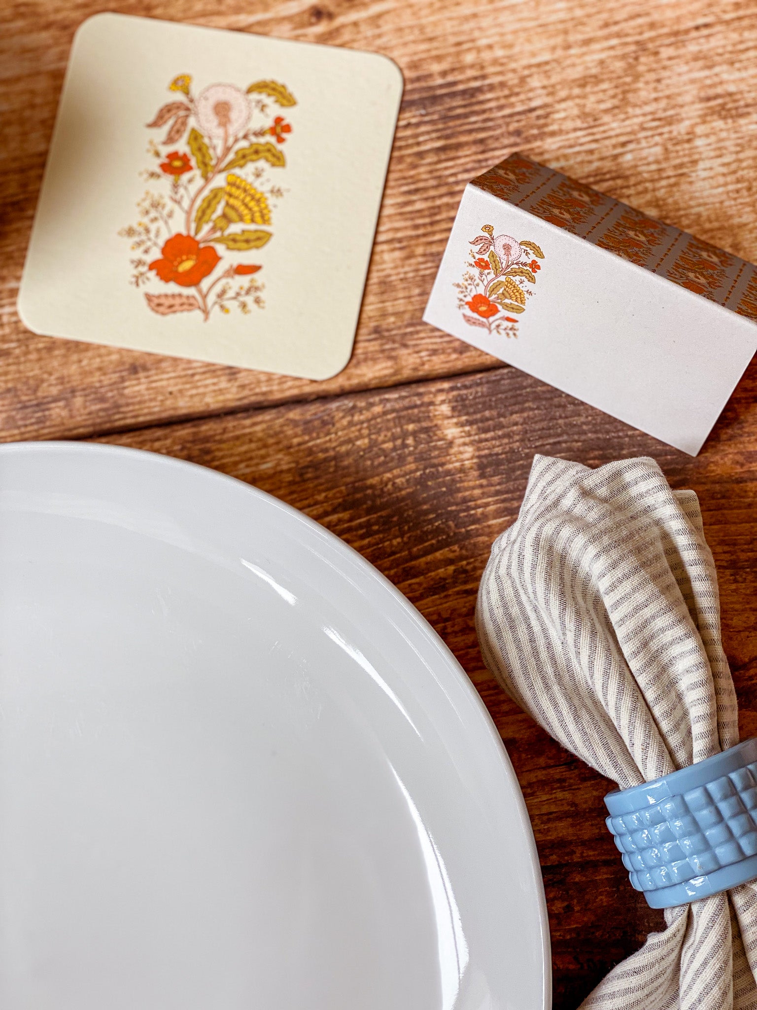 Our Wildflower Reverie double-sided coaster sets add a sophisticated vintage touch to your home entertaining. Warm up your table scape for Summer and Fall parties with these double thick paper coasters featuring a California poppy and dandelion motif on a cream background one side and blue striped pattern version on the other. Save table surfaces in style for celebrations, birthdays, baby and bridal showers, brunch or just elevate your every day dining. They even make for great party favors.