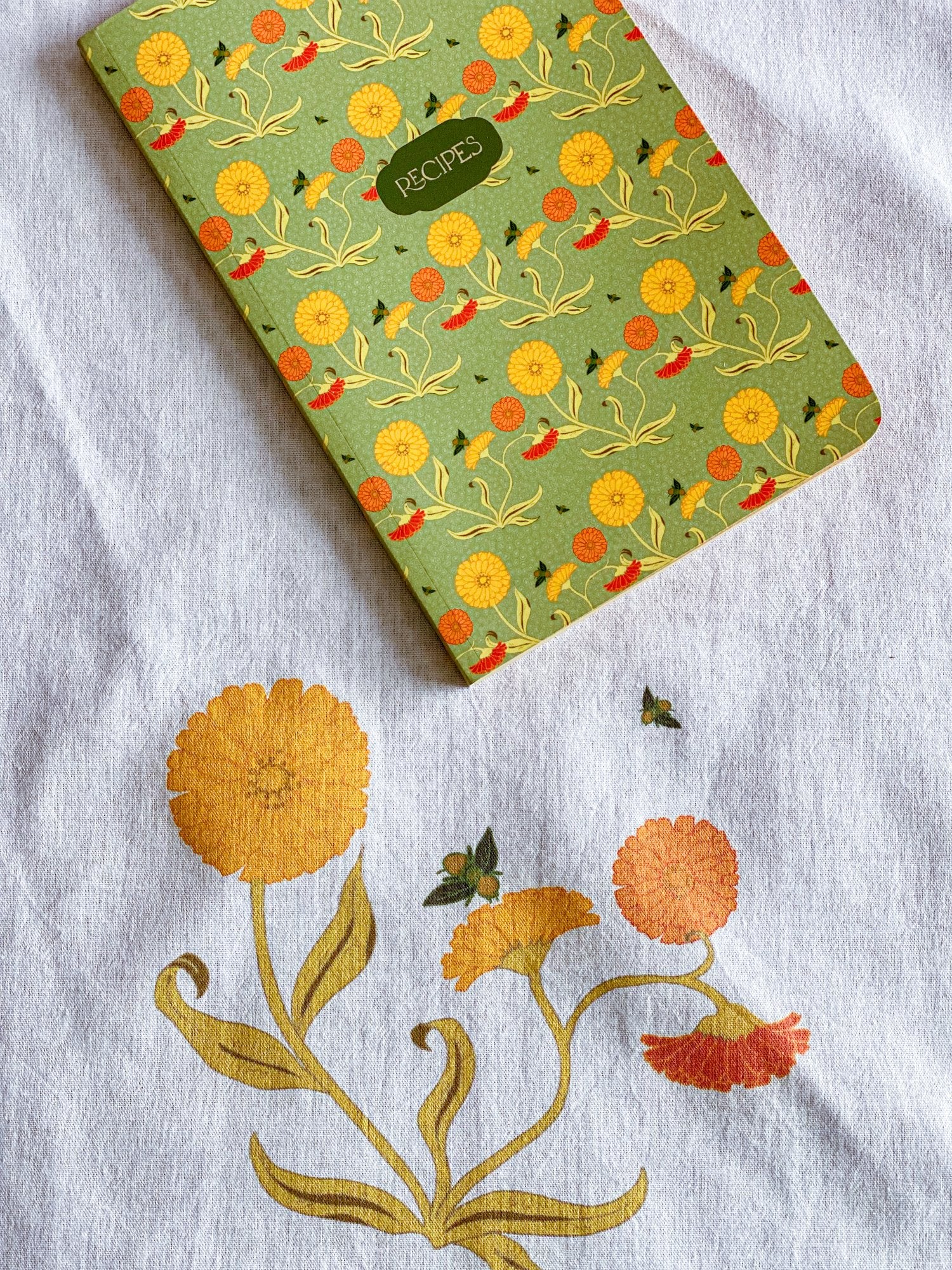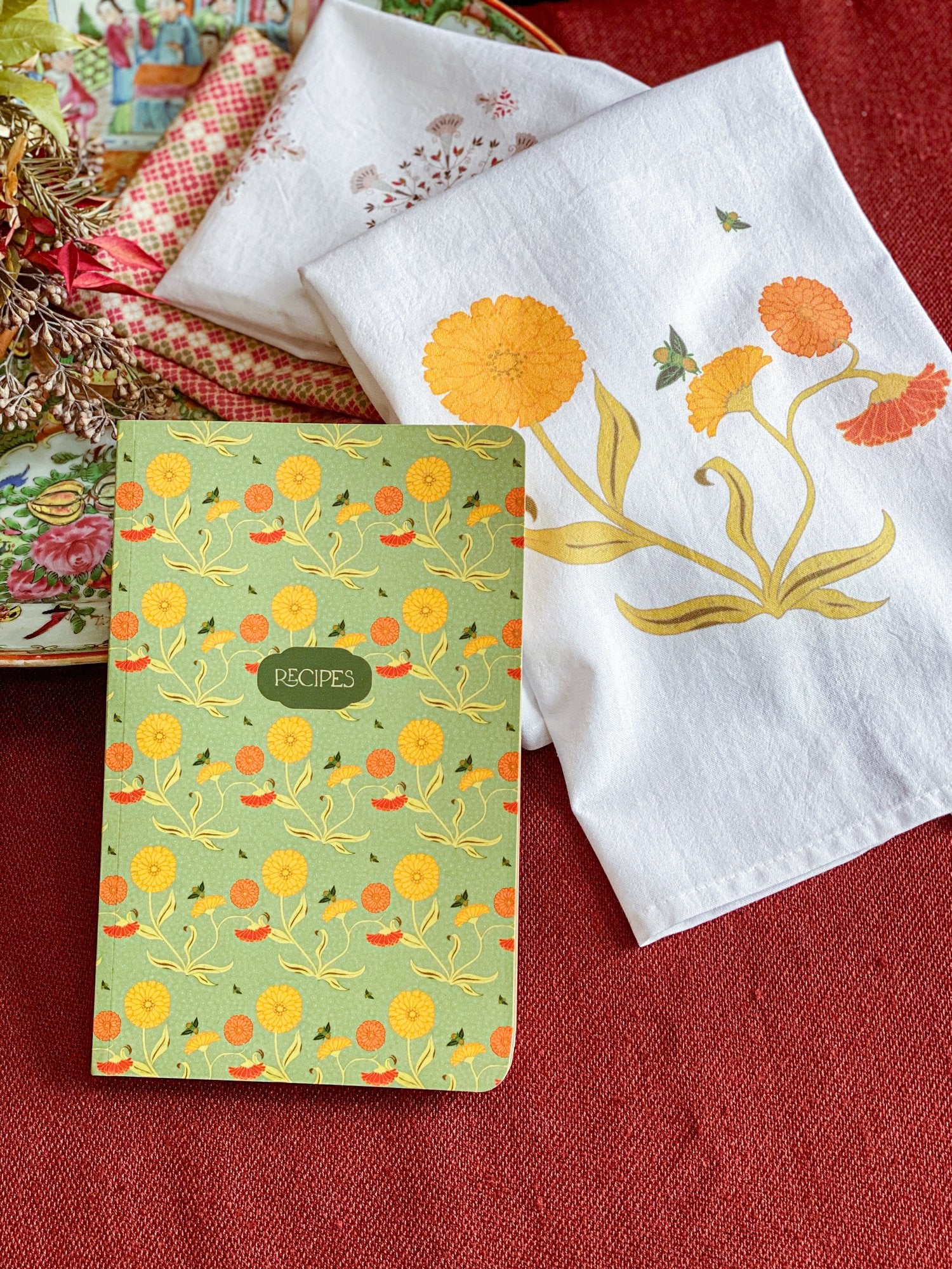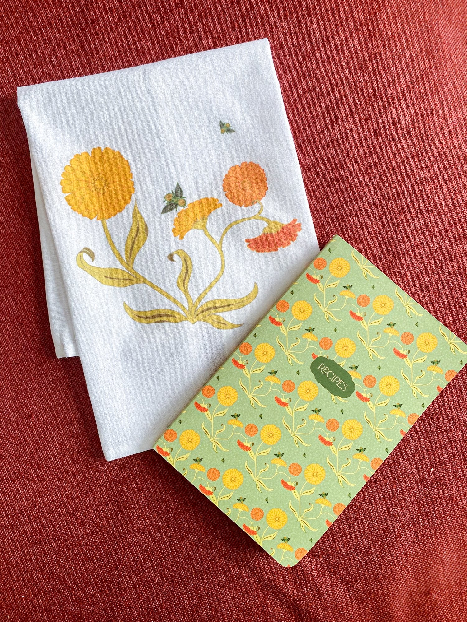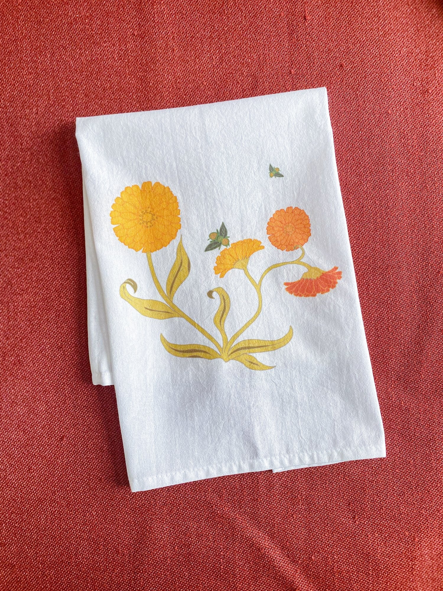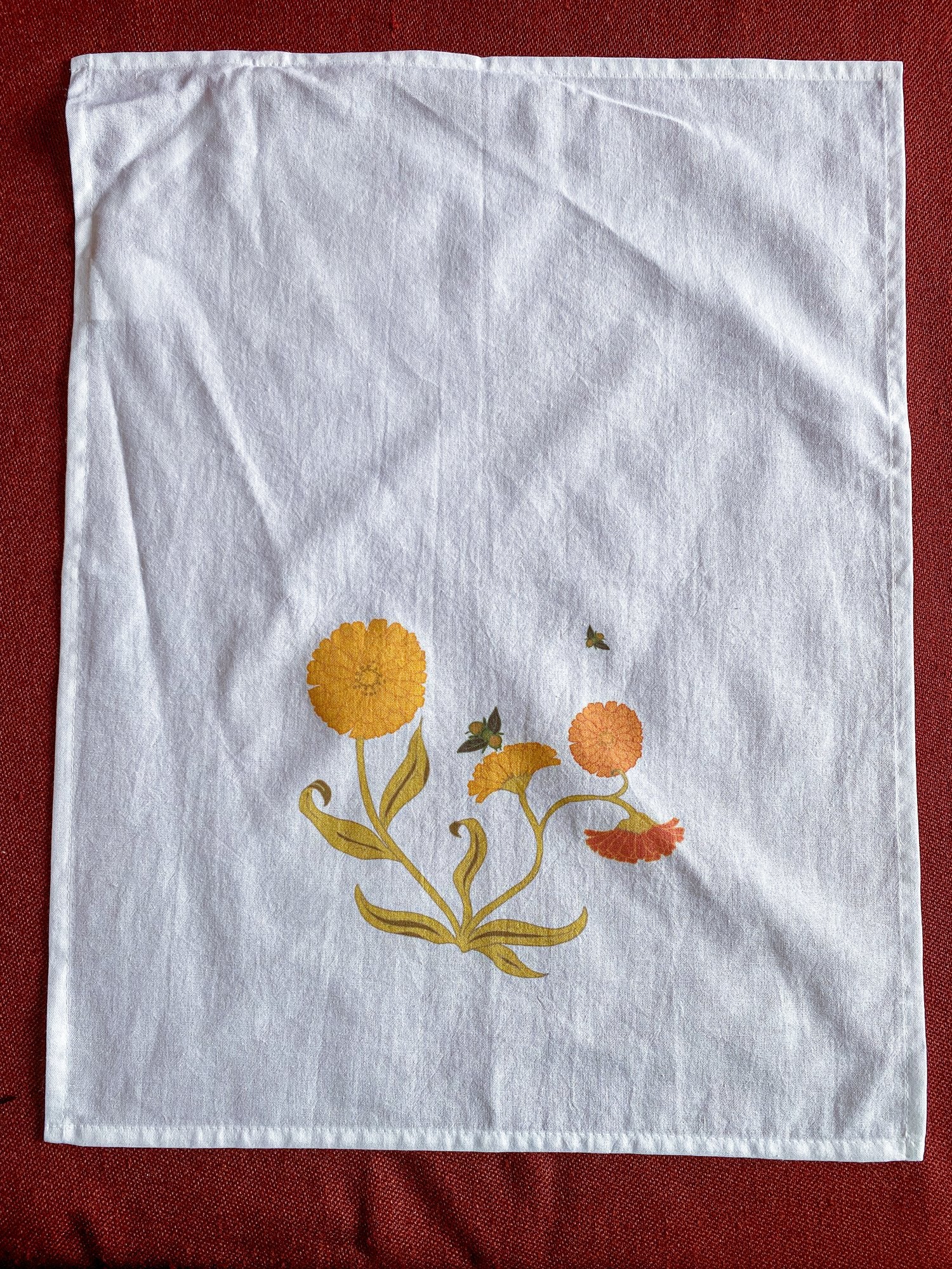 Brighten up your kitchen or dining table with this calendula and honey bee motif. Great for use as a tea towel or as napkins for your dinner party place settings. Wrap them up in your favorite ribbon for a lovely hostess gift or stocking stuffer for the holidays.